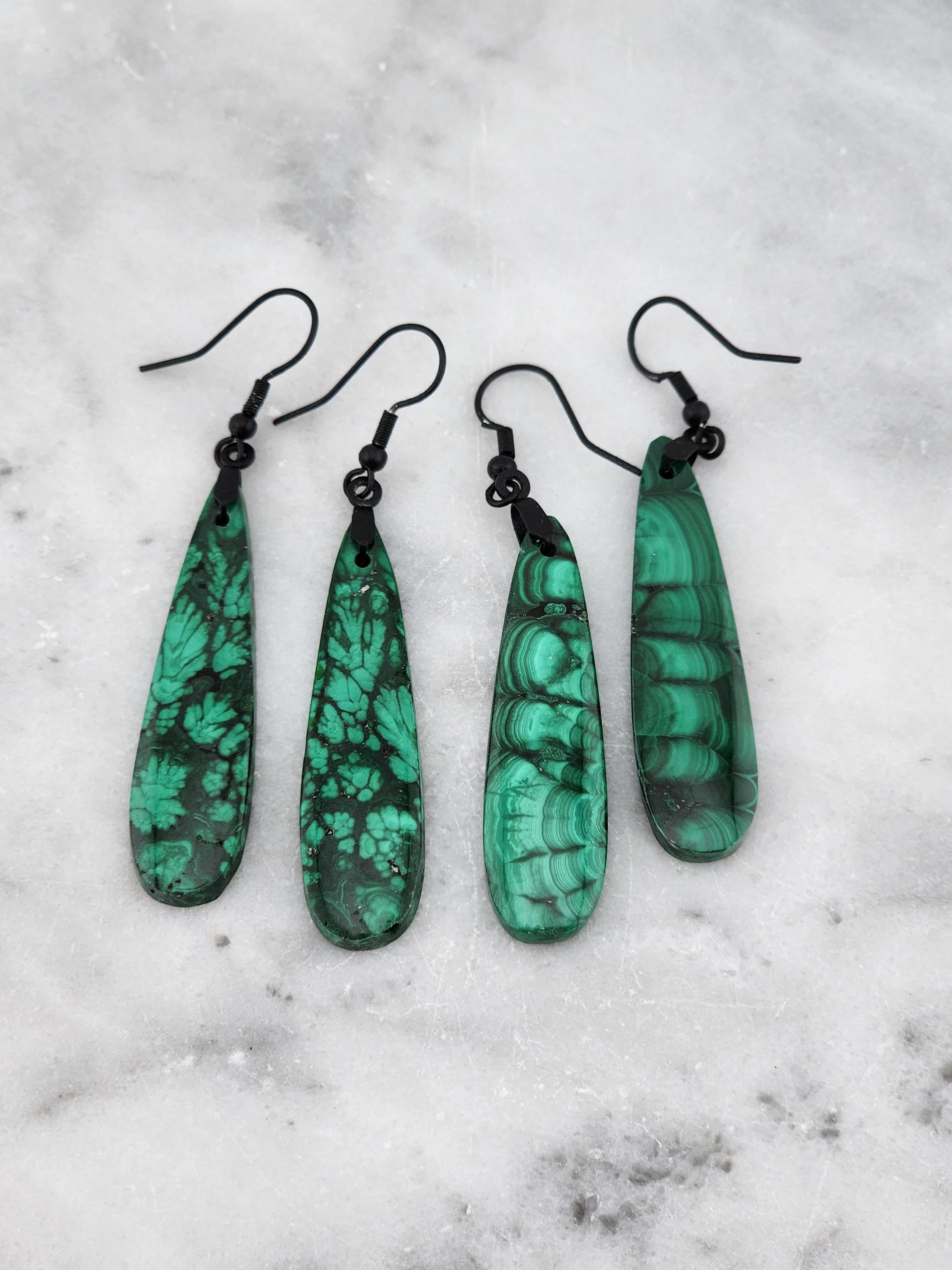 I have made two different pairs of black dangle earrings with 12x45mm long teardrop shaped matching cut Natural Malachite gemstone pendants. * Your purchase will arrive in pretty packaging - Color: Natural Multi Green and Black Color as pictured - Shape And Size: Tear Drop 12x45 mm