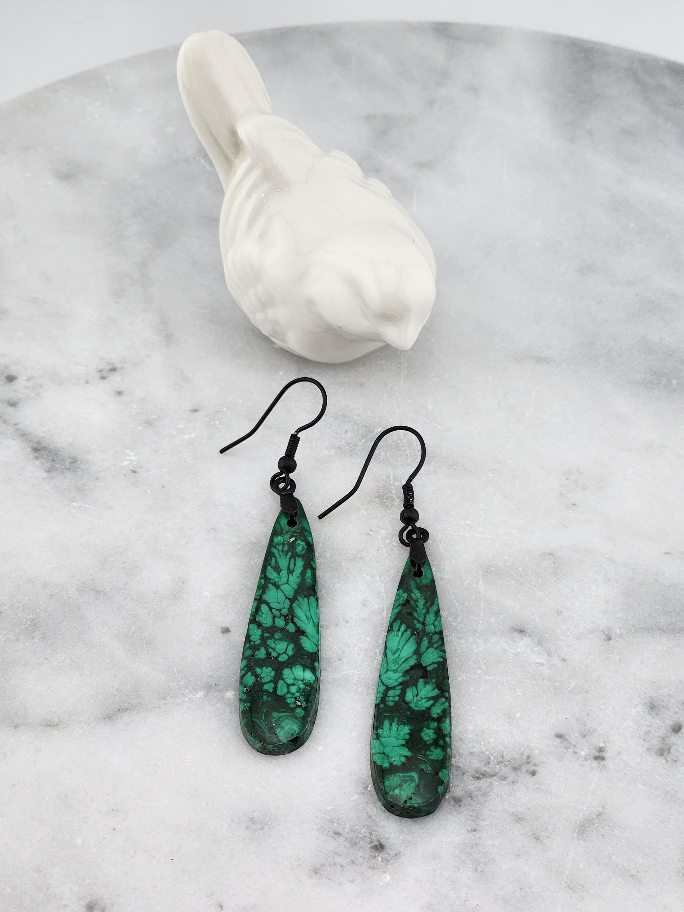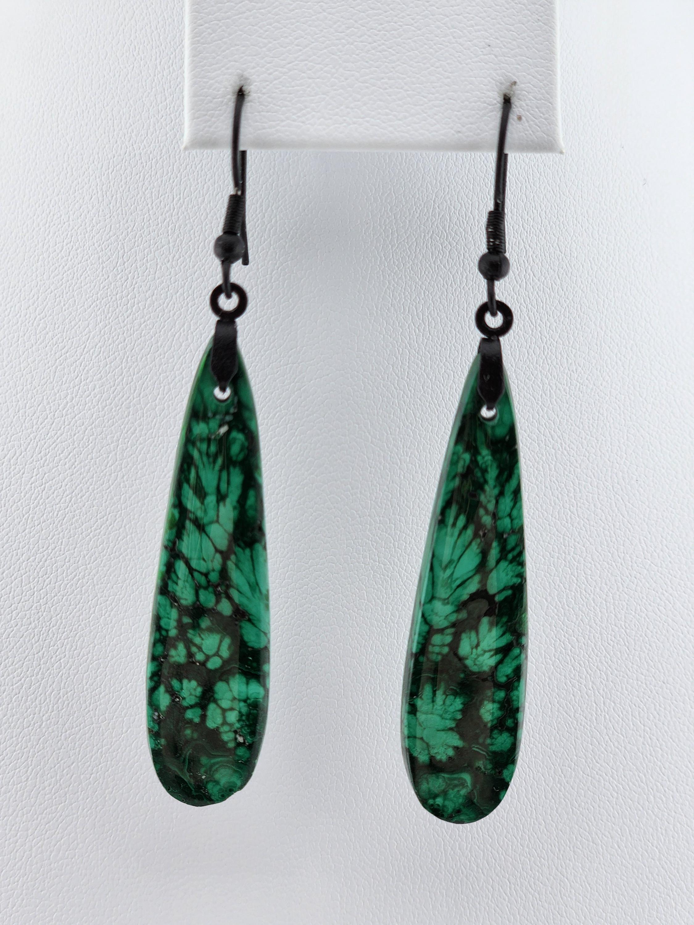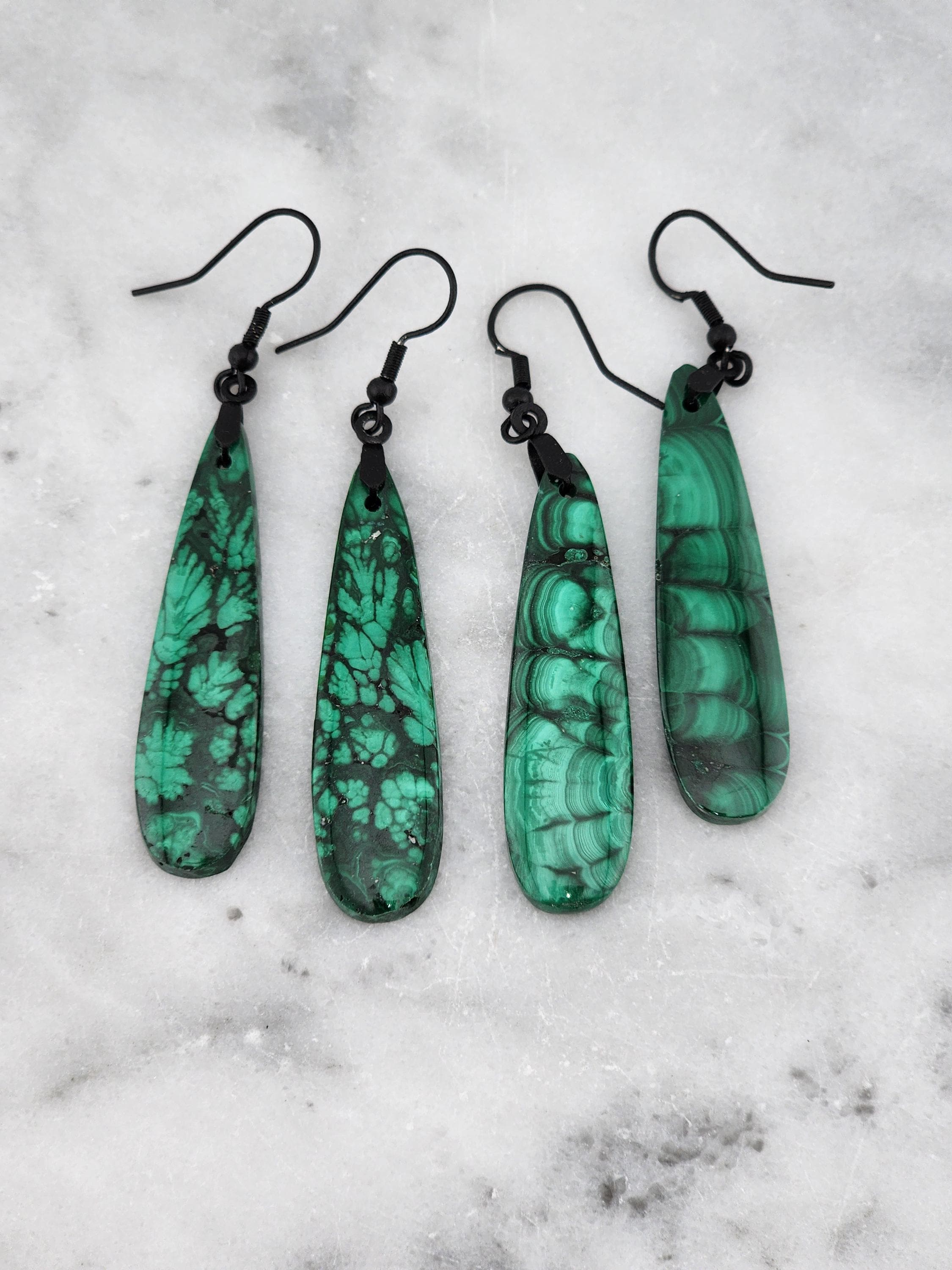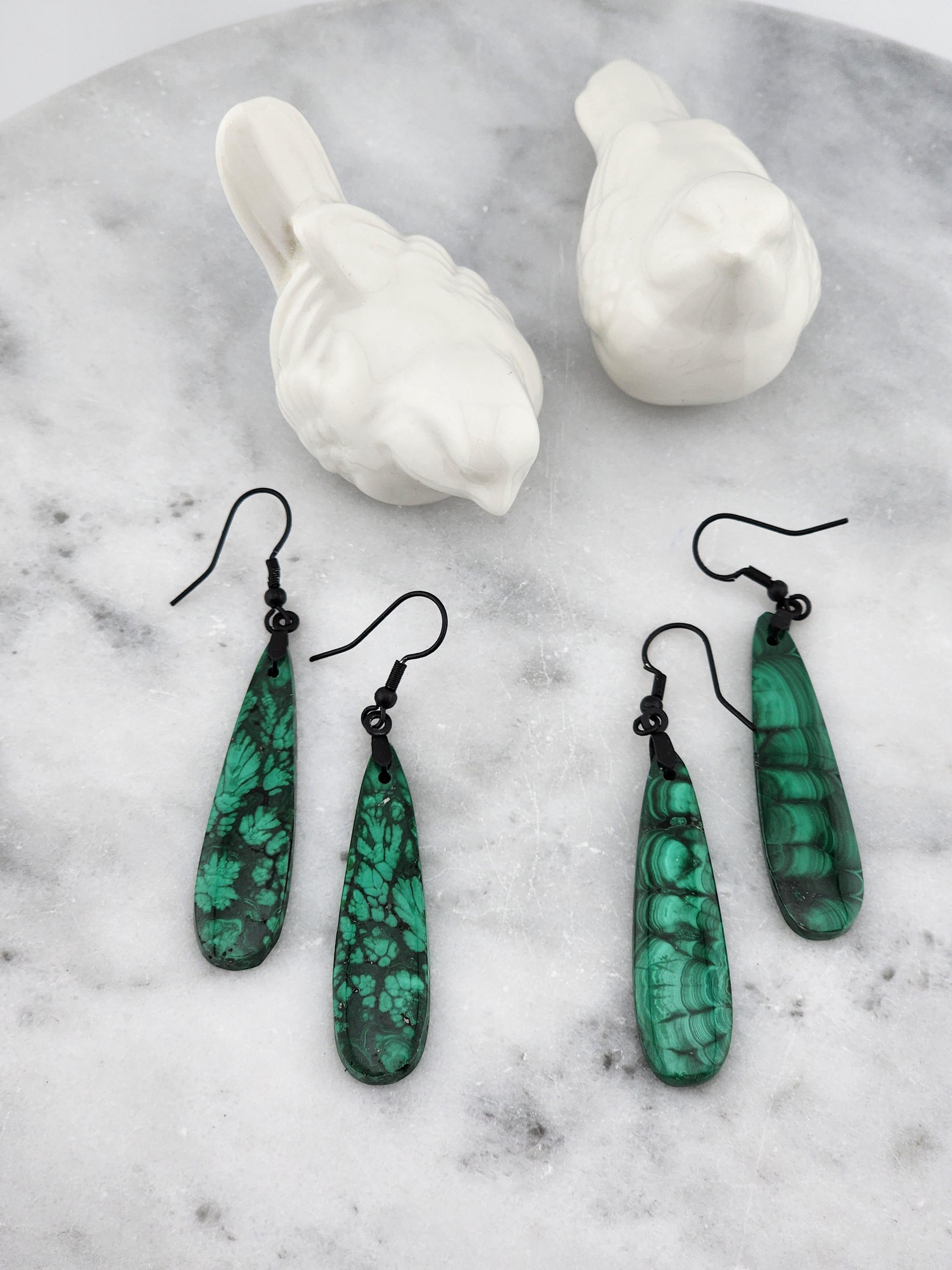 I have made two different pairs of black dangle earrings with 12x45mm long teardrop shape Natural Malachite gemstone pendants that are matching green color. * Your purchase will arrive in pretty packaging * Shipping is free within the U.S. - Color: Natural Multi Green and Black Color as pictured - Shape And Size: Tear Drop 12x45 mm