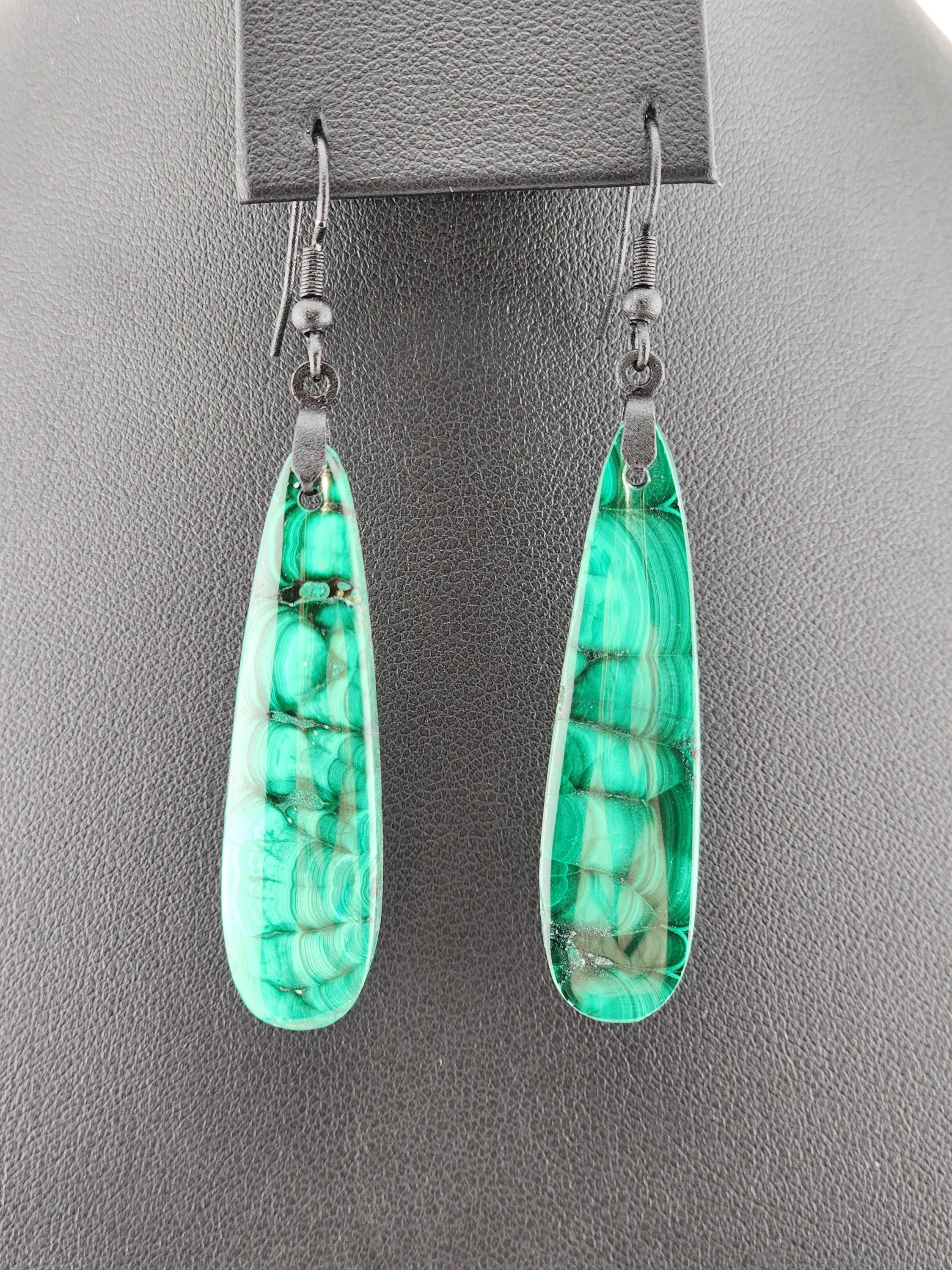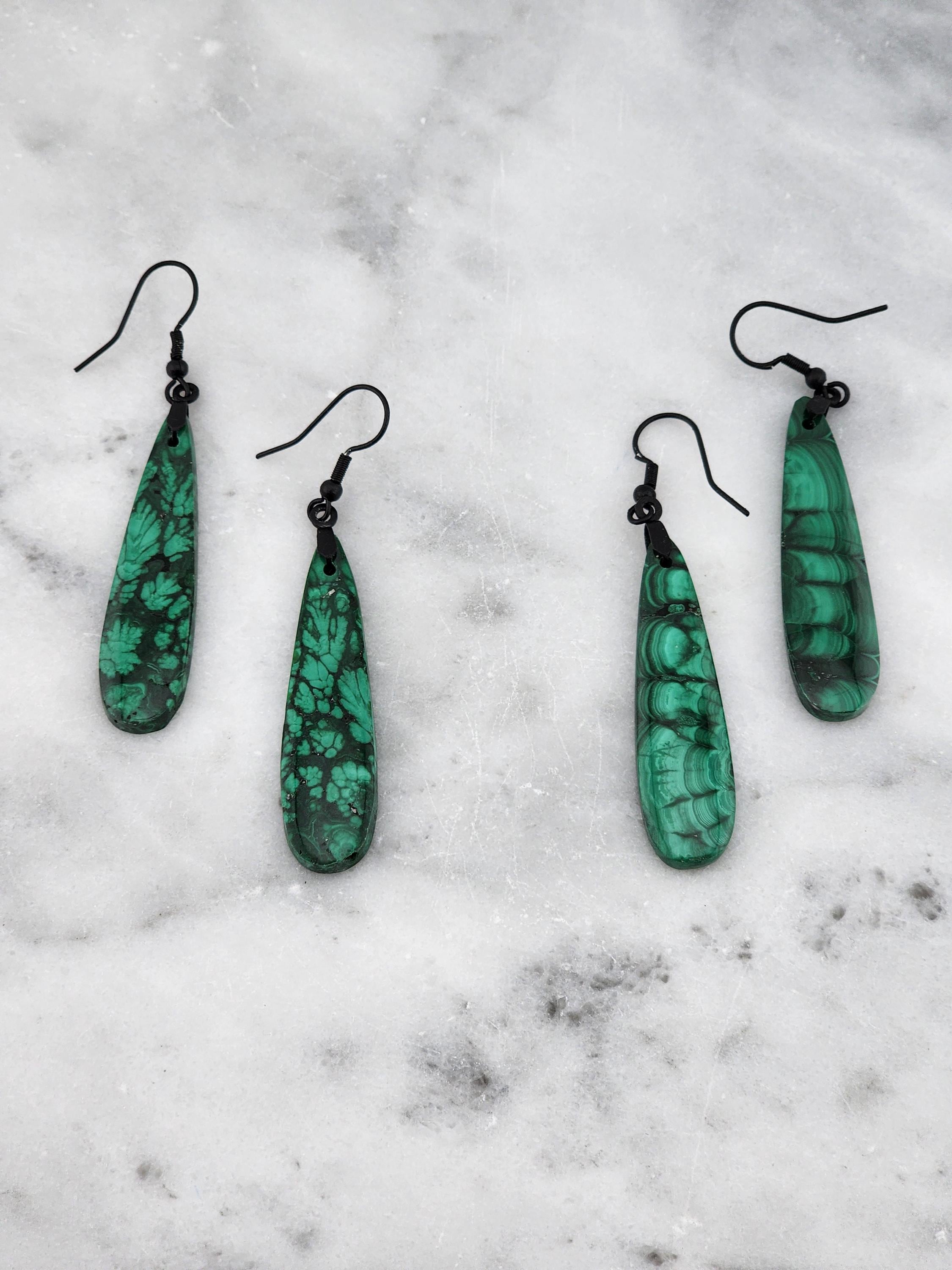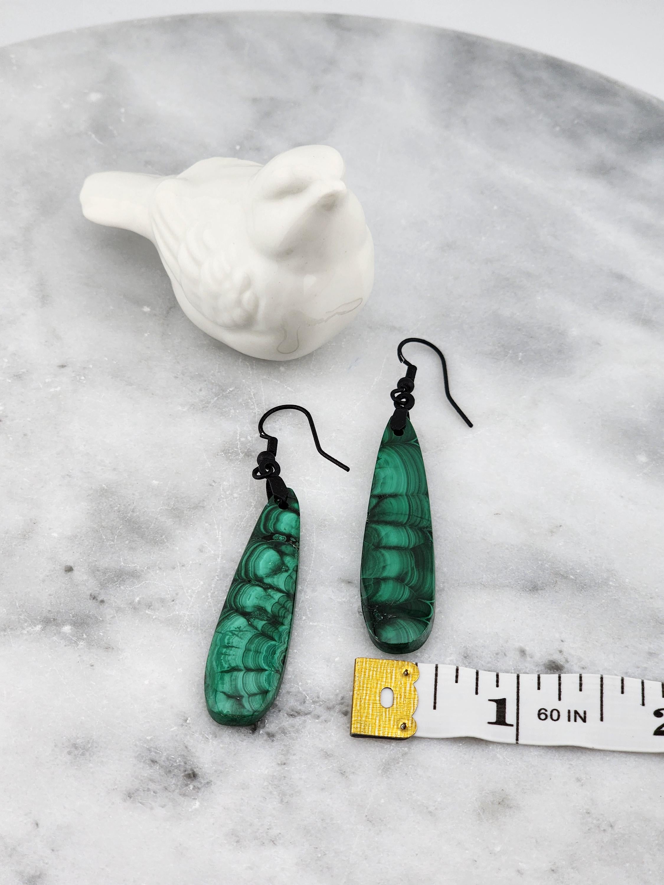I have made two different pairs of black dangle earrings with 12x45mm long teardrop shape Natural Malachite gemstone pendants that are matching green color. * Your purchase will arrive in pretty packaging * Shipping is free within the U.S. - Color: Natural Multi Green and Black Color as pictured - Shape And Size: Tear Drop 12x45 mm