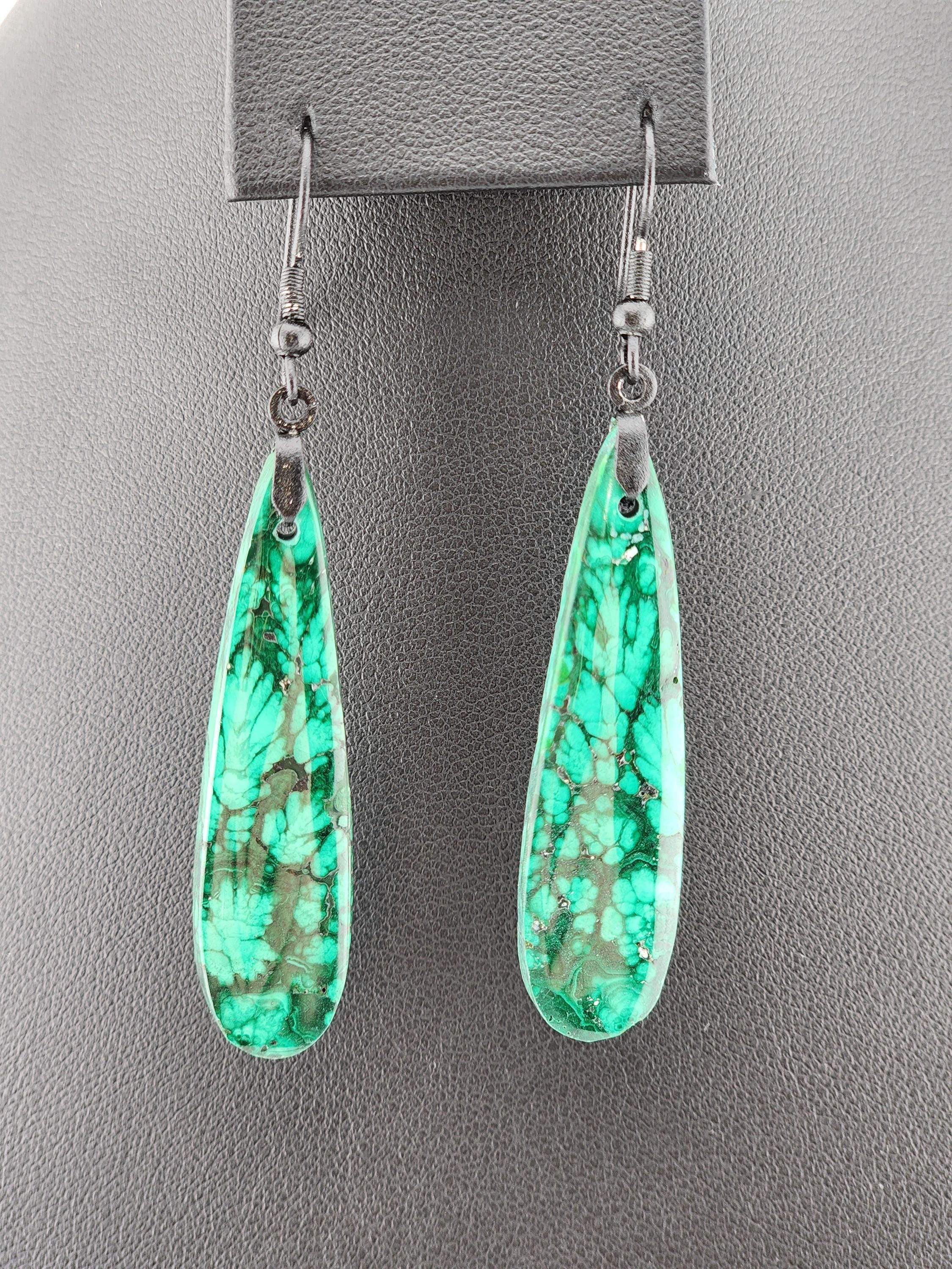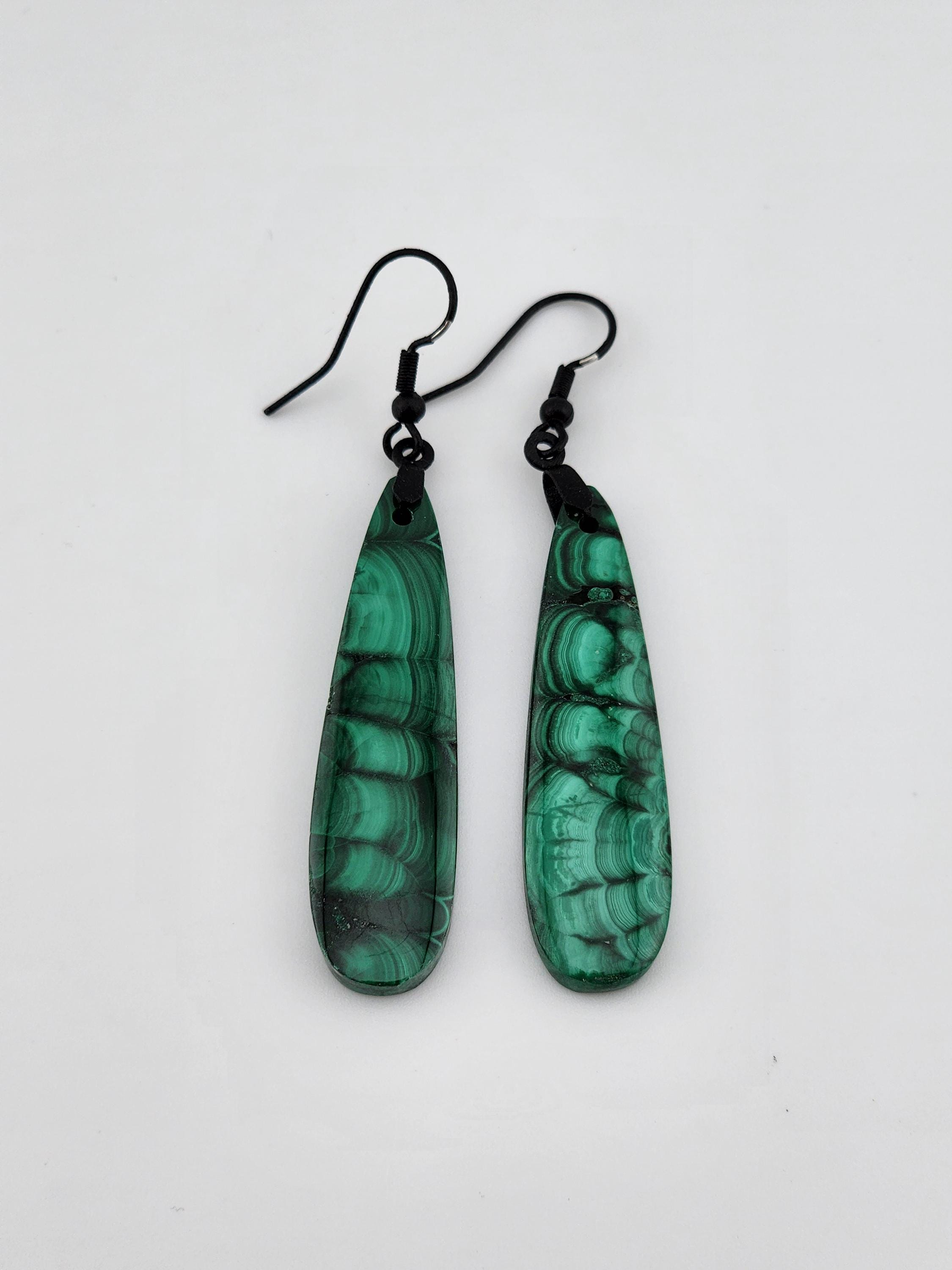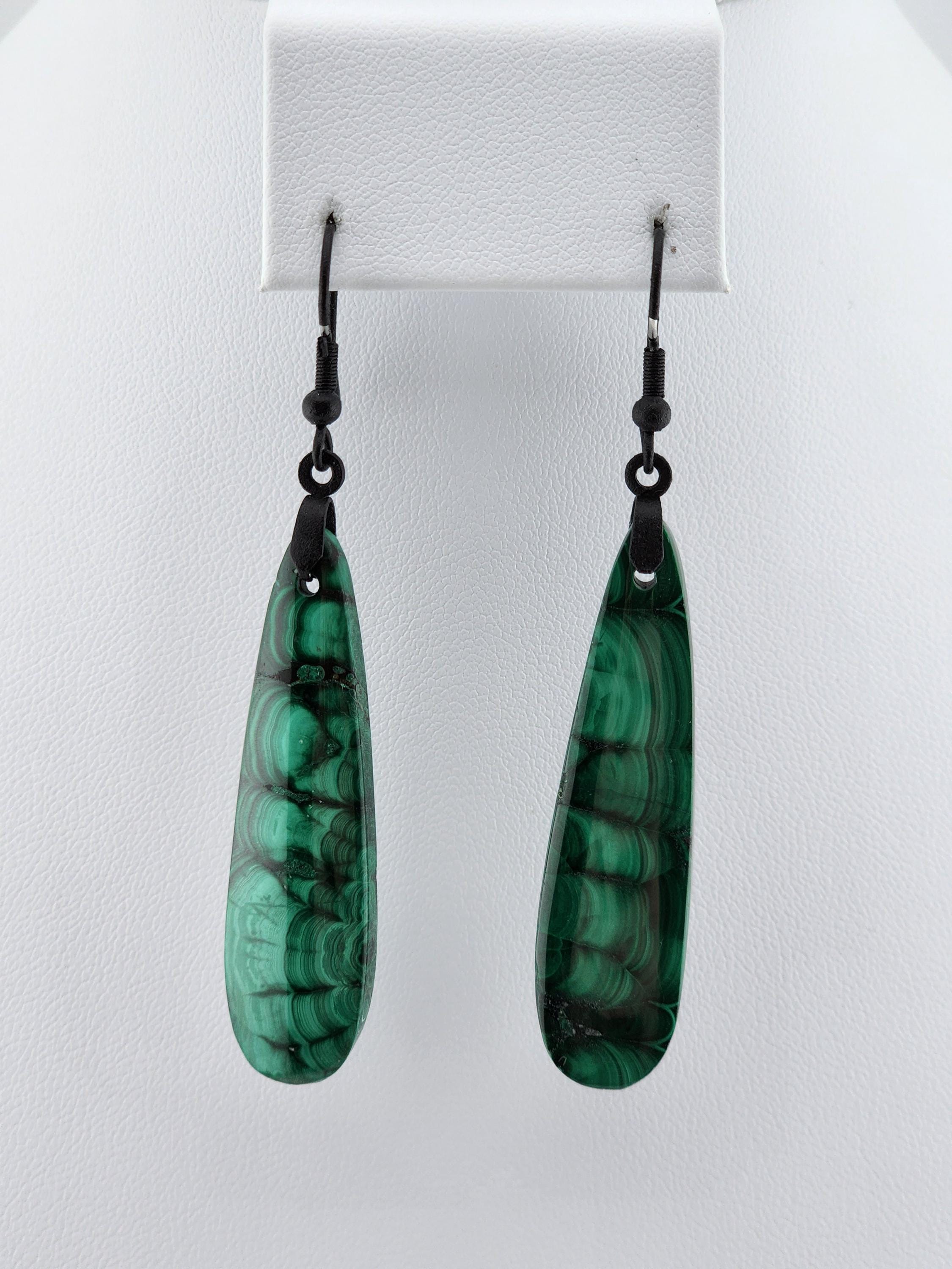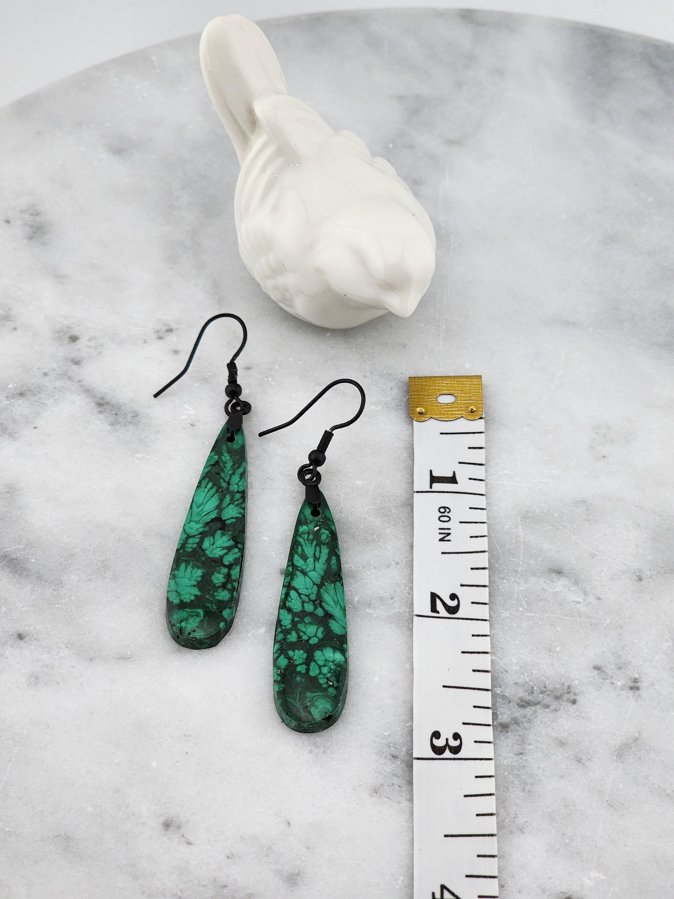 I have made two different pairs of black dangle earrings with 12x45mm long teardrop shape Natural Malachite gemstone pendants that are matching green color. * Your purchase will arrive in pretty packaging * Shipping is free within the U.S. - Color: Natural Multi Green and Black Color as pictured - Shape And Size: Tear Drop 12x45 mm