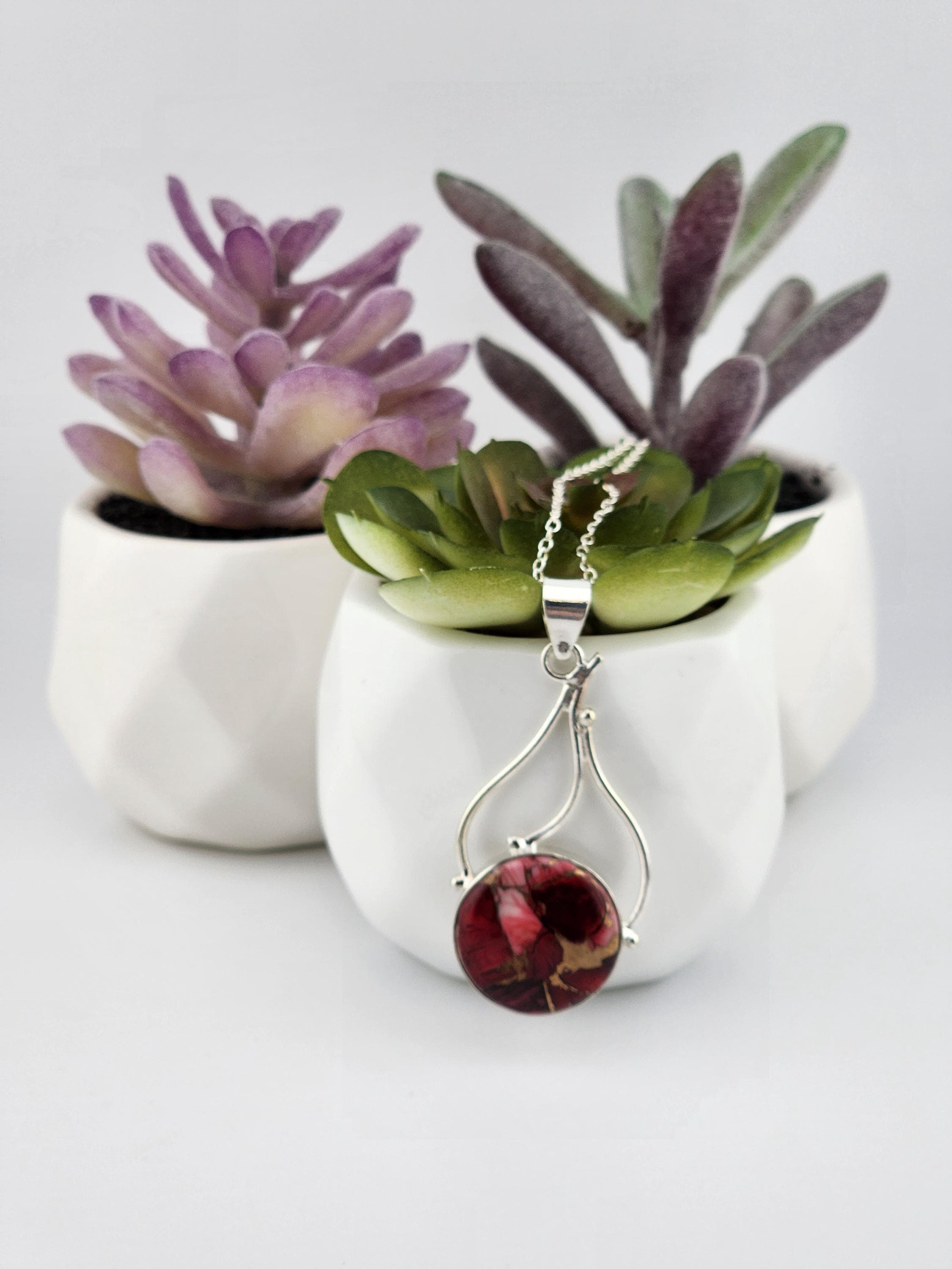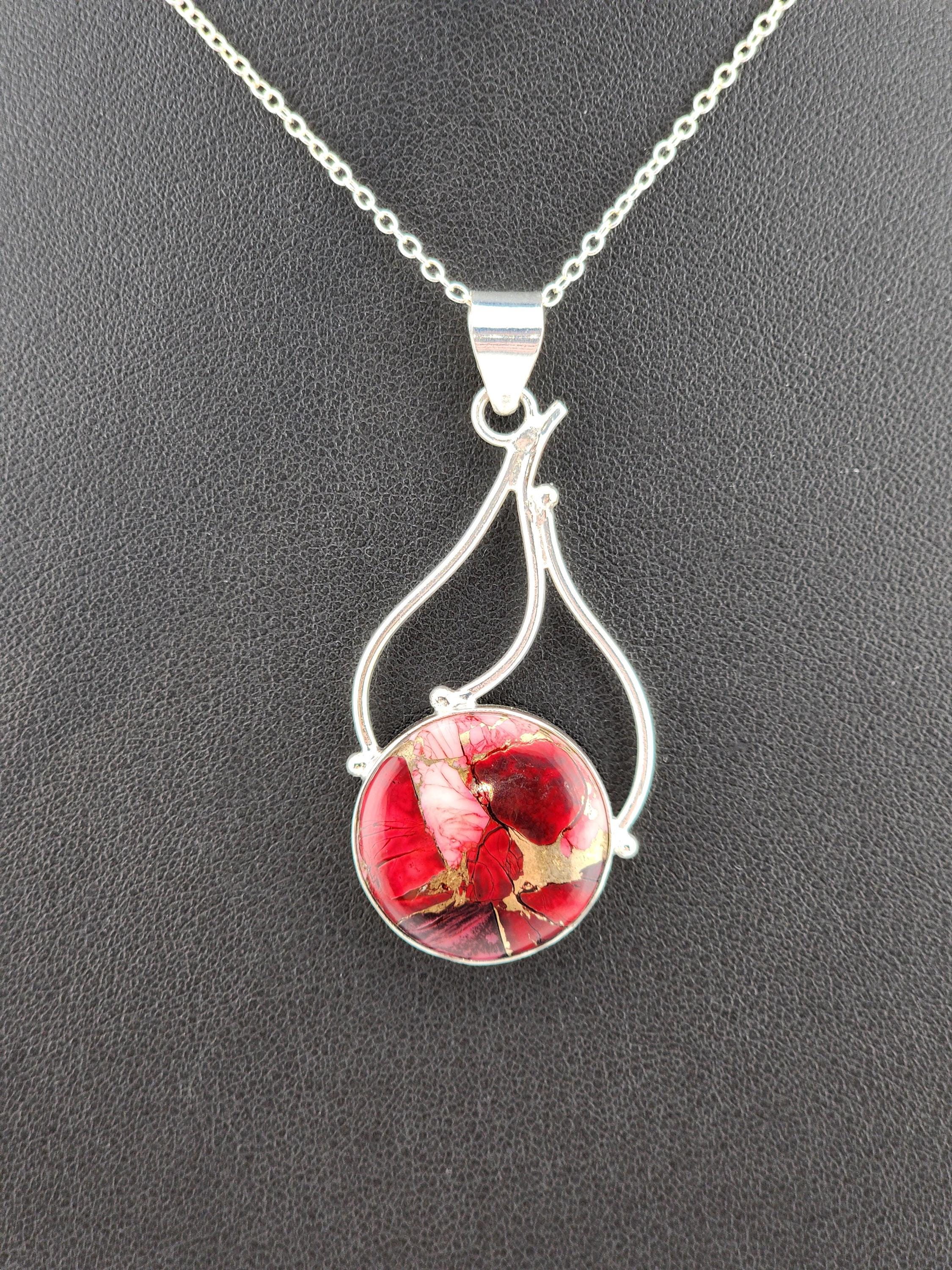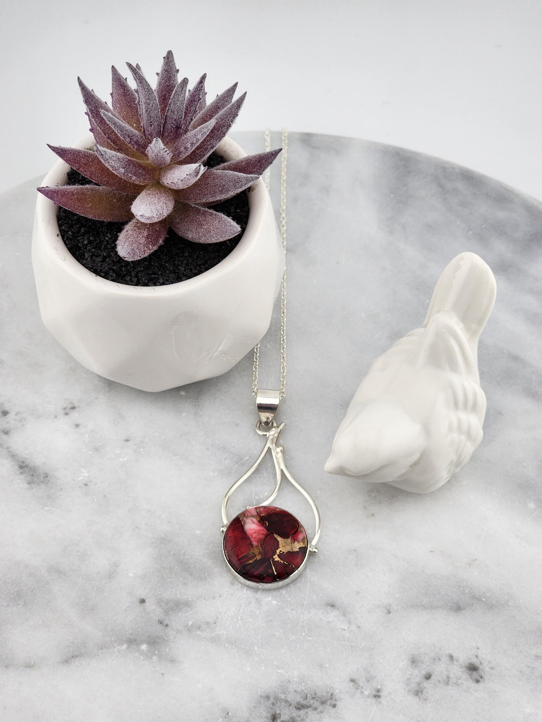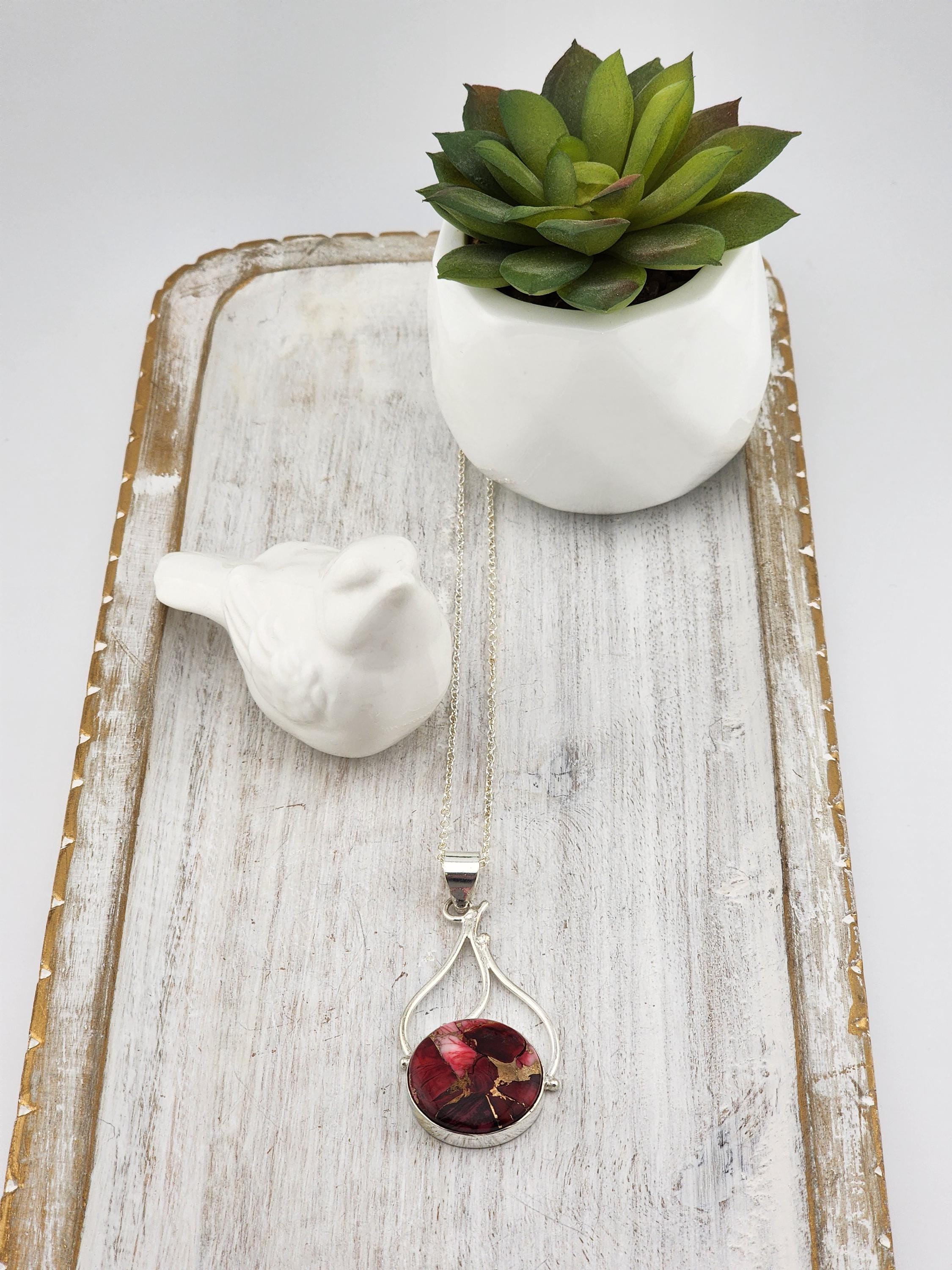 I made this necklace using 925 sterling silver delicate chain. Then I added an artistic, ornate handcrafted (in India) 925 sterling silver pendant with a round red rose dahlia turquoise stone. * Your purchase will arrive in pretty packaging * Shipping is free within the U.S. >>>>>>>>>>>>>>>>>>>>>>>>>>>>>>>>>>>>>>>>>>>>>>>>>>>>>>>>>>>>>>>>>>>>>>>>>>>>>>>>>>>>> Benefits Of Red Rose Dahlia Turquoise: 🌹 Red Rose Symbolizes: Love, passion, romance 🌺 Dahlia Symbolizes: Elegance, inner strength, creativity Color: Can be various colors, but often associated with vibrant pinks, purples, reds 💎 Turquoise Symbolizes: Calm, protection, healing >>>>>>>>>>>>>>>>>>>>>>>>>>>>>>>>>>>>>>>>>>>>>>>>>>>>>>>>>>>>>>>>>>>>>>>>>>>>>>>>>>>> Benefits Of Silver: Silver jewelry has long been valued for its potential health benefits. Its antibacterial properties help prevent the spread of infections, while its cooling effect can alleviate inflammation. Wearing silver jewelry is also believed to promote emotional well-being by fostering a sense of calmness and stability.