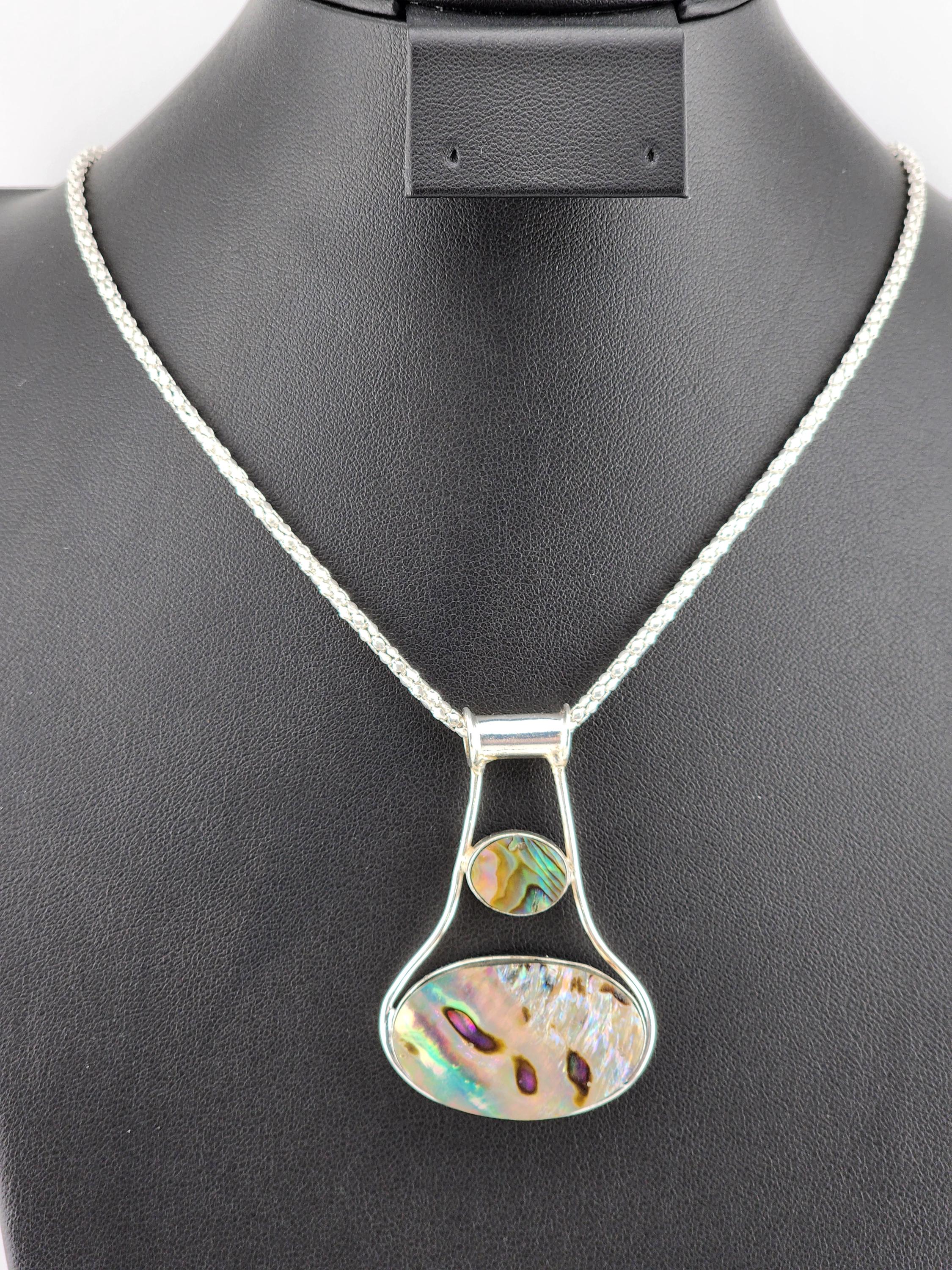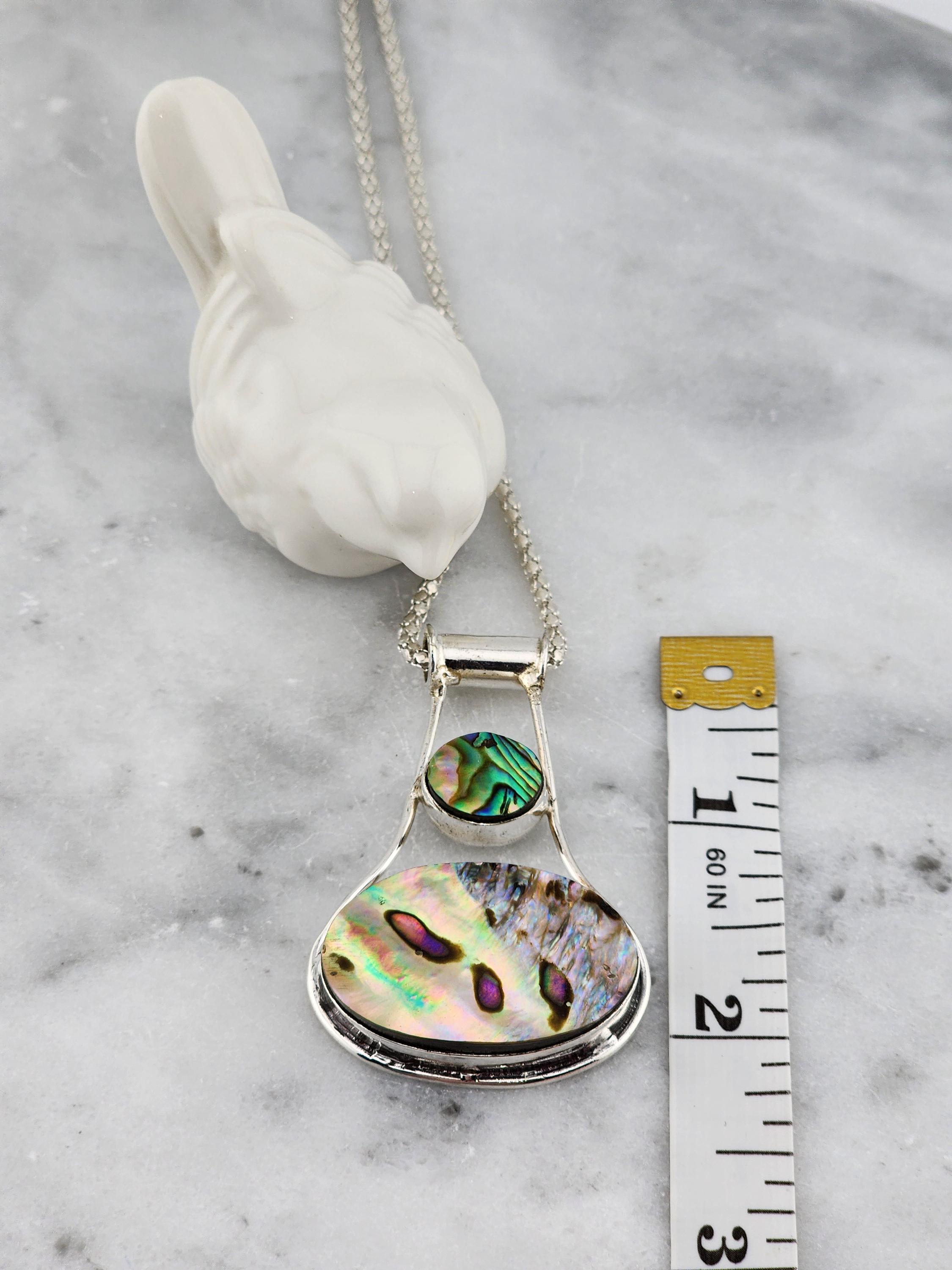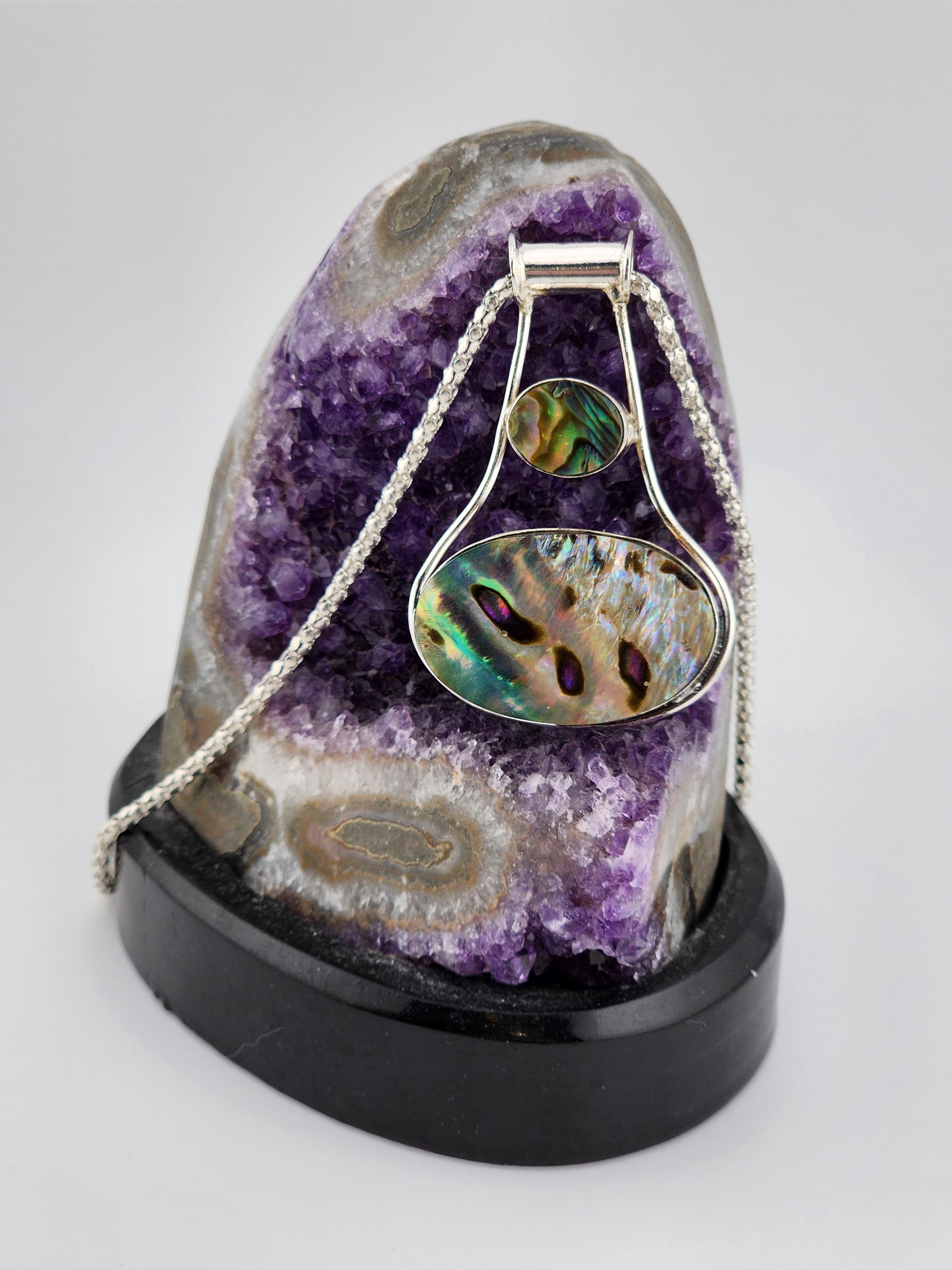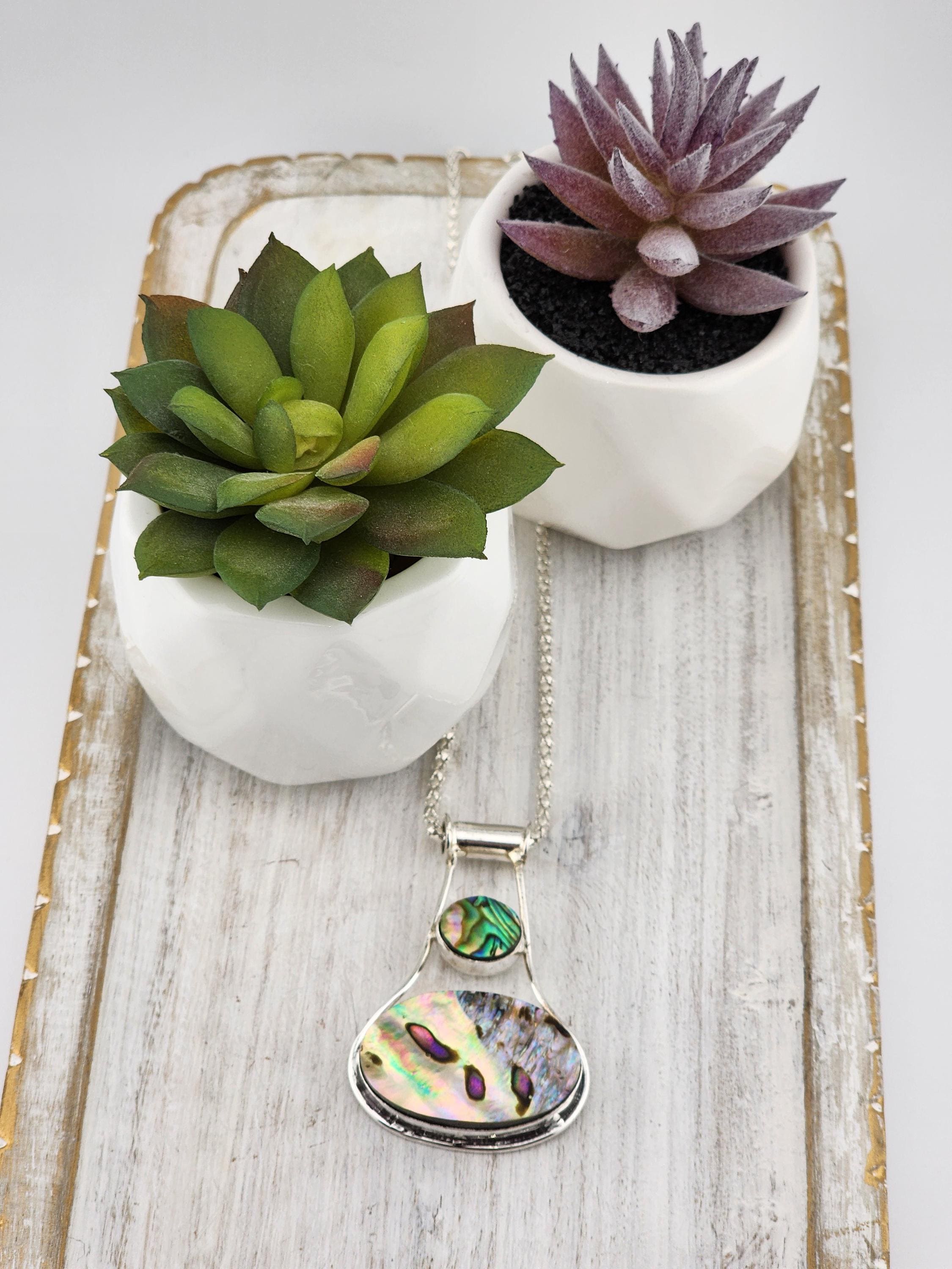 I made this necklace using beautiful hollow designer sterling silver chain that has a 2 & 1/2" extender chain making it 20" - 22 & 1/2". The pendant I added is a handcrafted (in India) piece in sterling silver that boasts two sizes of oval shape abalone shell. It is a real artisan piece. >>>>>>>>>>>>>>>>>>>>>>>>>>>>>>>>>>>>>>>>>>>>>>>>>>>>>>>>>>>>>>>>>>>>>>>>>>>>>>>> * Your purchase will arrive in pretty packaging * Shipping is free within the U.S. >>>>>>>>>>>>>>>>>>>>>>>>>>>>>>>>>>>>>>>>>>>>>>>>>>>>>>>>>>>>>>>>>>>>>>>>>>>>>>>> The Benefits and Healing Qualities of Abalone: * Emotional Balance and Motivation * Anxiety Relief * Sensitivity and Self-Awareness * Relief from Muscular Problems * Proper Digestion * Immunity Boost * Better Relationships OR SO 'THEY' SAY... >>>>>>>>>>>>>>>>>>>>>>>>>>>>>>>>>>>>>>>>>>>>>>>>>>>>>>>>>>>>>>>>>>>>>>>>>>>>>>>> The Extraordinary Health Benefits of Silver: • A Holistic Boost to Overall Well-being. A silver ring is believed to go beyond mere ornamentation and serve as a catalyst for holistic well-being • An Immunity Powerhouse • Soothing Relief for Joint Pain • Amplifying Blood Circulation • Unleashing Inner Serenity OR SO 'THEY' SAY...