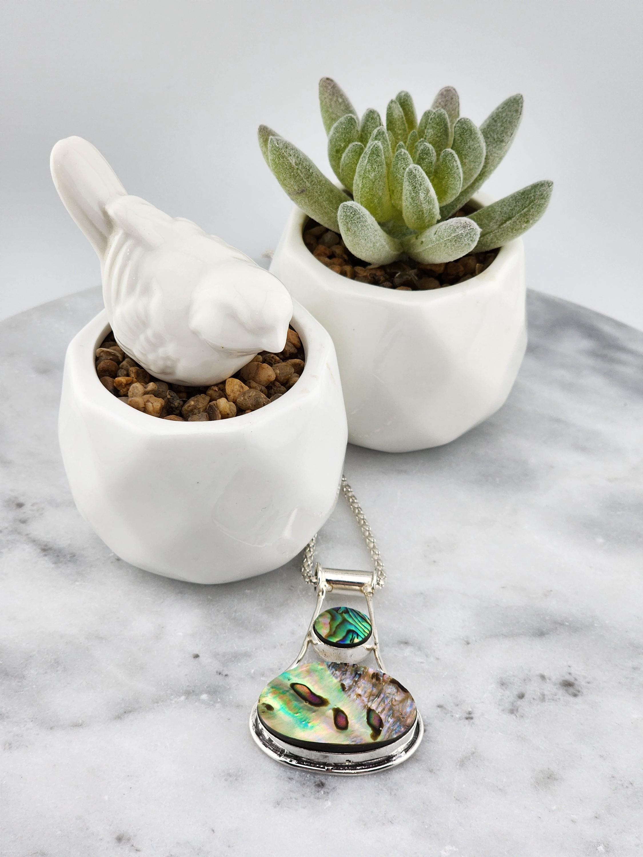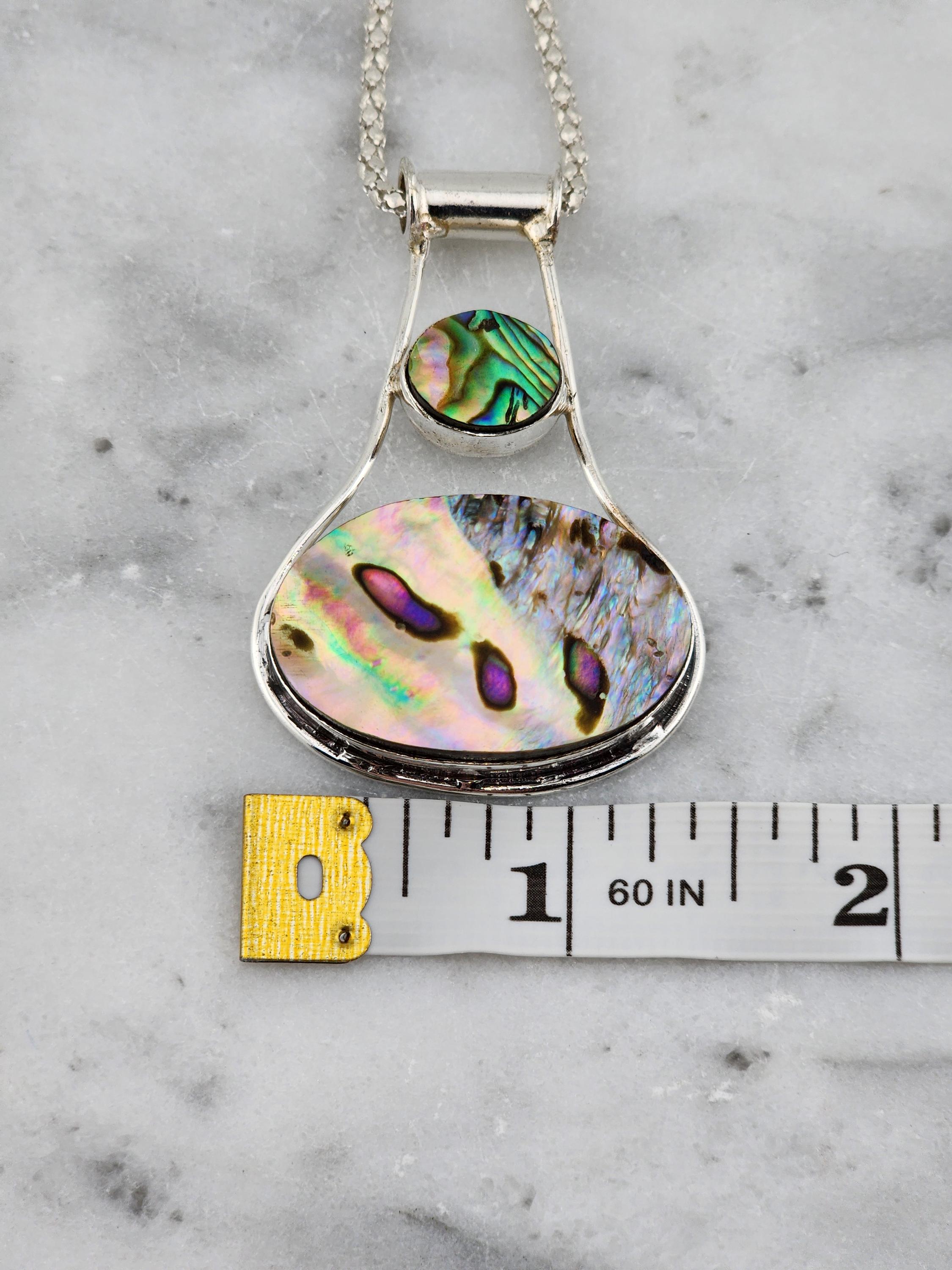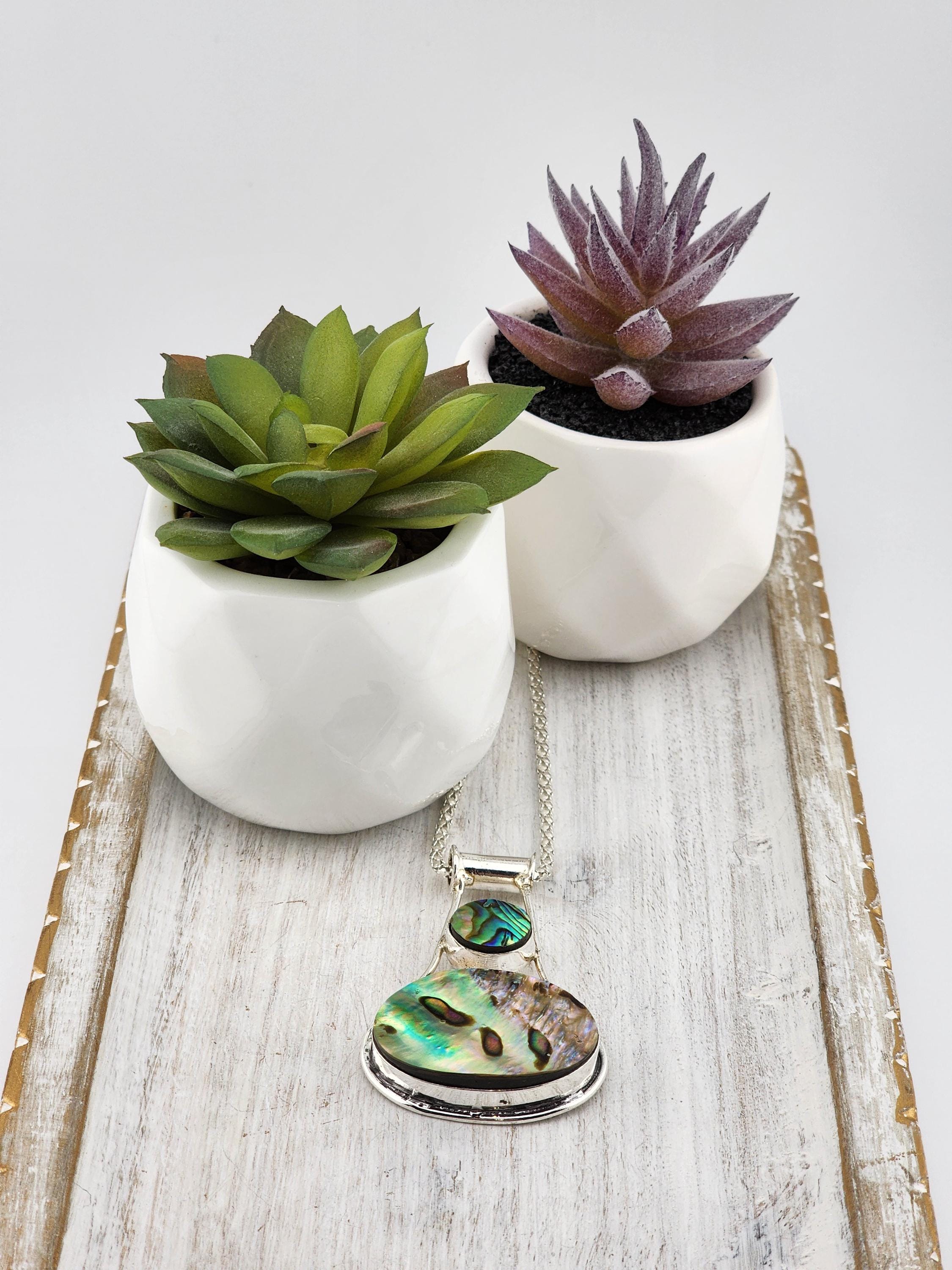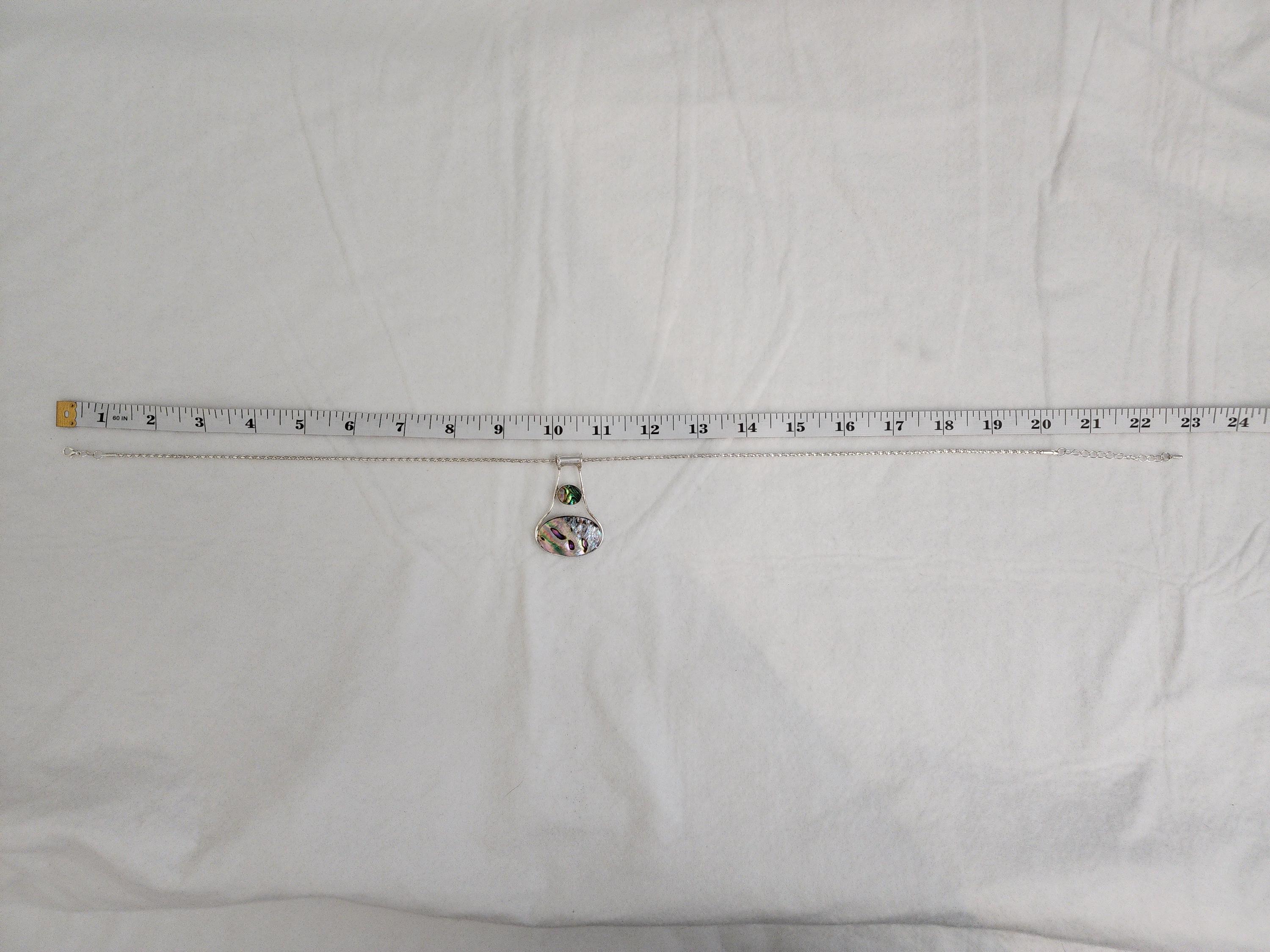 I made this necklace using beautiful hollow designer sterling silver chain that has a 2 & 1/2" extender chain making it 20" - 22 & 1/2". The pendant I added is a handcrafted (in India) piece in sterling silver that boasts two sizes of oval shape abalone shell. It is a real artisan piece. >>>>>>>>>>>>>>>>>>>>>>>>>>>>>>>>>>>>>>>>>>>>>>>>>>>>>>>>>>>>>>>>>>>>>>>>>>>>>>>> * Your purchase will arrive in pretty packaging * Shipping is free within the U.S. >>>>>>>>>>>>>>>>>>>>>>>>>>>>>>>>>>>>>>>>>>>>>>>>>>>>>>>>>>>>>>>>>>>>>>>>>>>>>>>> The Benefits and Healing Qualities of Abalone: * Emotional Balance and Motivation * Anxiety Relief * Sensitivity and Self-Awareness * Relief from Muscular Problems * Proper Digestion * Immunity Boost * Better Relationships OR SO 'THEY' SAY... >>>>>>>>>>>>>>>>>>>>>>>>>>>>>>>>>>>>>>>>>>>>>>>>>>>>>>>>>>>>>>>>>>>>>>>>>>>>>>>> The Extraordinary Health Benefits of Silver: • A Holistic Boost to Overall Well-being. A silver ring is believed to go beyond mere ornamentation and serve as a catalyst for holistic well-being • An Immunity Powerhouse • Soothing Relief for Joint Pain • Amplifying Blood Circulation • Unleashing Inner Serenity OR SO 'THEY' SAY...