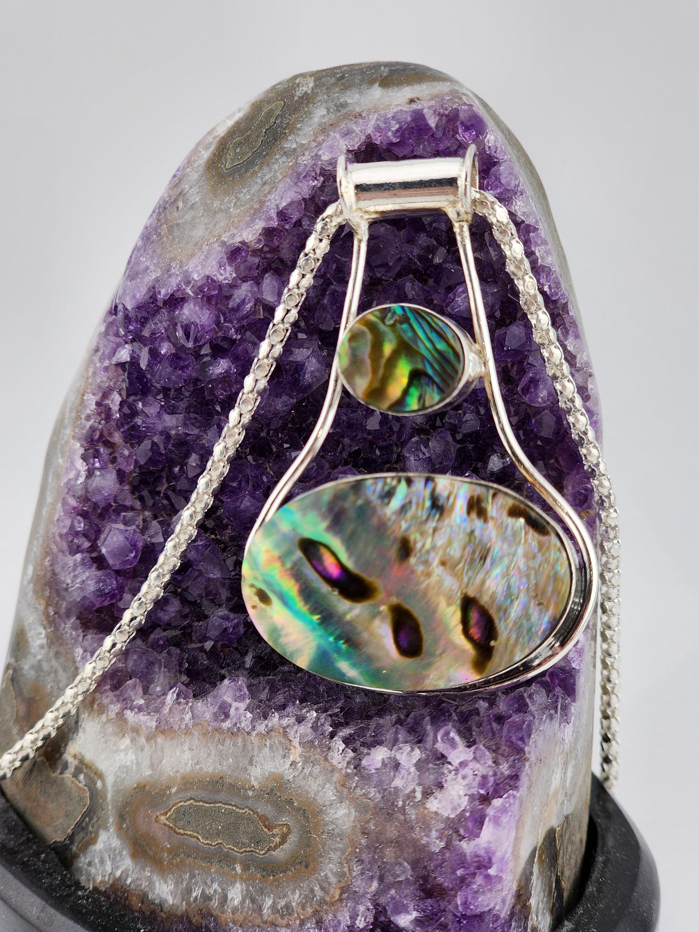 I made this necklace using beautiful hollow designer sterling silver chain that has a 2 & 1/2" extender chain making it 20" - 22 & 1/2". The pendant I added is a handcrafted (in India) piece in sterling silver that boasts two sizes of oval shape abalone shell. It is a real artisan piece. >>>>>>>>>>>>>>>>>>>>>>>>>>>>>>>>>>>>>>>>>>>>>>>>>>>>>>>>>>>>>>>>>>>>>>>>>>>>>>>> * Your purchase will arrive in pretty packaging * Shipping is included >>>>>>>>>>>>>>>>>>>>>>>>>>>>>>>>>>>>>>>>>>>>>>>>>>>>>>>>>>>>>>>>>>>>>>>>>>>>>>>> The Benefits and Healing Qualities of Abalone: * Emotional Balance and Motivation * Anxiety Relief * Sensitivity and Self-Awareness * Relief from Muscular Problems * Proper Digestion * Immunity Boost * Better Relationships OR SO 'THEY' SAY... >>>>>>>>>>>>>>>>>>>>>>>>>>>>>>>>>>>>>>>>>>>>>>>>>>>>>>>>>>>>>>>>>>>>>>>>>>>>>>>> The Extraordinary Health Benefits of Silver: • A Holistic Boost to Overall Well-being. A silver ring is believed to go beyond mere ornamentation and serve as a catalyst for holistic well-being • An Immunity Powerhouse • Soothing Relief for Joint Pain • Amplifying Blood Circulation • Unleashing Inner Serenity OR SO 'THEY' SAY...