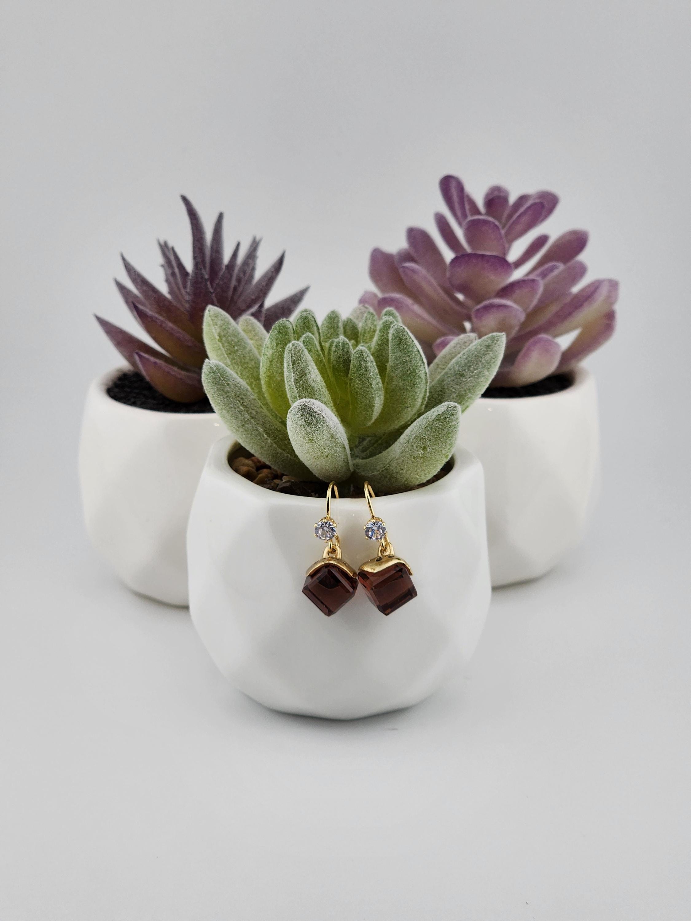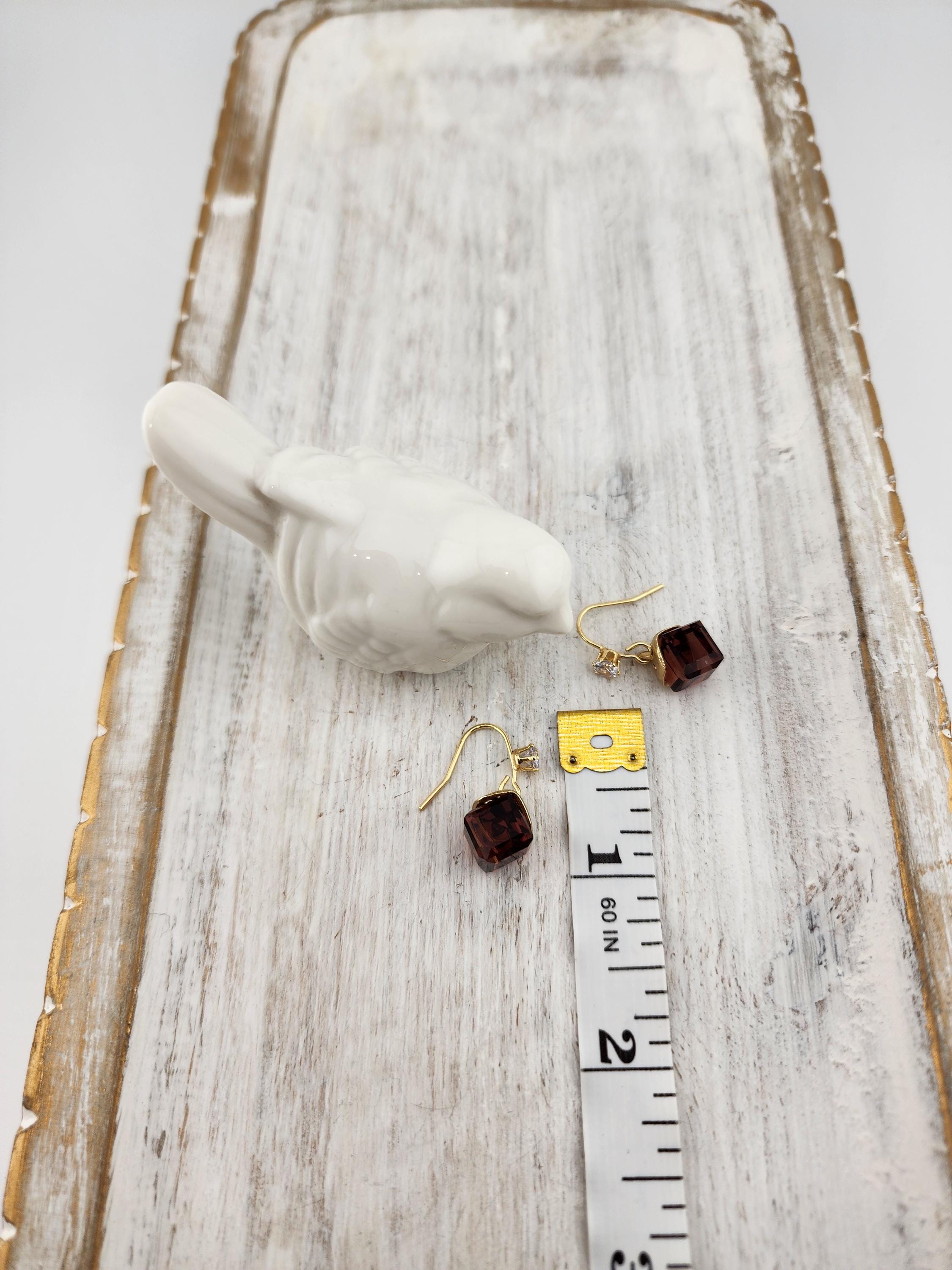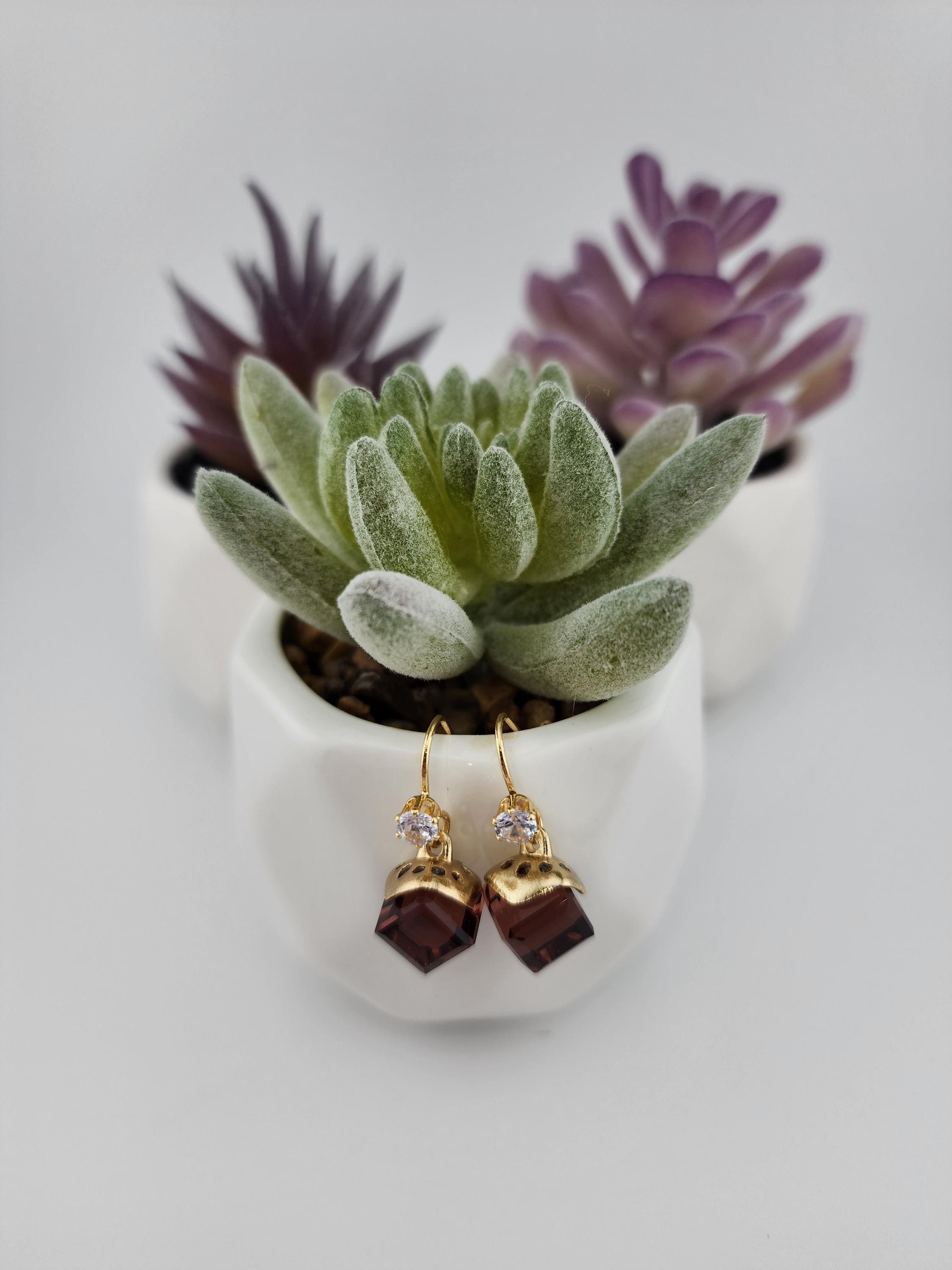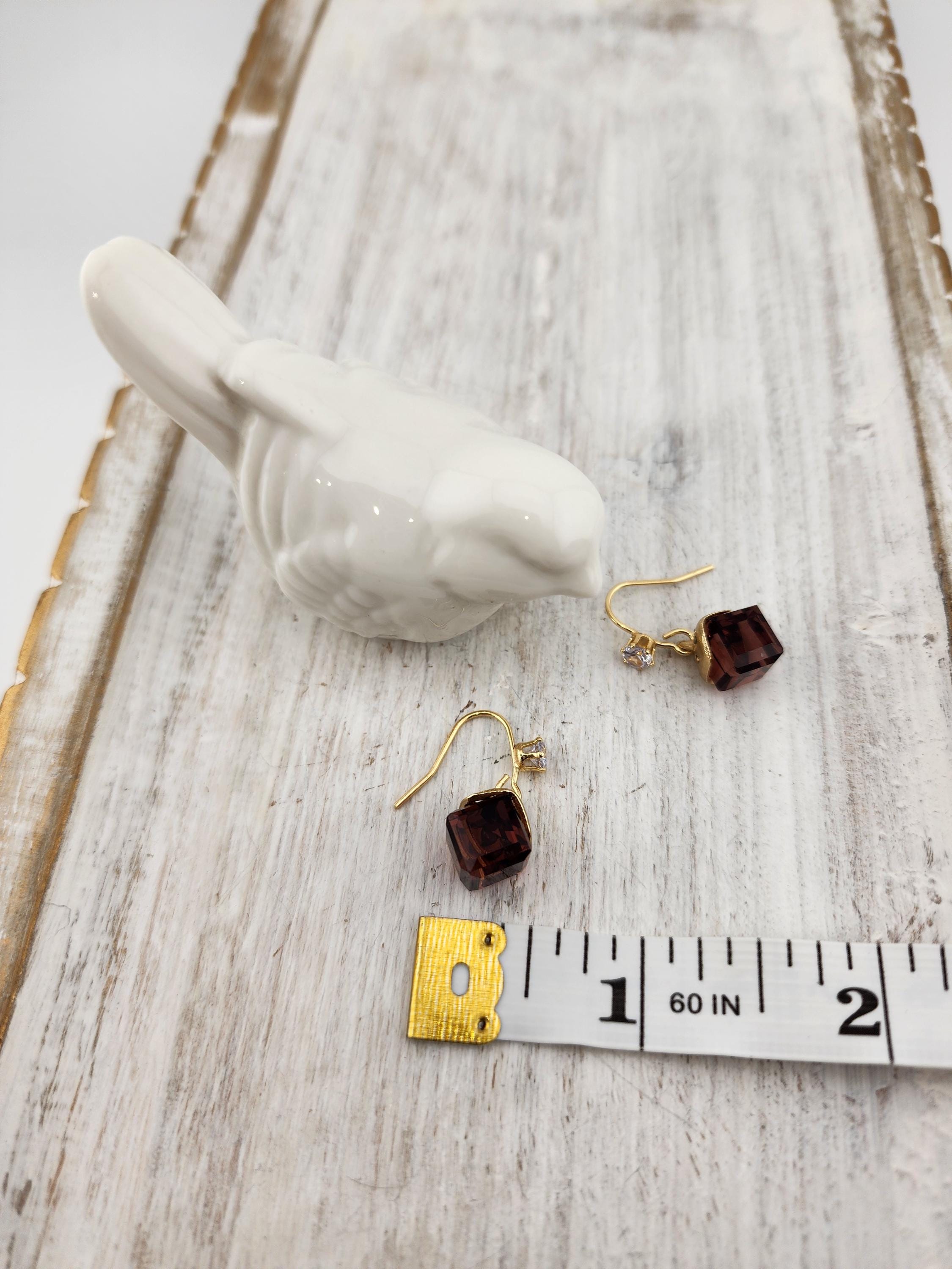 I made these earrings using tarnish resistant 18k gold plated brass ear wire hooks that have tiny cubic zirconia crystal. From them are hanging gold capped deep purple faceted crystal cubes. * Your purchase will arrive in pretty packaging * Shipping is free within the U.S.