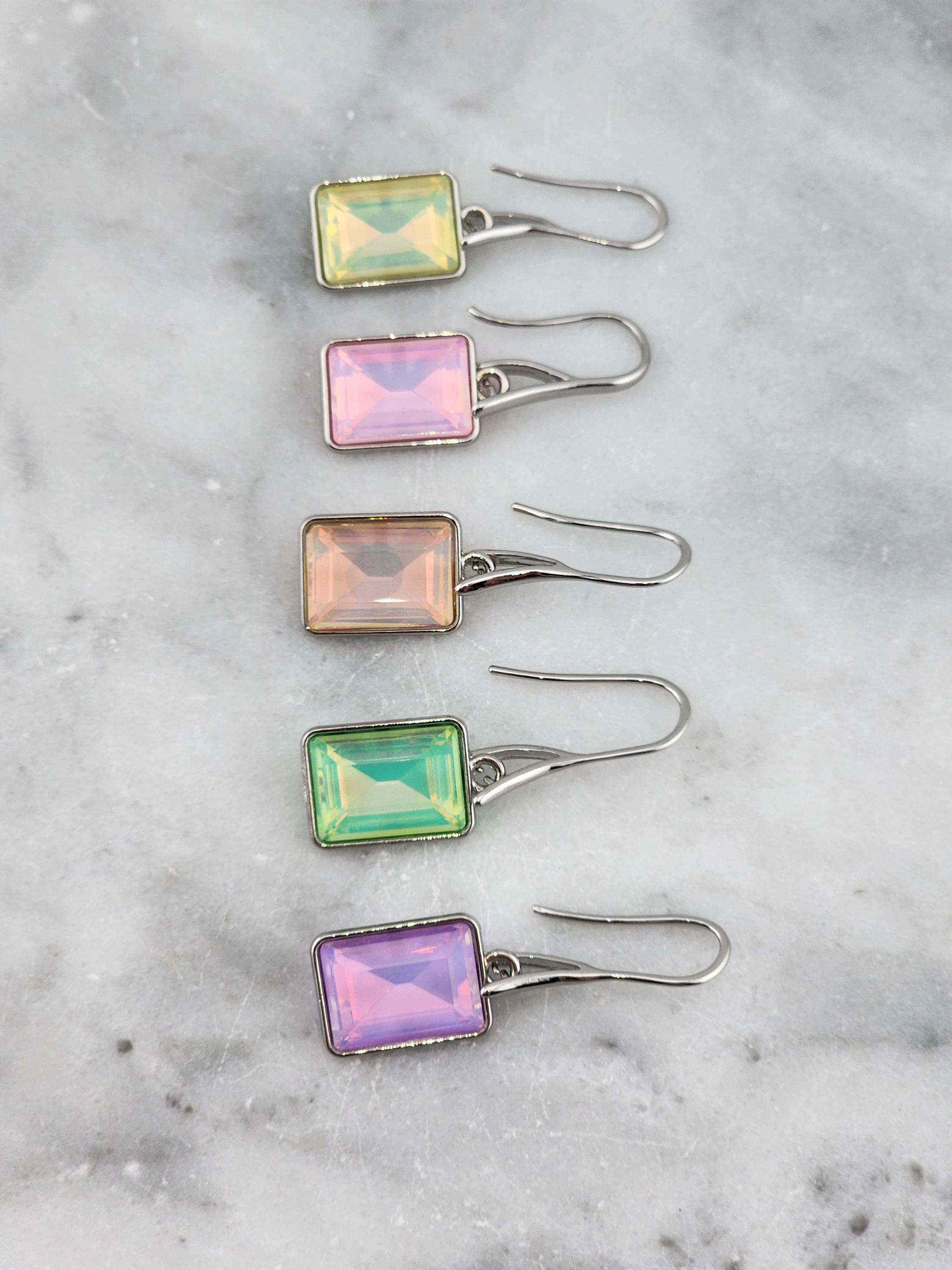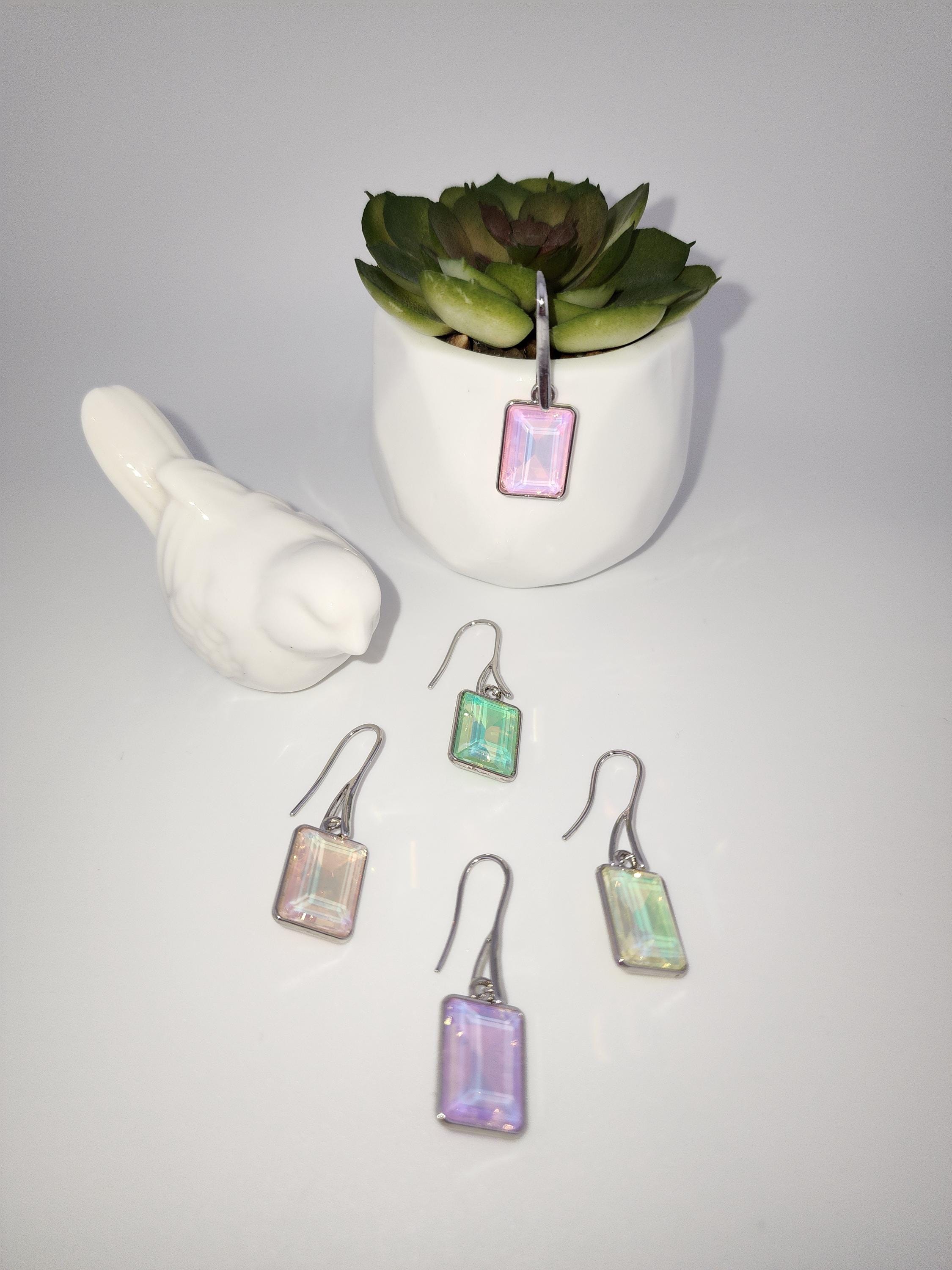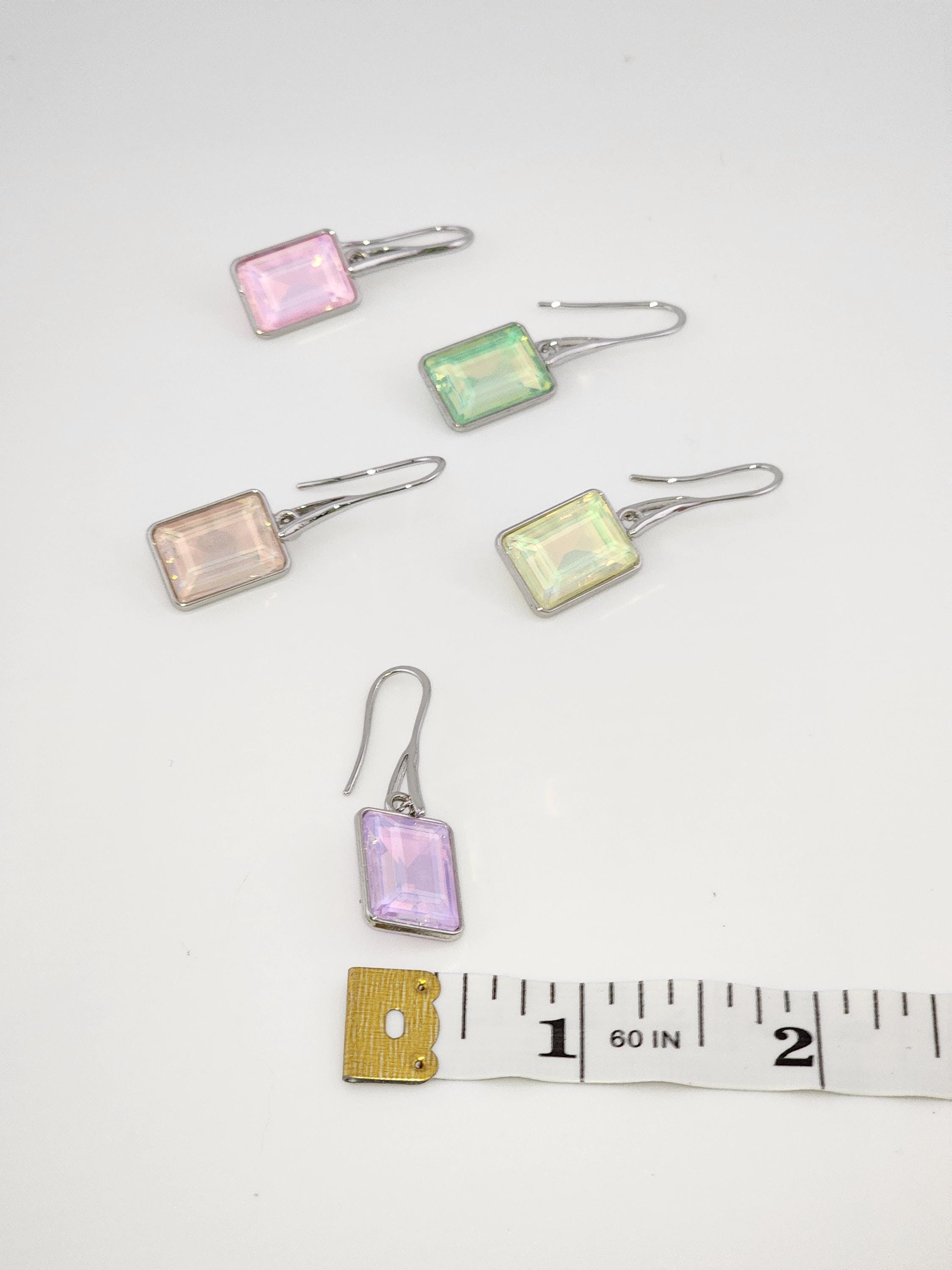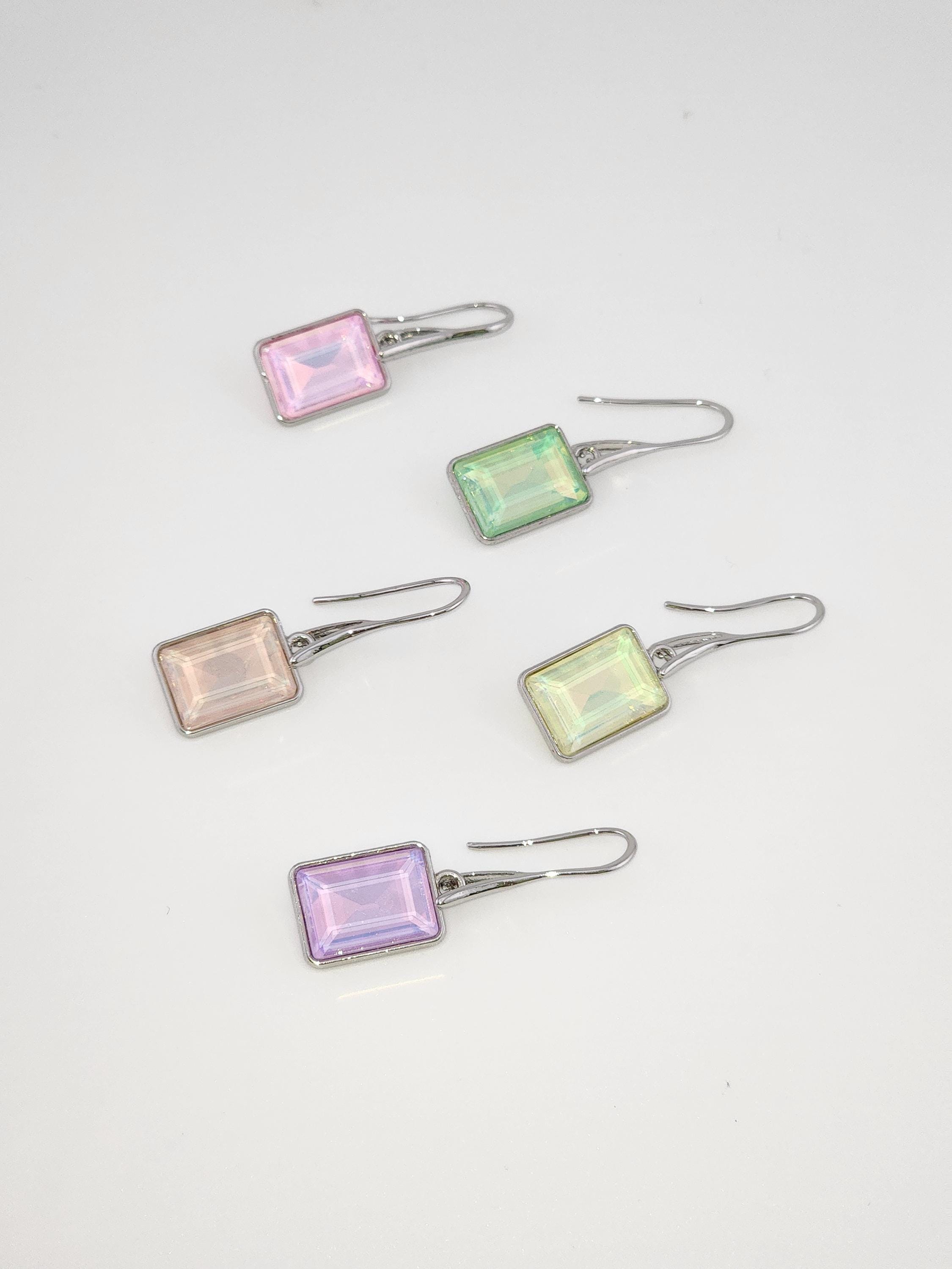 I made these earrings using platinum plated brass wire hooks. From them are multi-color, emerald shaped faceted crystal charms. YOUR CHOICES ARE: #1- Pink #2- Green #3- Purple #4- Peach #5- Yellow * Your purchase will arrive in pretty packaging * Shipping is included