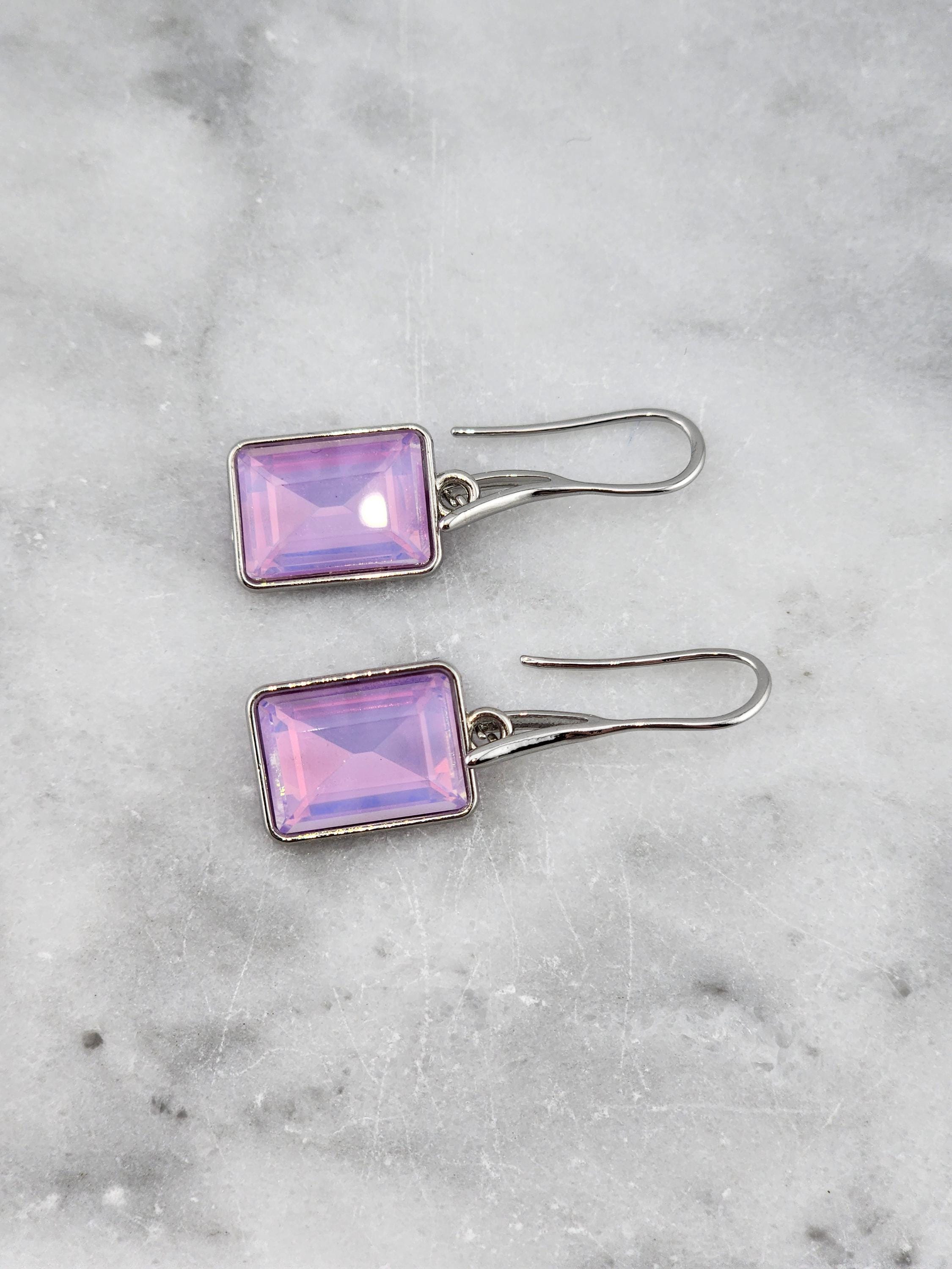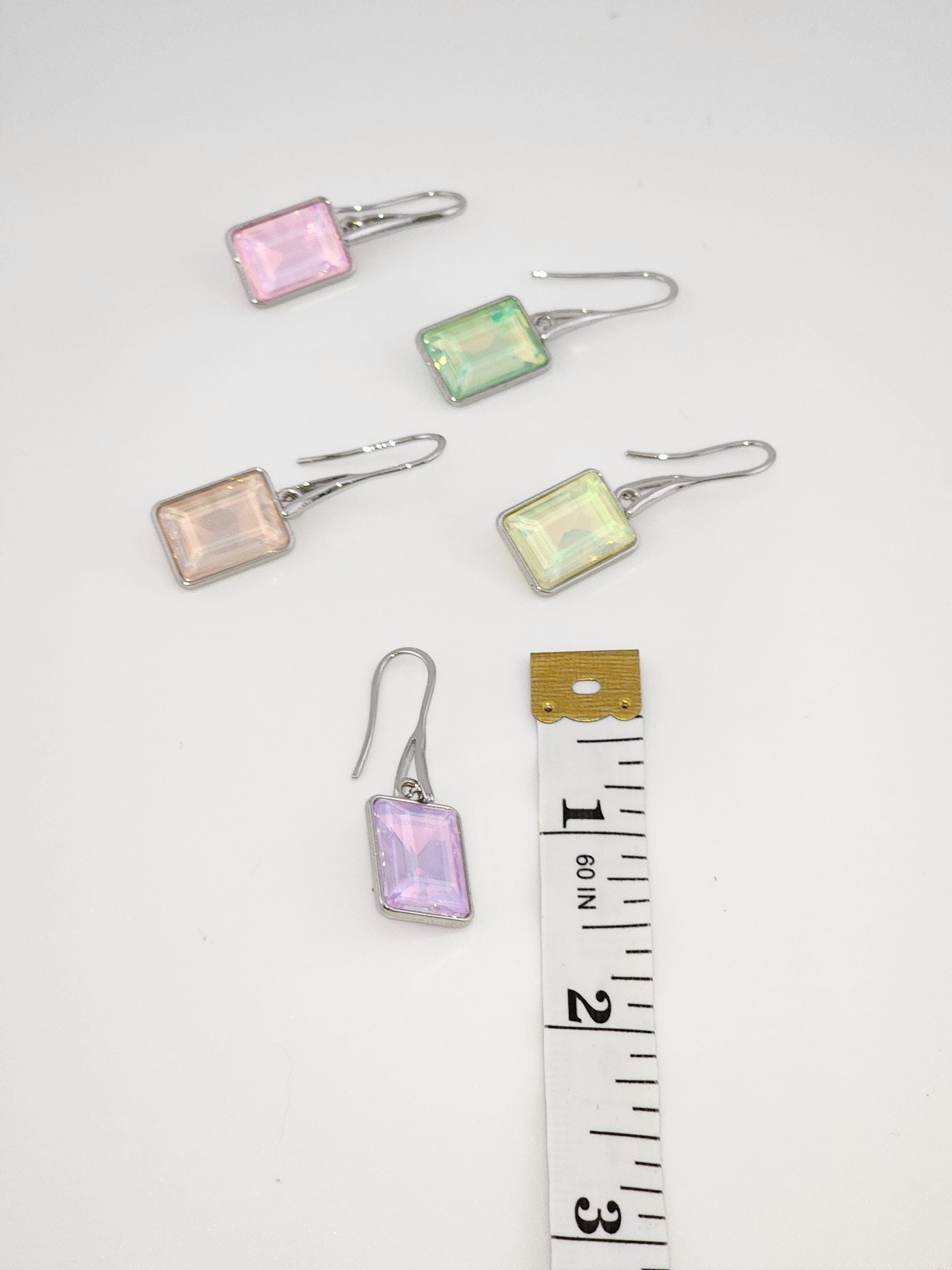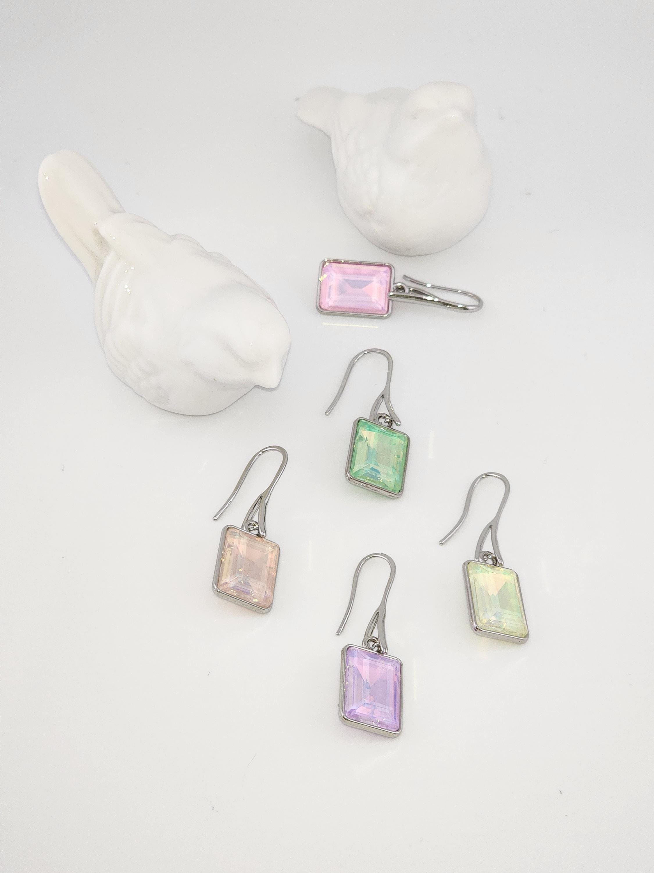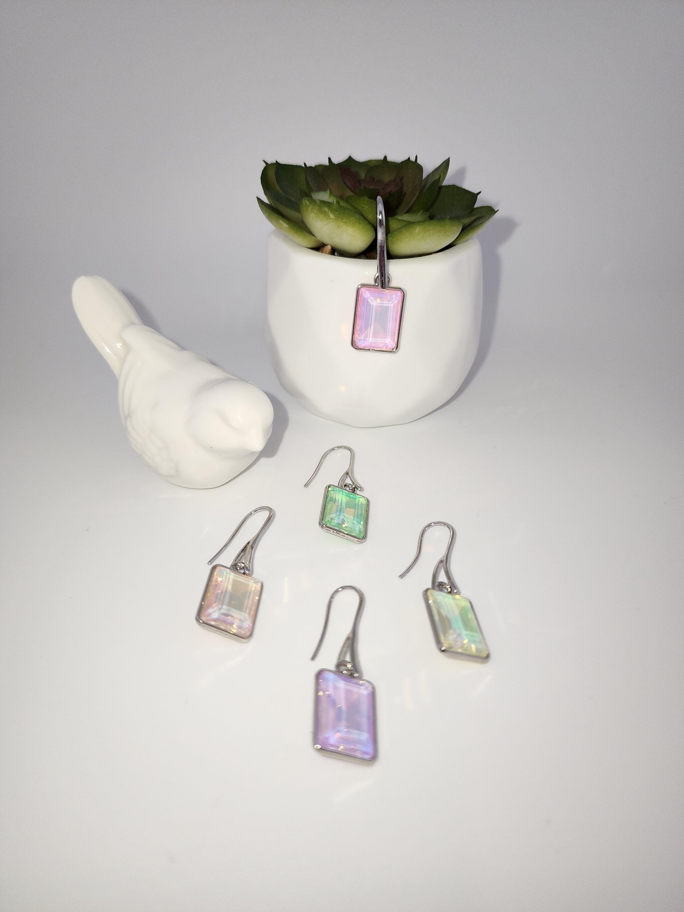 I made these earrings using platinum plated brass wire hooks. From them are multi-color, emerald shaped faceted crystal charms. YOUR CHOICES ARE: #1- Pink #2- Green #3- Purple #4- Peach #5- Yellow * Your purchase will arrive in pretty packaging * Shipping is included