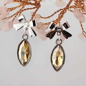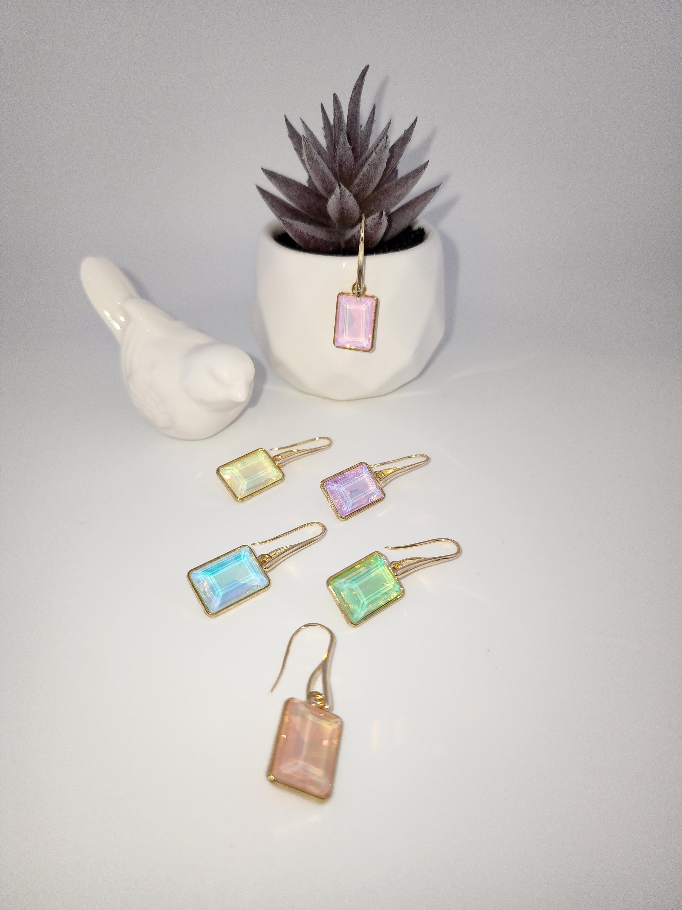 I made these earrings using tarnish resistant 18k gold plated brass wire hooks. From them are multi-color emerald shaped crystal charms. YOUR CHOICES ARE: #1- Pink #2- Yellow #3- Purple #4- Blue #5- Green #6- Peach * Your purchase will arrive in pretty packaging