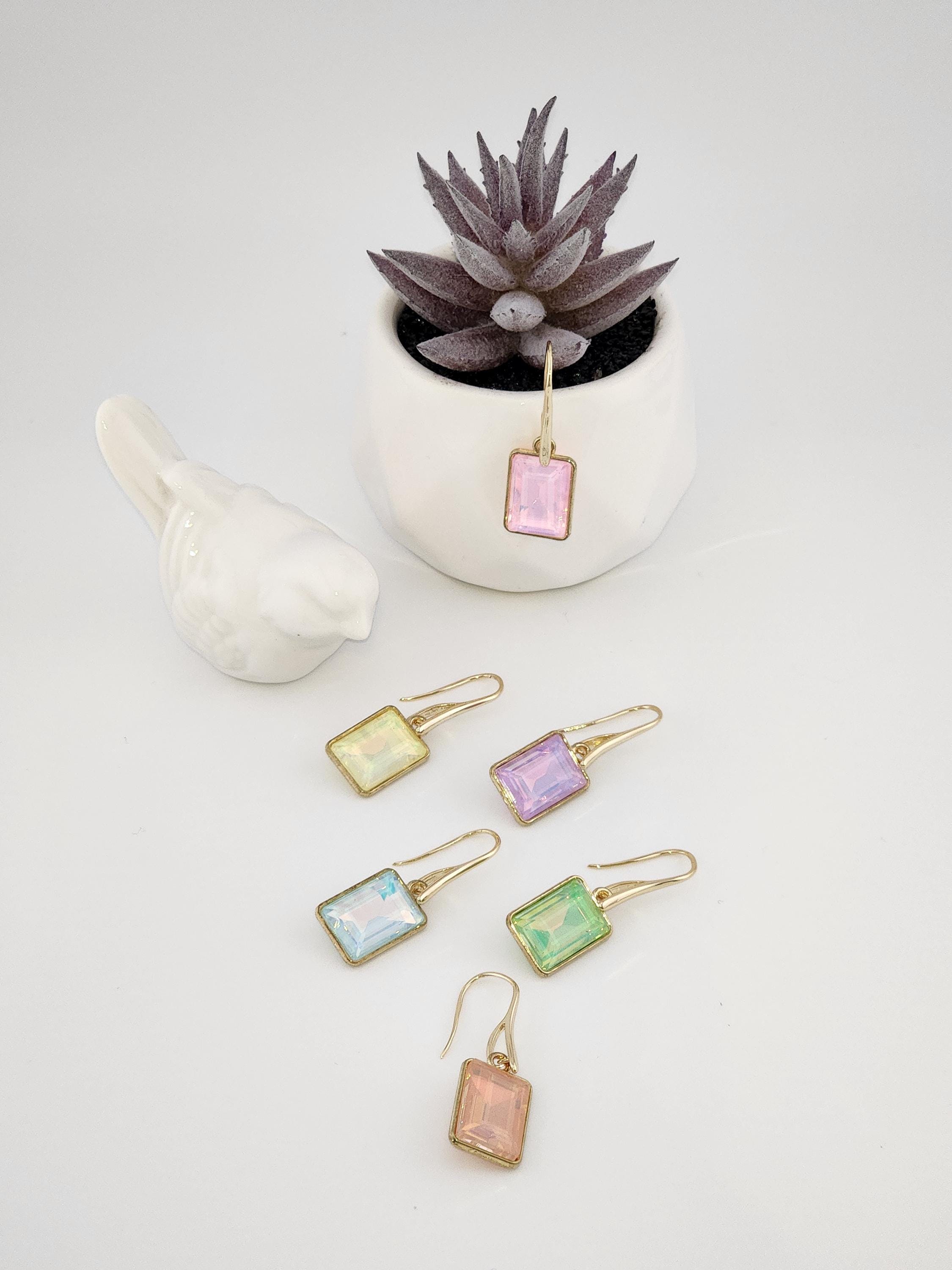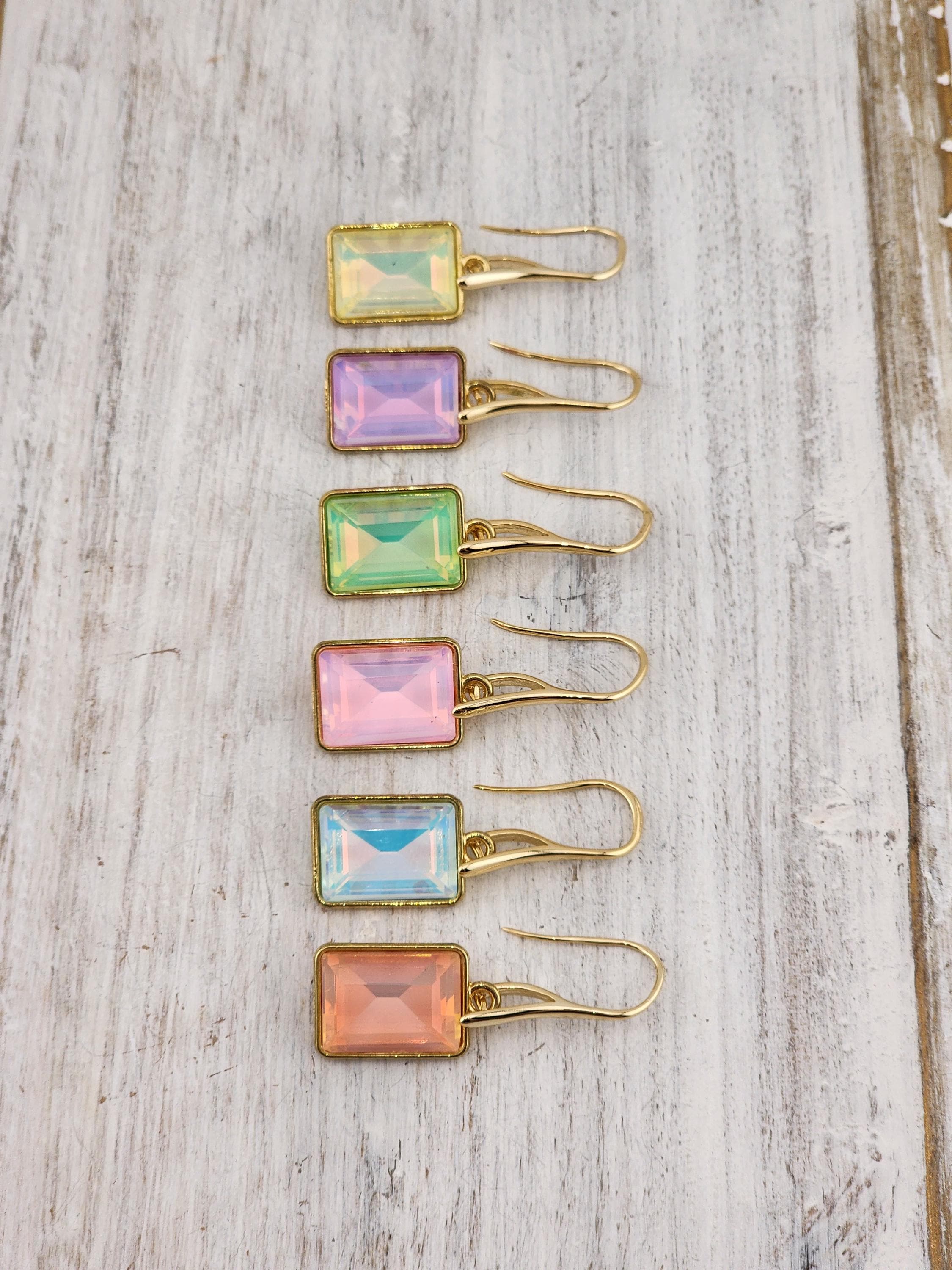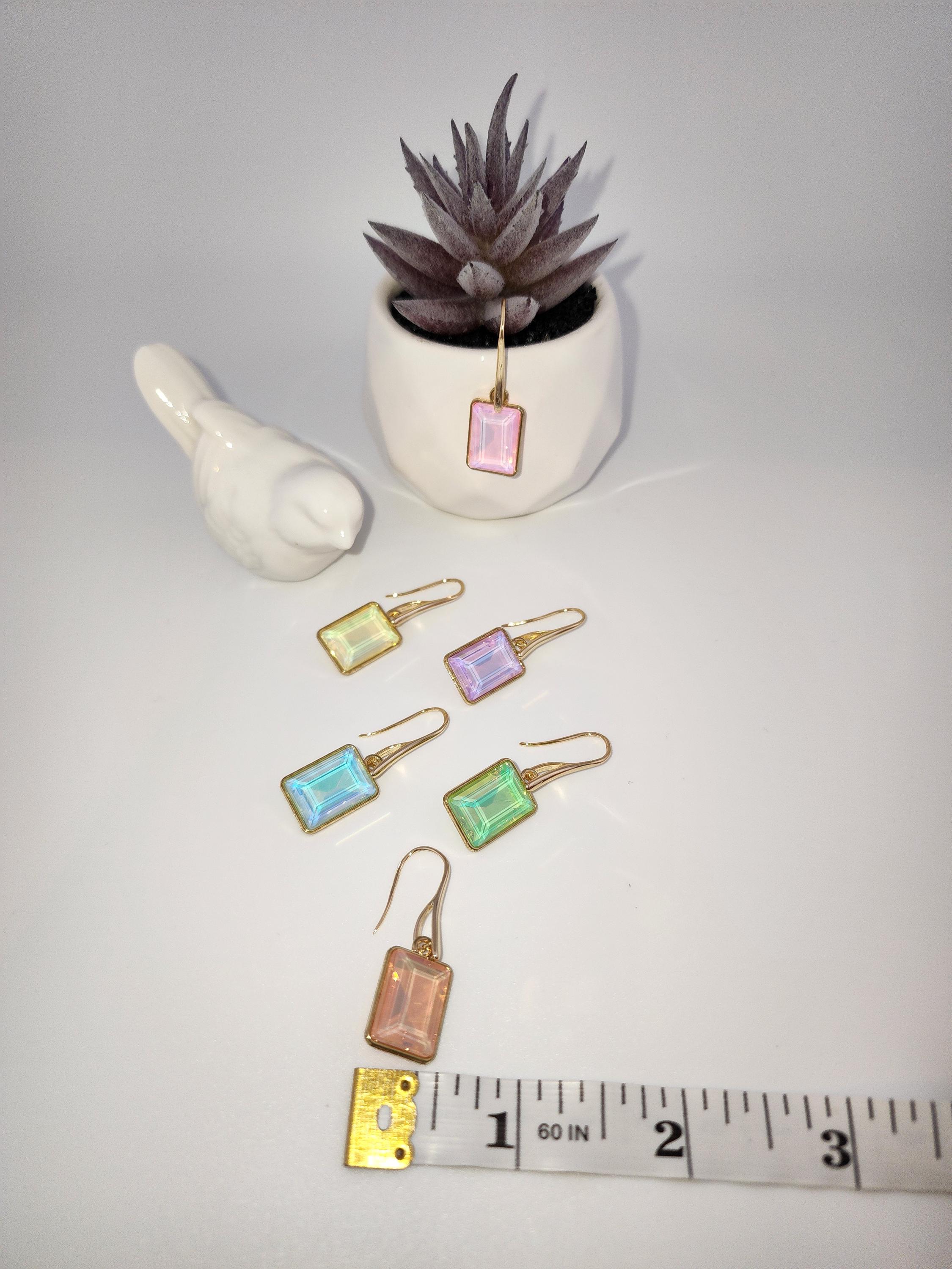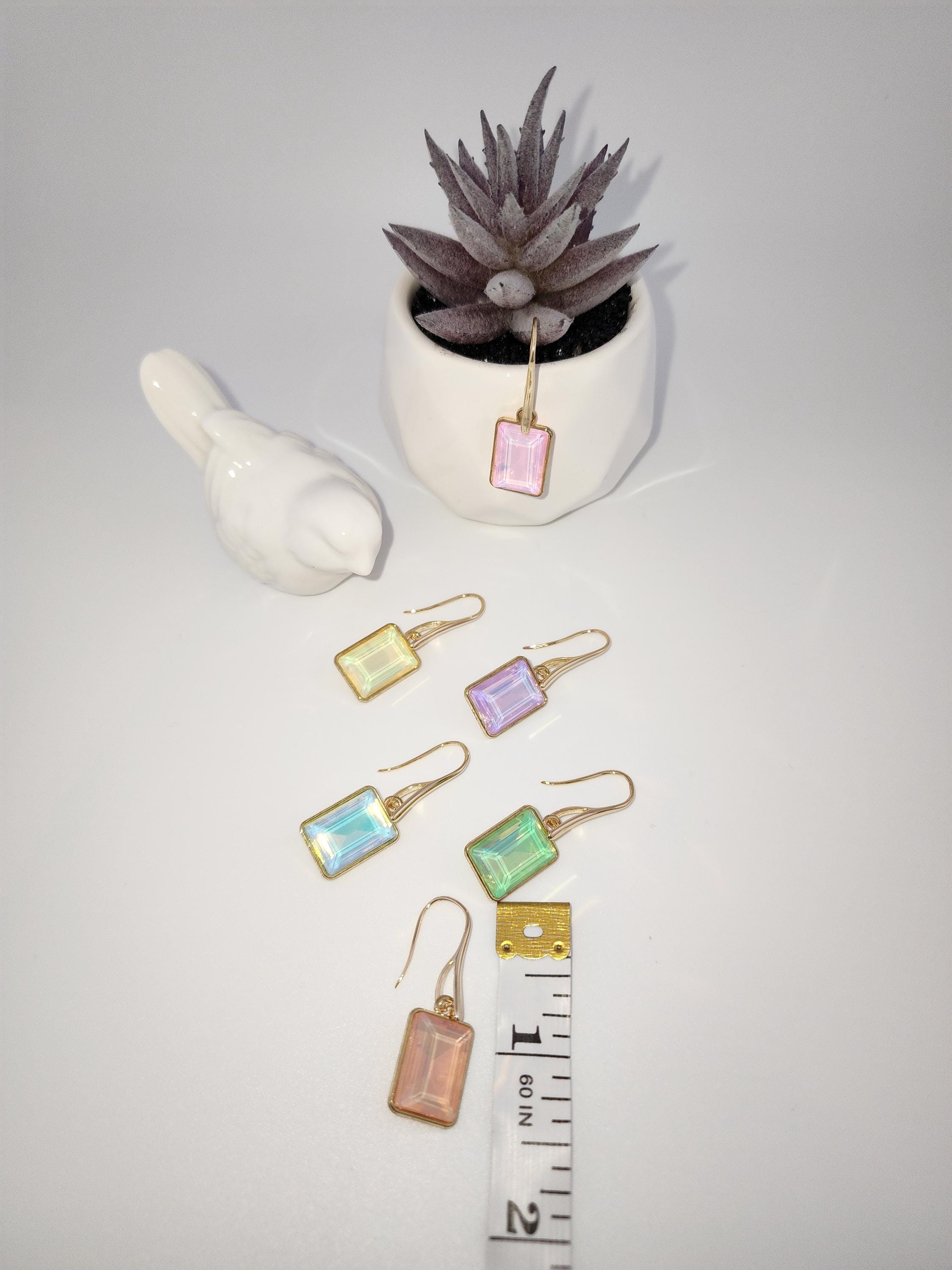 I made these earrings using tarnish resistant 18k gold plated brass wire hooks. From them are multi-color emerald shaped crystal charms. YOUR CHOICES ARE: #1- Pink #2- Yellow #3- Purple #4- Blue #5- Green #6- Peach * Your purchase will arrive in pretty packaging * Shipping is included