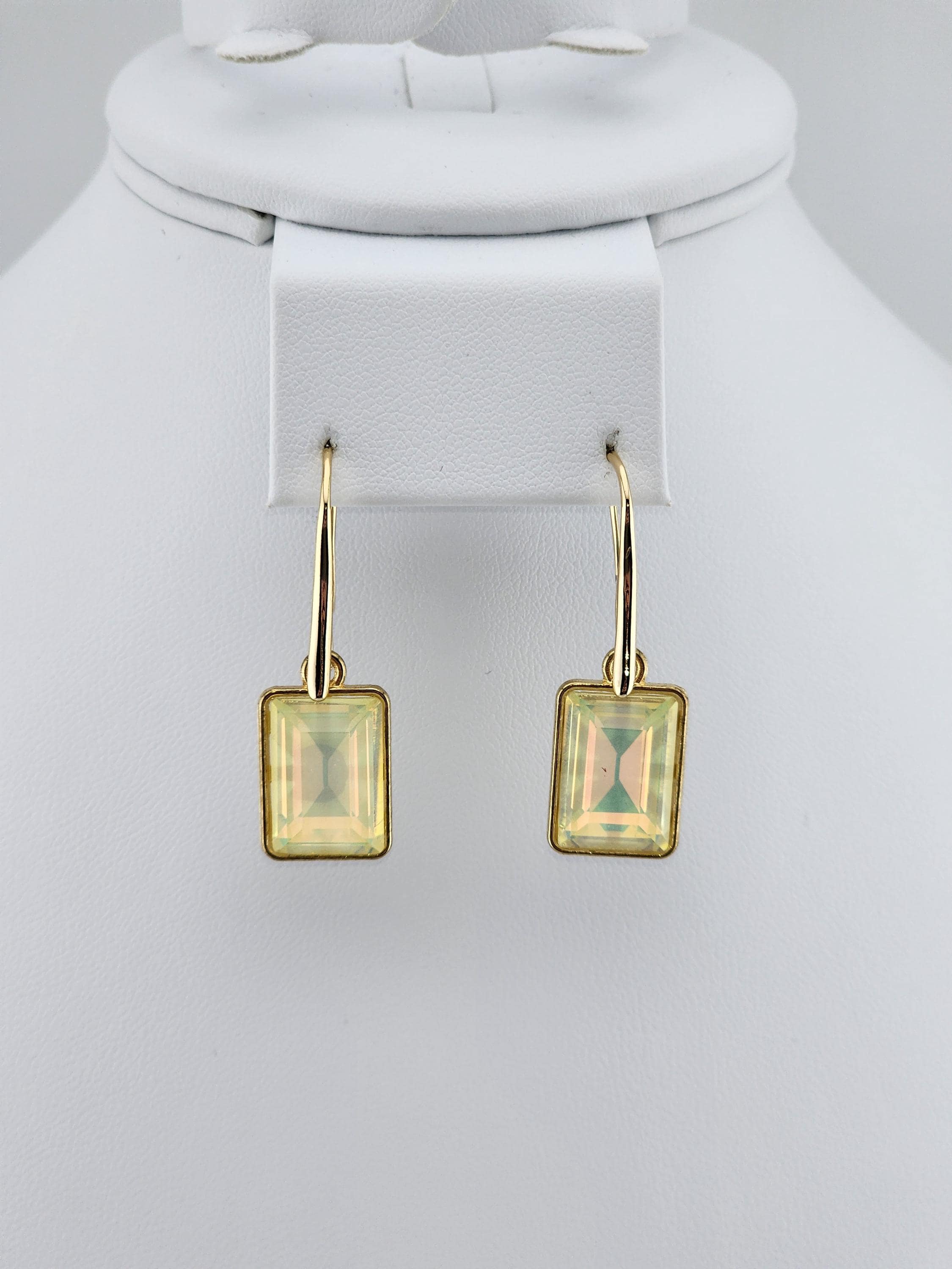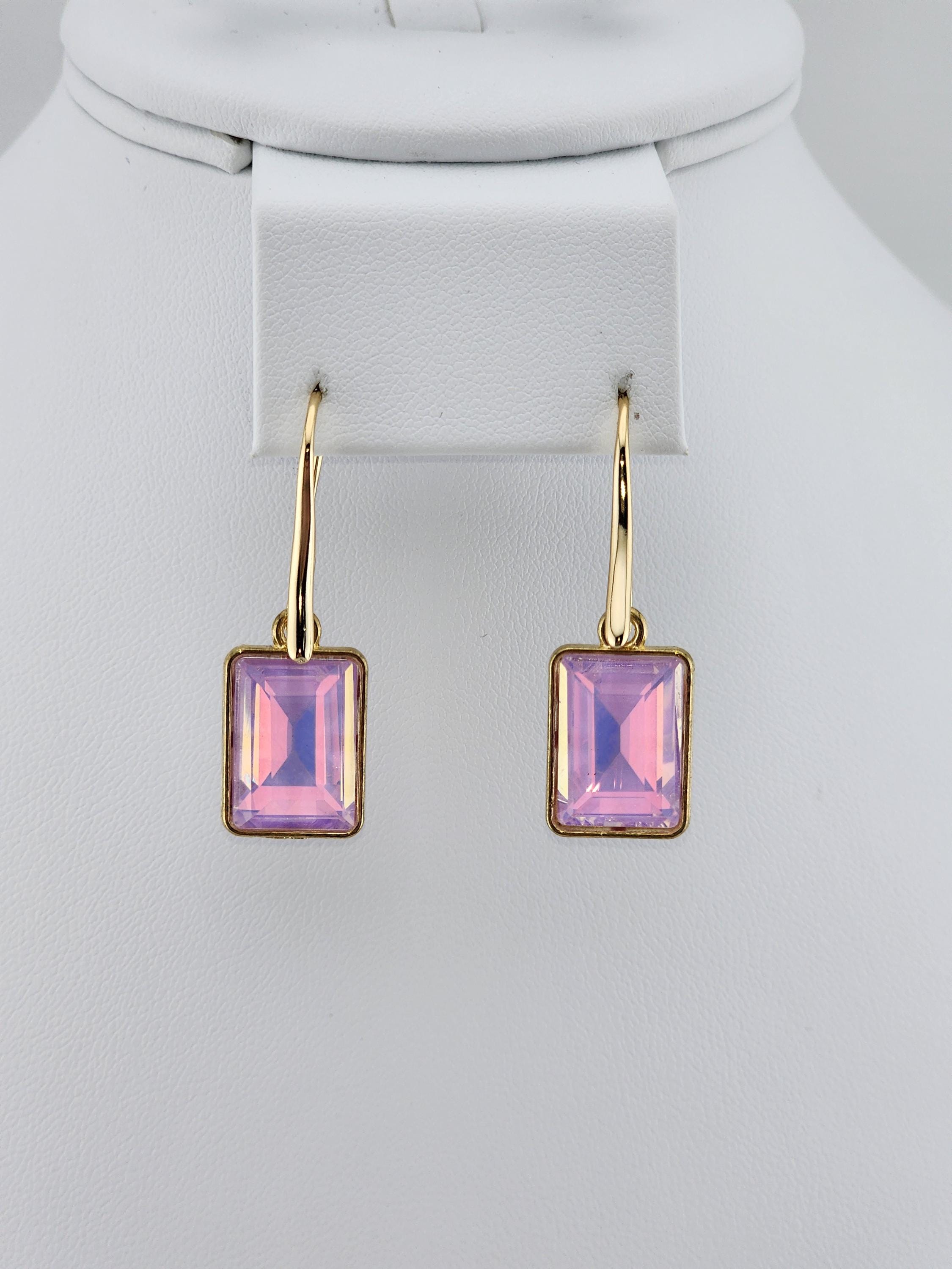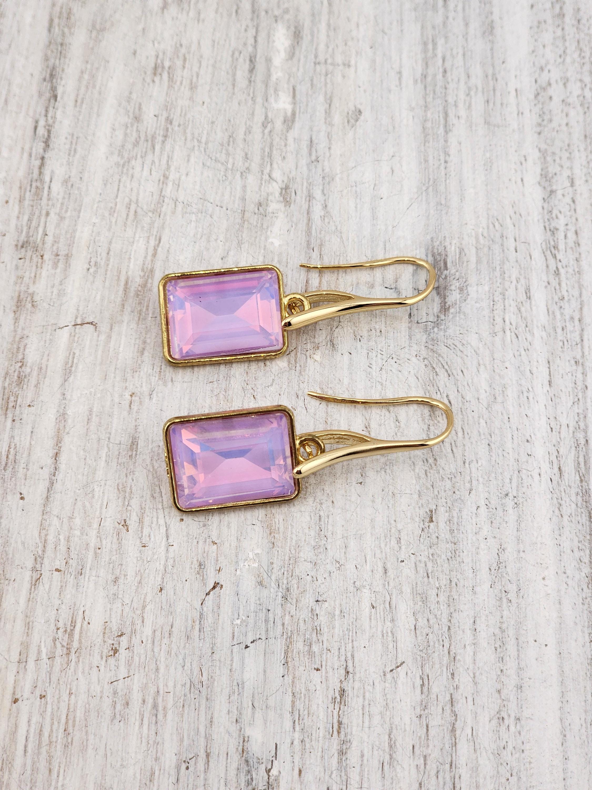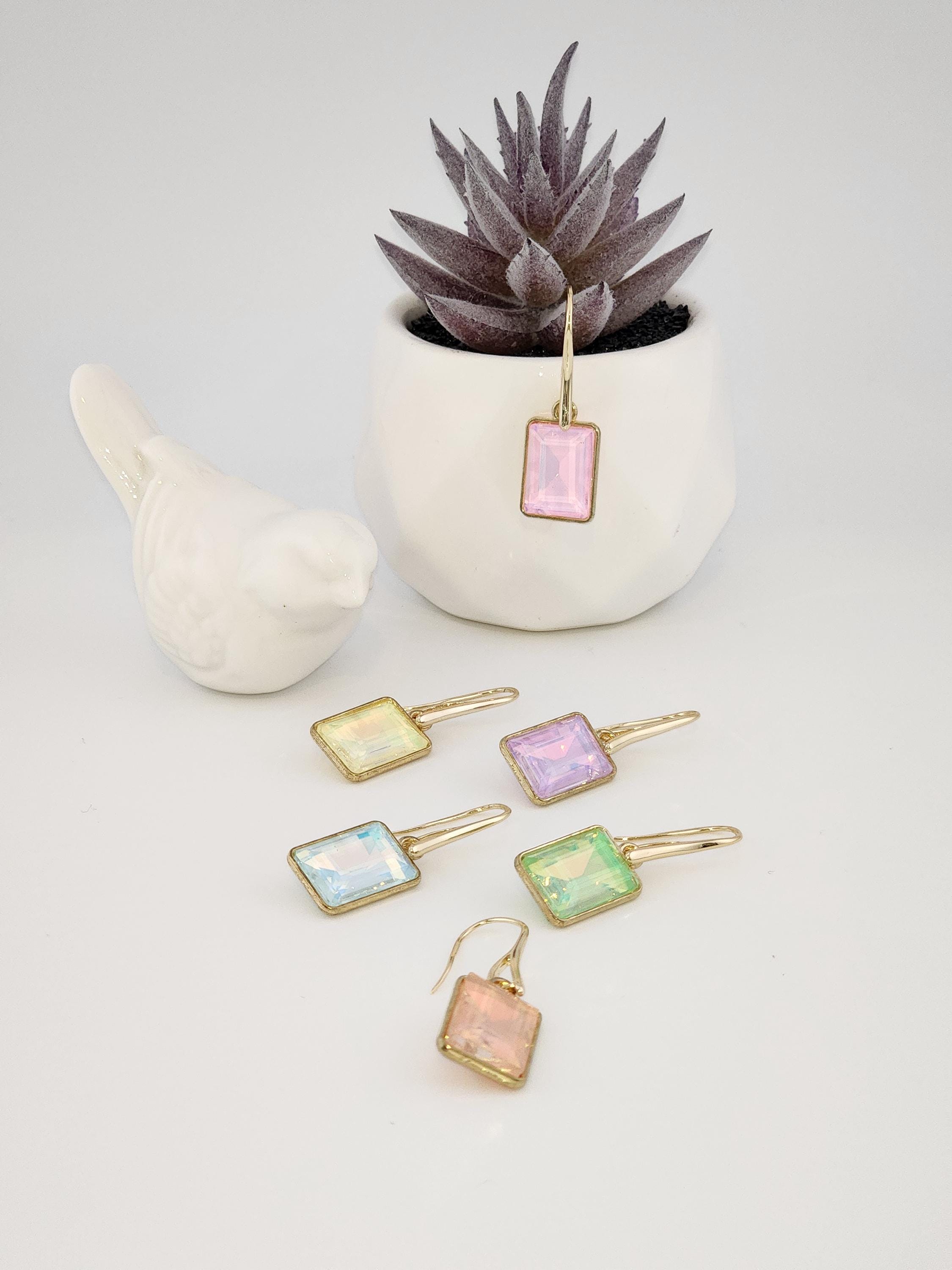 I made these earrings using tarnish resistant 18k gold plated brass wire hooks. From them are multi-color emerald shaped crystal charms. YOUR CHOICES ARE: #1- Pink #2- Yellow #3- Purple #4- Blue #5- Green #6- Peach * Your purchase will arrive in pretty packaging * Shipping is included