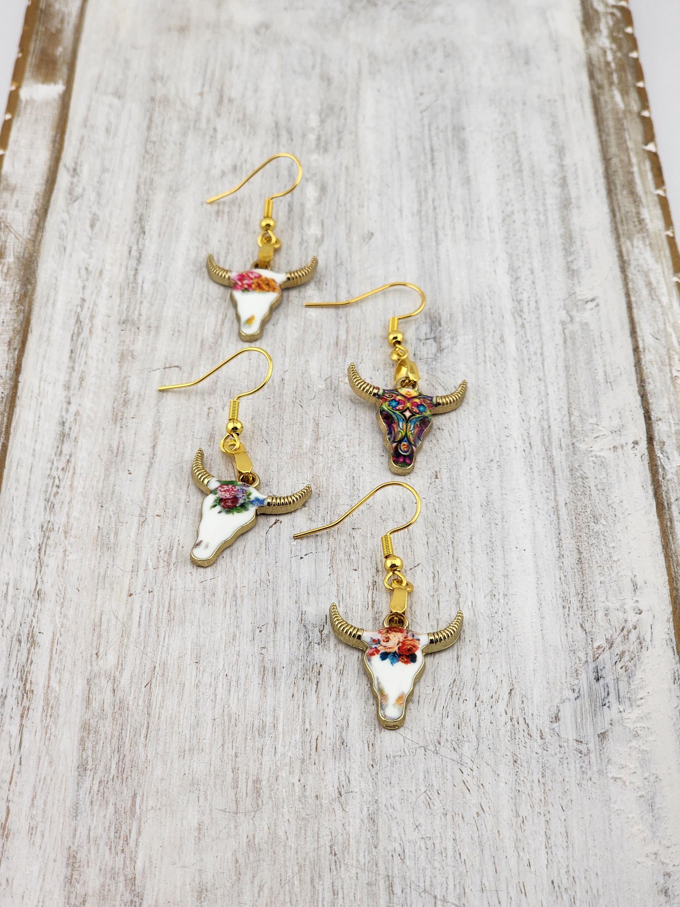These are gold dangle earrings. From each pair of these fun and cute earrings are different colors of cow skulls. YOUR CHOICES OF COLORS ARE: #1- Orange and Pink #2- Dark Multi-color #3- Turquoise and Peach #4- Rose and Pink * Your purchase will arrive in pretty packaging