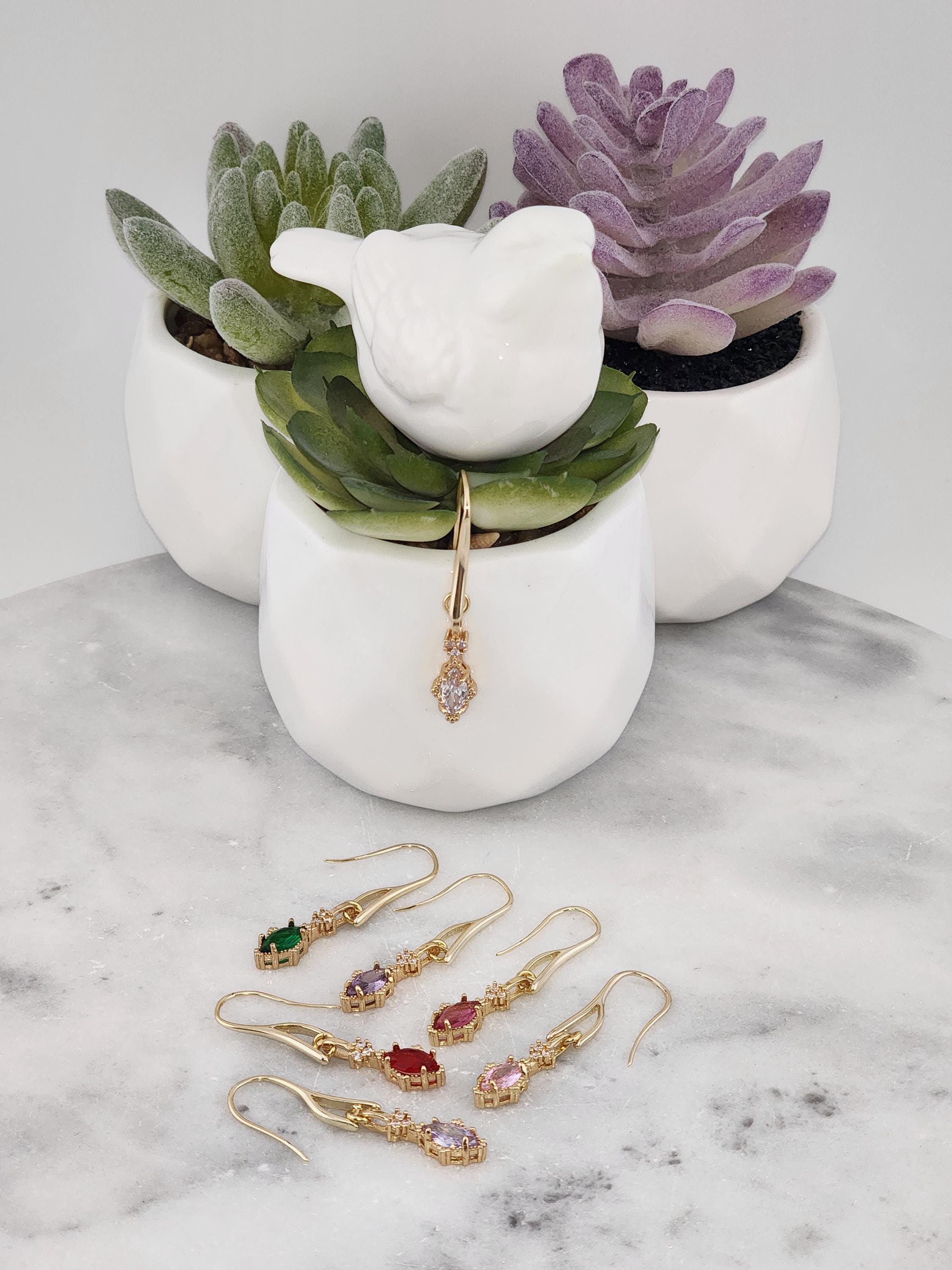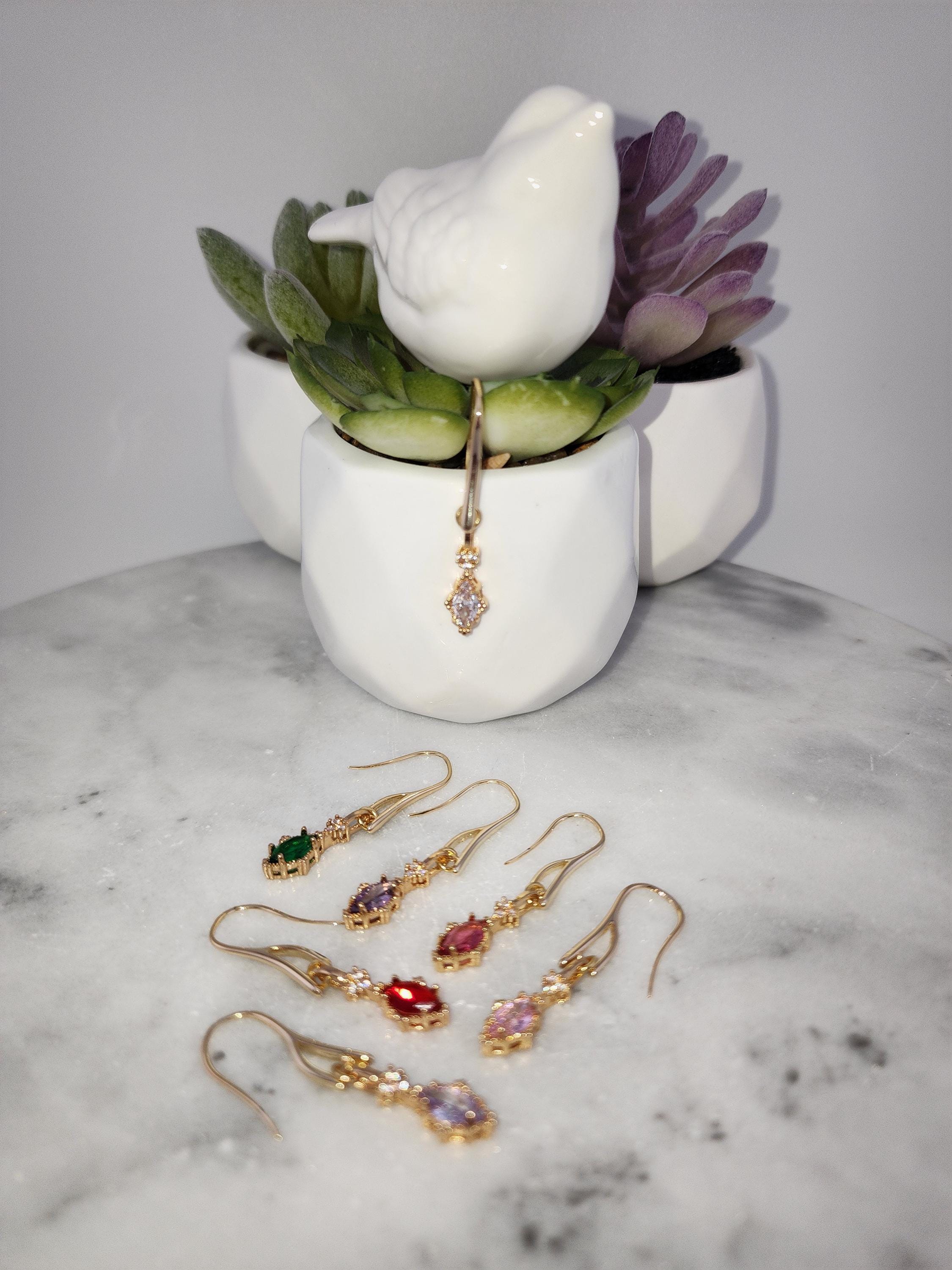 I made these earrings using tarnish resistant 18k gold plated brass wire hooks. From them are a multitude of colorful oval crystal charms set in 18k gold plated brass. YOUR CHOICE OF COLORS ARE: #1- Green #2- Purple #3- Pink #4- Lavender #5- Rose #6- Clear #7- Red * Your purchase will arrive in pretty packaging