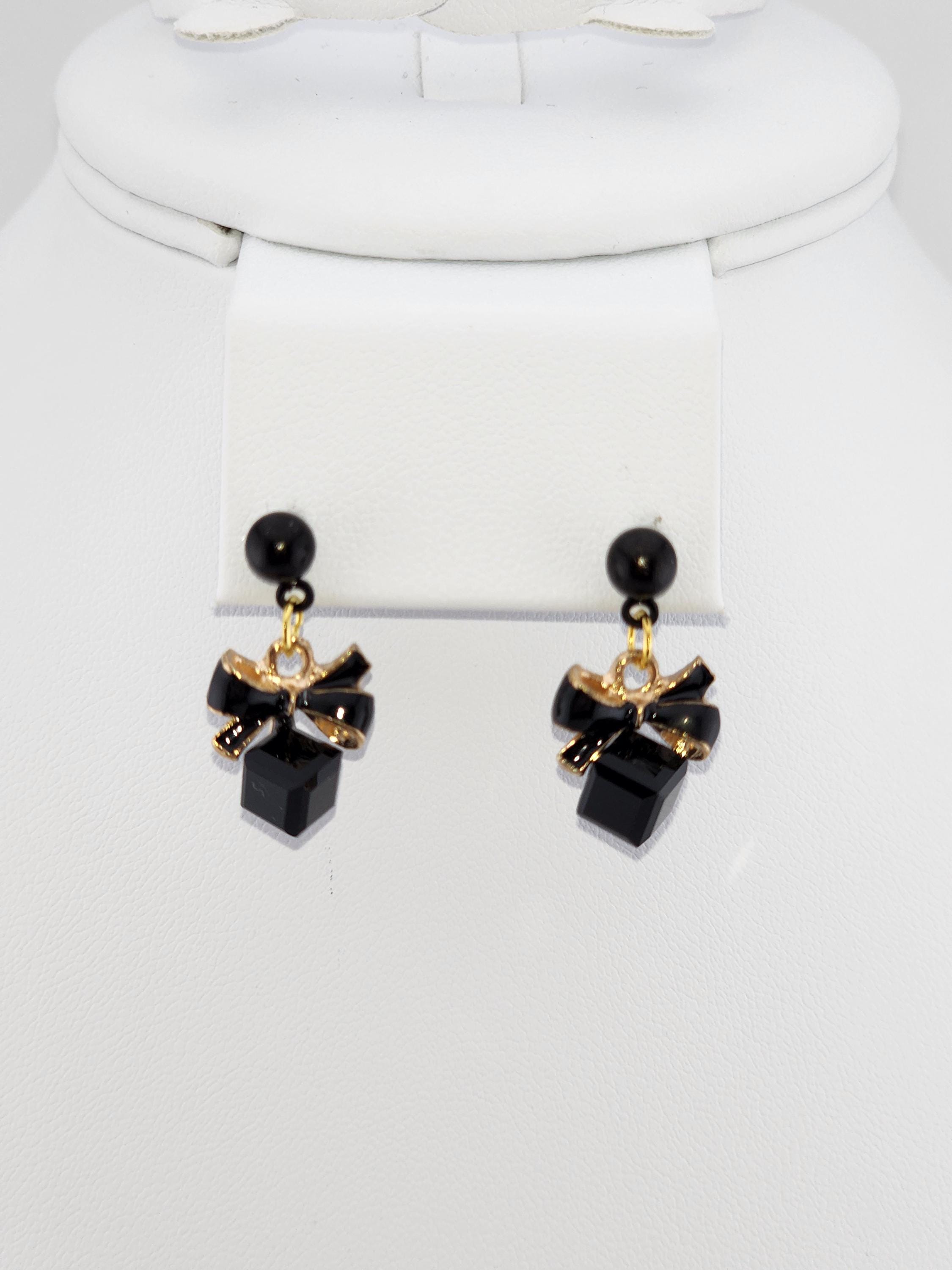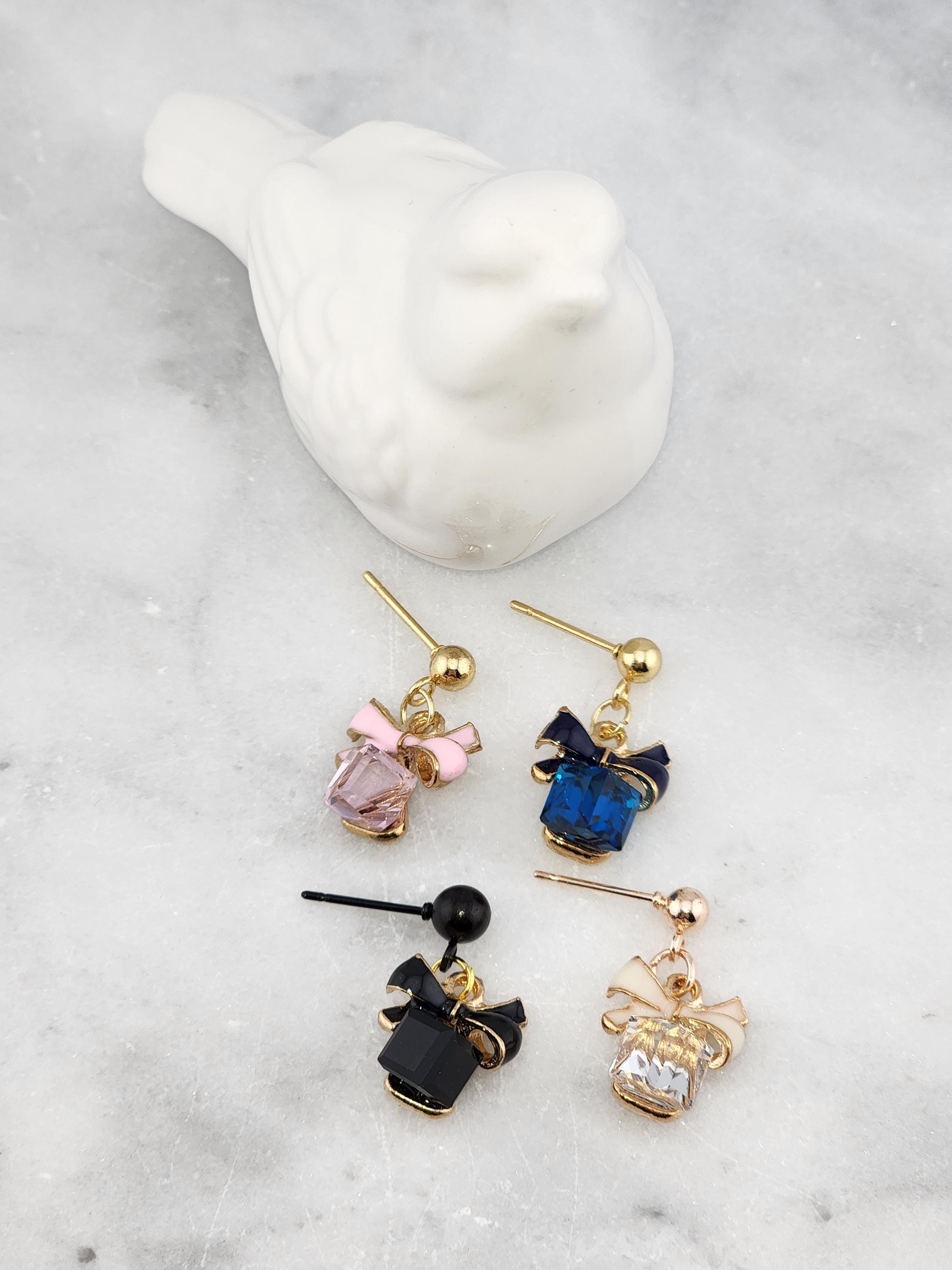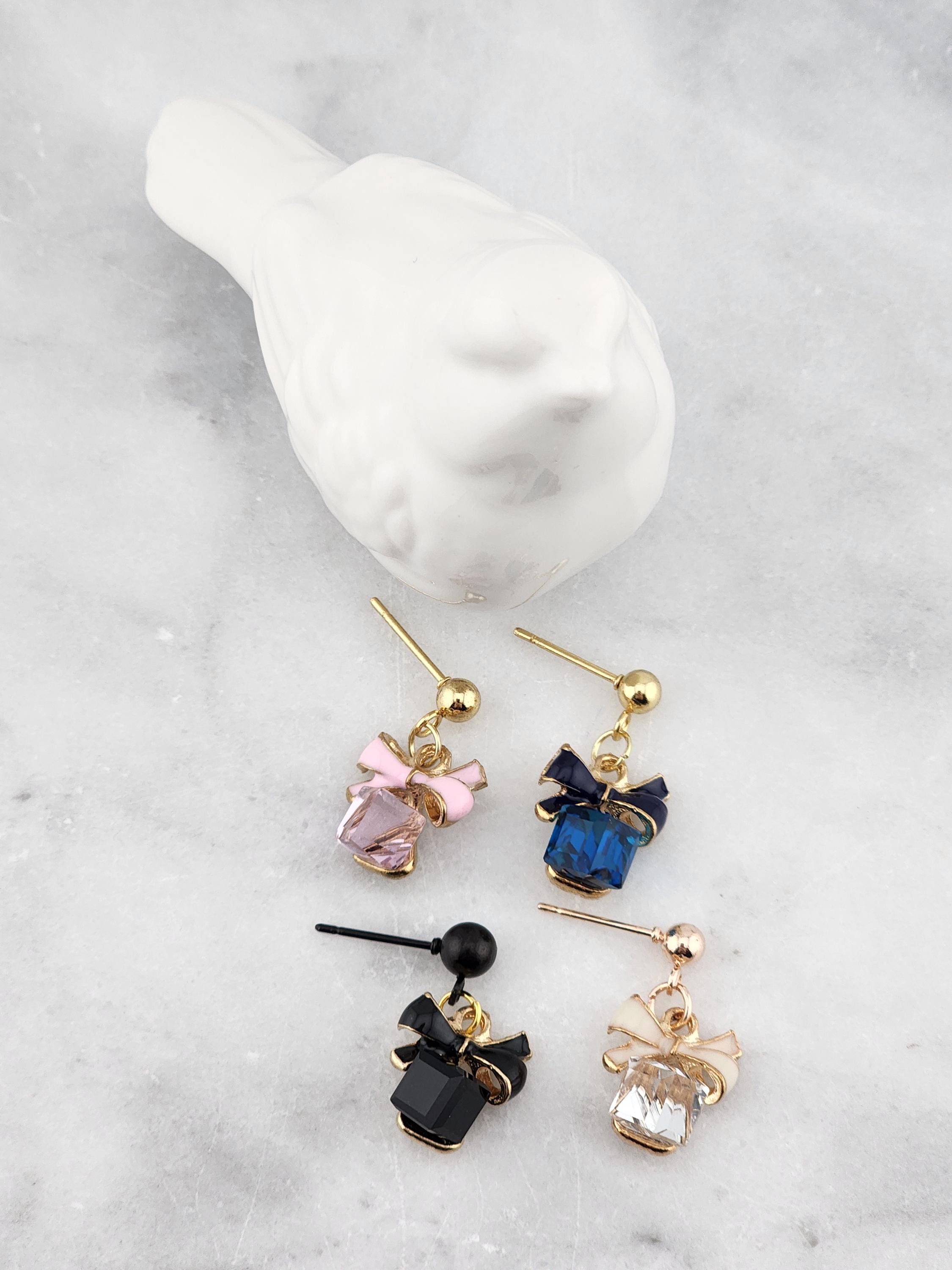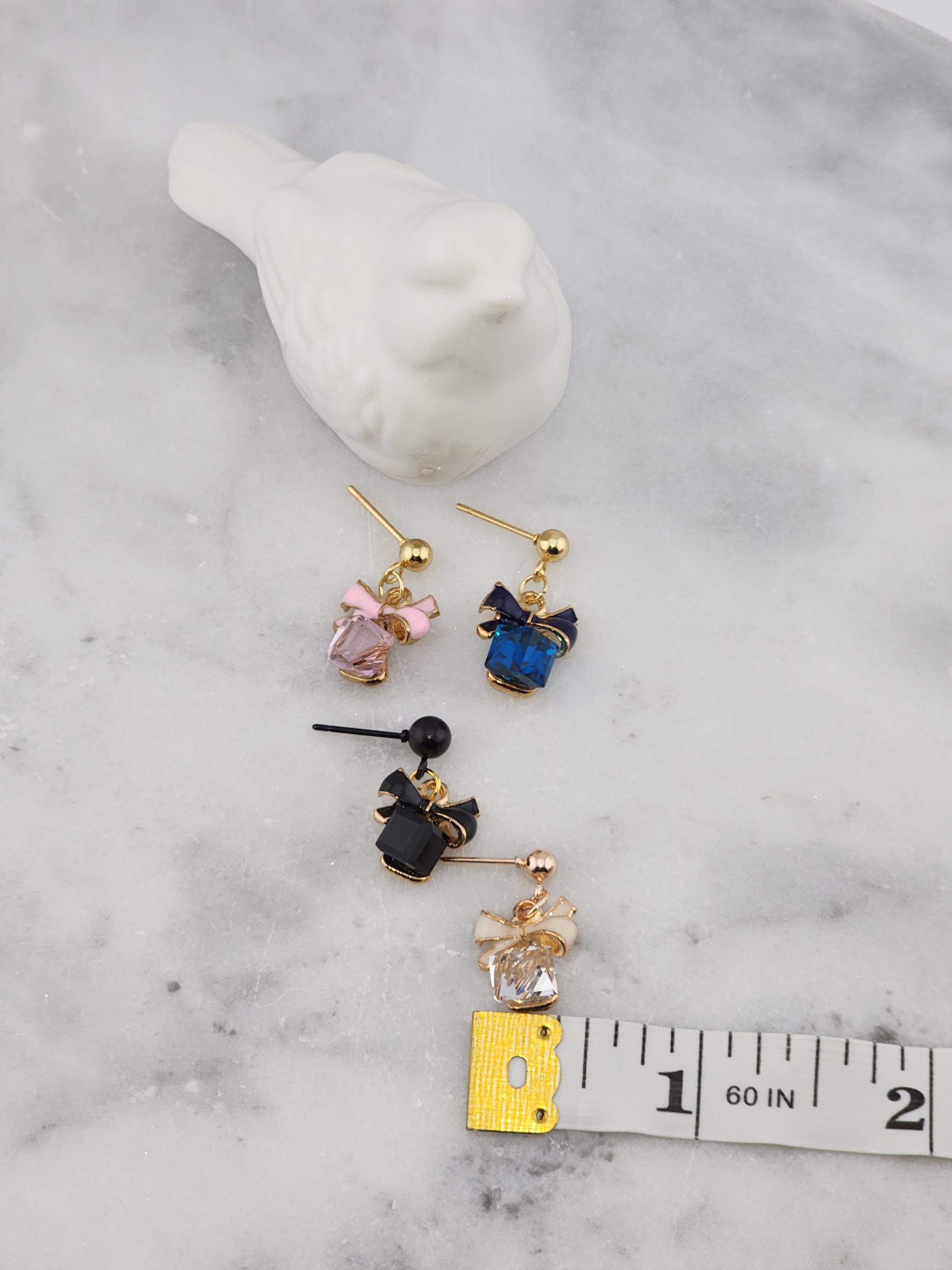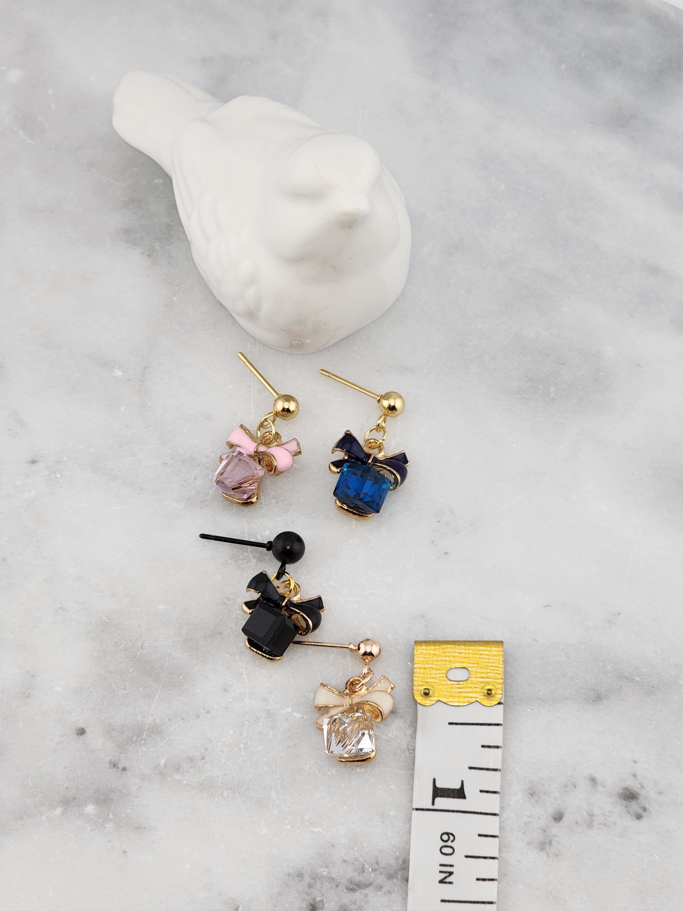 These are the perfect "gift" earrings. They are made using ball post and have little colored faceted crystal cube presents with enamel colored bow charms dangling from them and they hang from 24k gold plated connecting rings. Each pair are a bit different. YOUR CHOICES ARE: #1- Black on Black on brass #2- Clear on Pink on Rose Gold plated brass #3- Blue on 18K gold plated brass #4- Pink on 18k gold plated brass * Your purchase will arrive in pretty packaging * Shipping is included