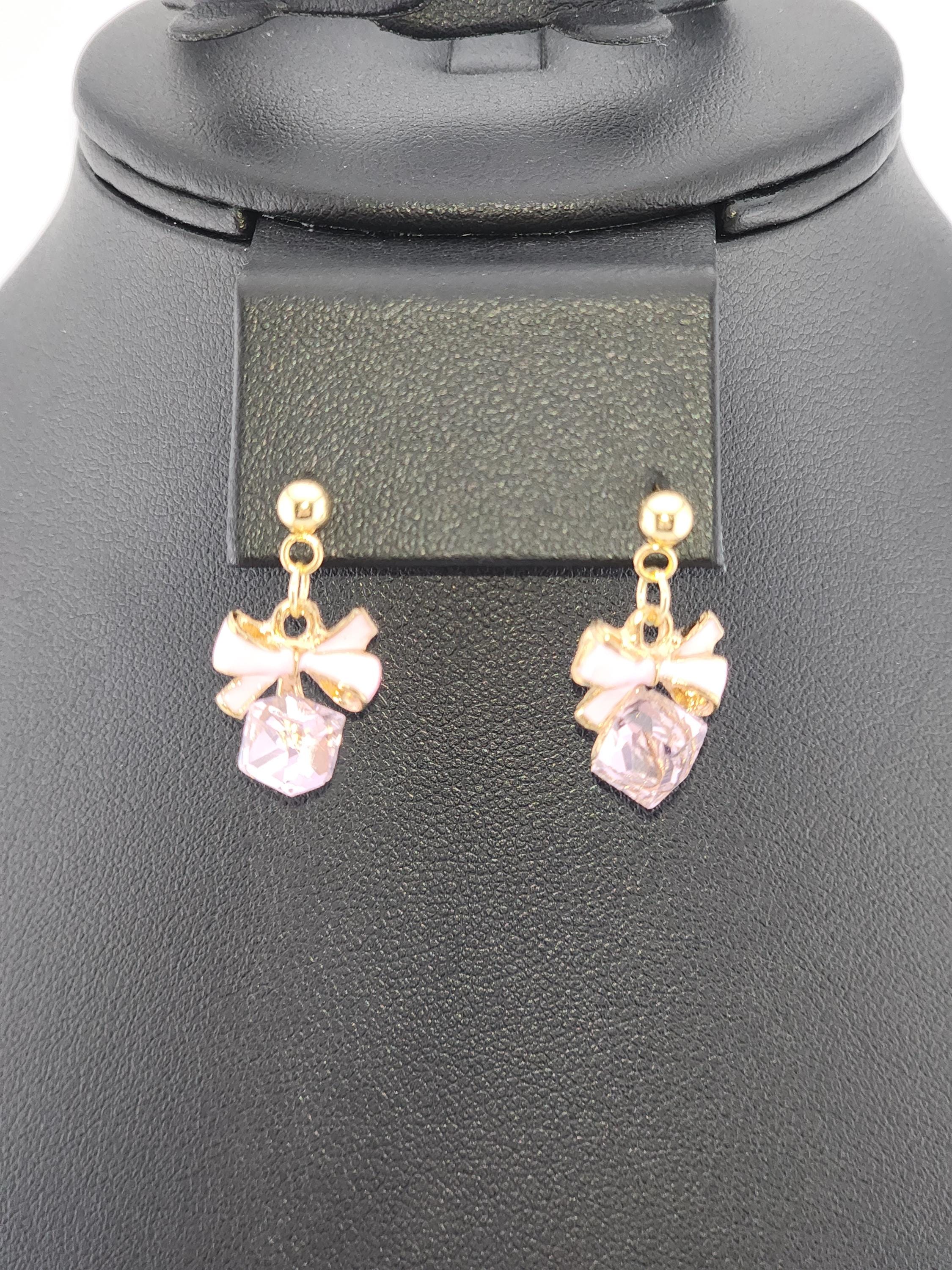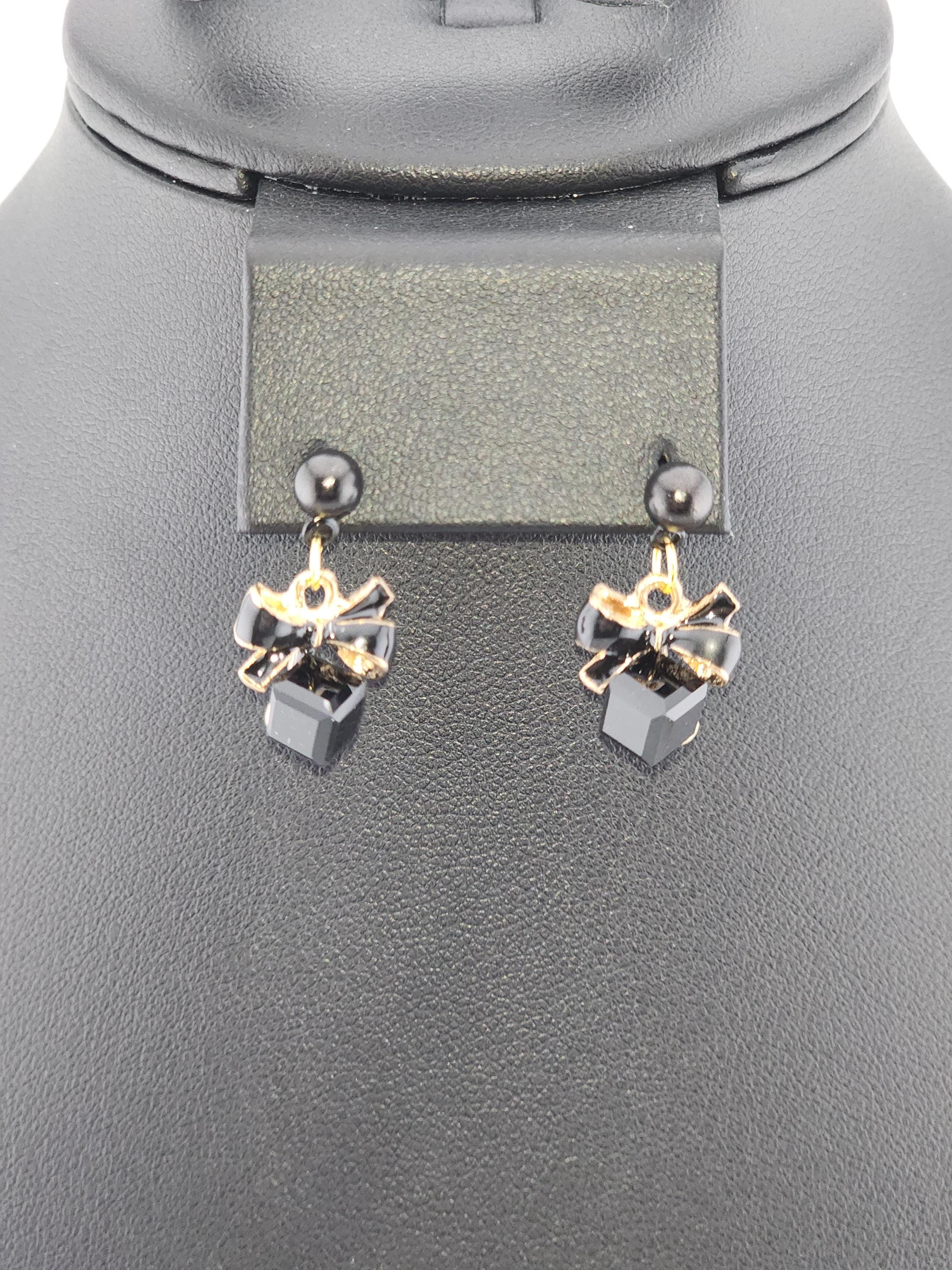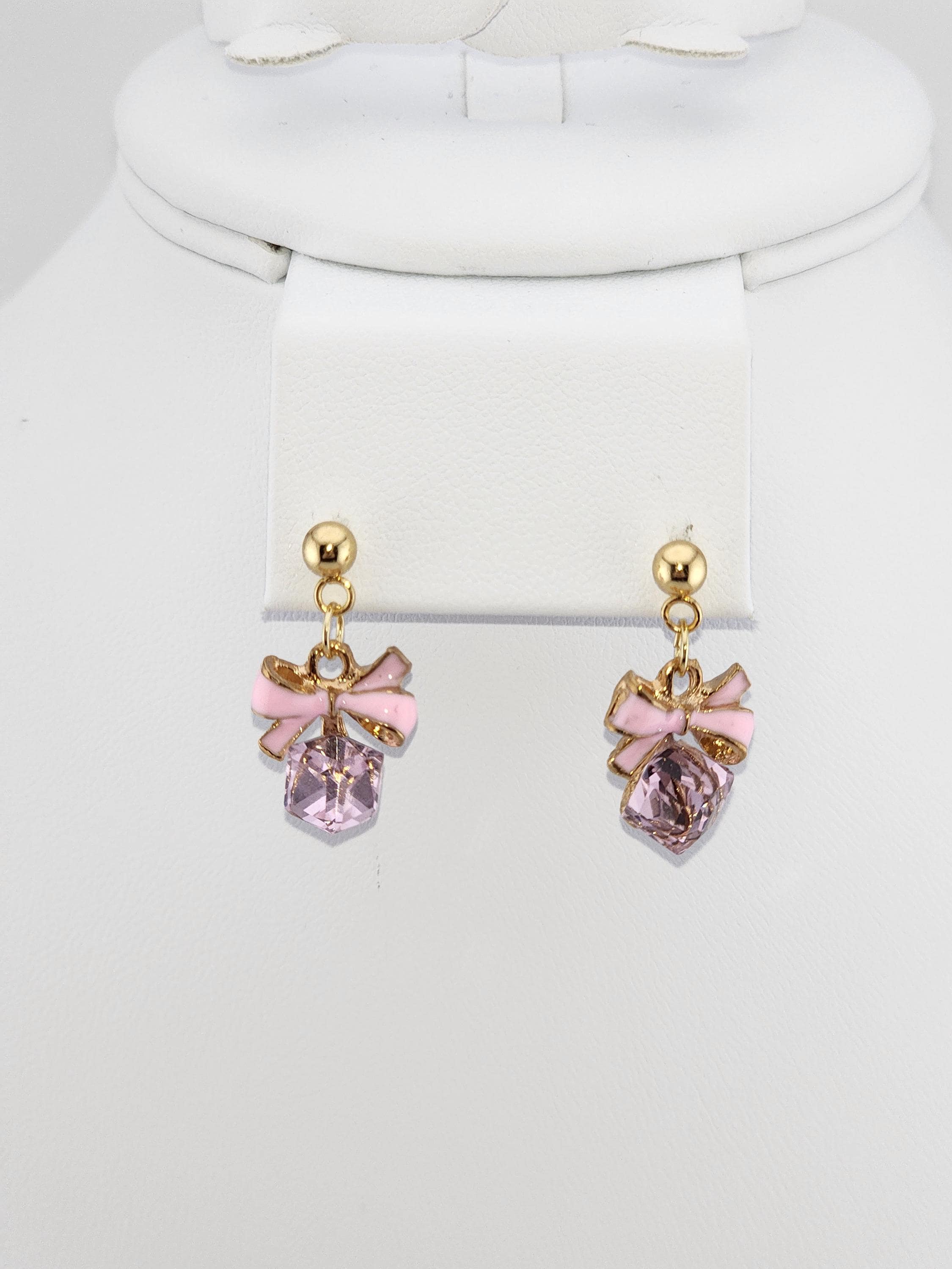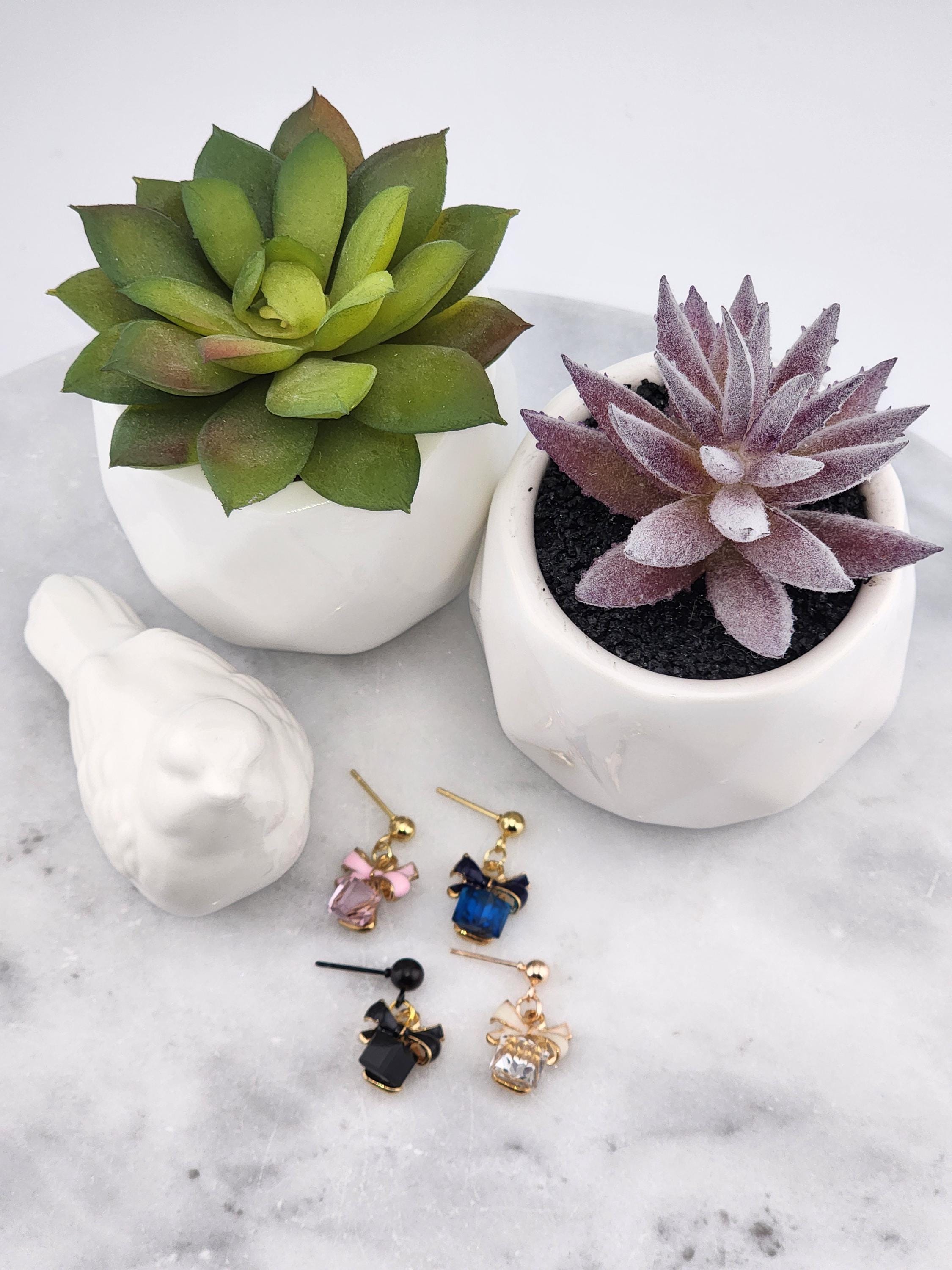 These are the perfect "gift" earrings. They are made using ball post and have little colored faceted crystal cube presents with enamel colored bow charms dangling from them and they hang from 24k gold plated connecting rings. Each pair are a bit different. YOUR CHOICES ARE: #1- Black on Black on brass #2- Clear on Pink on Rose Gold plated brass #3- Blue on 18K gold plated brass #4- Pink on 18k gold plated brass * Your purchase will arrive in pretty packaging * Shipping is included