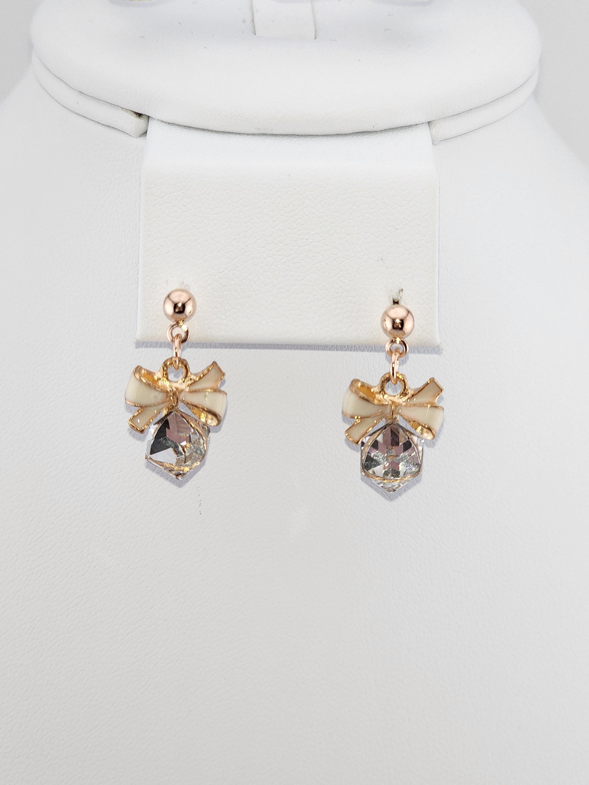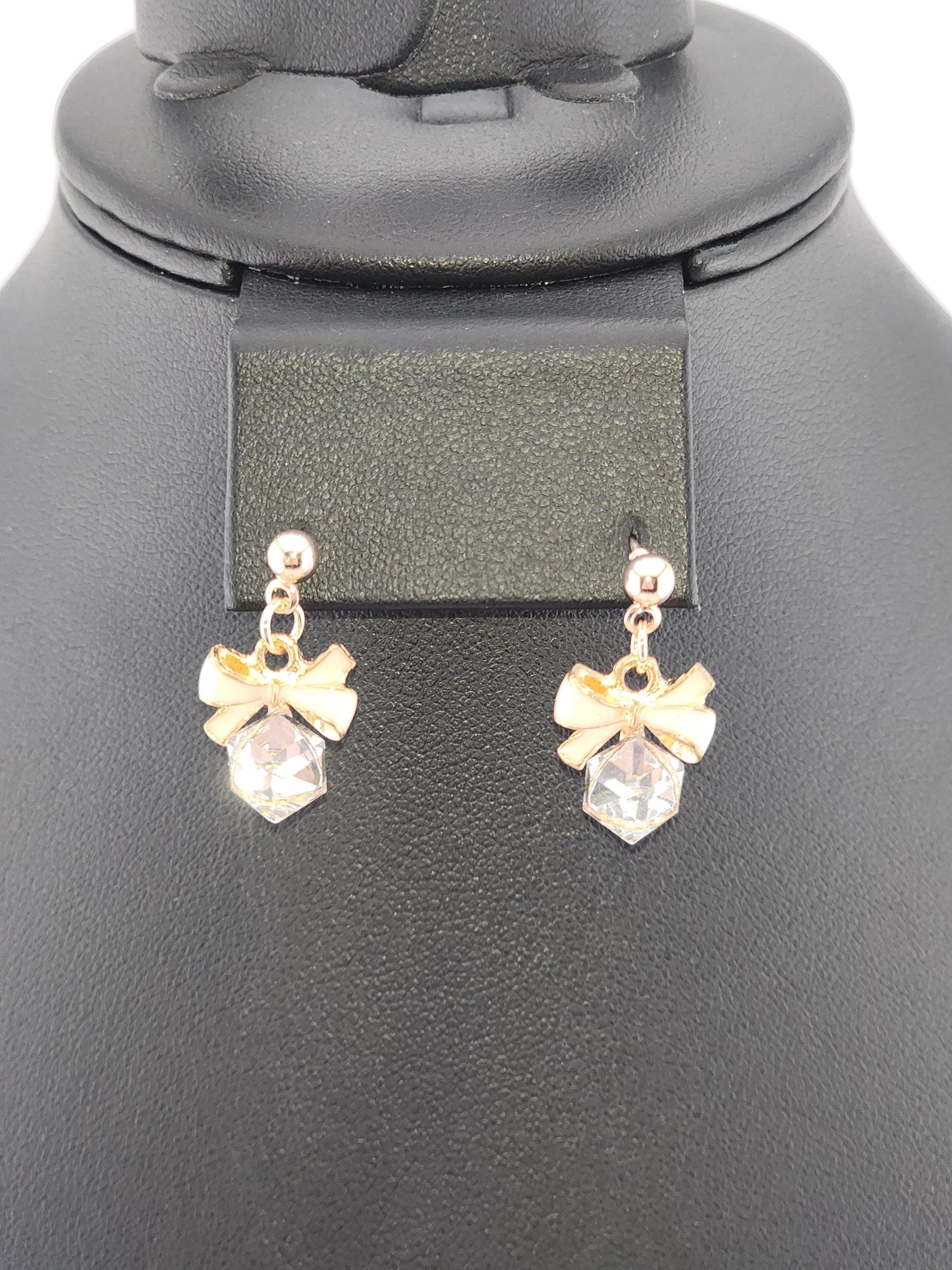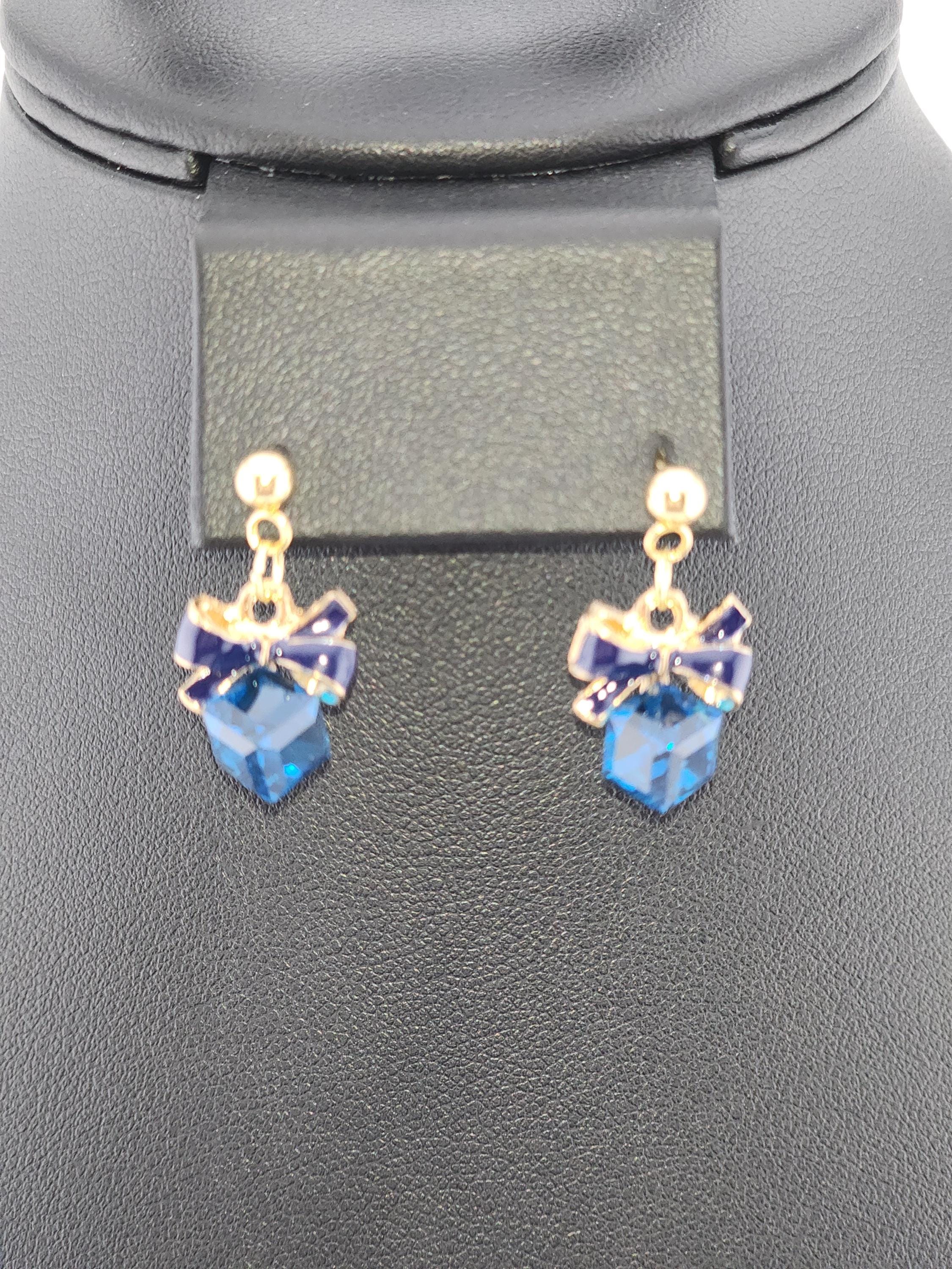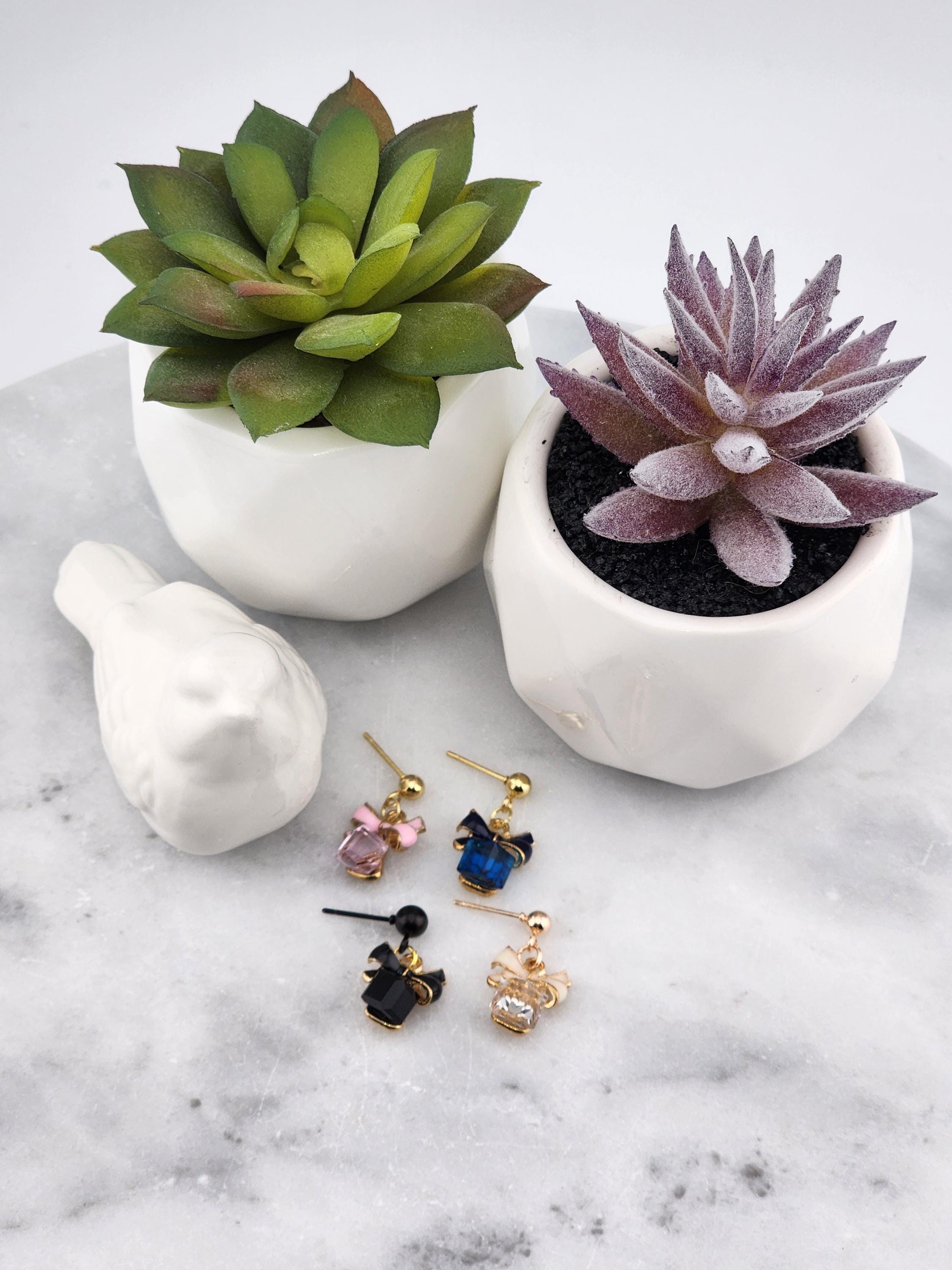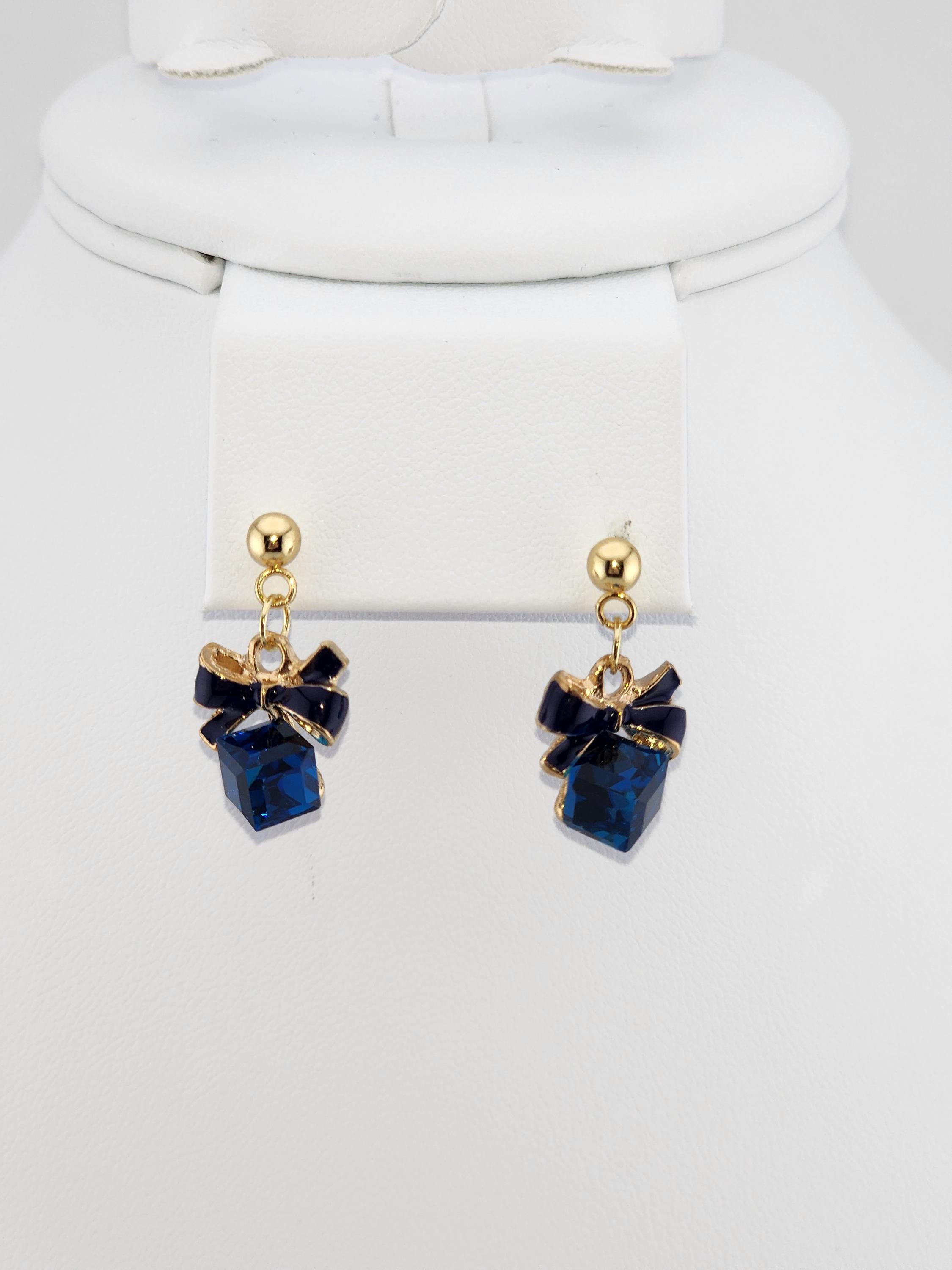 These are the perfect "gift" earrings. They are made using ball post and have little colored faceted crystal cube presents with enamel colored bow charms dangling from them and they hang from 24k gold plated connecting rings. Each pair are a bit different. YOUR CHOICES ARE: #1- Black on Black on brass #2- Clear on Pink on Rose Gold plated brass #3- Blue on 18K gold plated brass #4- Pink on 18k gold plated brass * Your purchase will arrive in pretty packaging * Shipping is included