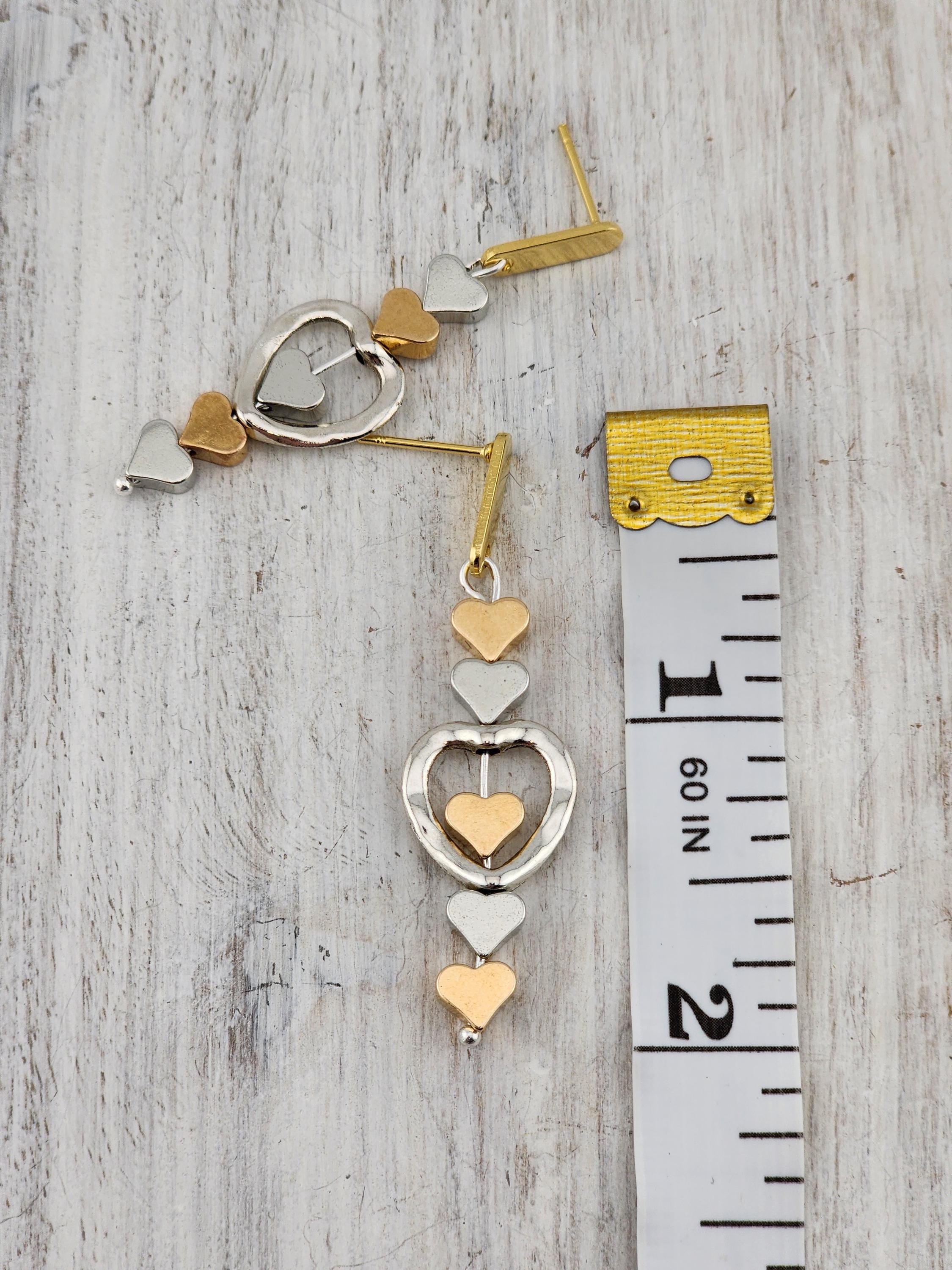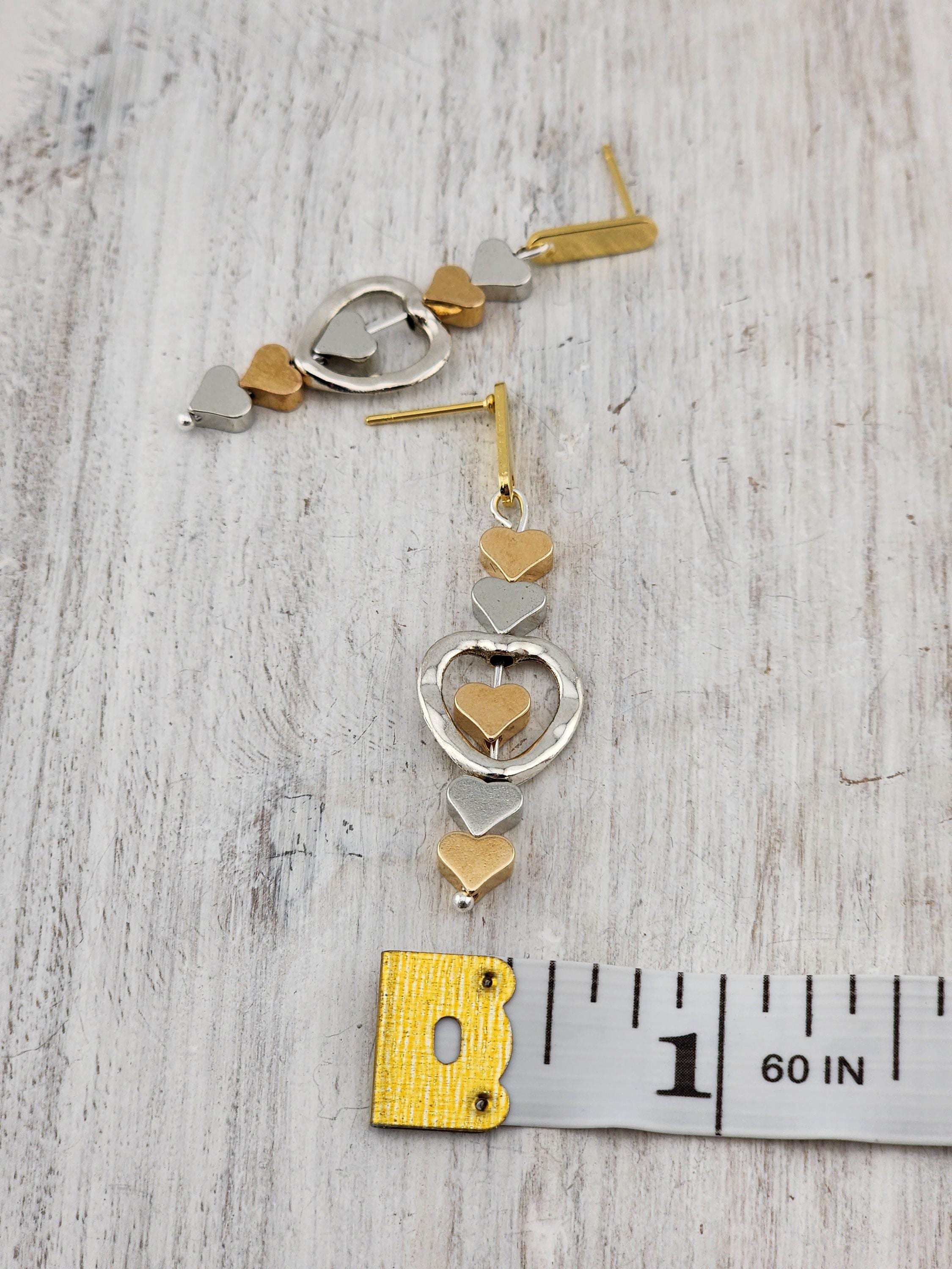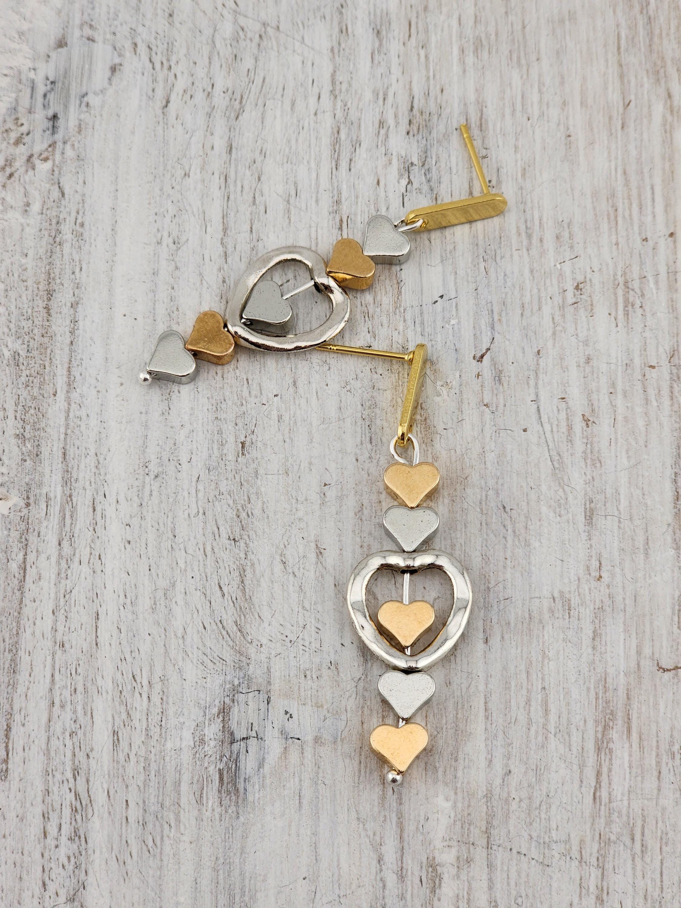 I made these earrings using tarnish resistant 18k gold bar posts. Threaded through sterling silver pins are an alternating array of tarnish resistant 24k gold plated brass small hearts, sterling silver plated metal small hearts and a sterling silver plated medium hollow heart. * Your purchase will arrive in pretty packaging * Shipping is included