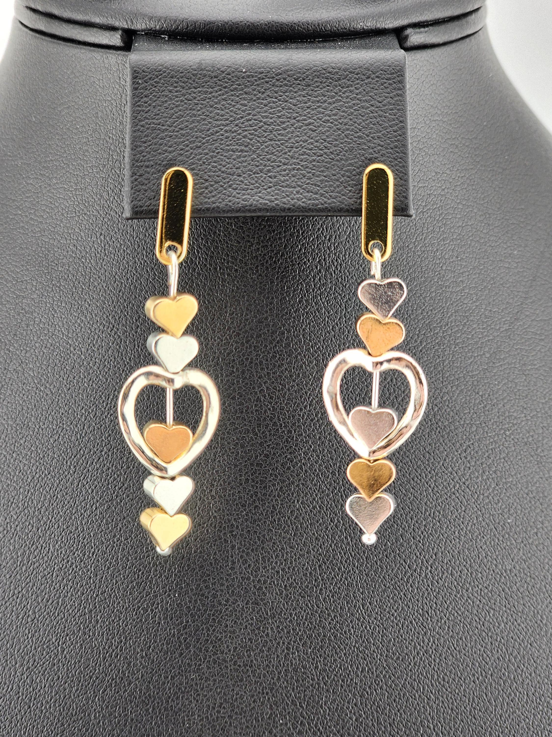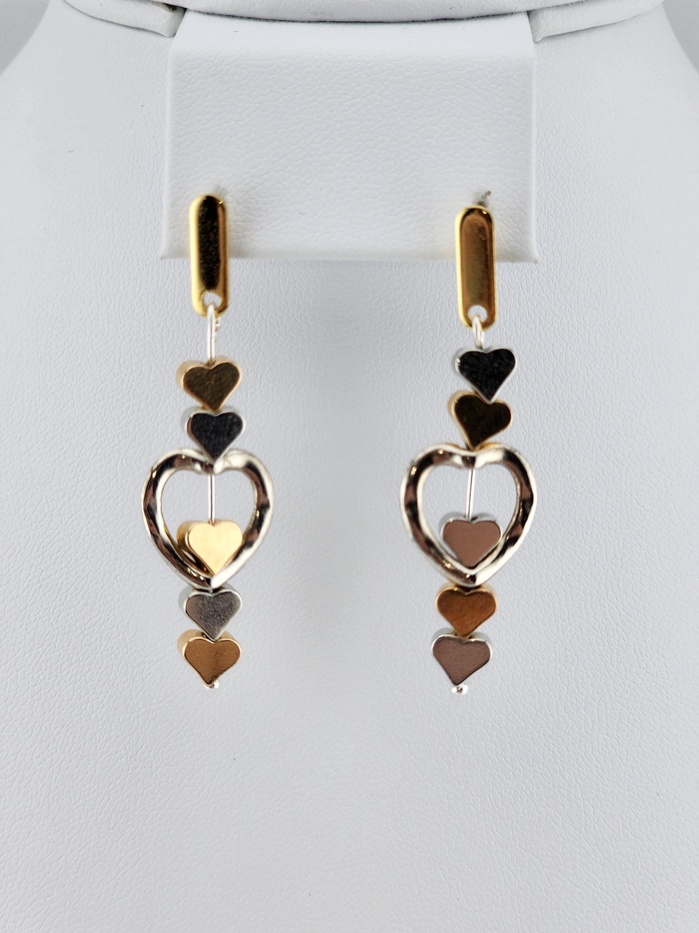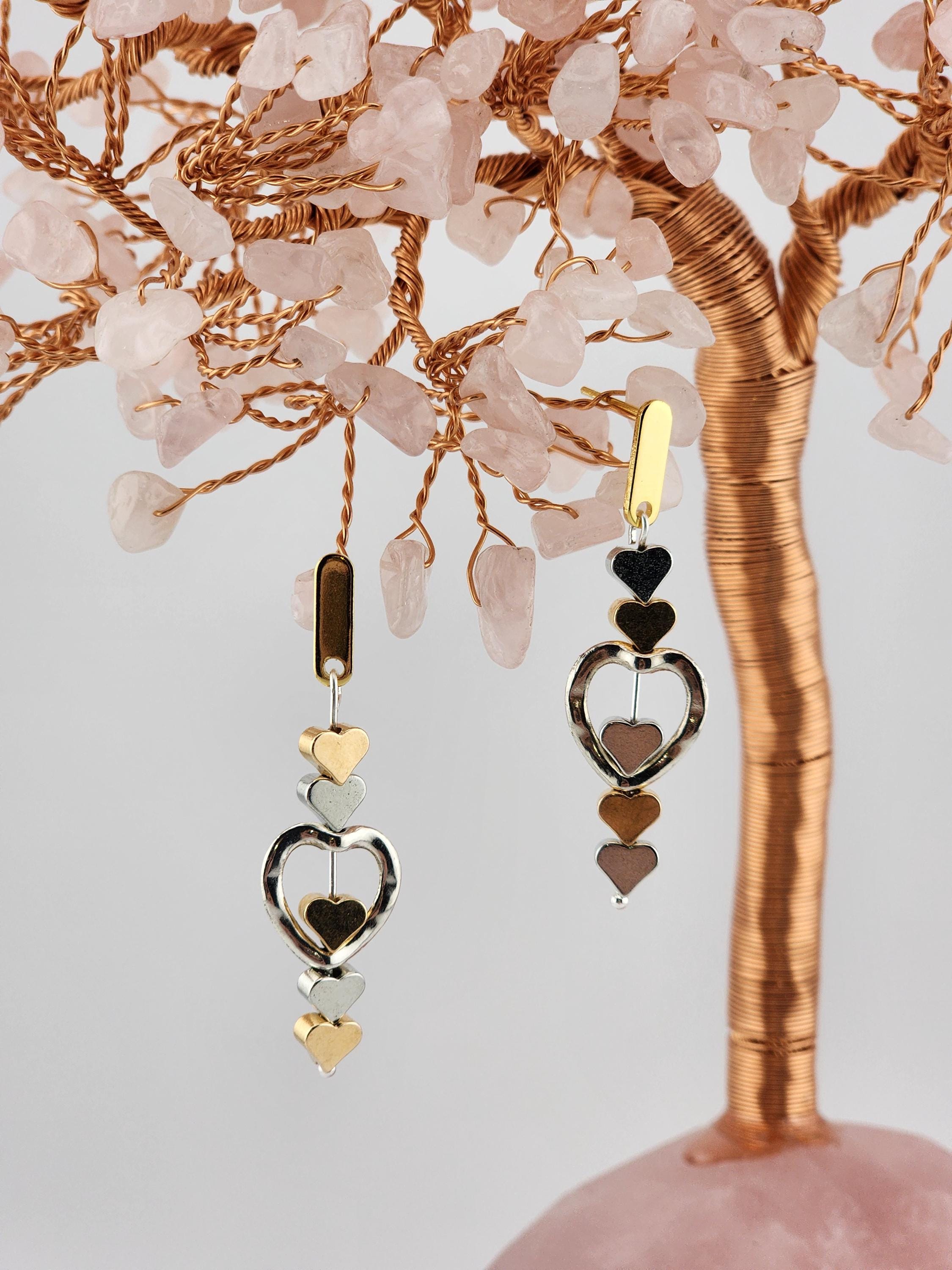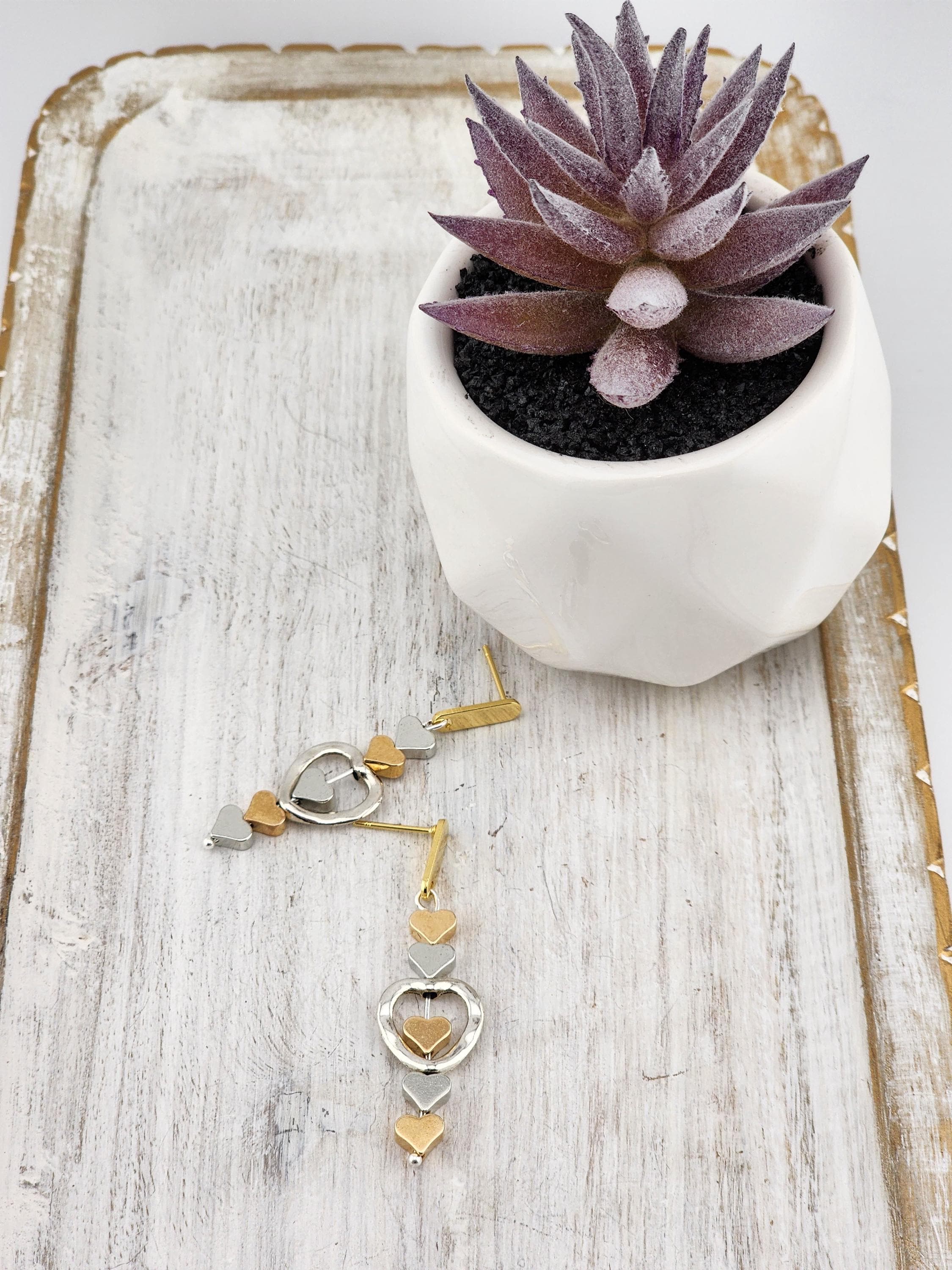I made these earrings using tarnish resistant 18k gold bar posts. Threaded through sterling silver pins are an alternating array of tarnish resistant 24k gold plated brass small hearts, sterling silver plated metal small hearts and a sterling silver plated medium hollow heart. * Your purchase will arrive in pretty packaging * Shipping is included