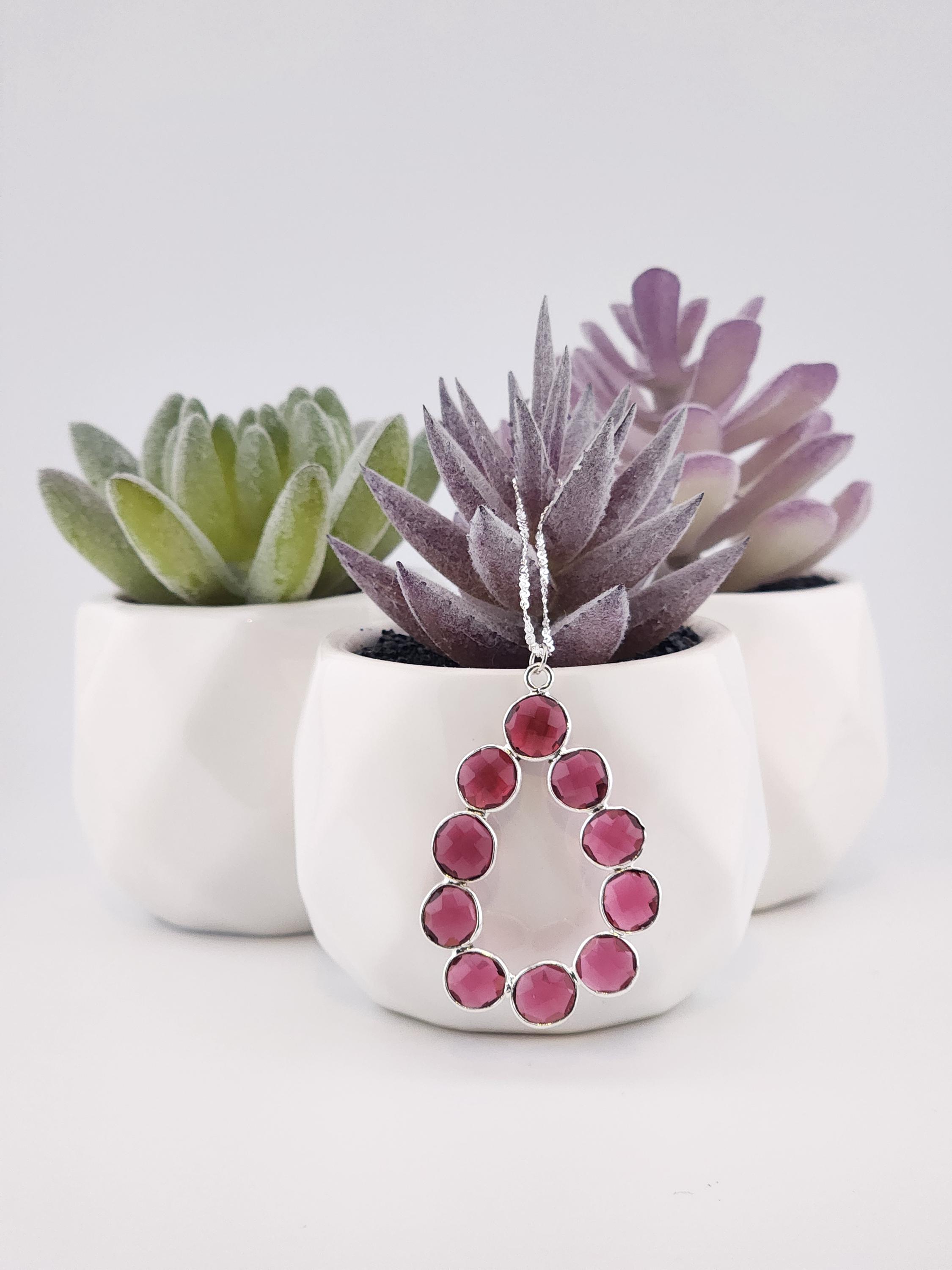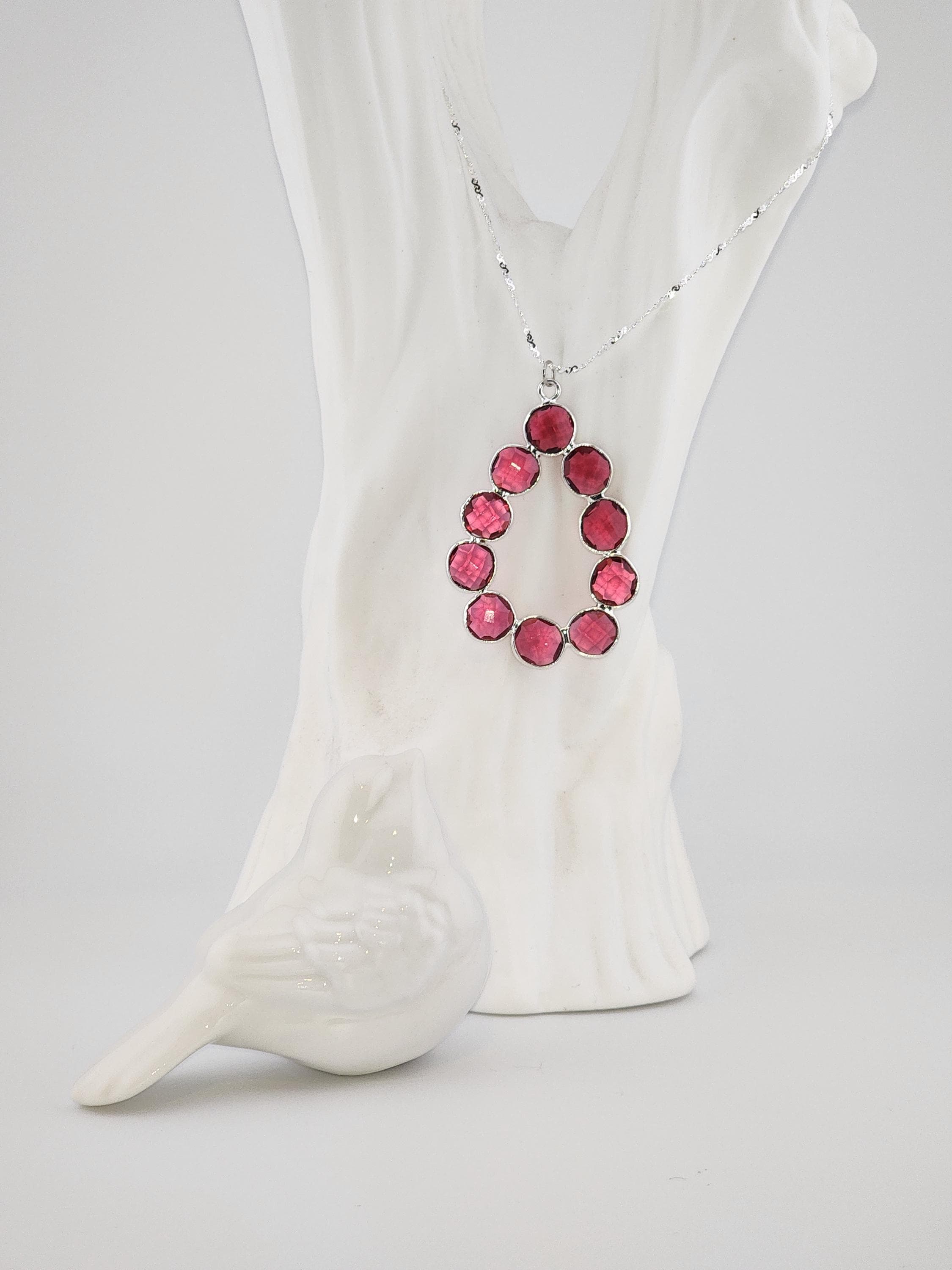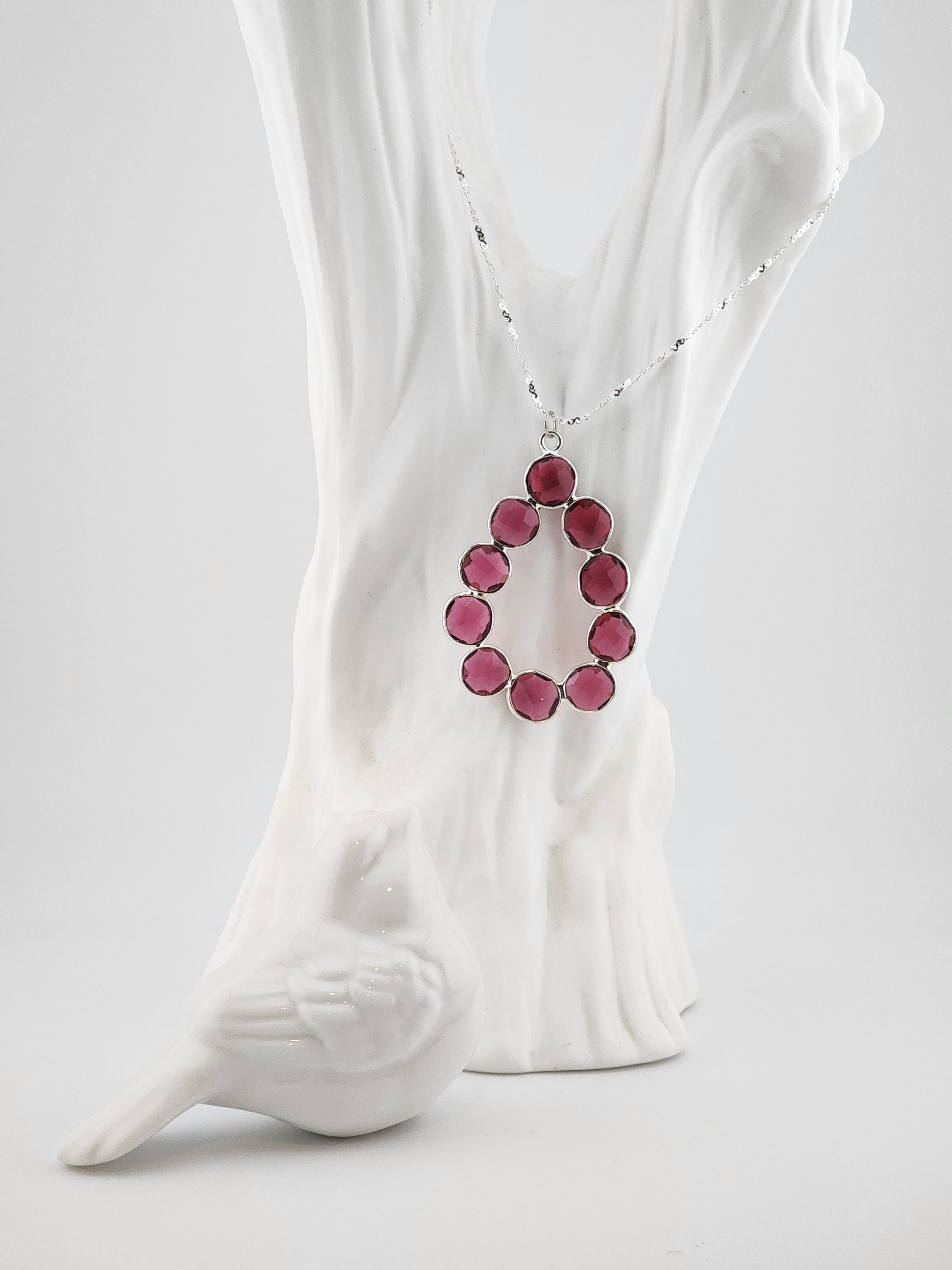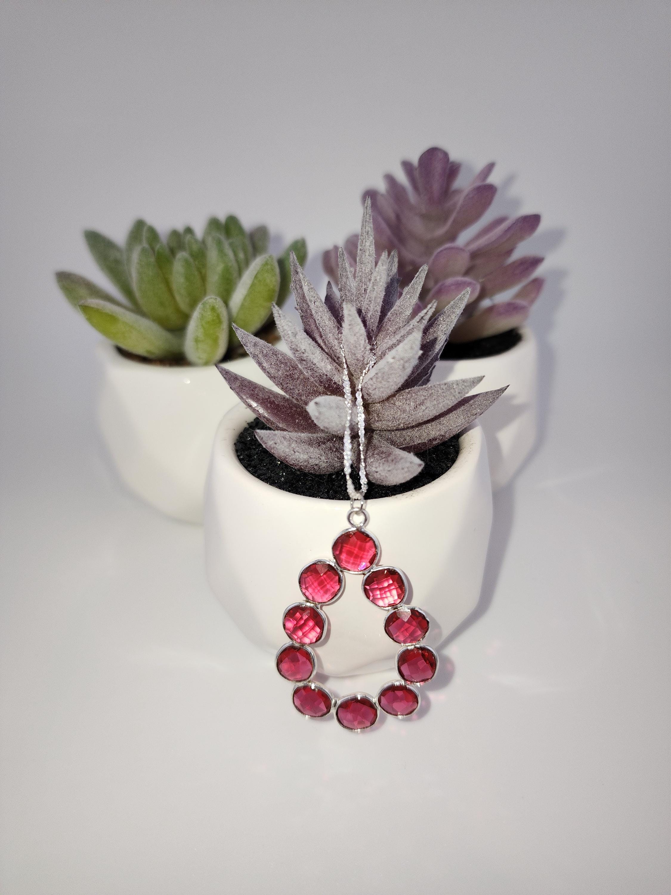I made this exquisite necklace using elegant twisted 925 sterling silver chain. I added a hollow teardrop shape pendant that has 10 round cut faceted pink tourmaline gemstones, set in 925 sterling silver and hangs from a 925 sterling silver ring. This pendant was handcrafted in India. * Your purchase will arrive in pretty packaging * Shipping is included >>>>>>>>>>>>>>>>>>>>>>>>>>>>>>>>>>>>>>>>>>>>>>>>>>>>>>>>>>>>>>>>>>>>>>>>>>>>>>>>>>>>>>>>> EMOTIONAL AND MENTAL BENEFITS OF TOURMALINE: * Heart Healing: Encouraging love, compassion, and forgiveness for self and others. * Stress Relief: Provides a calming, soothing energy, acting as a "warm hug" for the nervous system and easing anxiety. * Releases Negativity: Helps to let go of past wounds, burdens, and negative energy, bringing clarity and peace. * Boosts Self-Love: Encourages self-acceptance, confidence, and feeling worthy of love. OR, SO THEY SAY... >>>>>>>>>>>>>>>>>>>>>>>>>>>>>>>>>>>>>>>>>>>>>>>>>>>>>>>>>>>>>>>>>>>>>>>>>>>>>>>>>>>>>>>> HEALTH AND WELLNESS BENEFITS OF WEARING STERLING SILVER: * Hypoallergenic: Sterling silver is less likely to cause allergic reactions, making it a safe choice for people with sensitive skin. * Antimicrobial properties: Silver has natural antibacterial and antifungal qualities that can help protect against harmful microorganisms. * Temperature regulation: Silver is highly thermally conductive, which may help balance body temperature and provide a cooling sensation in hot weather. * Immune support: Some sources suggest that wearing silver can help boost the immune system and circulation. *Stress reduction: Wearing silver is believed to have a calming effect, helping to reduce stress, anxiety, and improve mood. >>>>>>>>>>>>>>>>>>>>>>>>>>>>>>>>>>>>>>>>>>>>>>>>>>>>>>>>>>>>>>>>>>>>>>>>>>>>>>>>>>>>>>>>> PRACTICAL AND AESTHETIC BENEFITS: * Durability: The addition of other metals like copper makes sterling silver more durable and resistant to scratching and wear than pure silver. * Affordability: It is a more affordable precious metal compared to gold or platinum, offering a luxurious feel at a lower price point. * Versatility: Sterling silver's timeless, striking color is flattering on most skin tones and complements a wide variety of styles and outfits. * Easy to maintain: It is relatively low-maintenance and can be cleaned and polished to restore its shine.