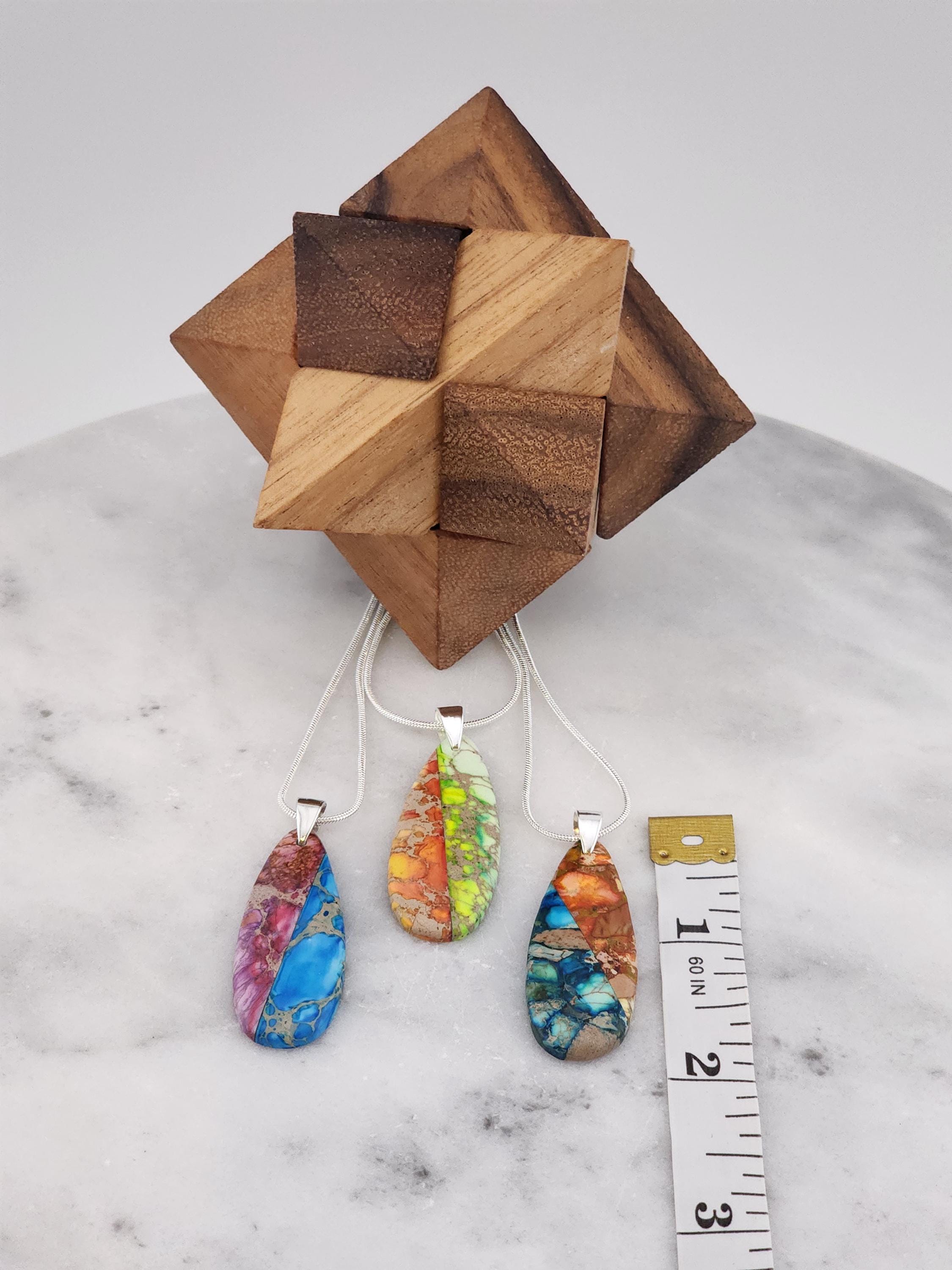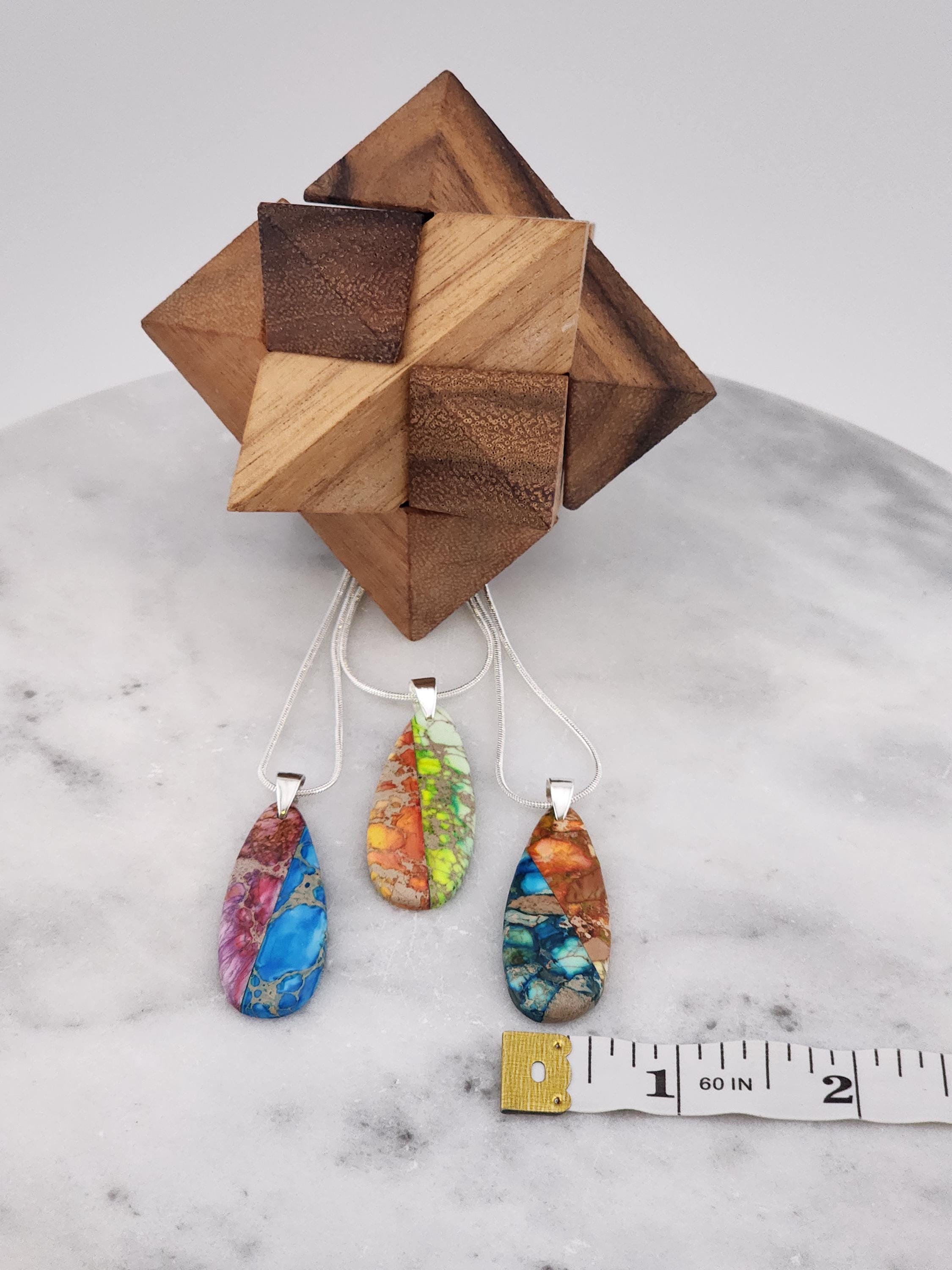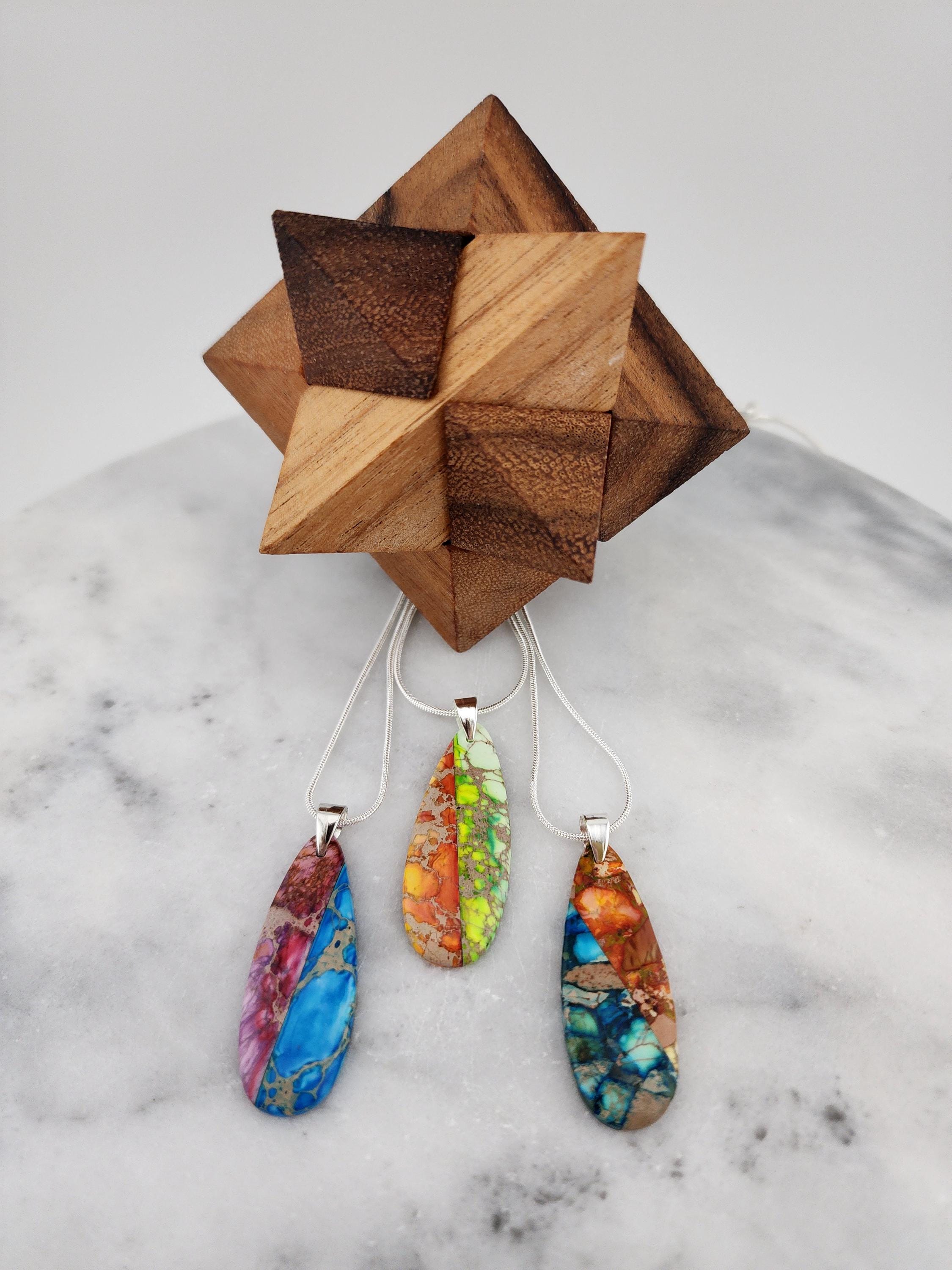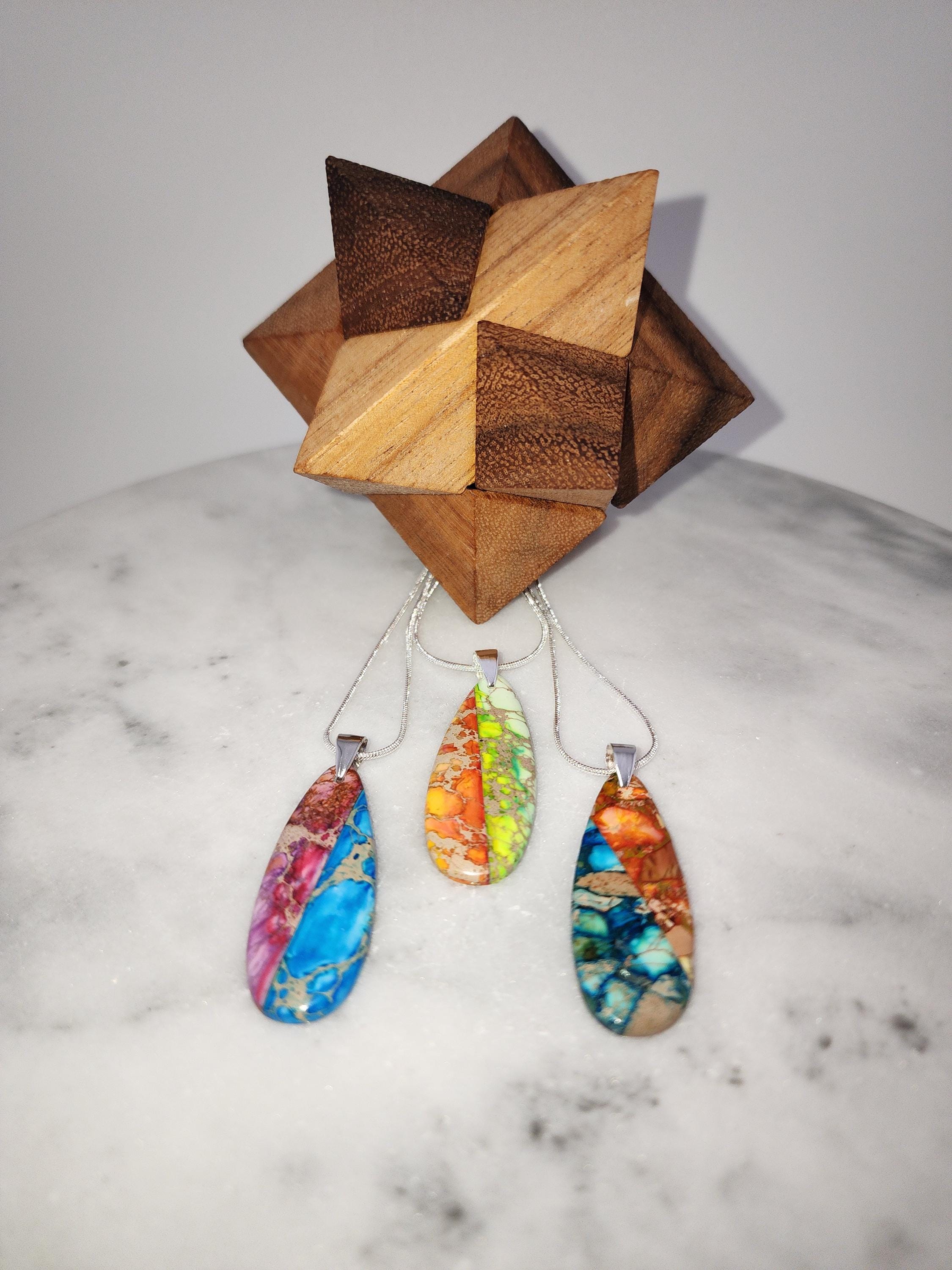 I made these Boho necklaces using delicate 925 sterling silver rope chain. The pendants are long teardrop Imperial Jasper in multiple colors. YOUR CHOICES OF COLORS ARE: #1- Purple/Blue #2- Orange/Yellow #3- Blue/Orange * Your purchase will arrive in pretty packaging * Shipping is included