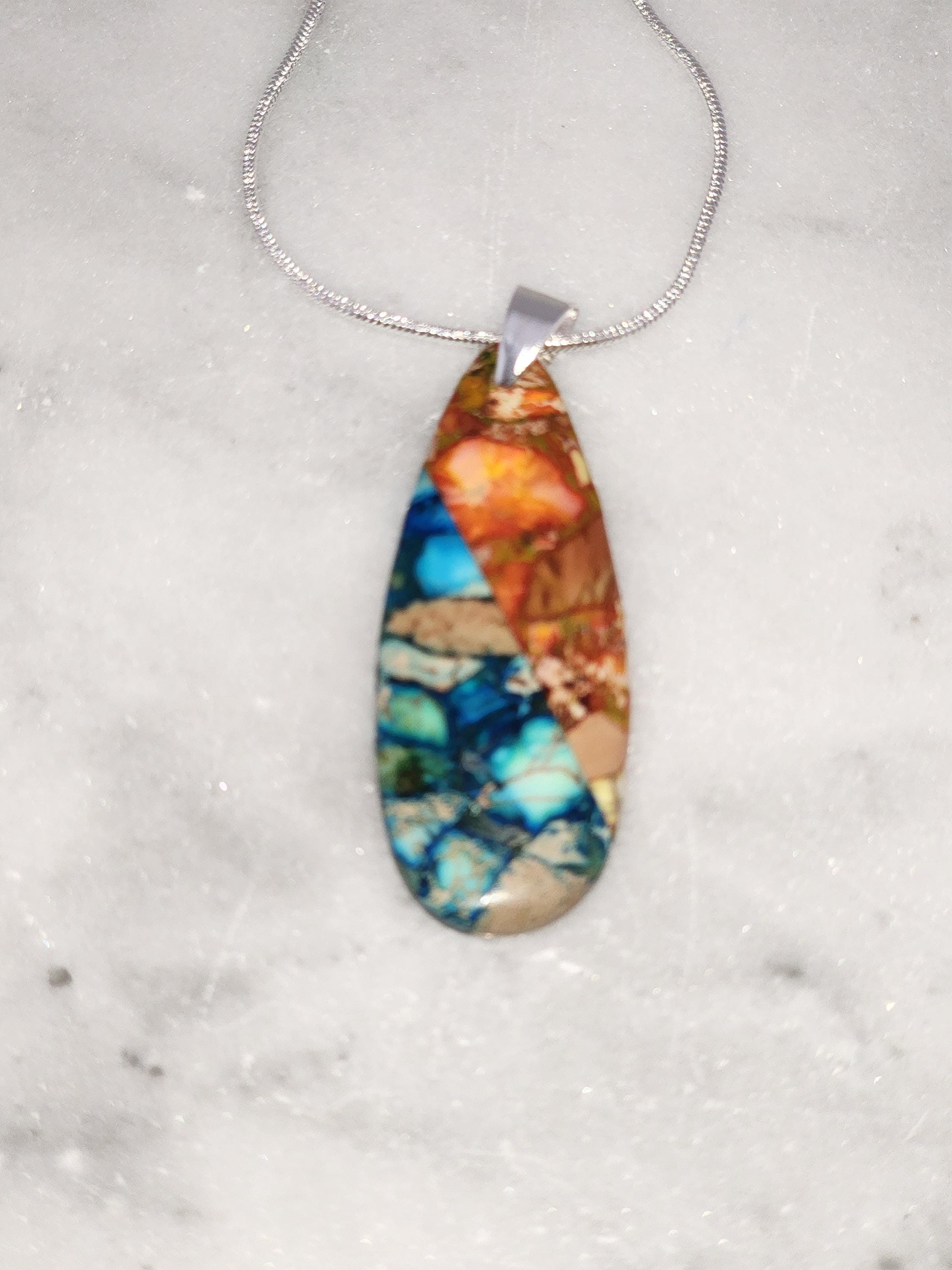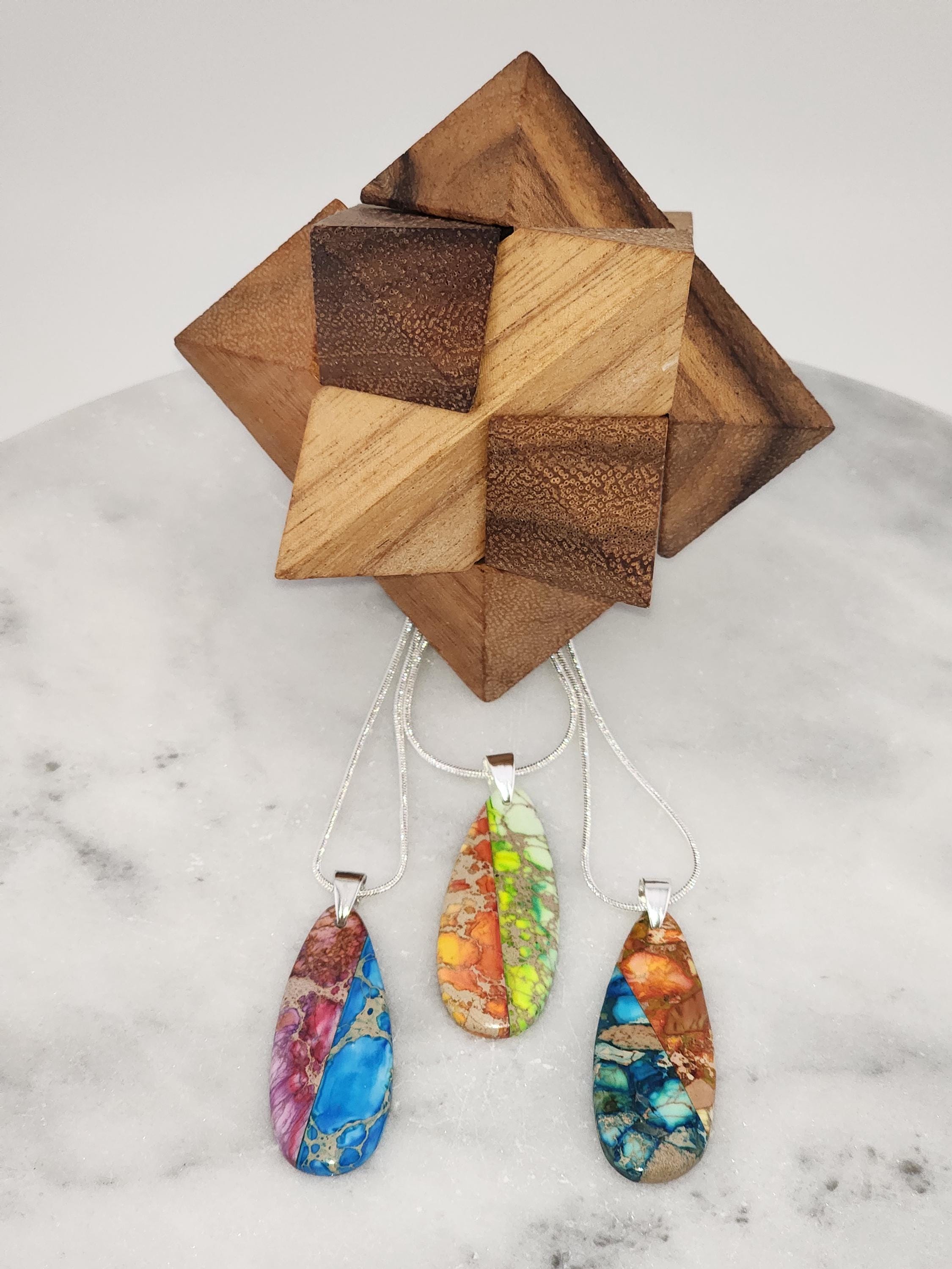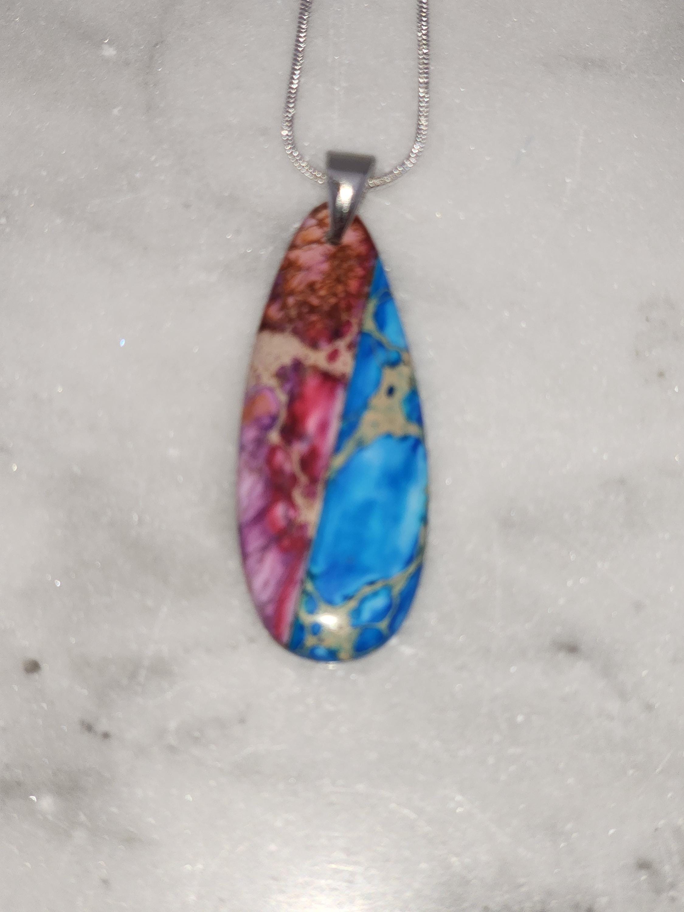 I made these Boho necklaces using delicate 925 sterling silver rope chain. The pendants are long teardrop Imperial Jasper in multiple colors. YOUR CHOICES OF COLORS ARE: #1- Purple/Blue #2- Orange/Yellow #3- Blue/Orange * Your purchase will arrive in pretty packaging * Shipping is included