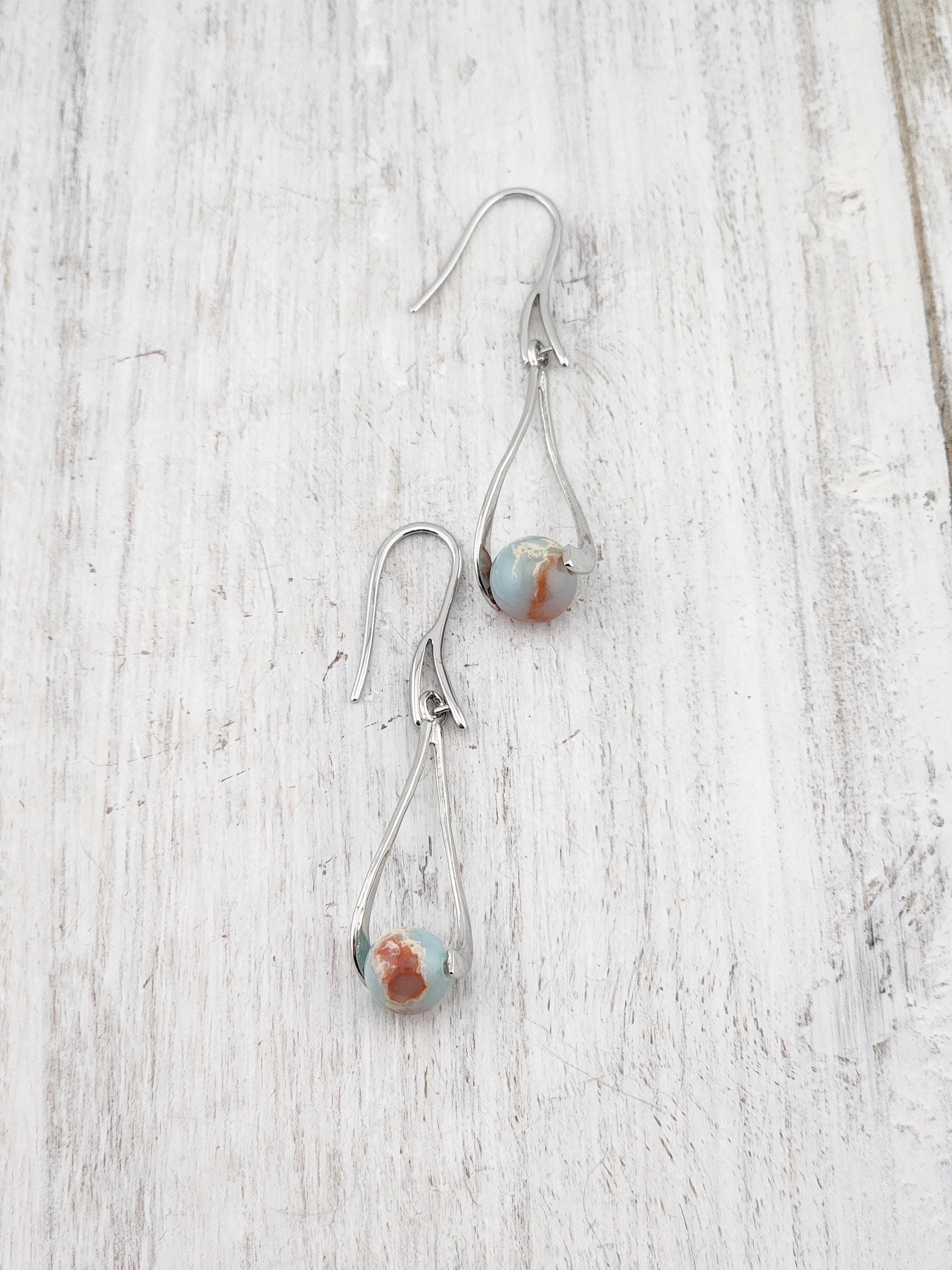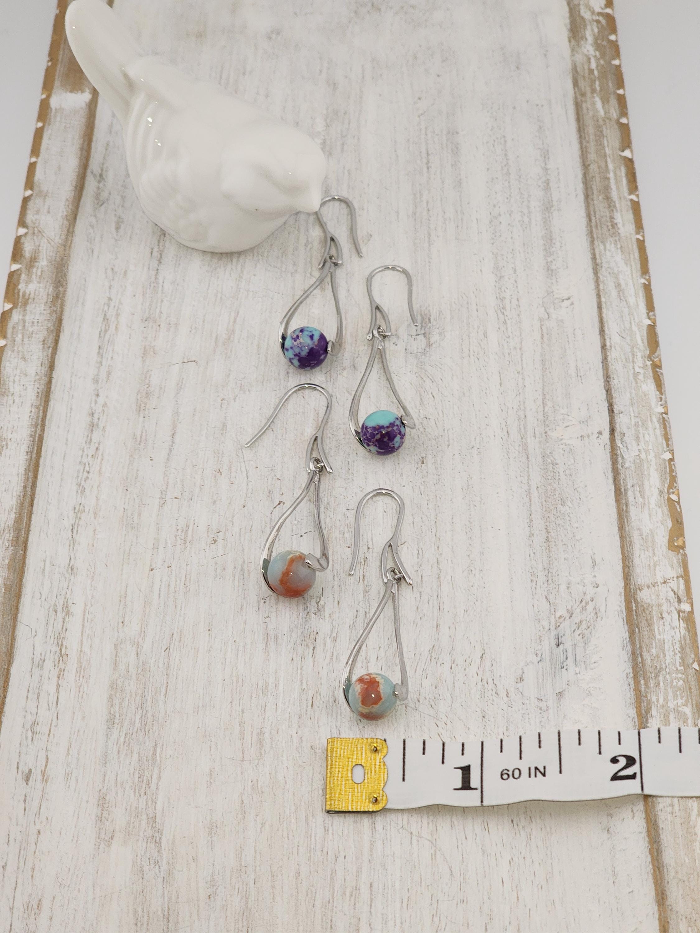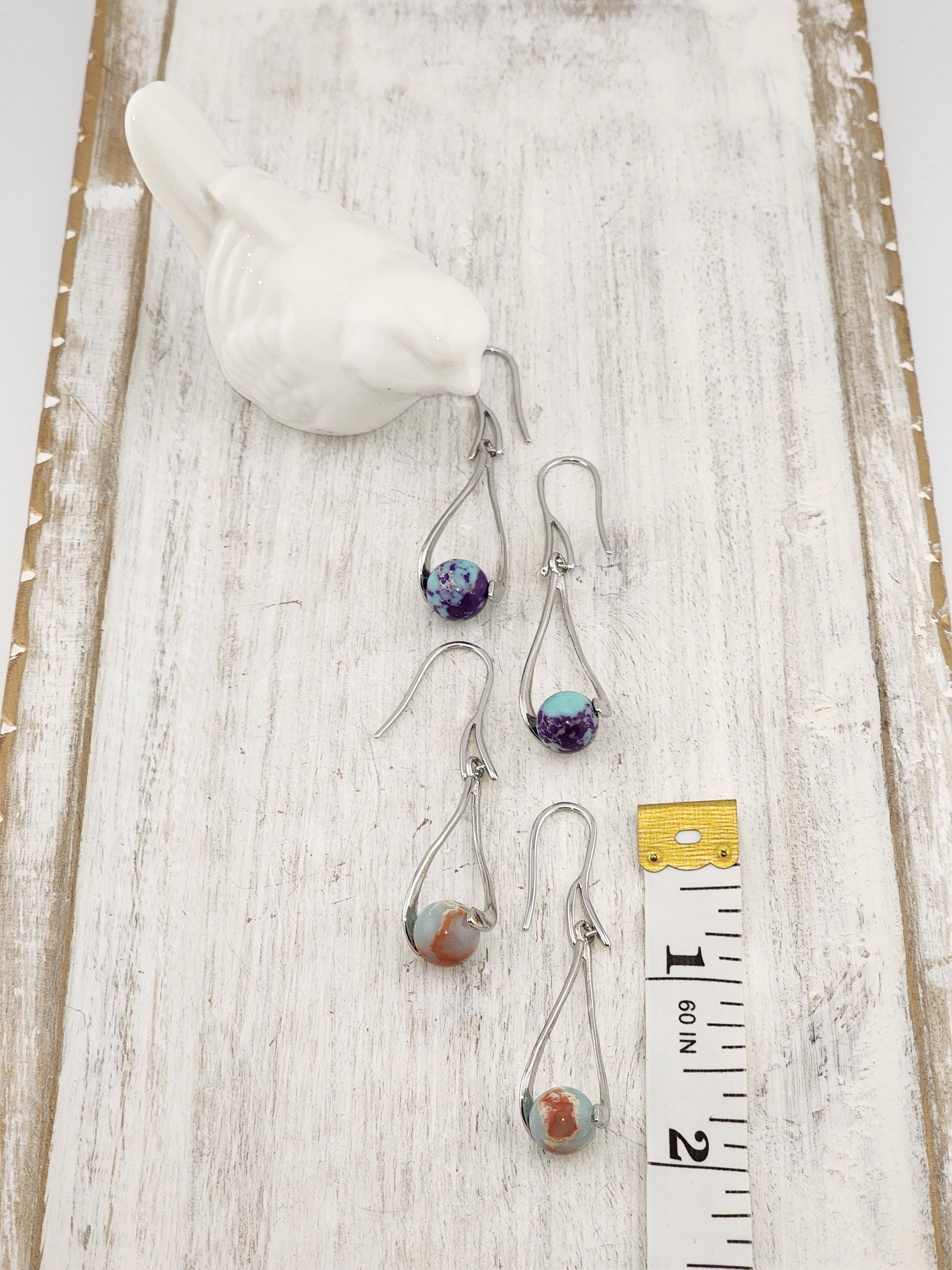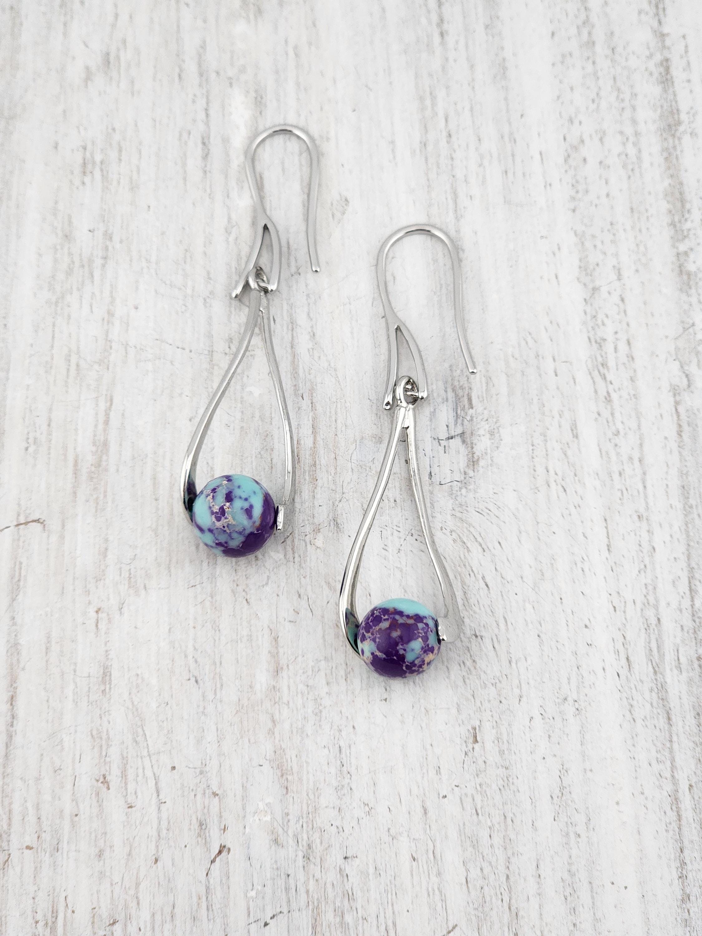 I made these dangle earrings using platinum plated brass hooks. I added platinum plated hollow teardrop twist charms with jasper gemstone beads locked inside. YOUR CHOICE OF SEA SEDIMENT JASPER ARE: #1- Purple and Blue #-2- Sky Blue and Red * Your purchase will arrive in pretty packaging * Shipping is included