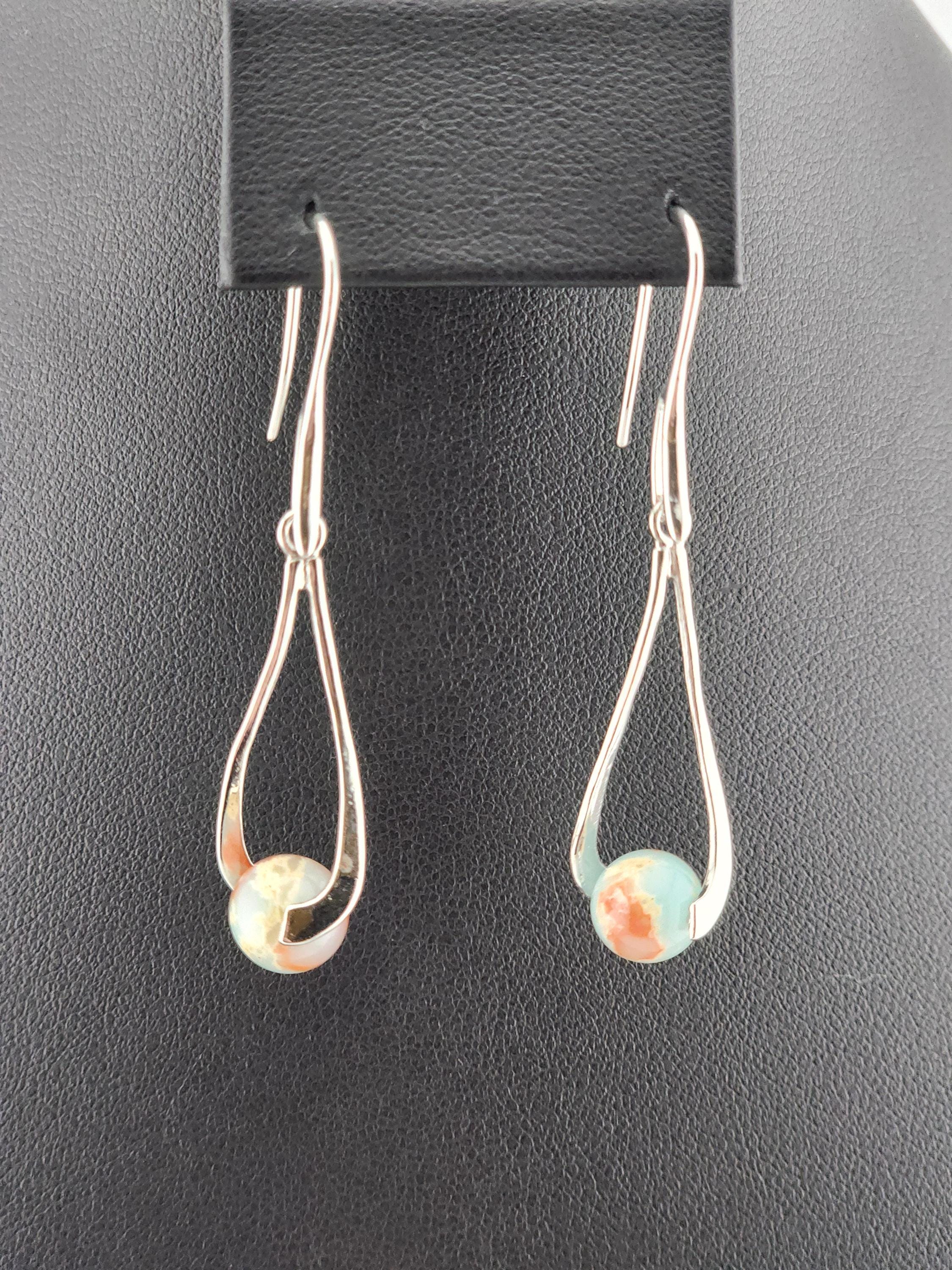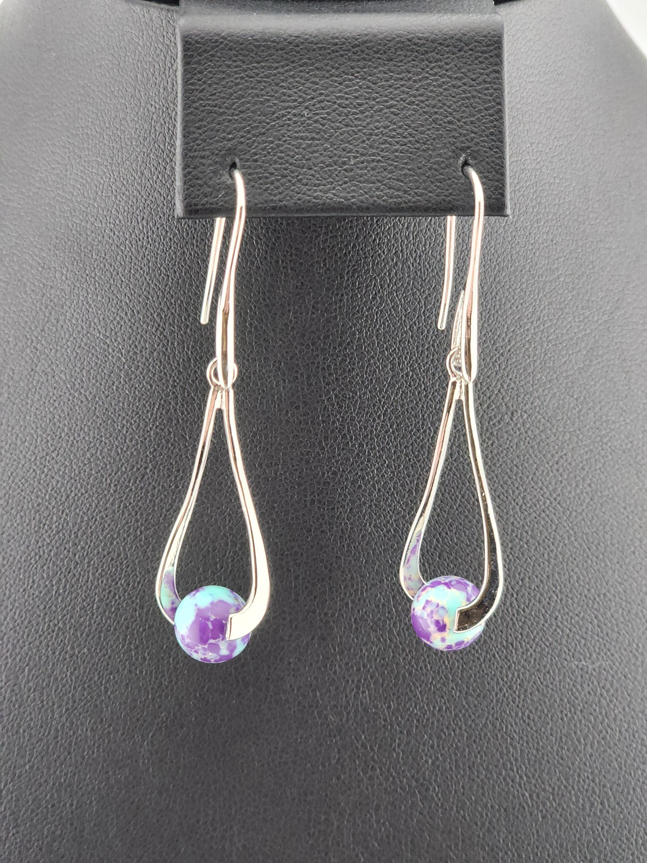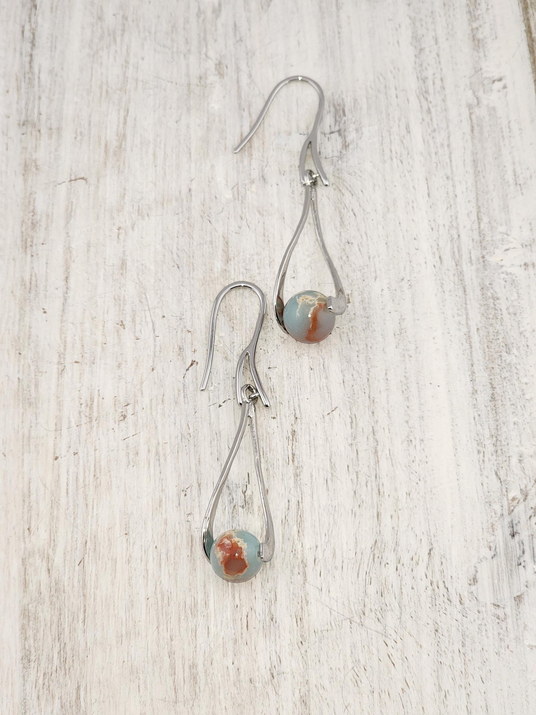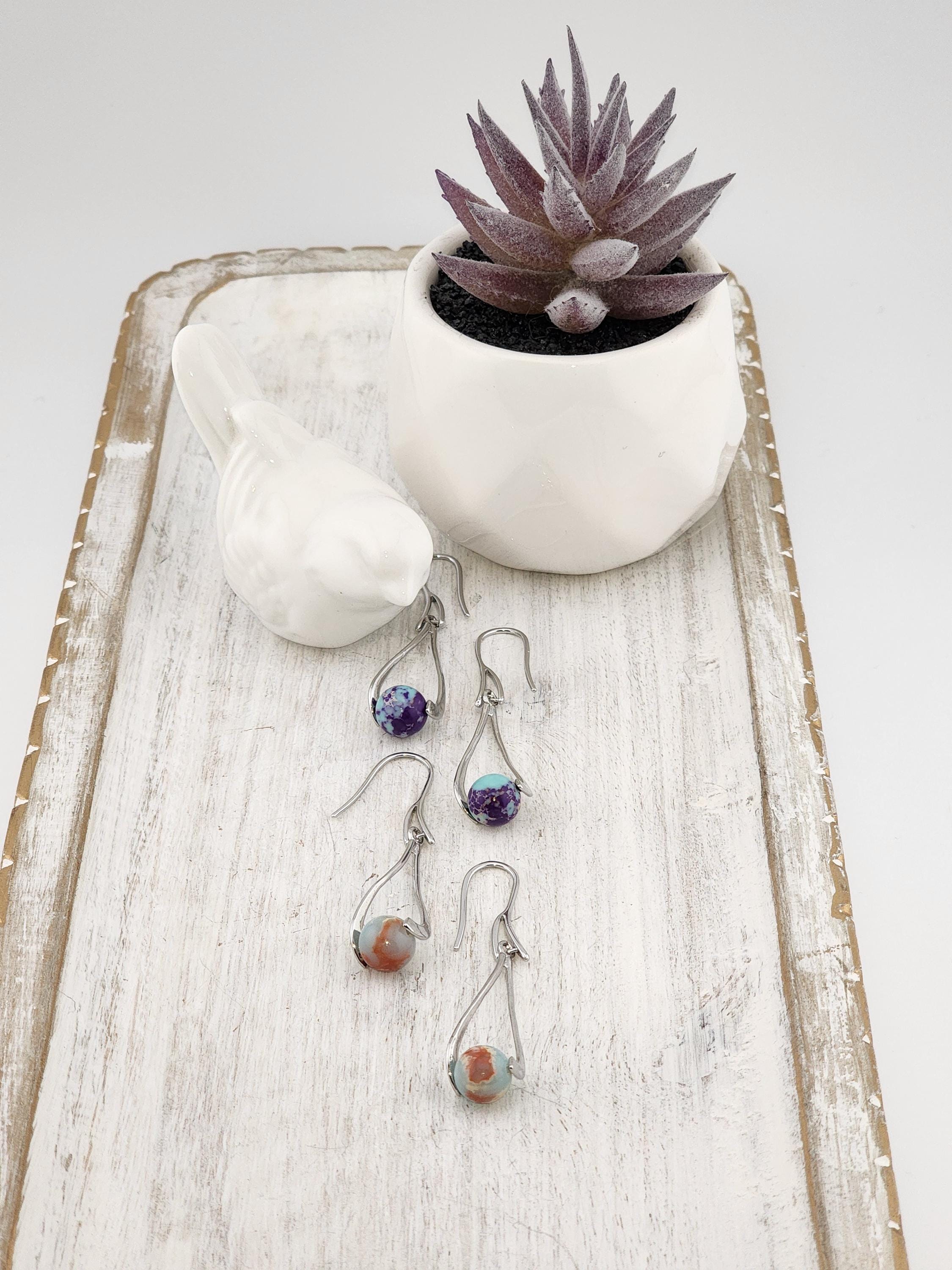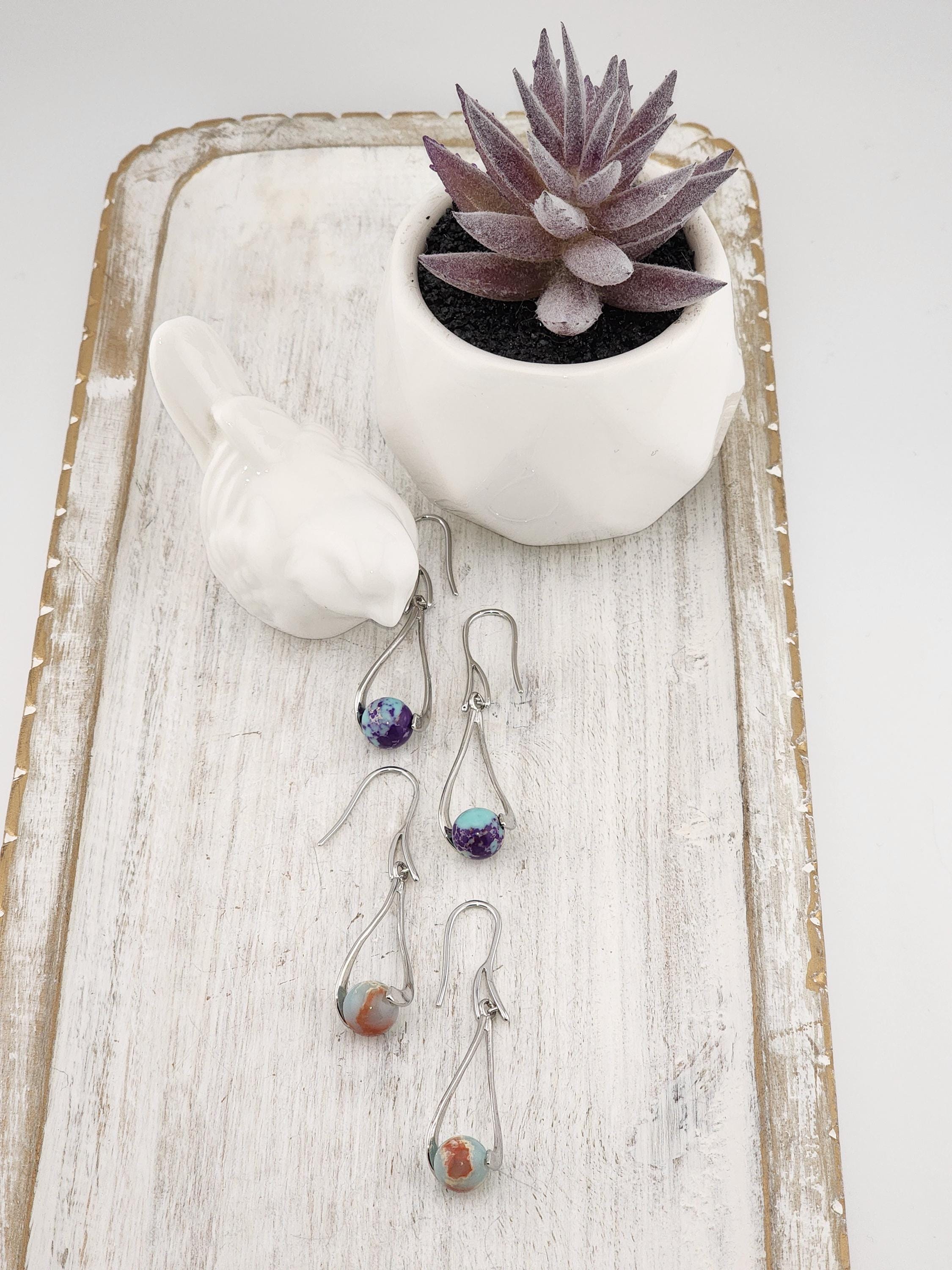 I made these dangle earrings using platinum plated brass hooks. I added platinum plated hollow teardrop twist charms with jasper gemstone beads locked inside. YOUR CHOICE OF SEA SEDIMENT JASPER ARE: #1- Purple and Blue #-2- Sky Blue and Red * Your purchase will arrive in pretty packaging * Shipping is included