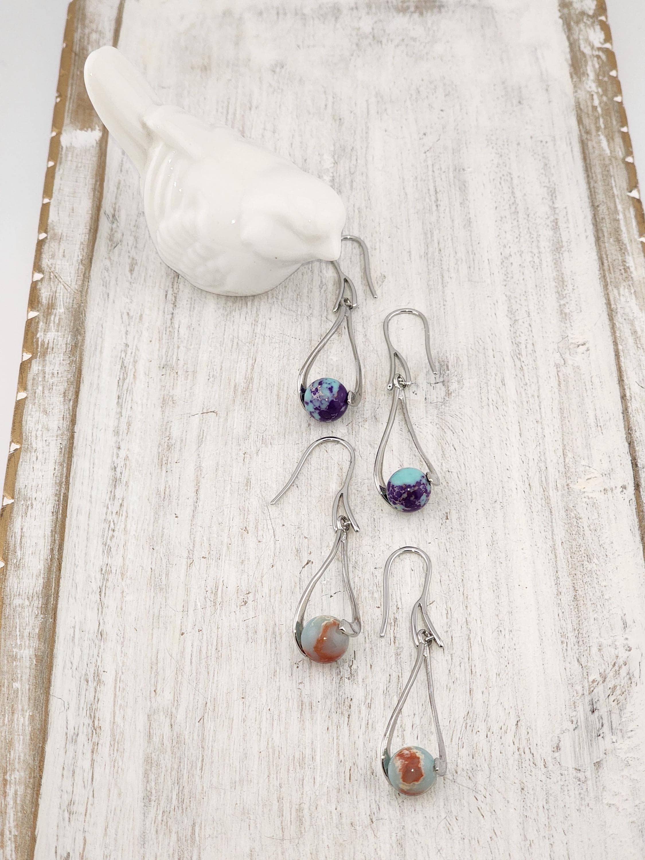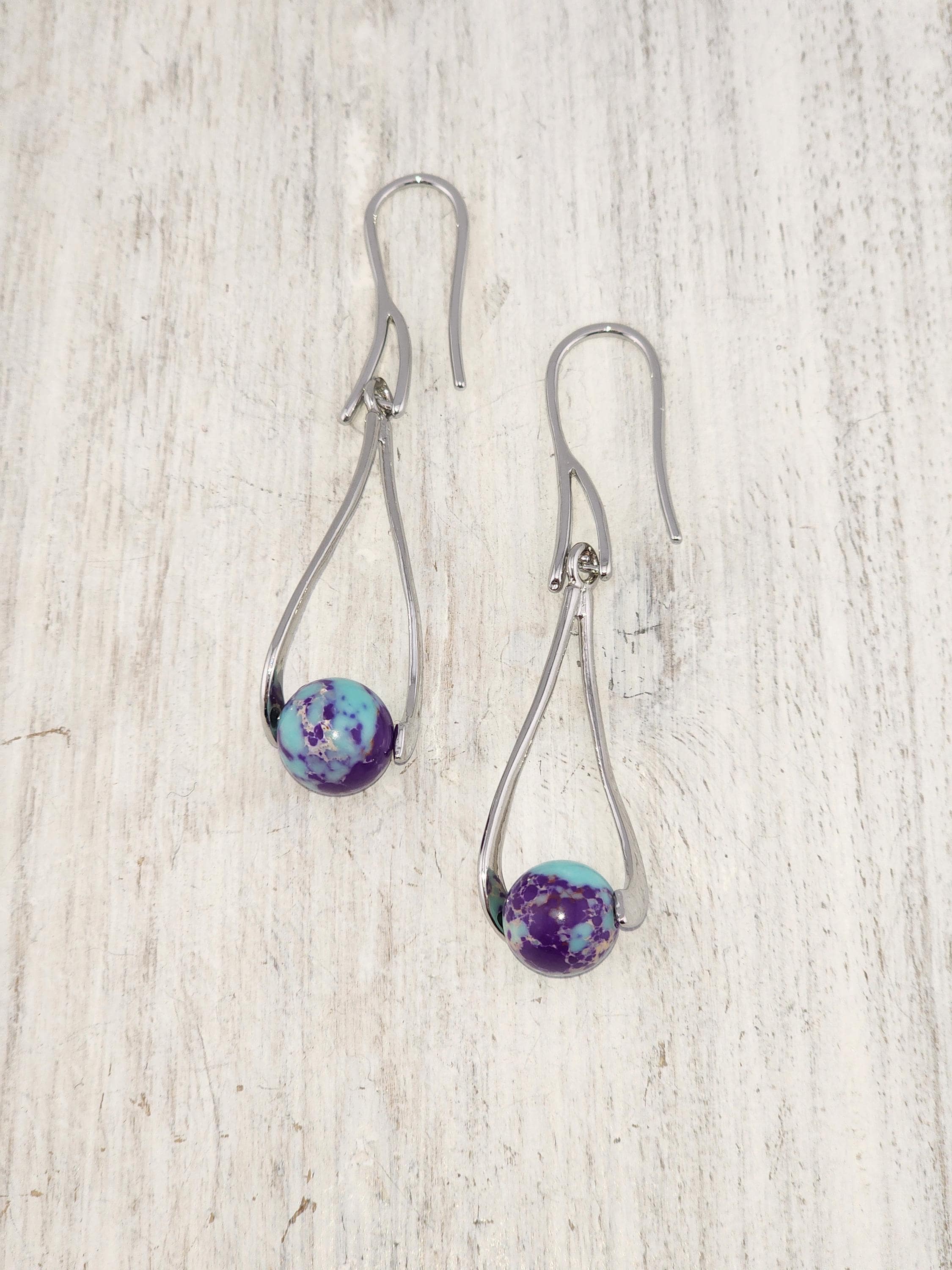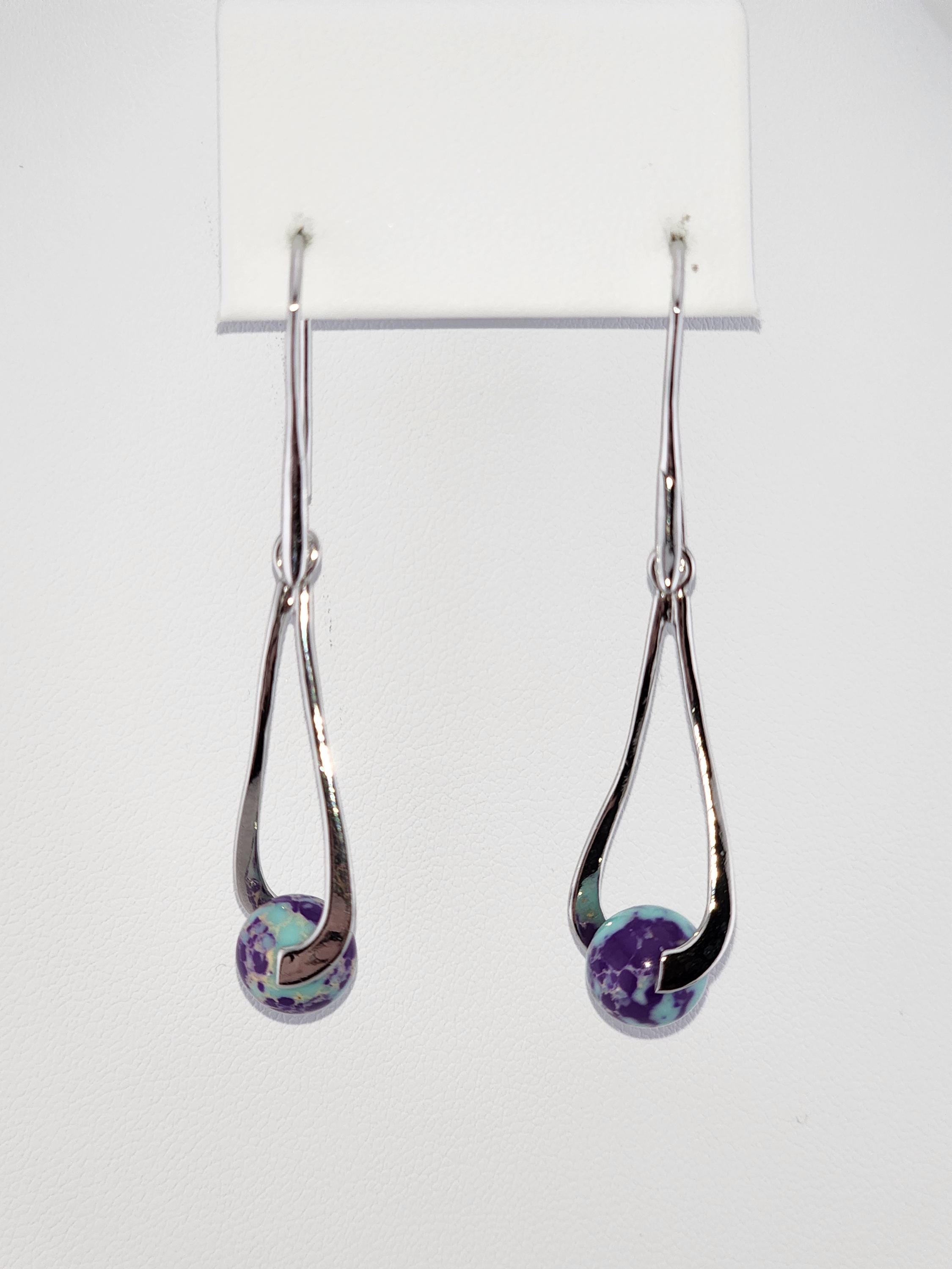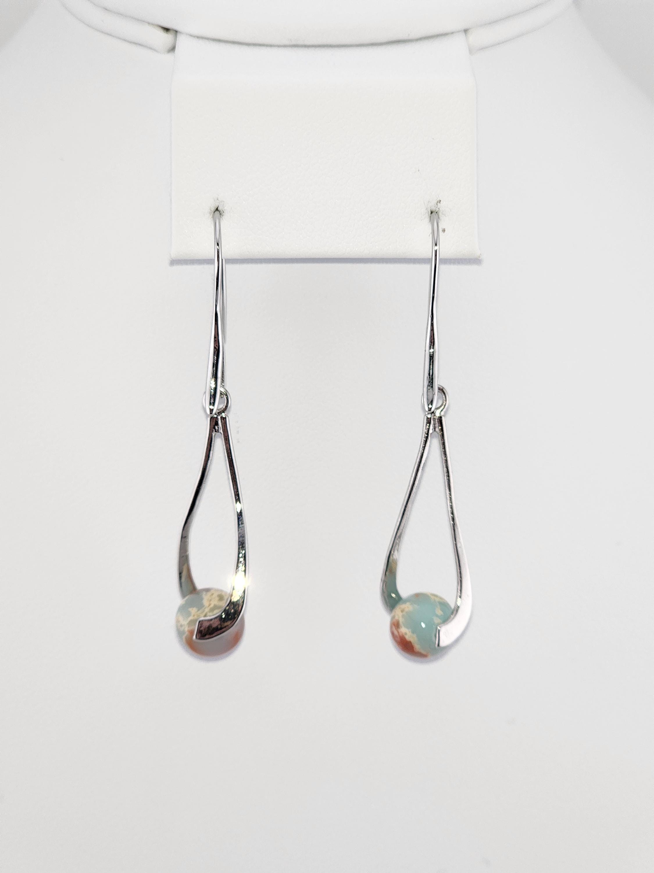 I made these dangle earrings using platinum plated brass hooks. I added platinum plated hollow teardrop twist charms with jasper gemstone beads locked inside. YOUR CHOICE OF SEA SEDIMENT JASPER ARE: #1- Purple and Blue #-2- Sky Blue and Red * Your purchase will arrive in pretty packaging * Shipping is included