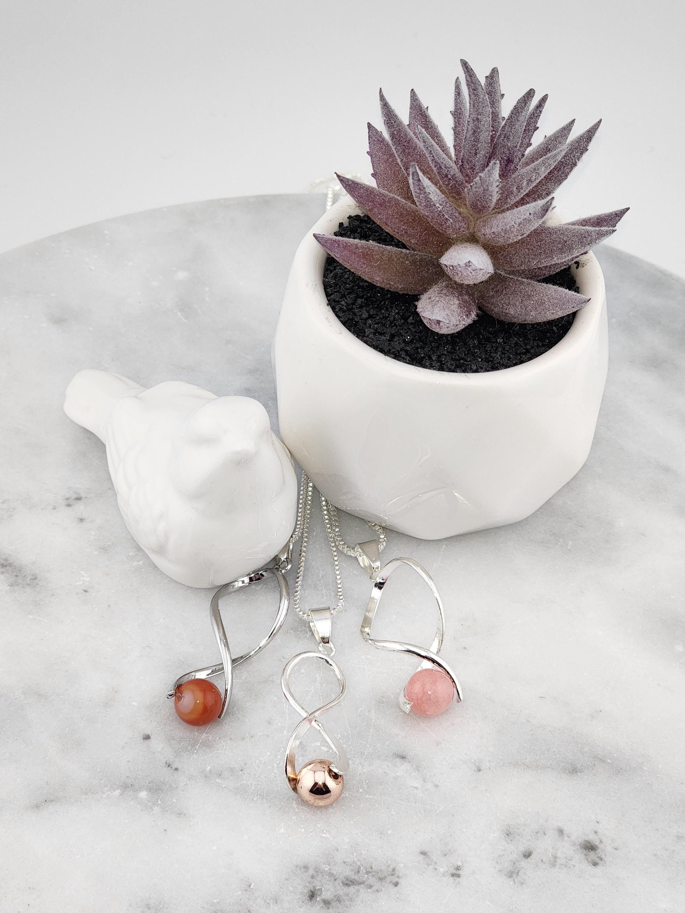 I made these necklaces using sterling silver plated chain that have extenders, making them 20"- 22" in length. I added infinity twisted platinum pendants that have gemstone beads locked in them. YOUR CHOICES OF GEMSTONE BEADS ARE: #1- Pink Chalcedony #2- Pink Hematite #3- Red Banded Agate * Your purchase will arrive in pretty packaging