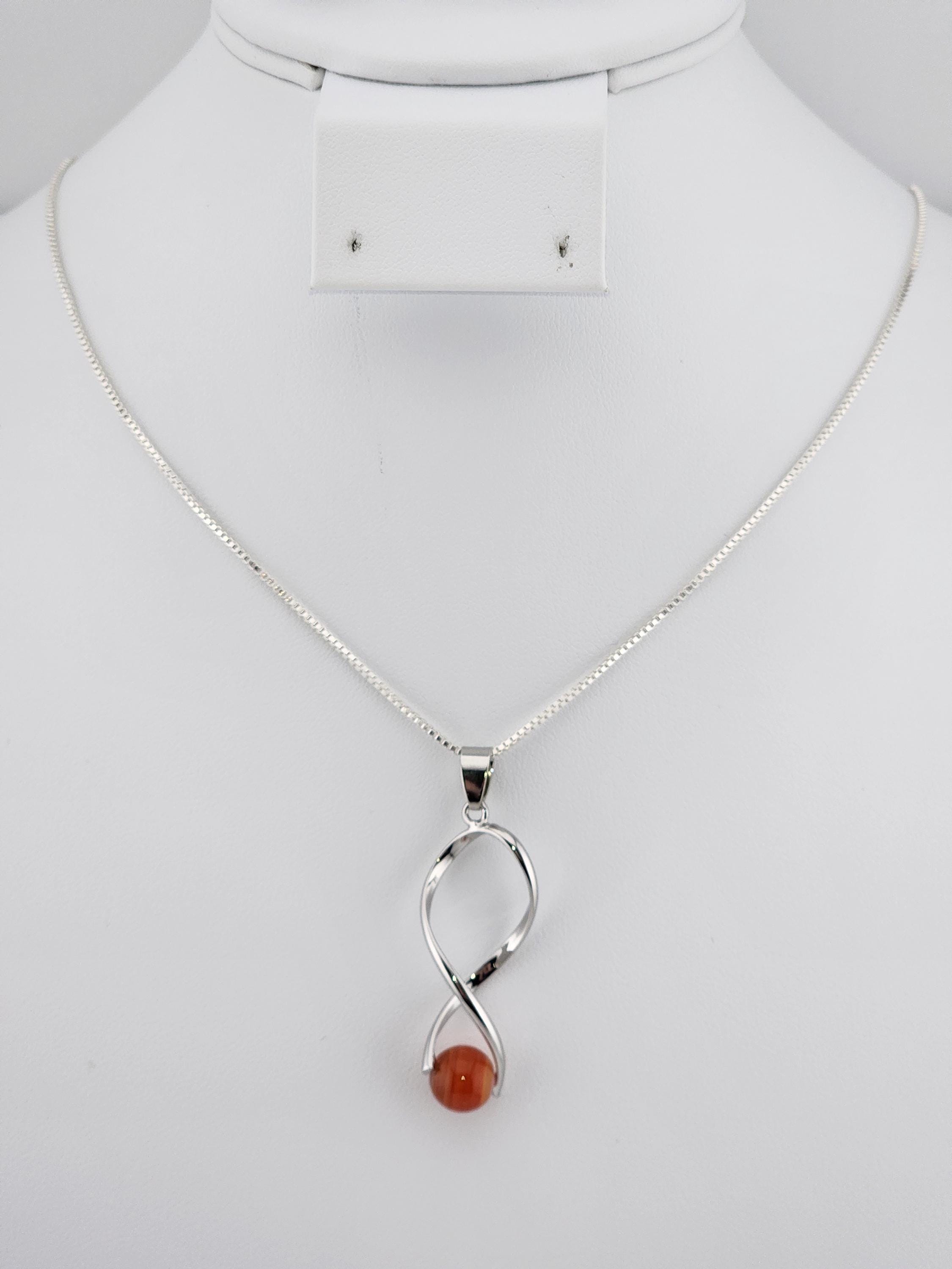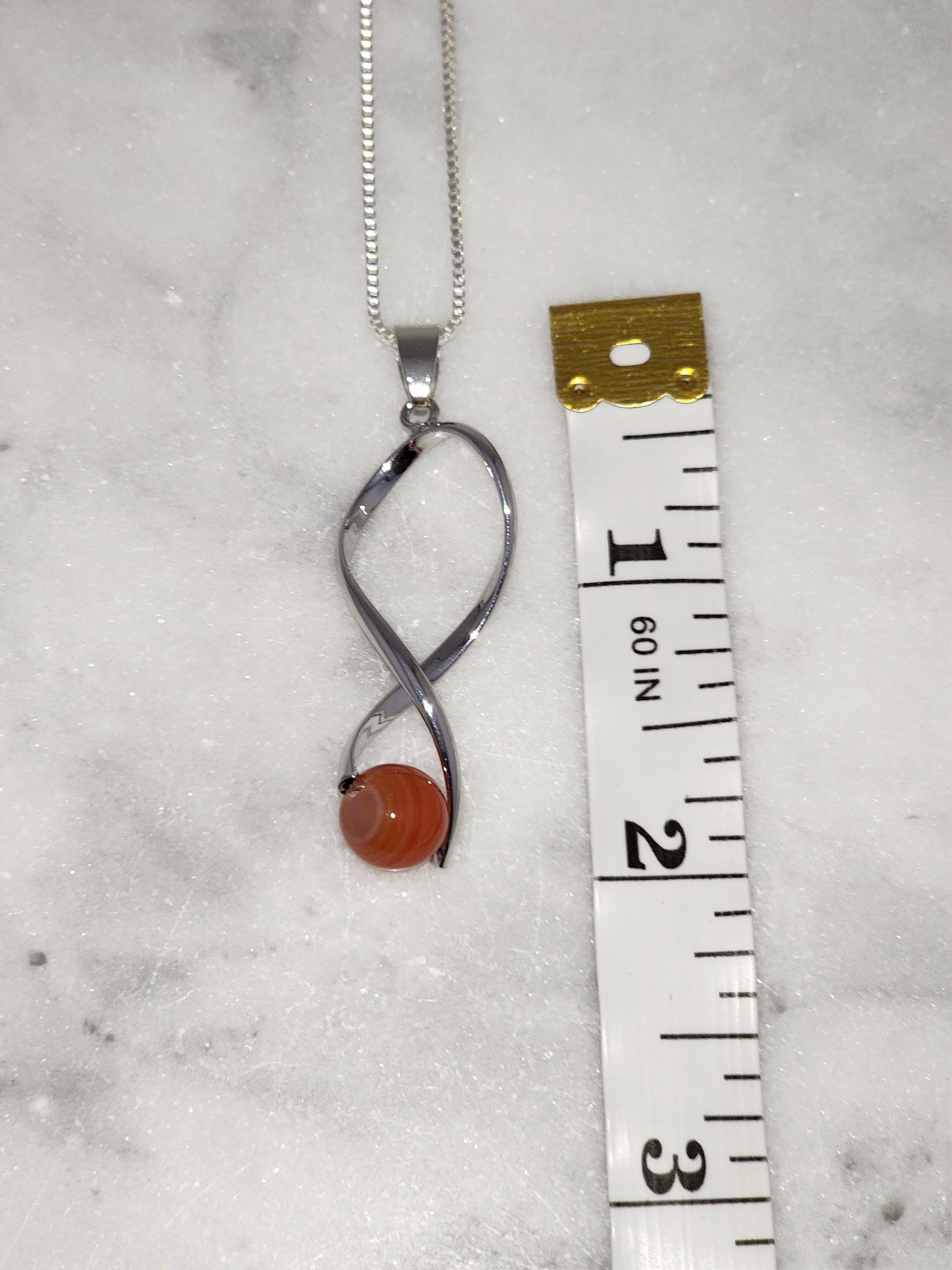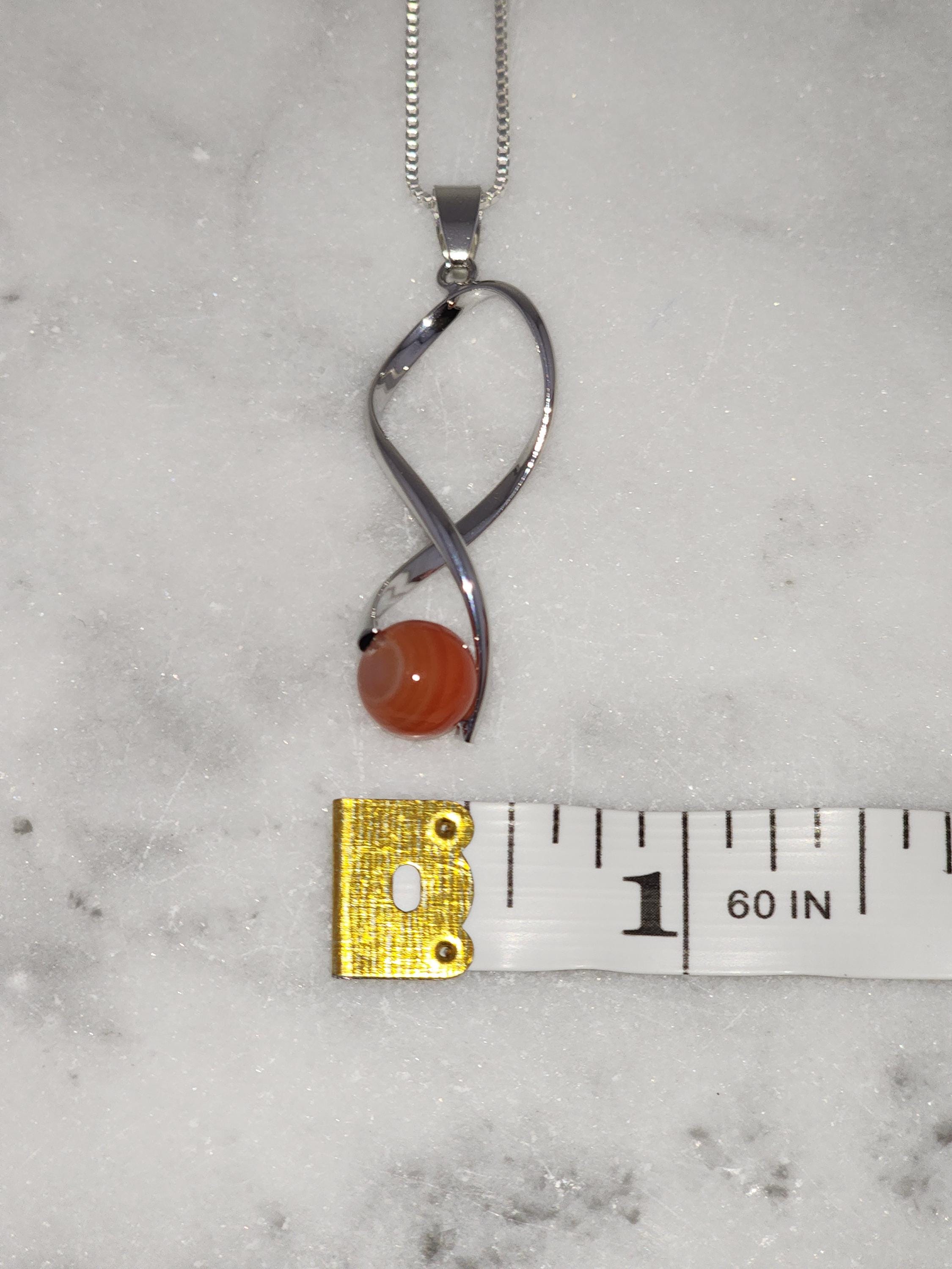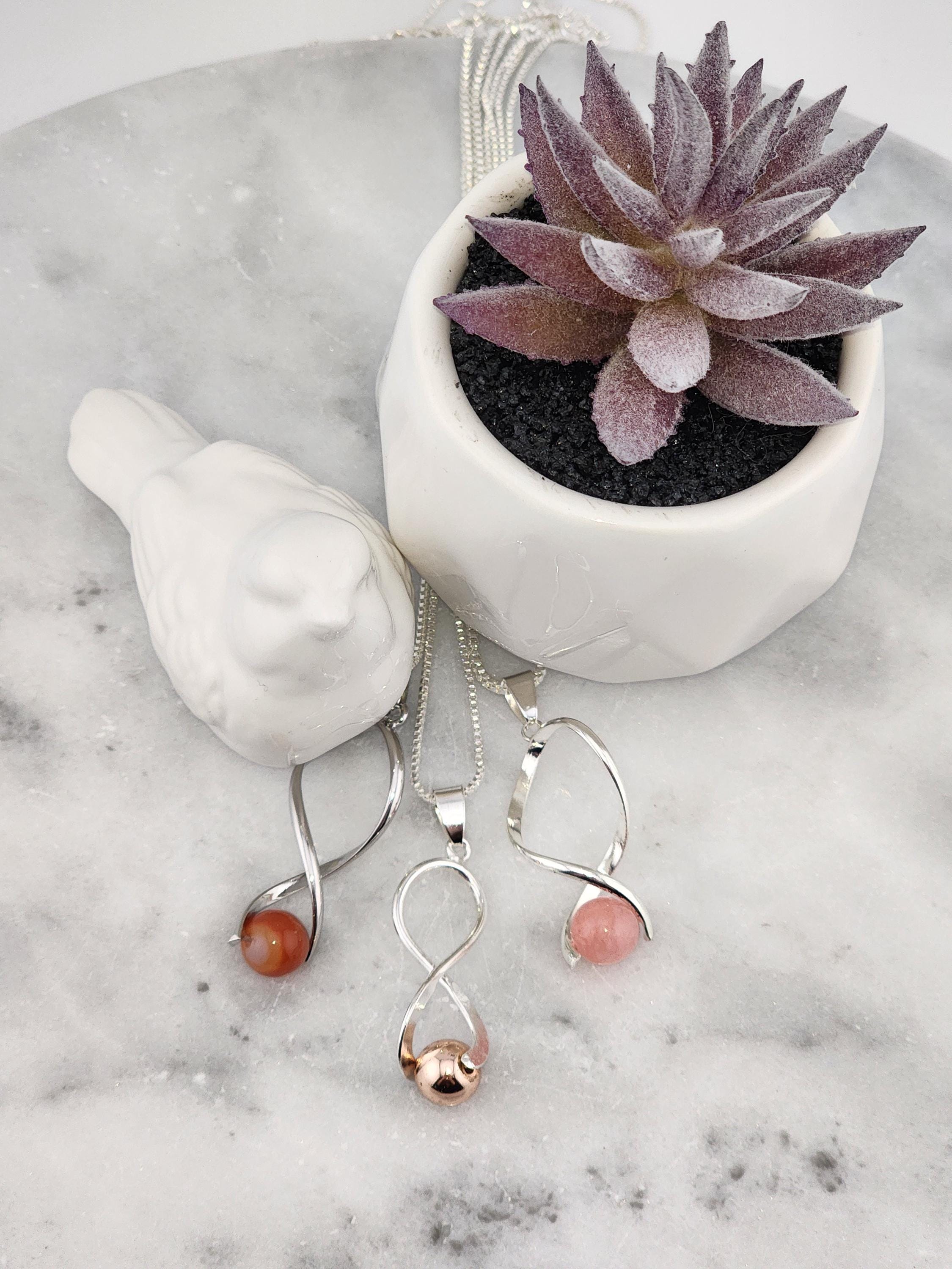 I made these necklaces using sterling silver plated chain that have extenders, making them 20"- 22" in length. I added infinity twisted platinum pendants that have gemstone beads locked in them. YOUR CHOICES OF GEMSTONE BEADS ARE: #1- Pink Chalcedony #2- Pink Hematite #3- Red Banded Agate * Your purchase will arrive in pretty packaging * Shipping is included