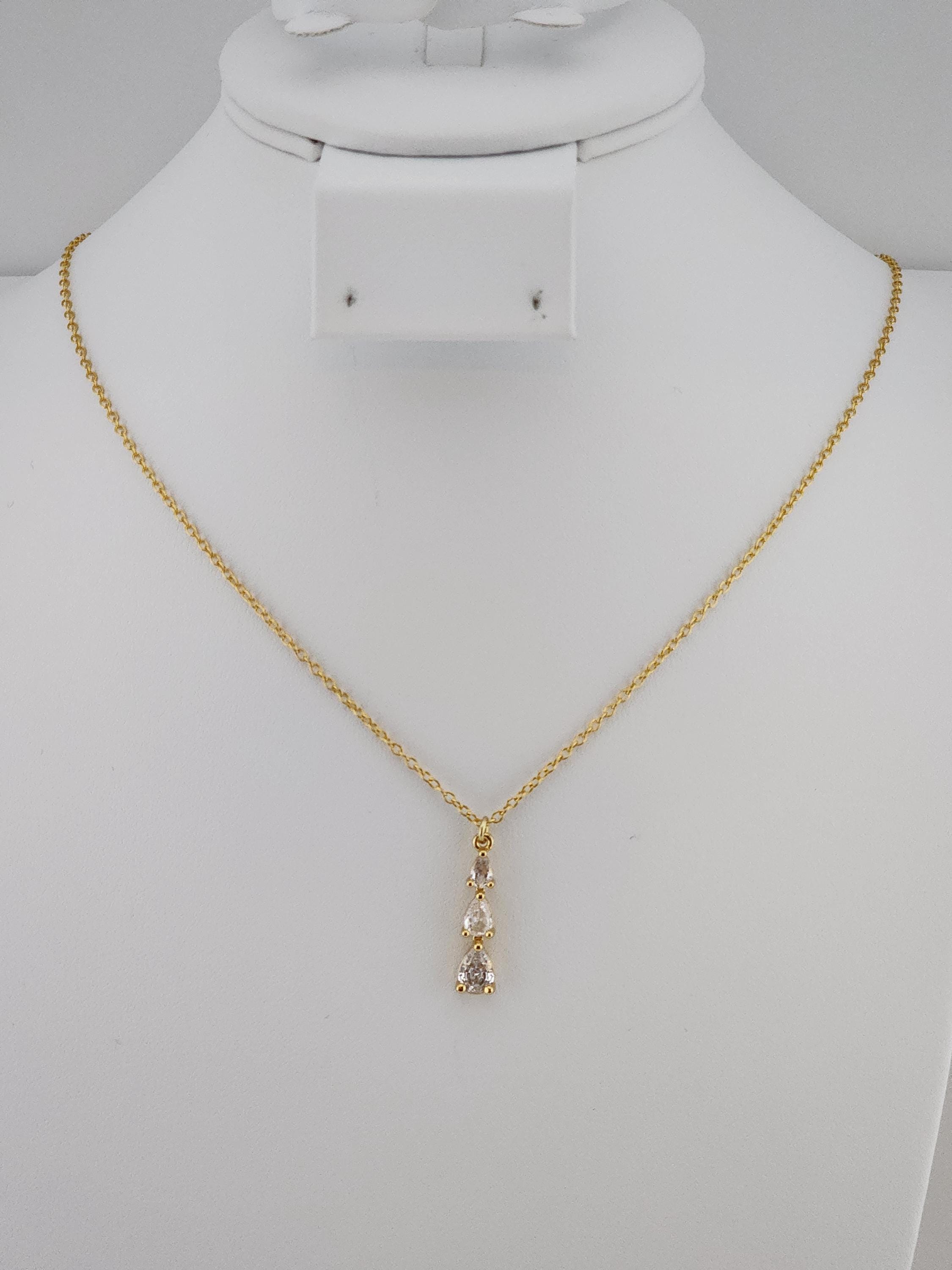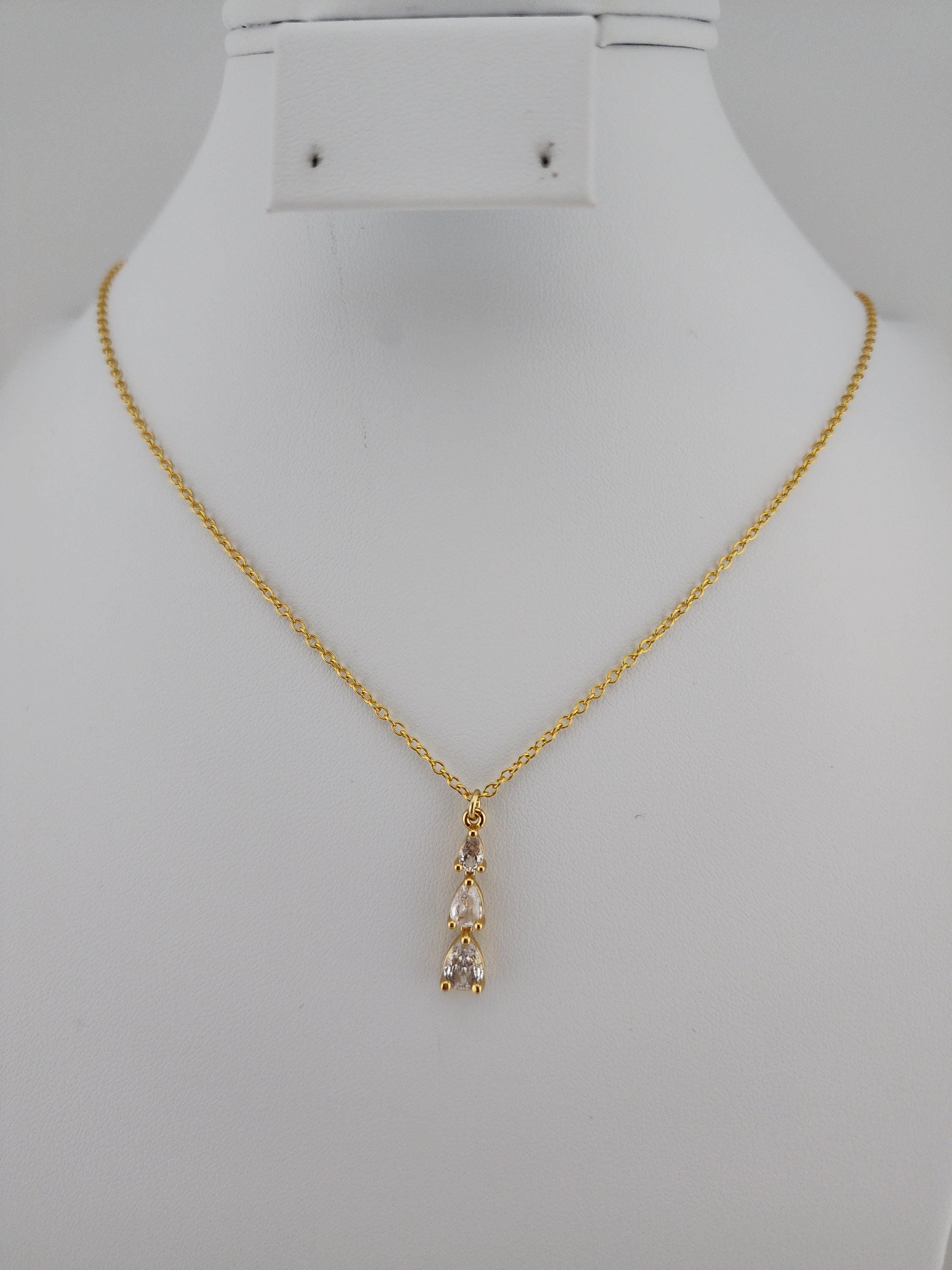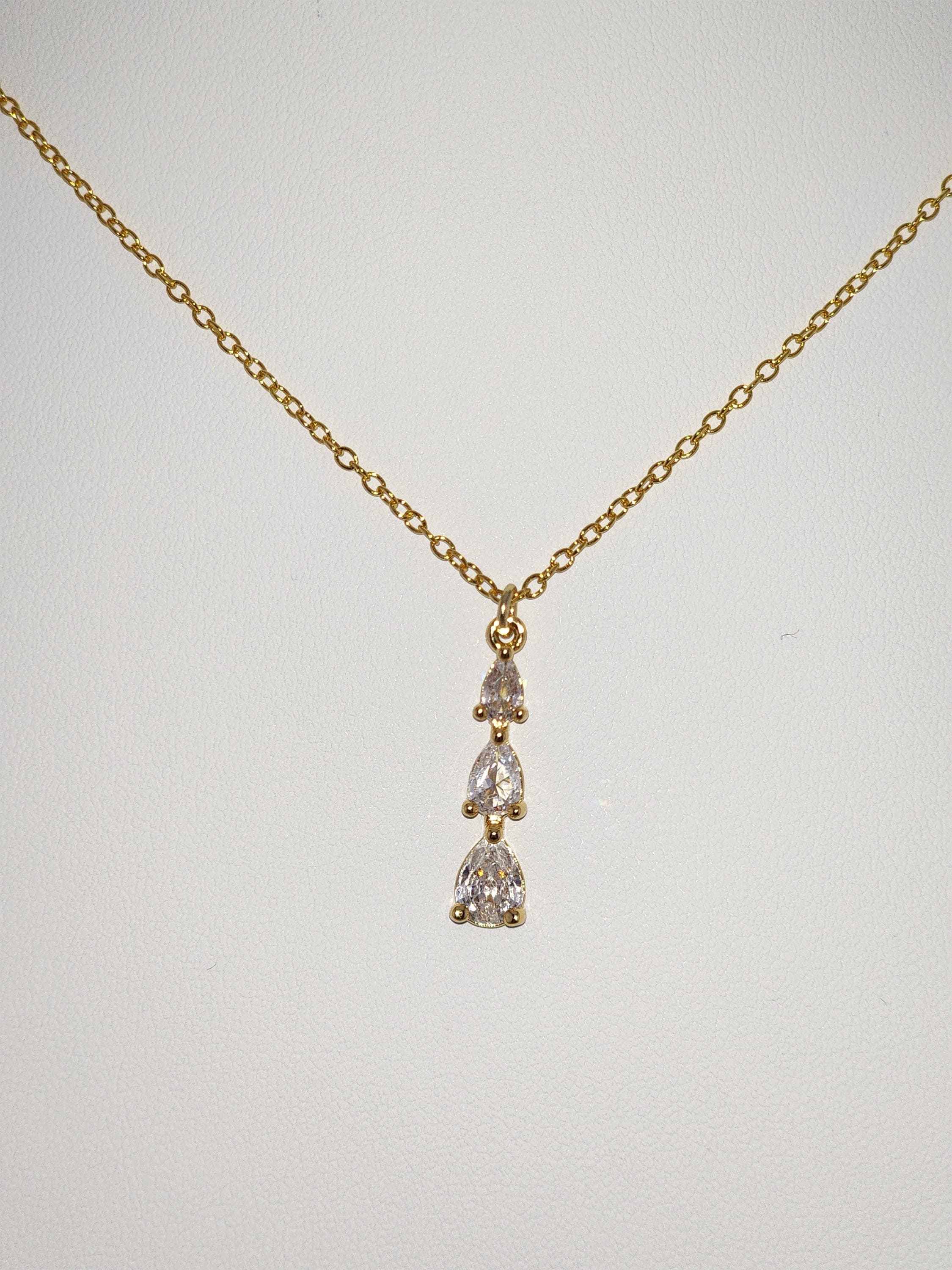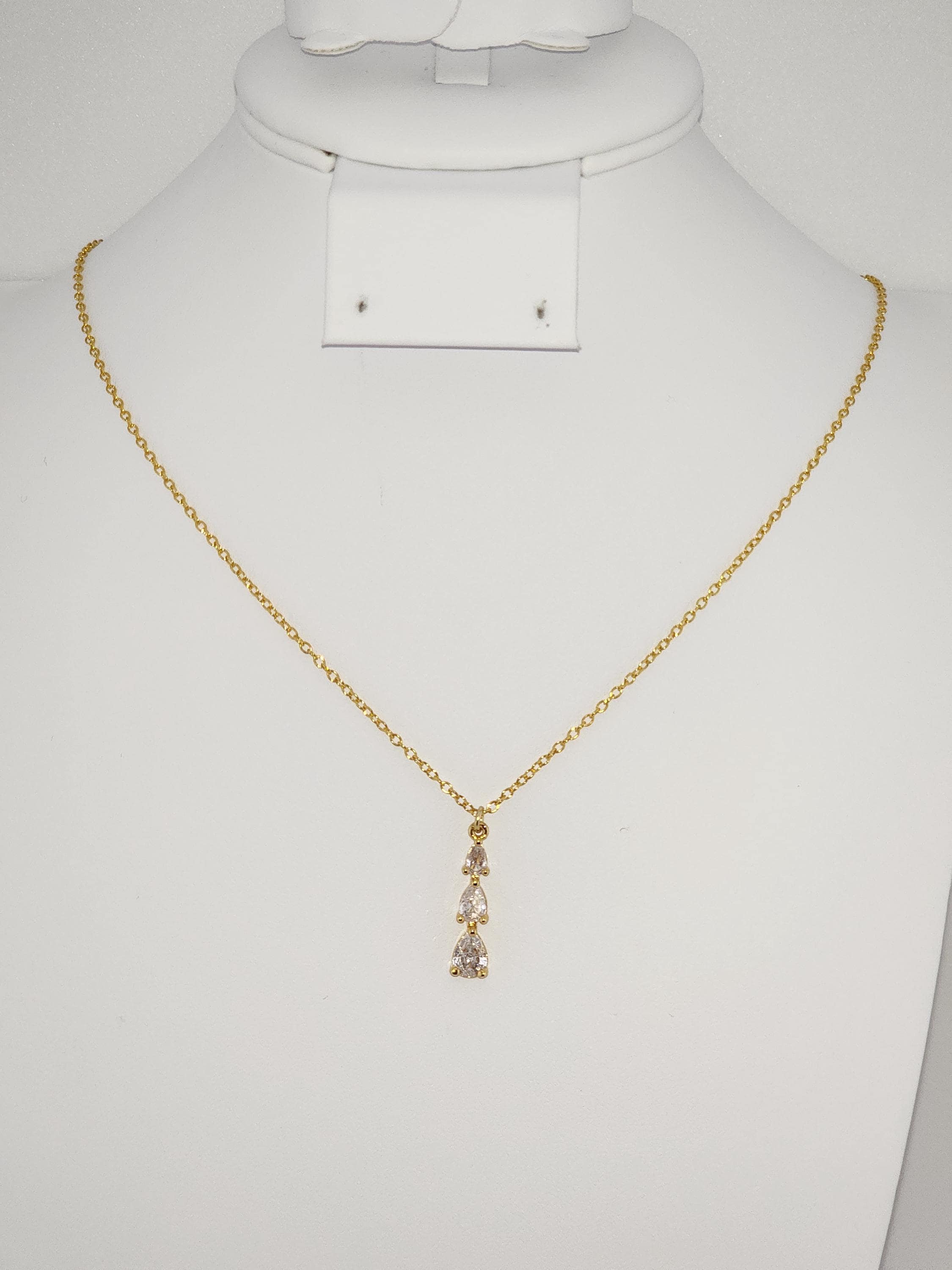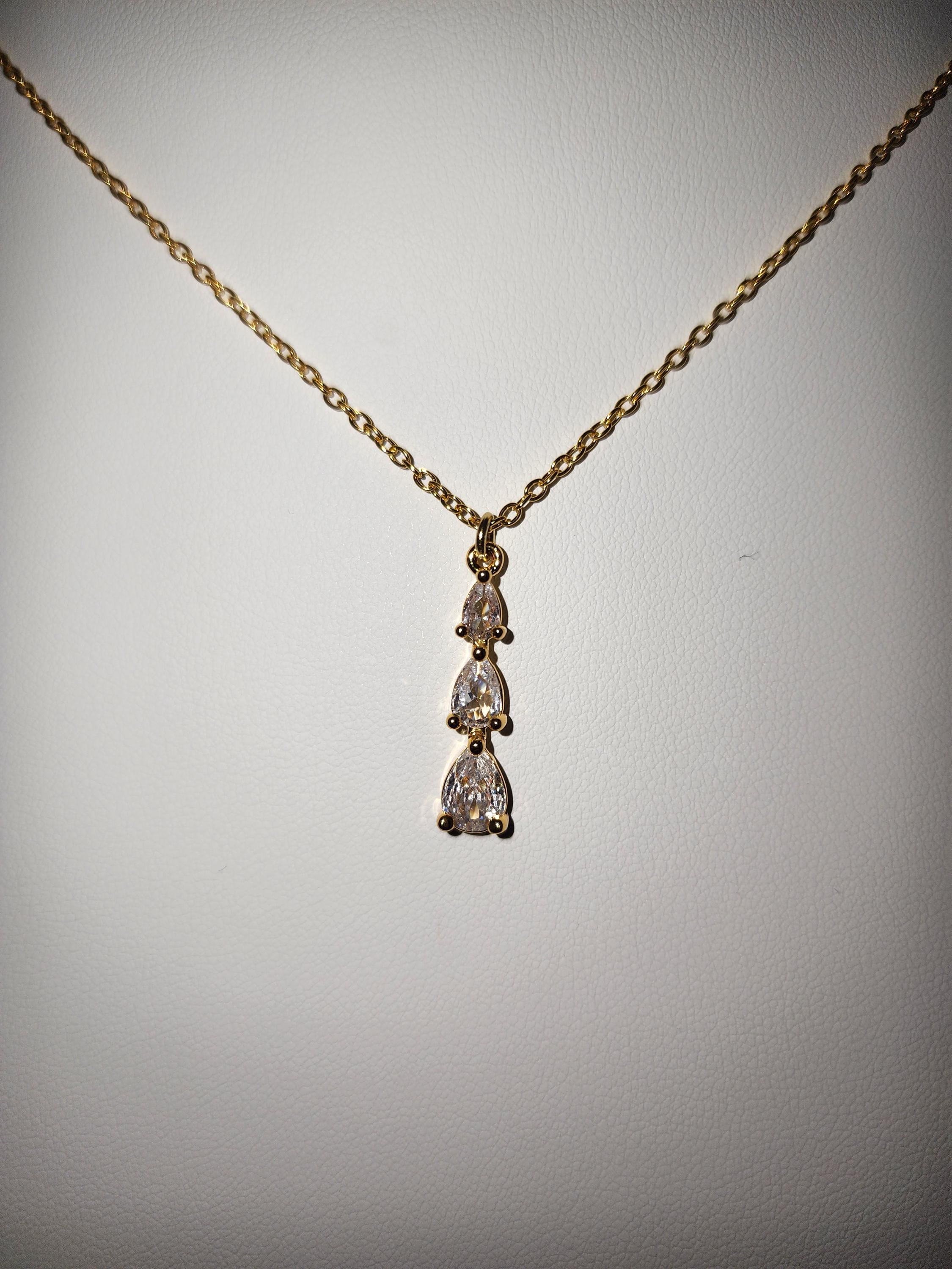 I made this necklace using gold plated sterling silver chain with an extender, making it 21"-23" in length. There is a three tier teardrop cubic zirconia crystals in 18k gold plated pendant that hangs from a 24k gold plated connecting ring. * Your purchase will arrive in pretty packaging * Shipping is included