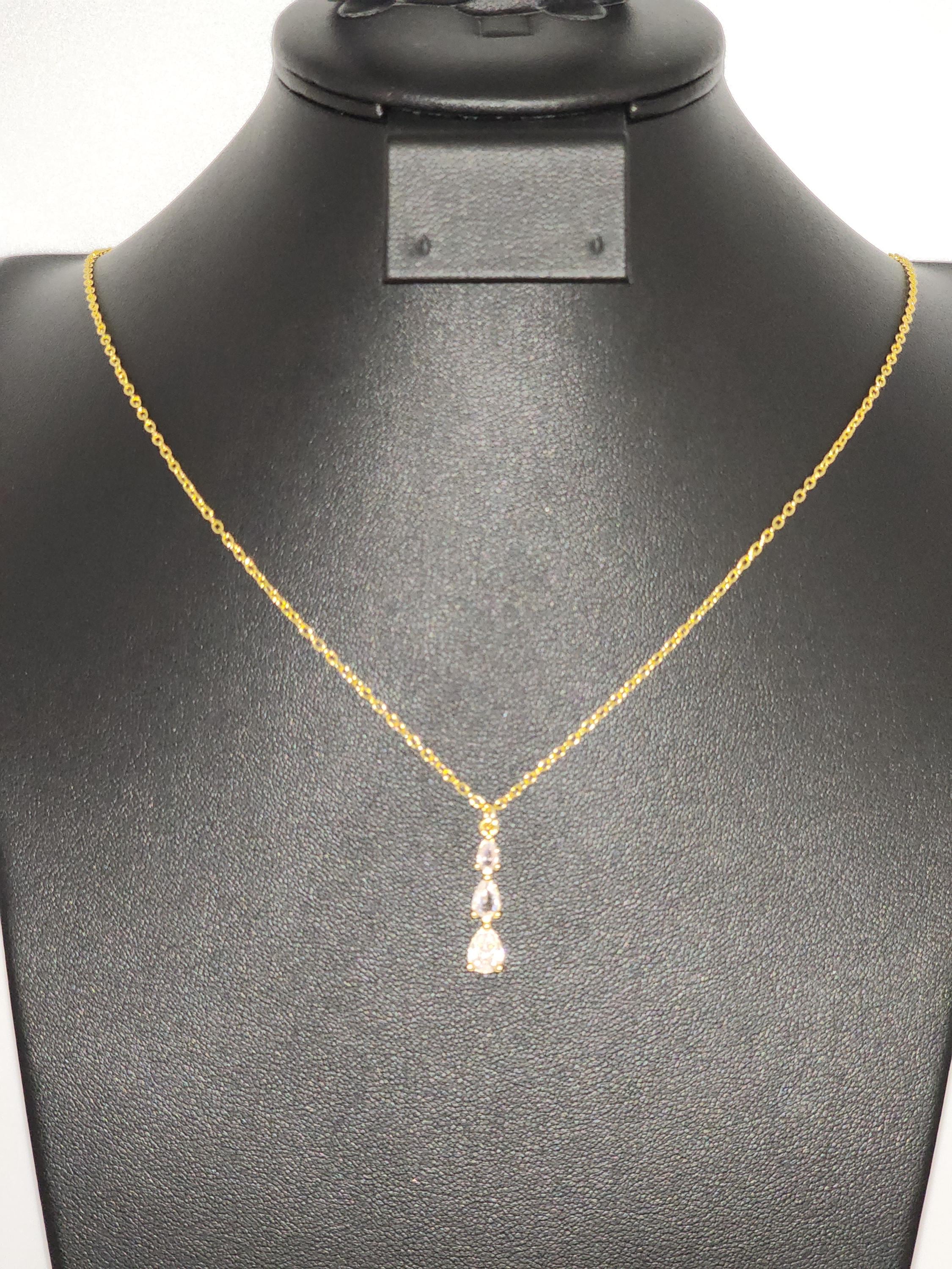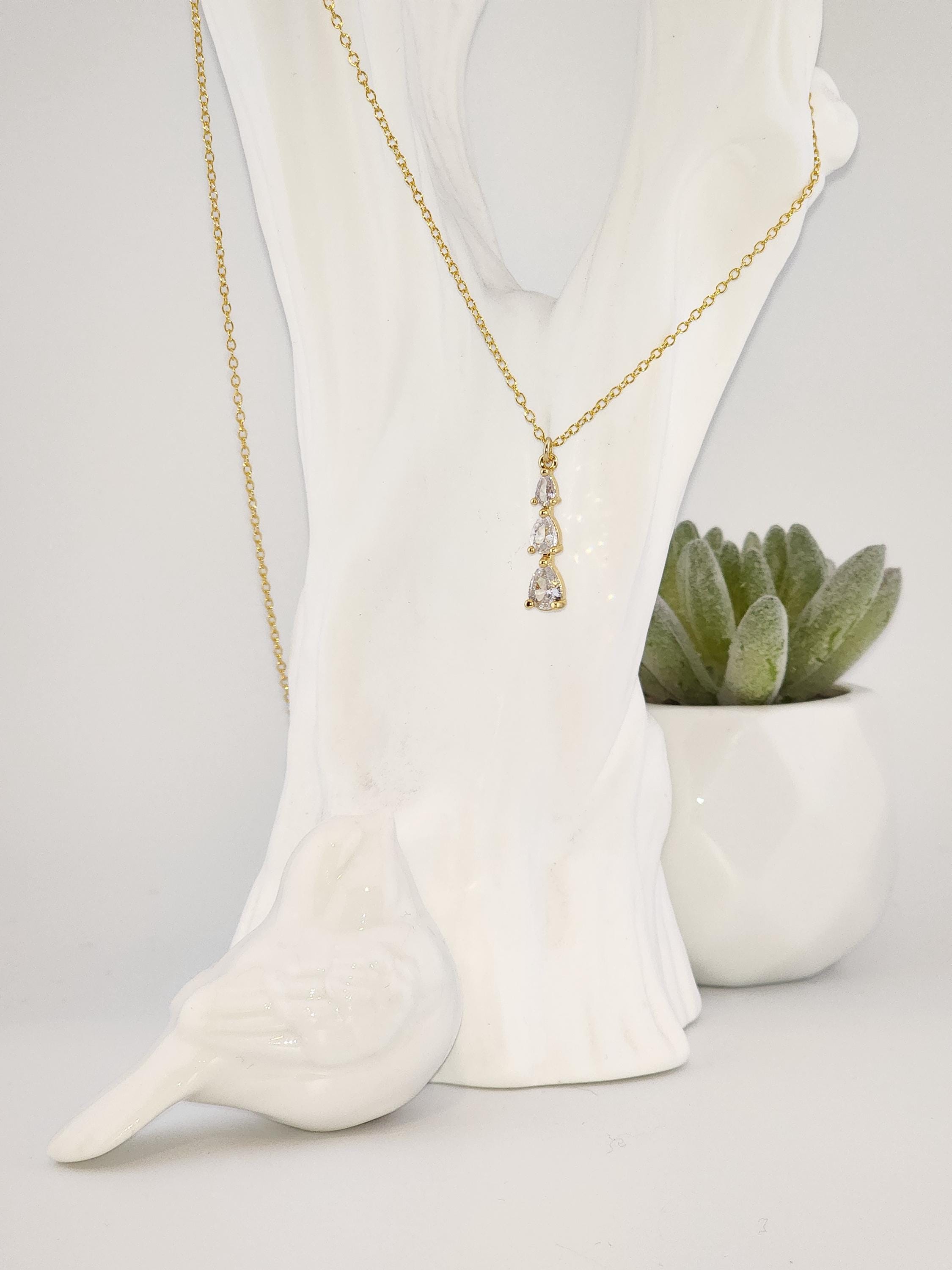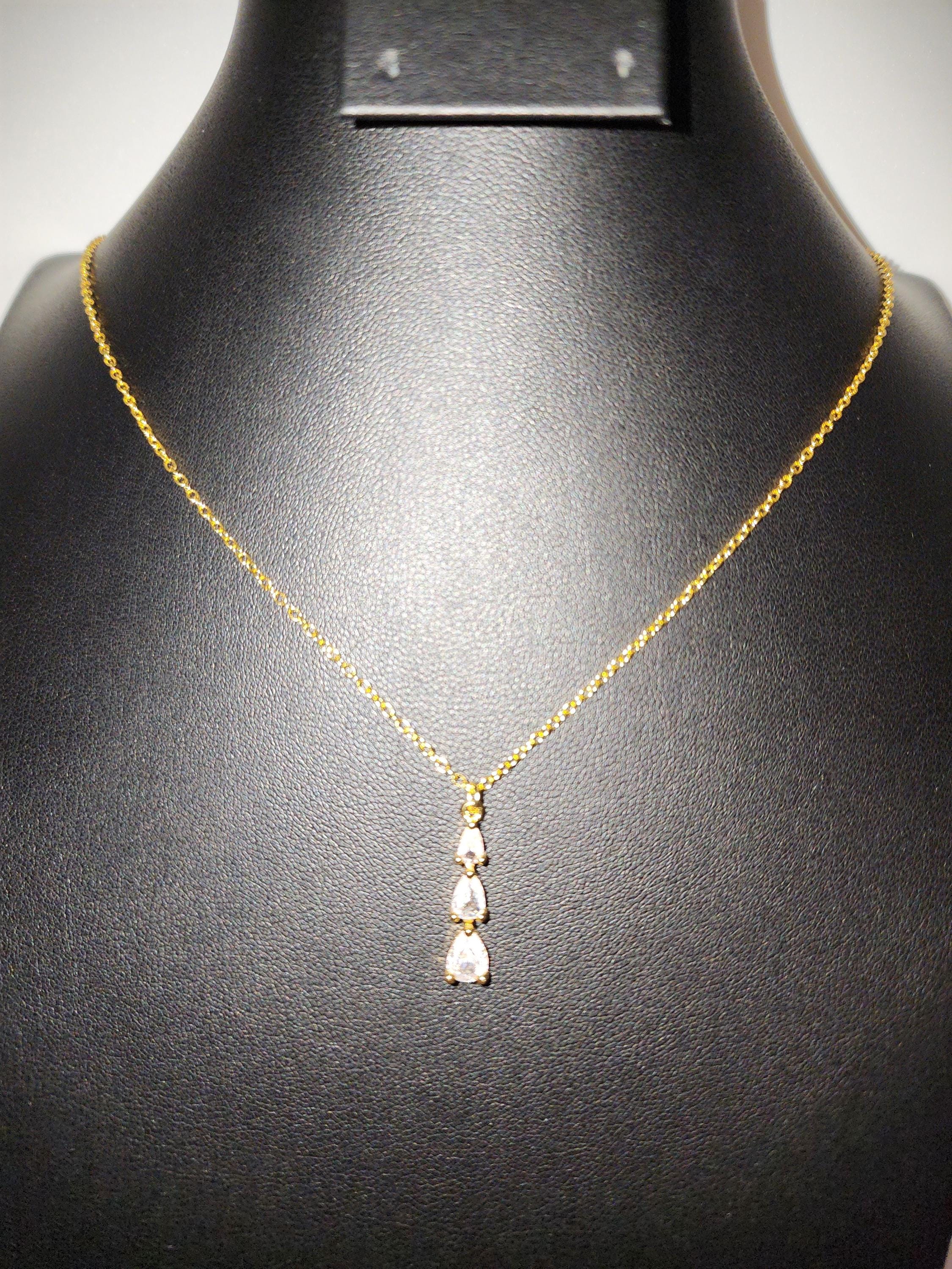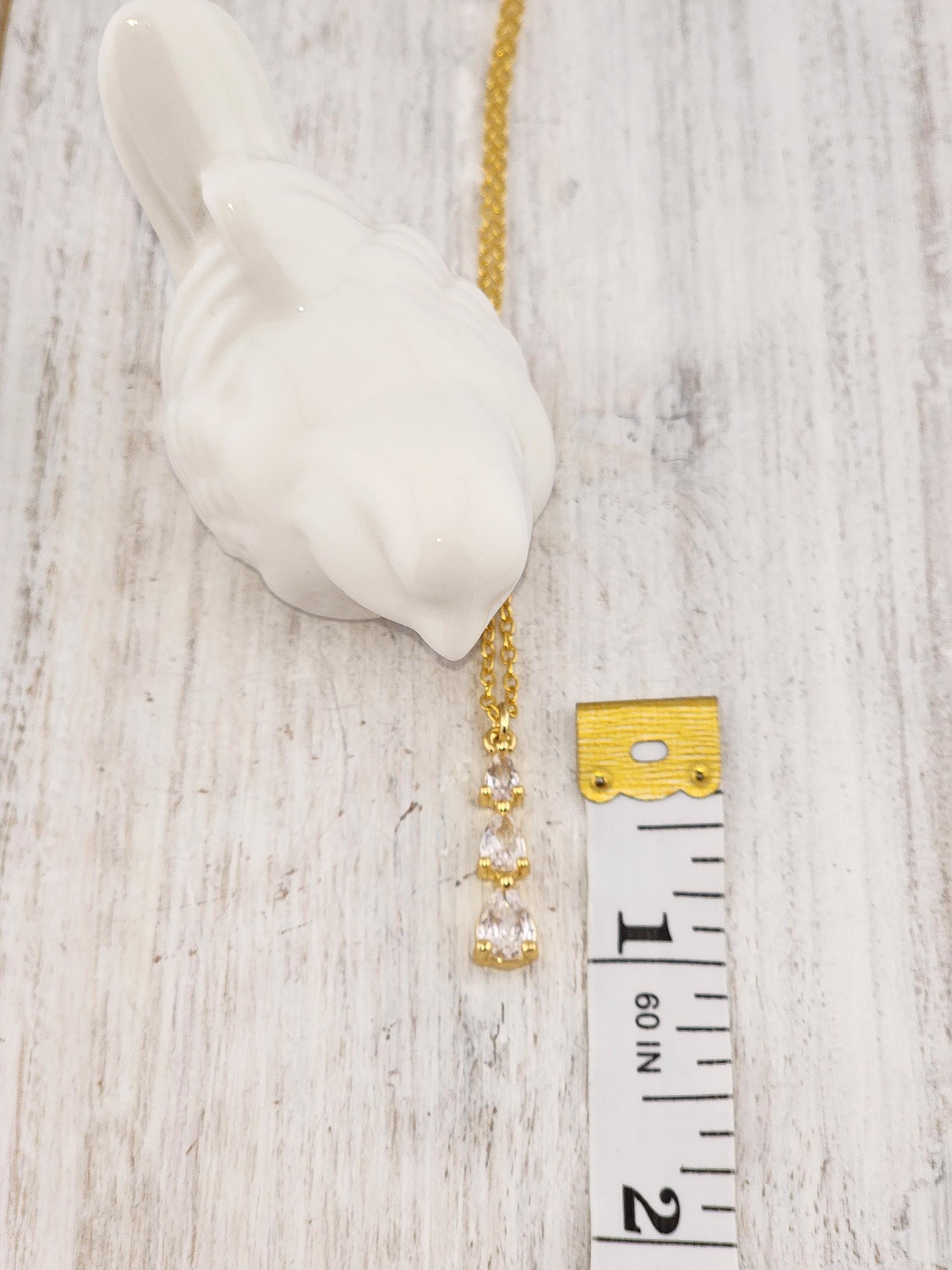 I made this necklace using gold plated sterling silver chain with an extender, making it 21"-23" in length. There is a three tier teardrop cubic zirconia crystals in 18k gold plated pendant that hangs from a 24k gold plated connecting ring. * Your purchase will arrive in pretty packaging * Shipping is included