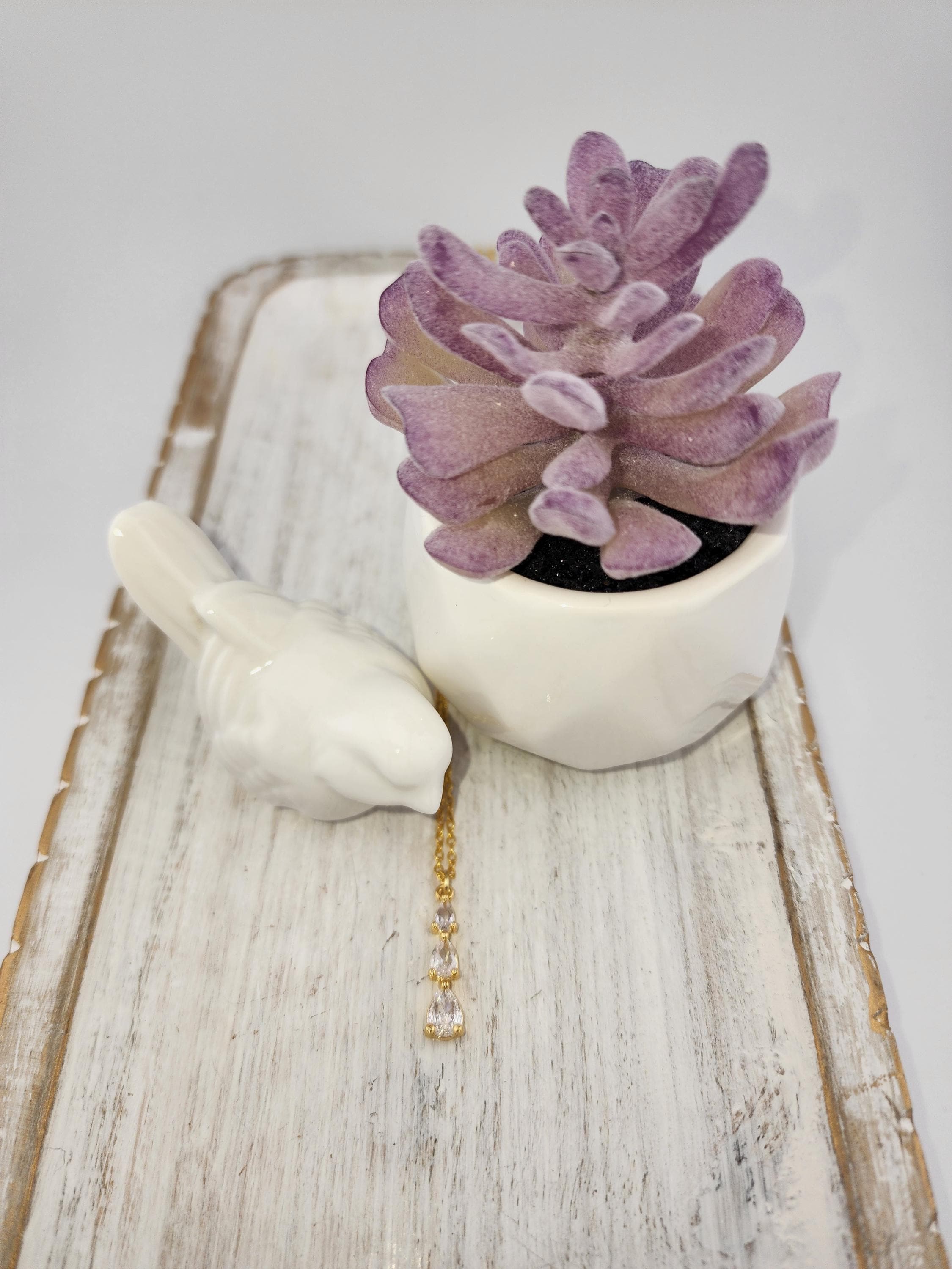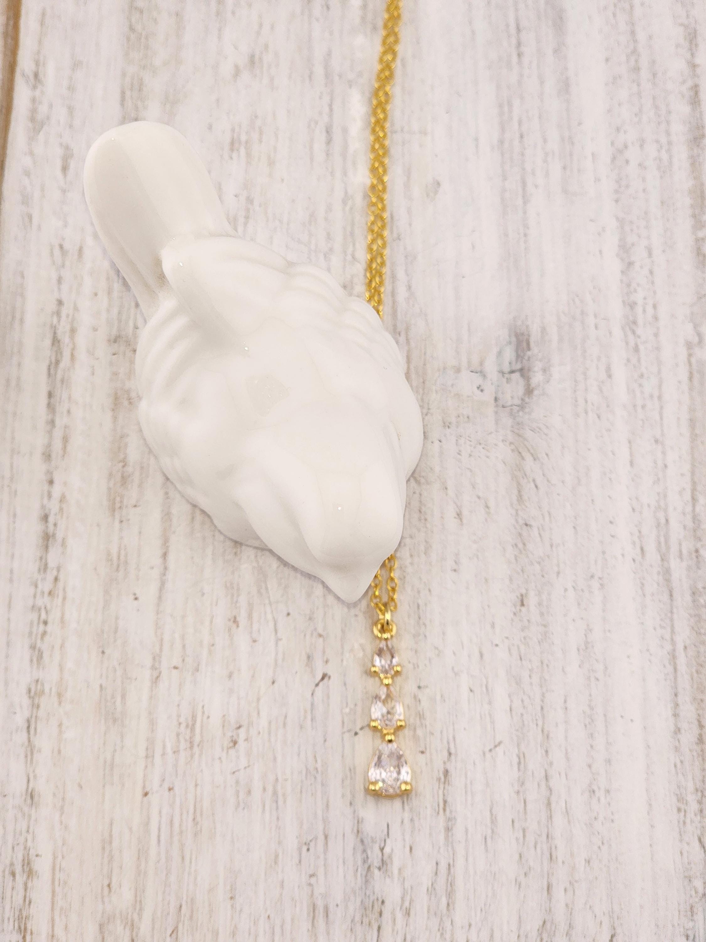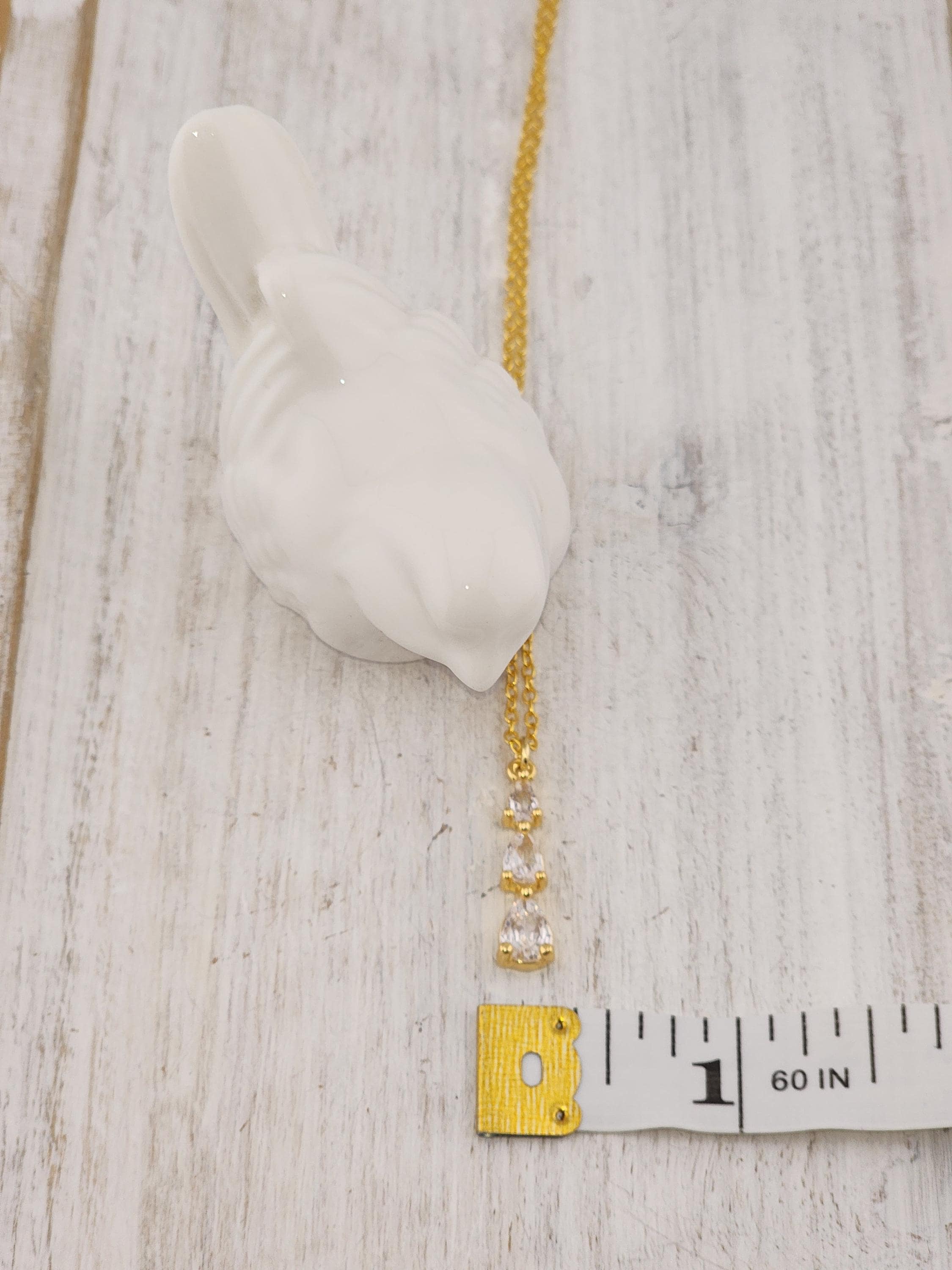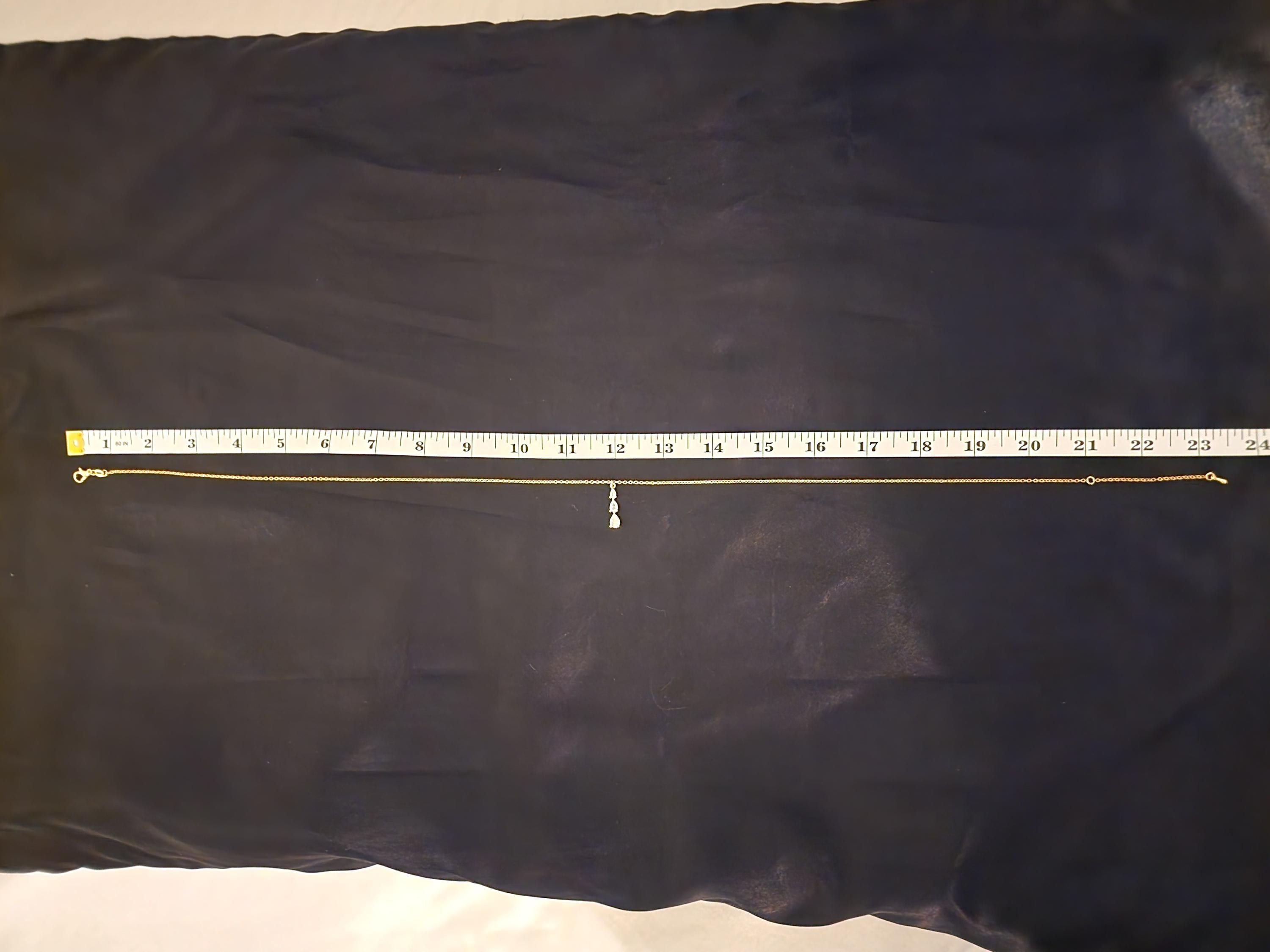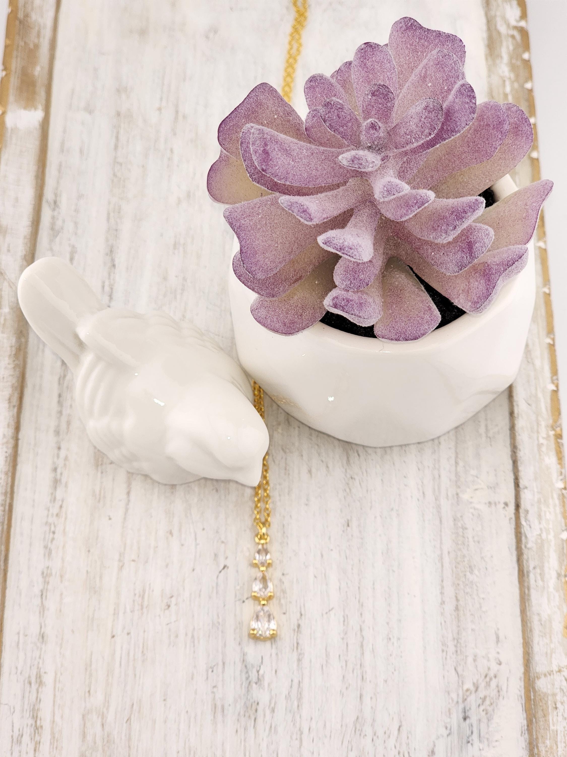 I made this necklace using gold plated sterling silver chain with an extender, making it 21"-23" in length. There is a three tier teardrop cubic zirconia crystals in 18k gold plated pendant that hangs from a 24k gold plated connecting ring. * Your purchase will arrive in pretty packaging * Shipping is included