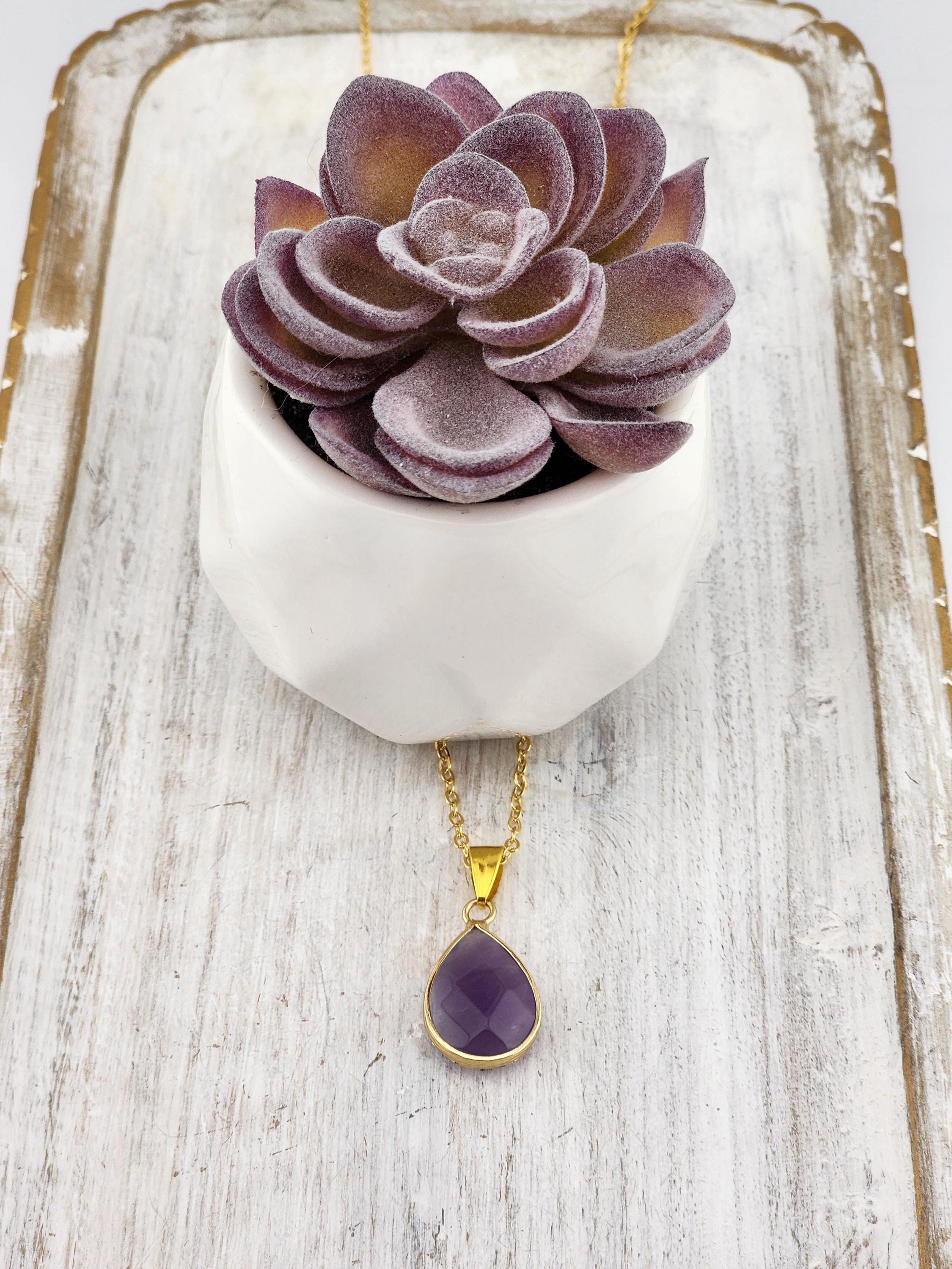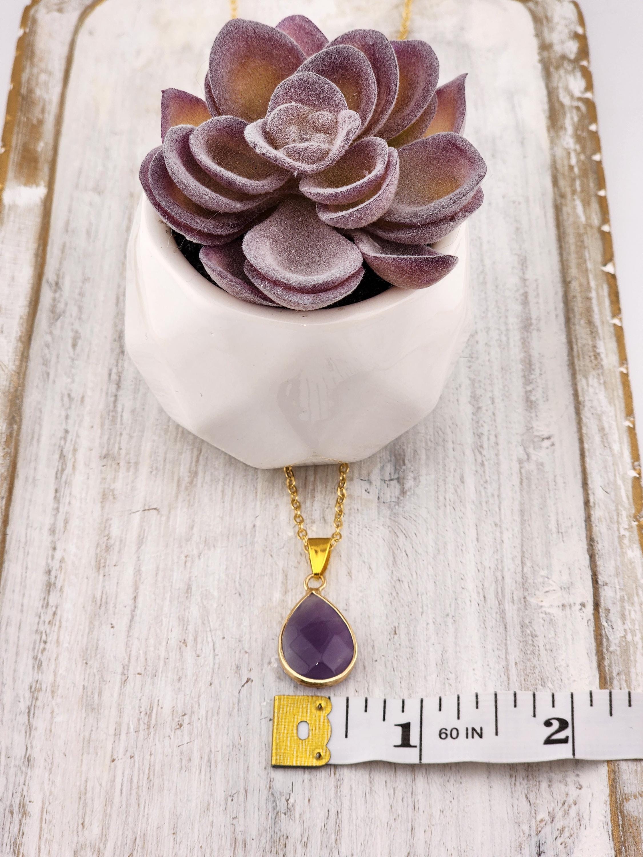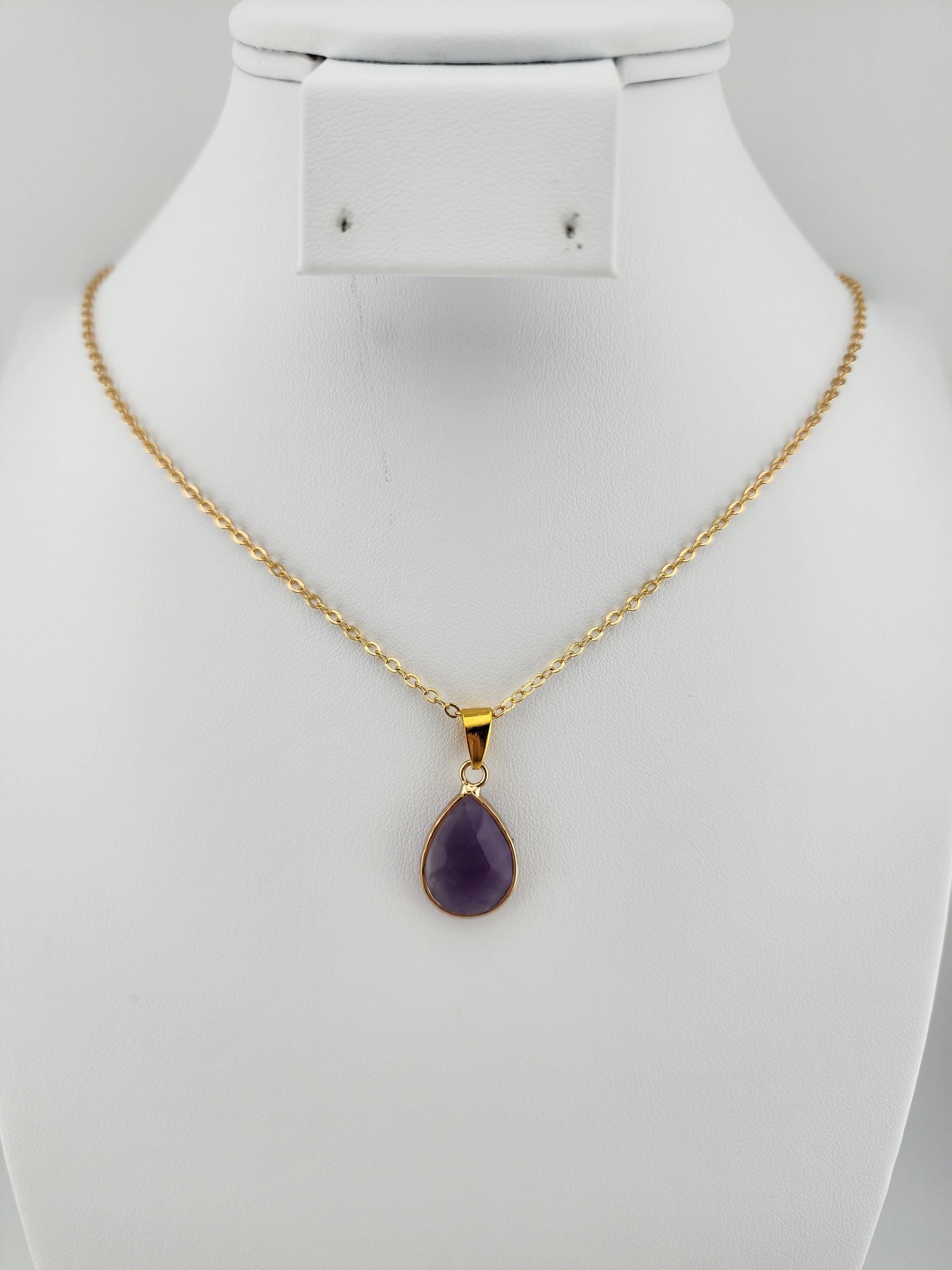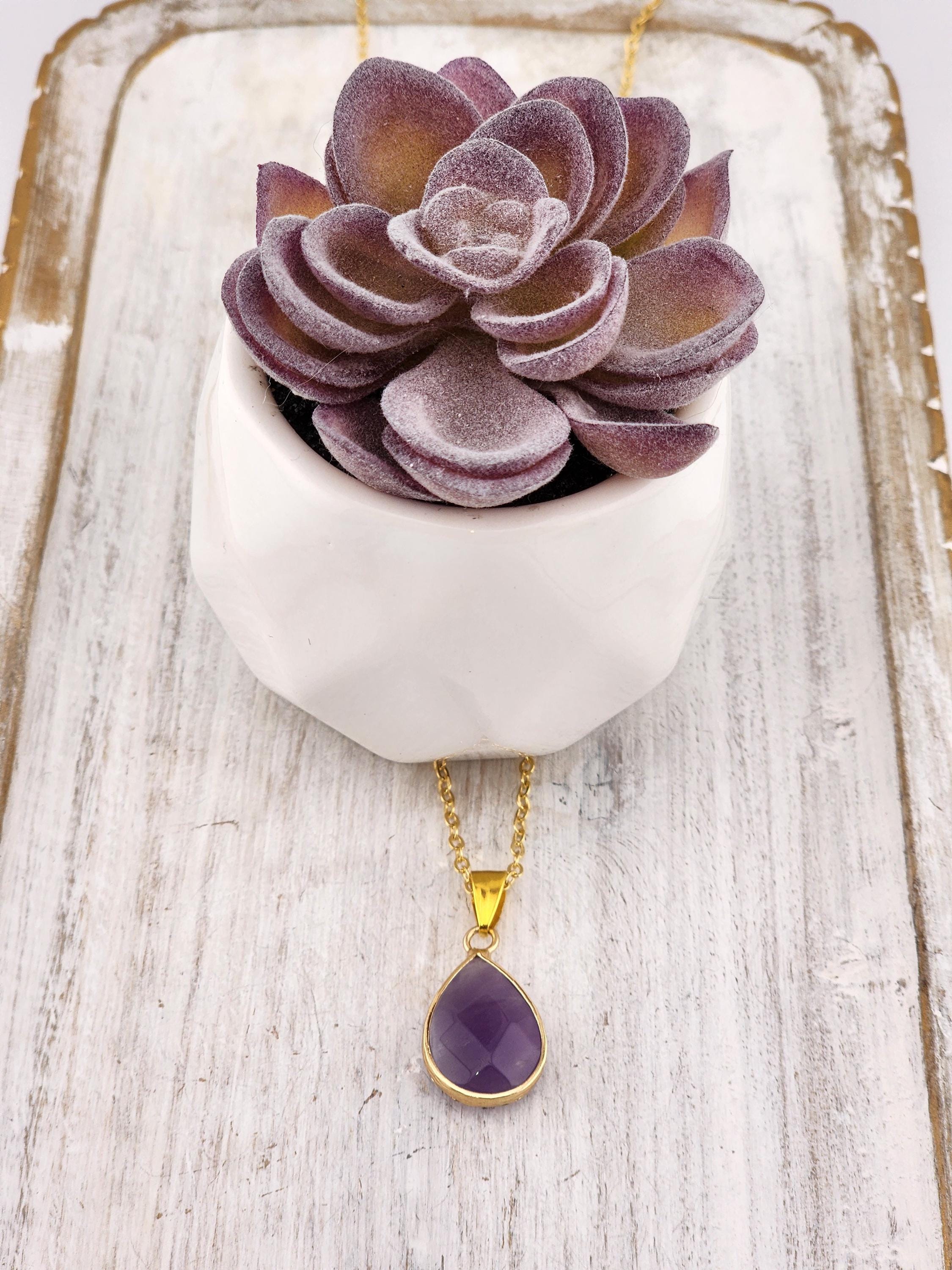 I made this necklace using elegant tarnish resistant 18k gold plated chain. It has a pretty 18k gold plated brass hook style clasp with 24k gold plated connecting rings. The pendant is a faceted teardrop shape purple amethyst crystal. * Your purchase will arrive in pretty packaging * Shipping is included