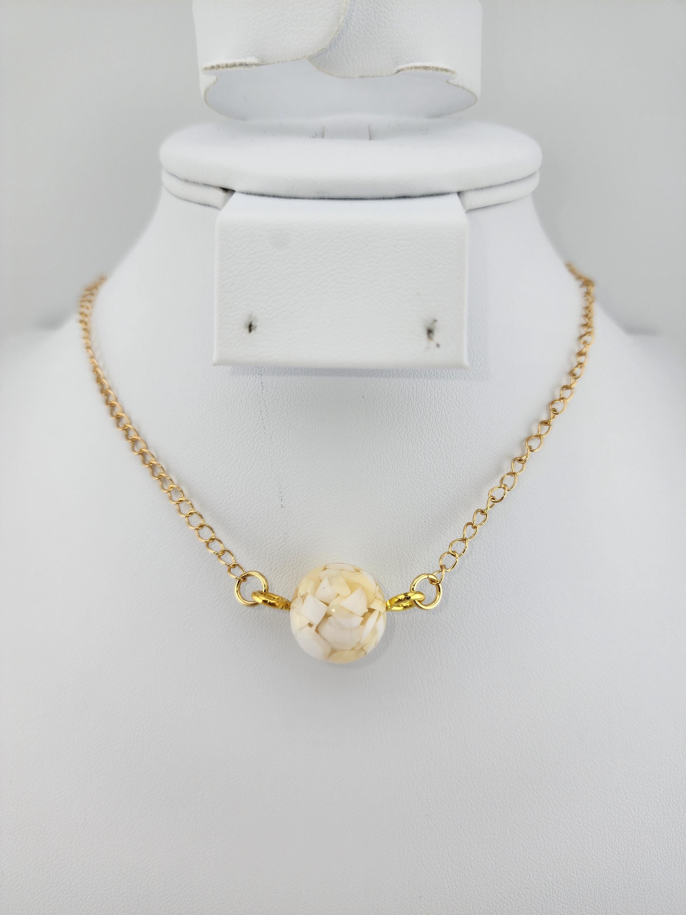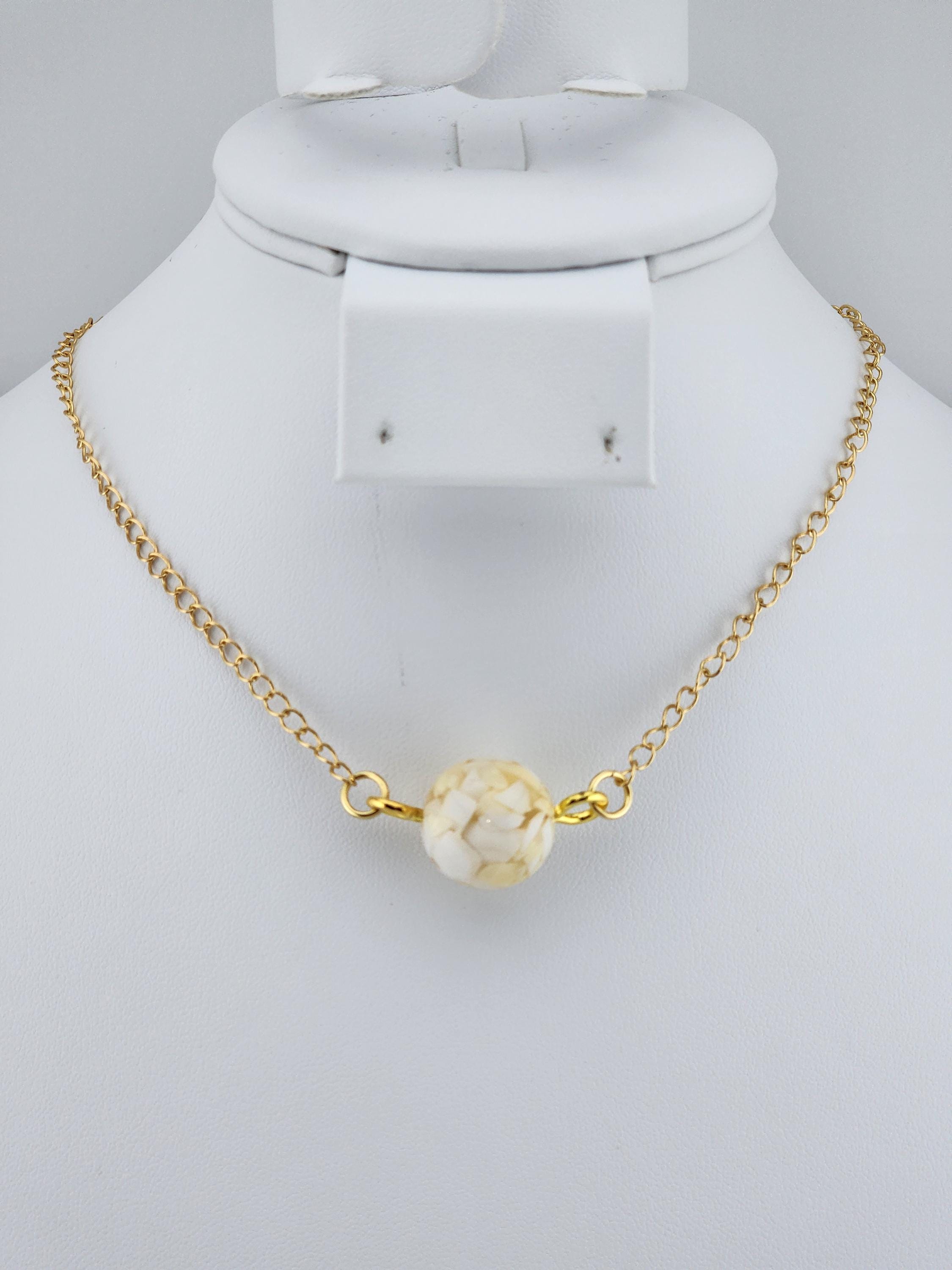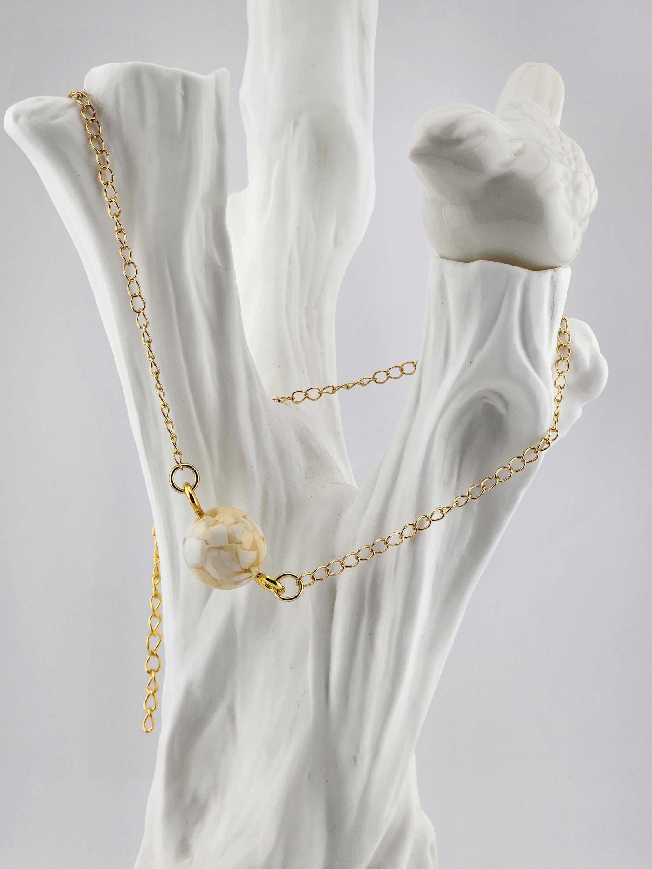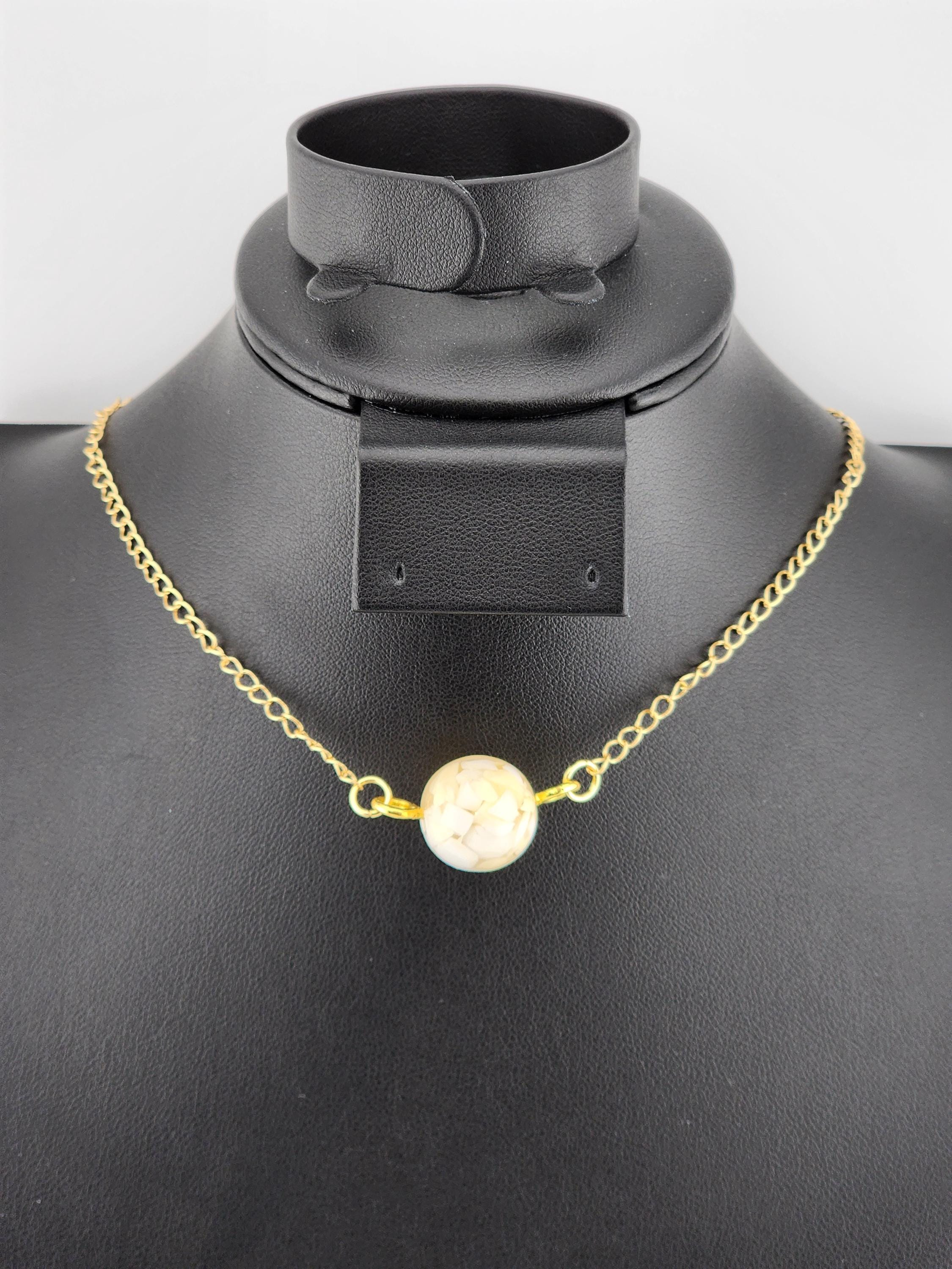 I made this choker necklace using delicate tarnish resistant 18k yellow gold chain. There is a resin abstract sphere pendant that has floating yellow and white pieces inside. It hangs from 24k gold plated connecting rings. The choker is 14.5" in length and has a 2" extender making it adjustable. * Your purchase will arrive in pretty packaging * Shipping is free within the U.S.