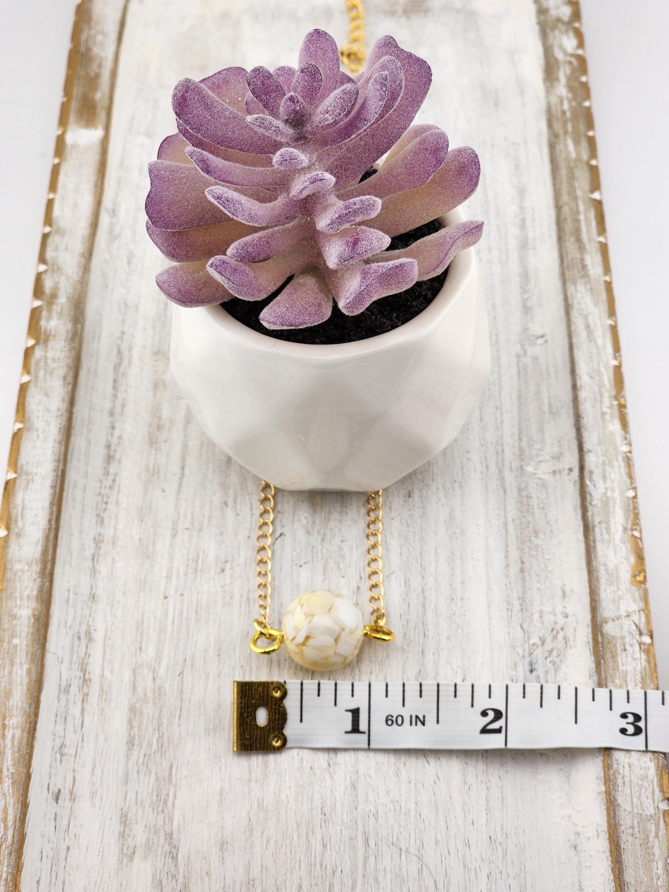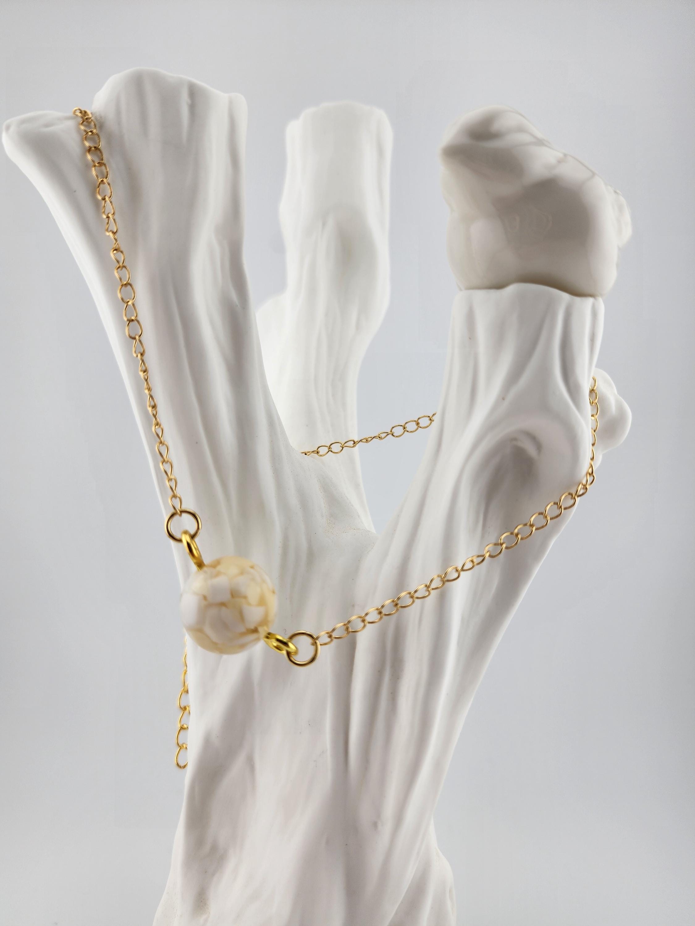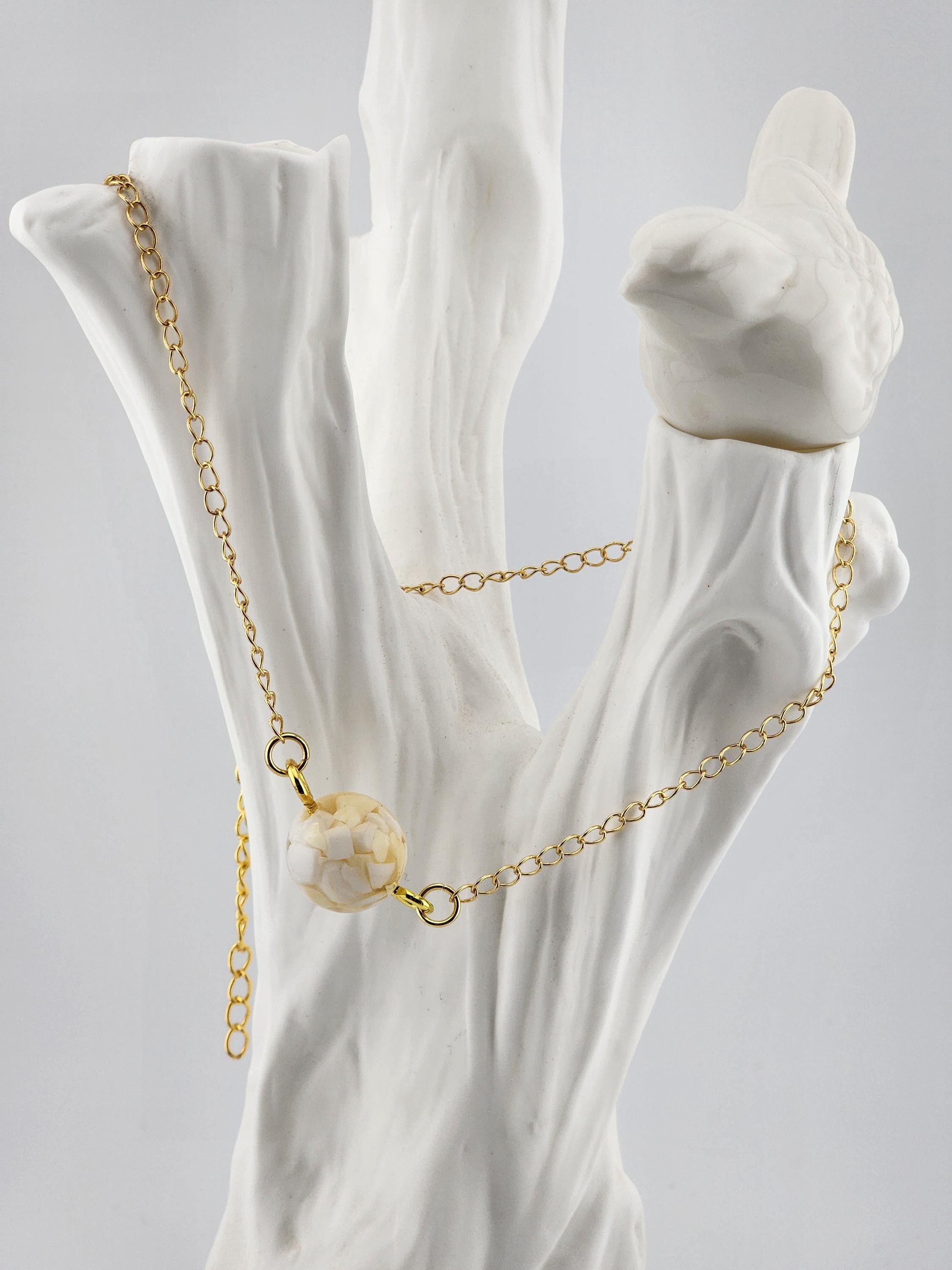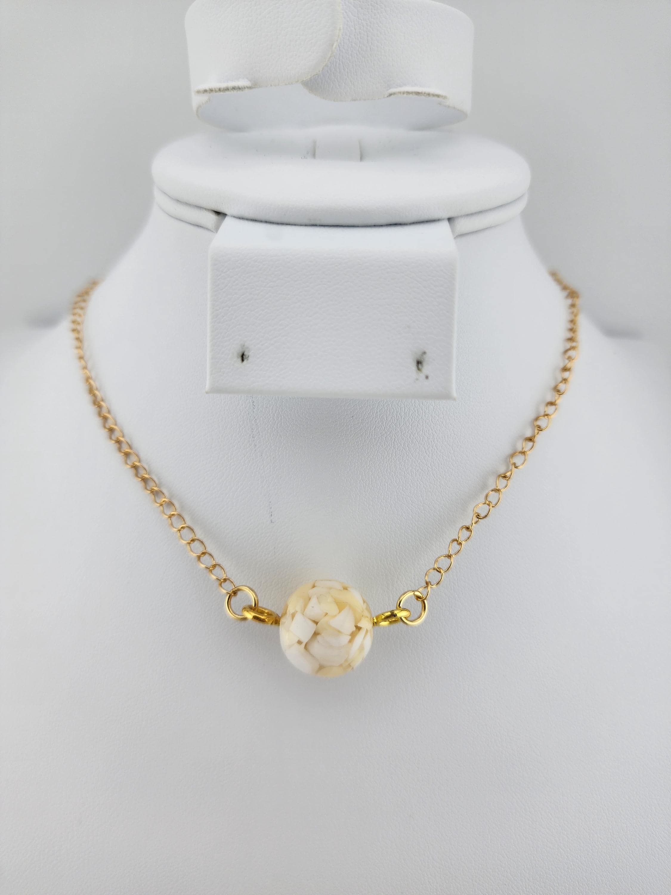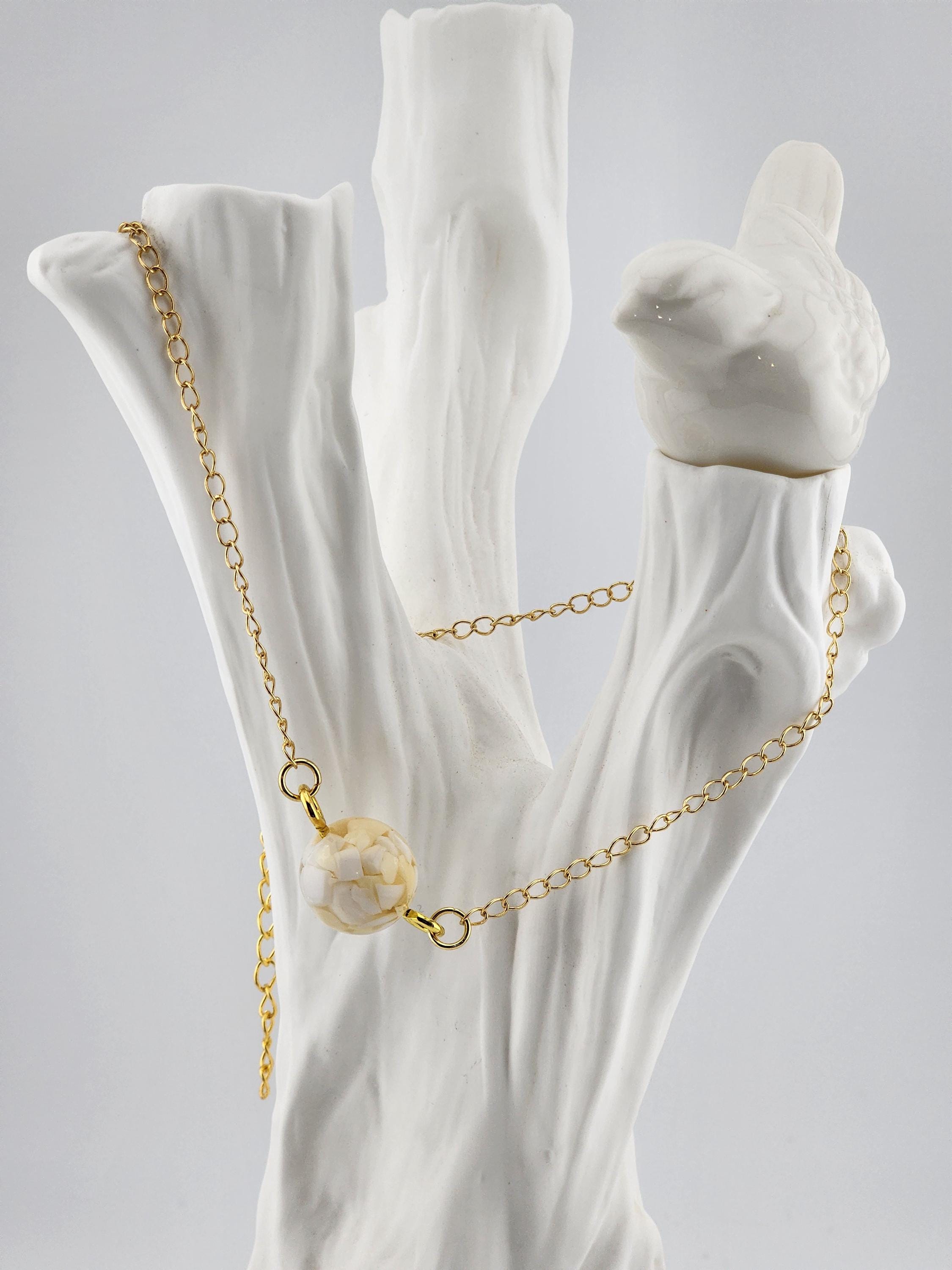 I made this choker necklace using delicate tarnish resistant 18k yellow gold chain. There is a resin abstract sphere pendant that has floating yellow and white pieces inside. It hangs from 24k gold plated connecting rings. The choker is 14.5" in length and has a 2" extender making it adjustable. * Your purchase will arrive in pretty packaging * Shipping is free within the U.S.