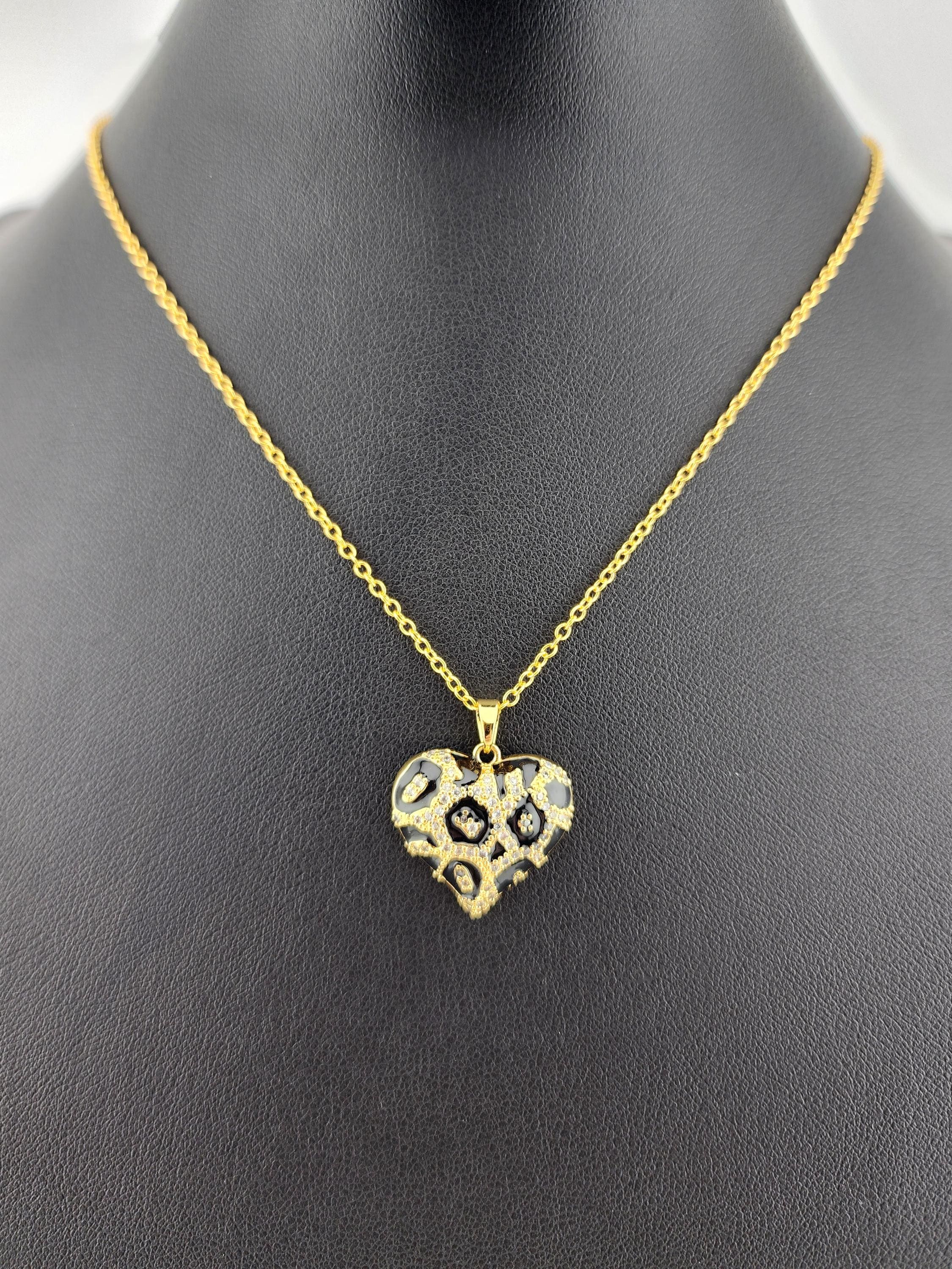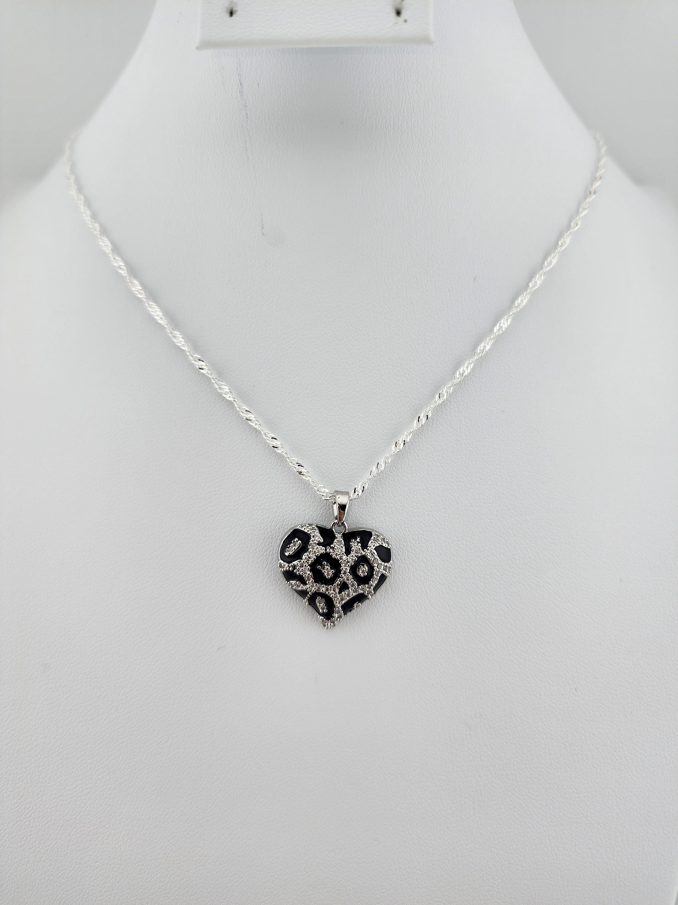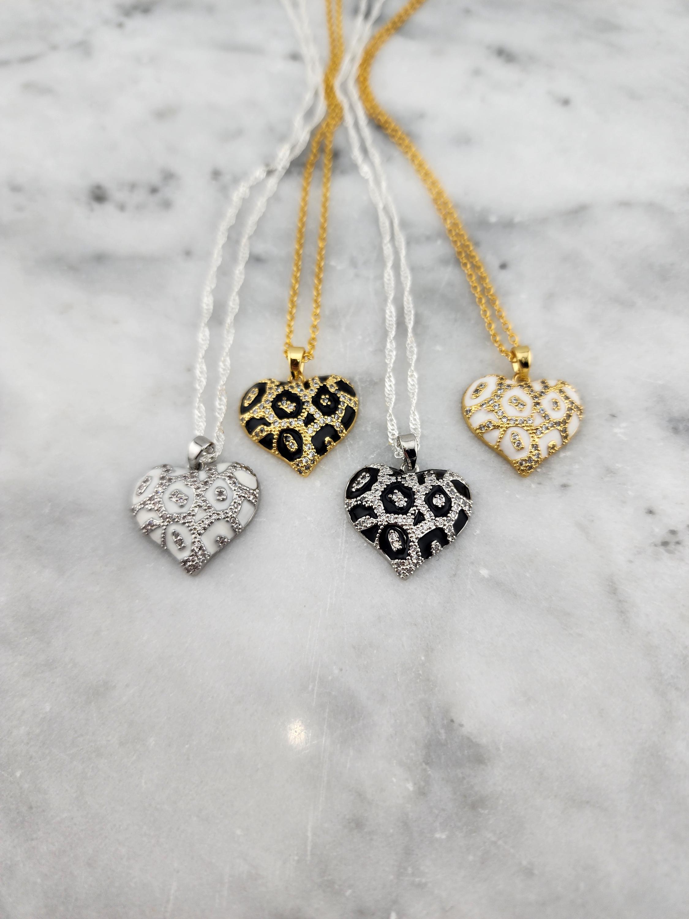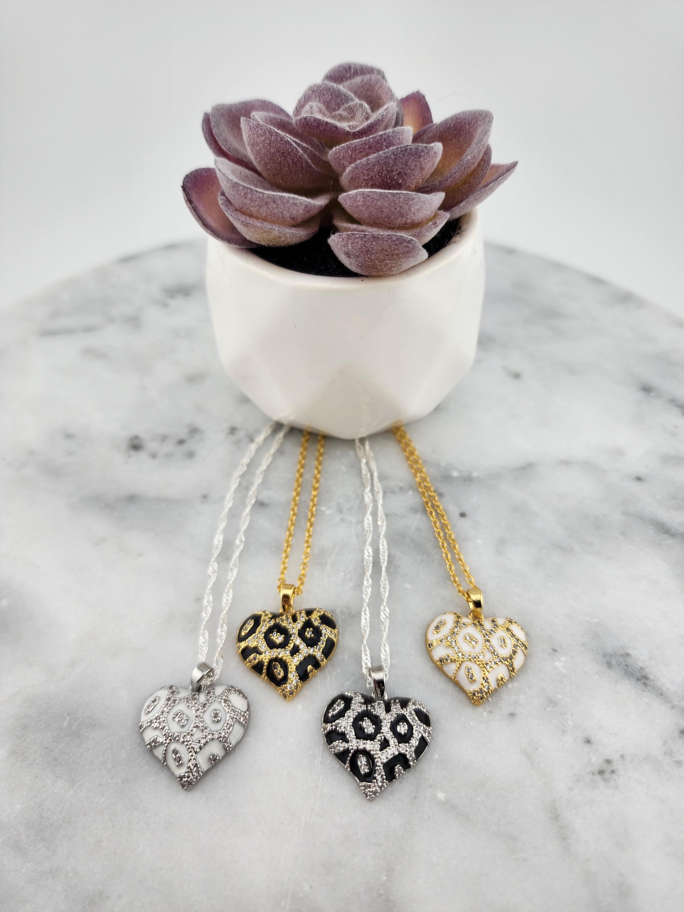 I made these necklaces giving you multiple styles of leopard print and pave' cubic zirconia puffy brass heart pendants and chain necklace types to choose from. Each necklace has an extender making them adjustable from 20" to 22" in length. They are a perfect LOVE DAY gift for whenever that occasion may be for you. YOUR CHOICES ARE: #1- white on silver, with twisted sterling silver chain #2- black on gold, with gold over sterling silver chain #3- black on silver, with twisted sterling silver chain #4- white on gold, with gold over sterling silver chain * Your purchase will arrive in pretty packaging * Shipping is included