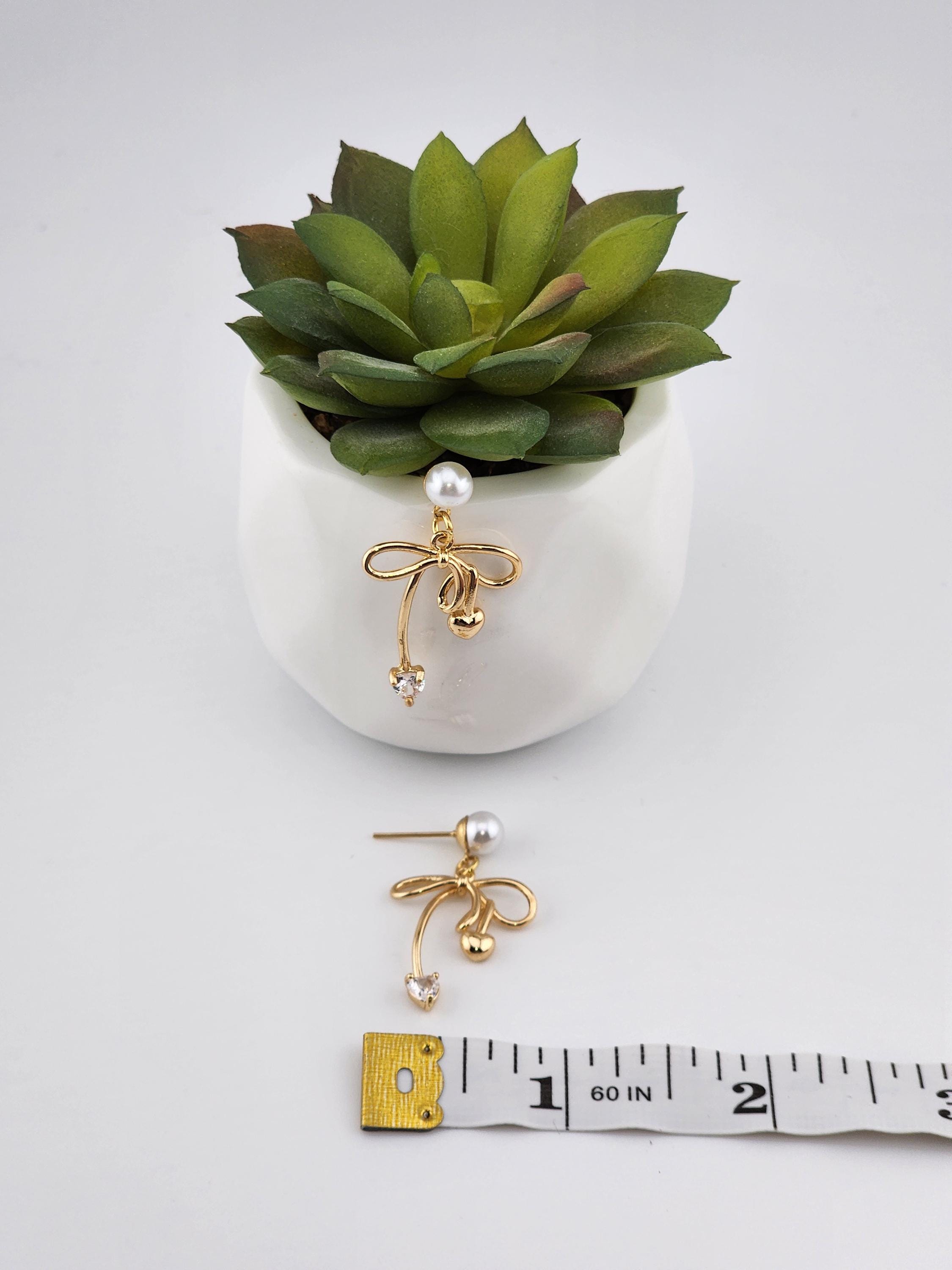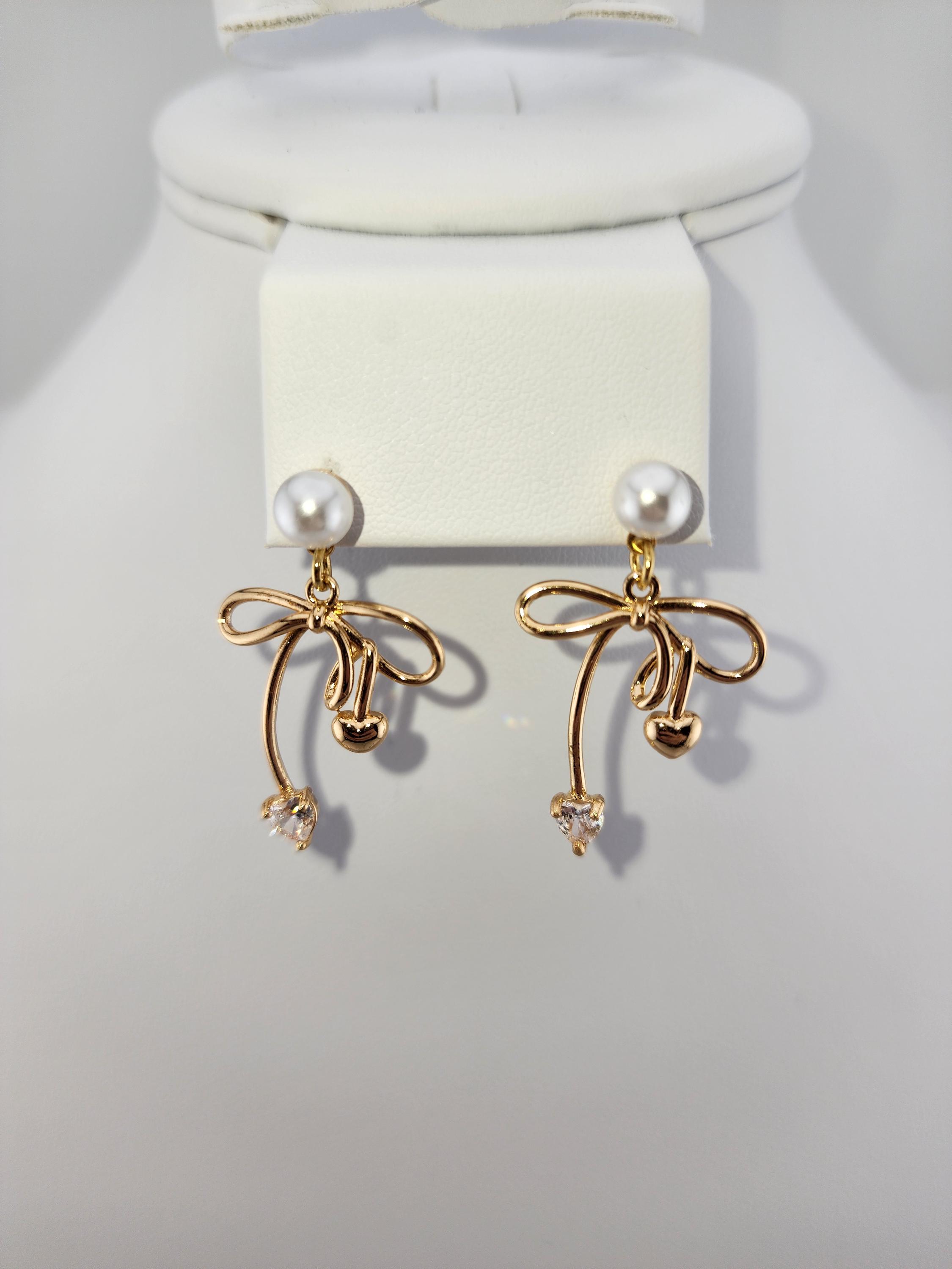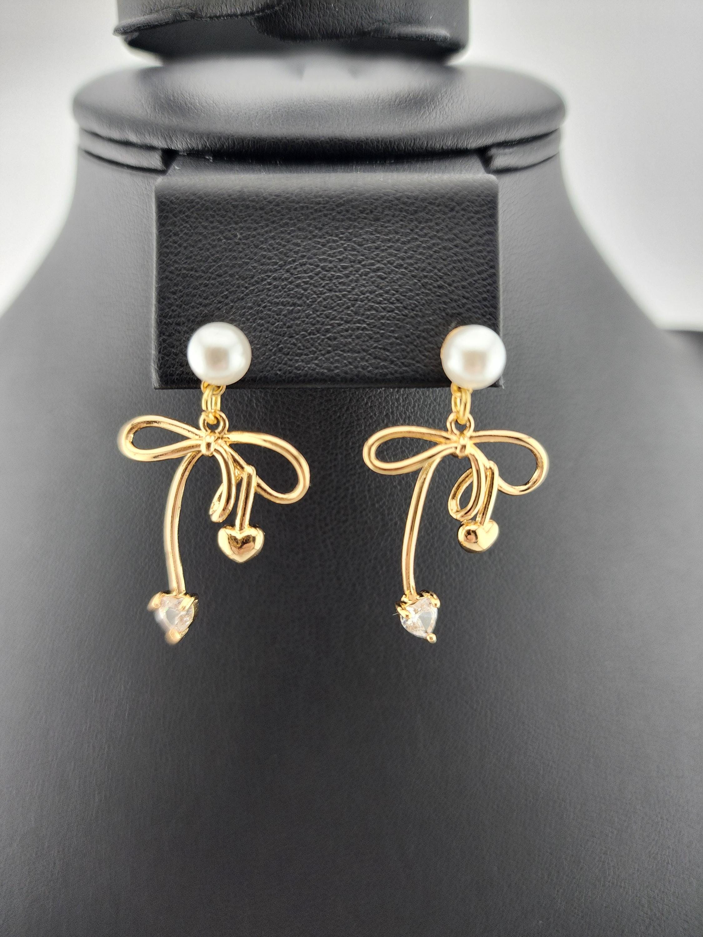 These earrings were made using white imitation pearl posts with hypoallergenic surgical steel studs. From each hang elegant tarnish resistant 14k gold filled brass bowknot charms that have one gold heart at one end and one faceted heart shape sparkly cubic zirconia crystal at the other end. They hang from 18k gold filled connecting rings. * Your purchase will arrive in pretty packaging * Shipping is included