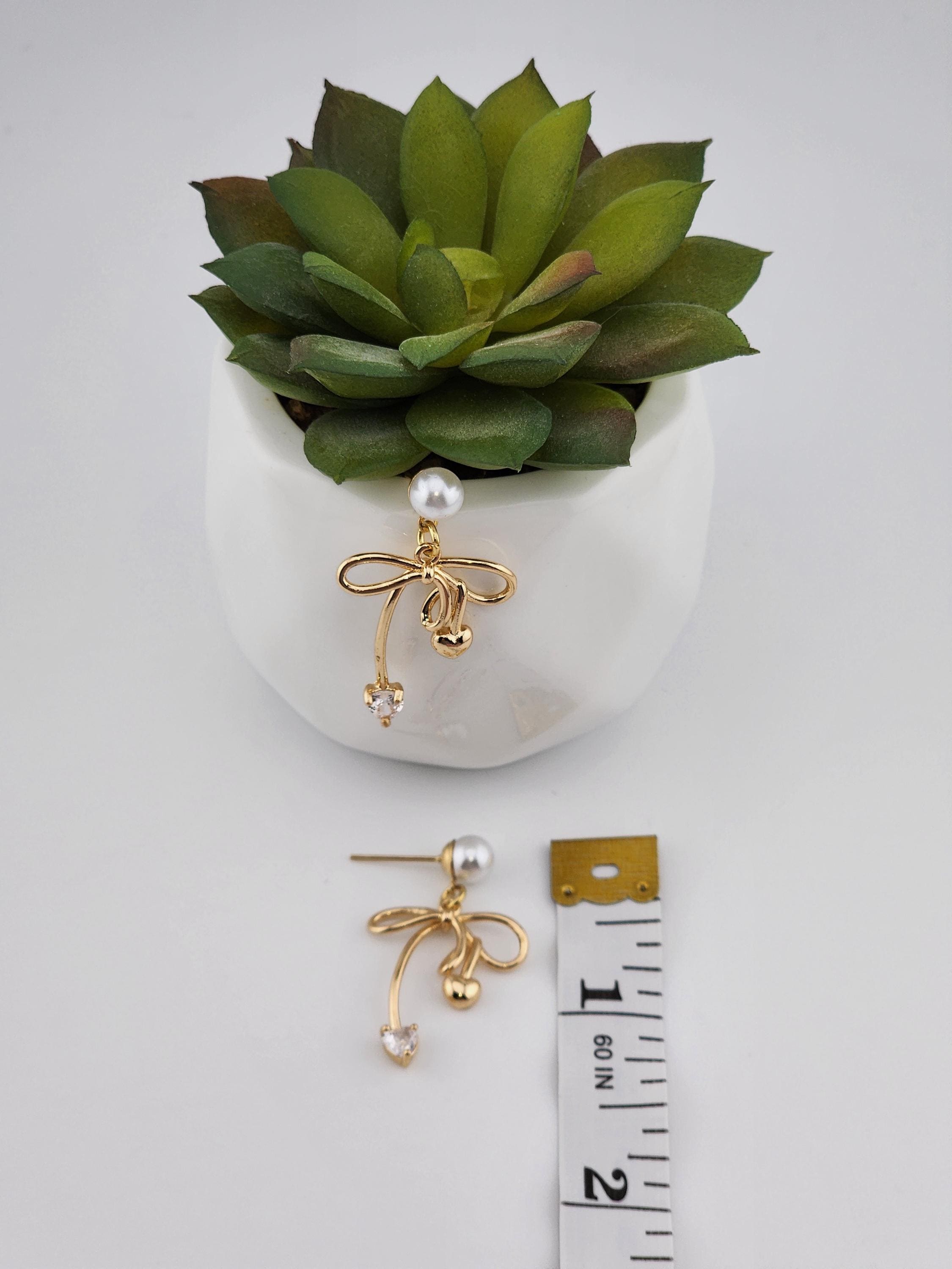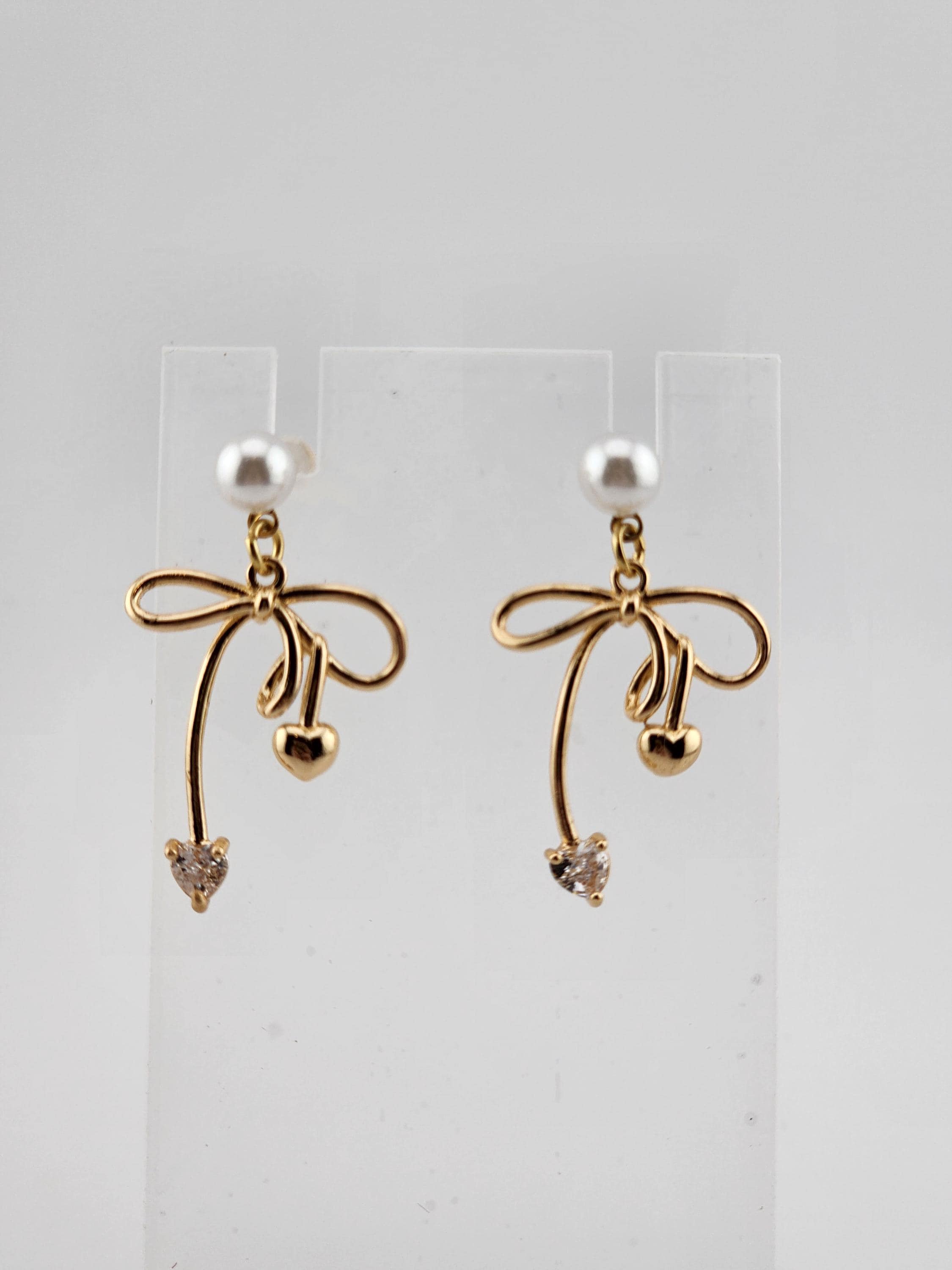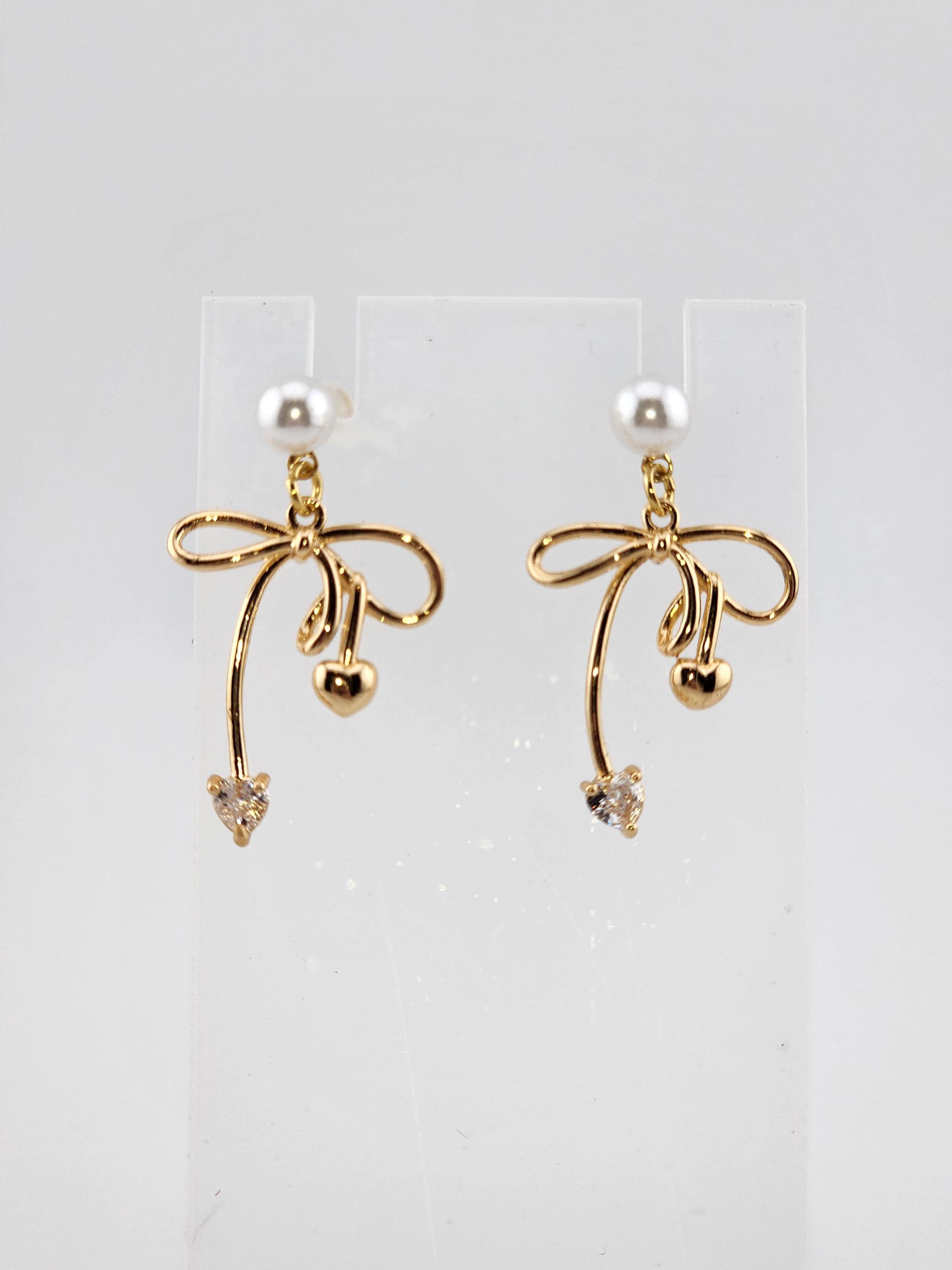 These earrings were made using white imitation pearl posts with hypoallergenic surgical steel studs. From each hang elegant tarnish resistant 14k gold filled brass bowknot charms that have one gold heart at one end and one faceted heart shape sparkly cubic zirconia crystal at the other end. They hang from 18k gold filled connecting rings. * Your purchase will arrive in pretty packaging * Shipping is included