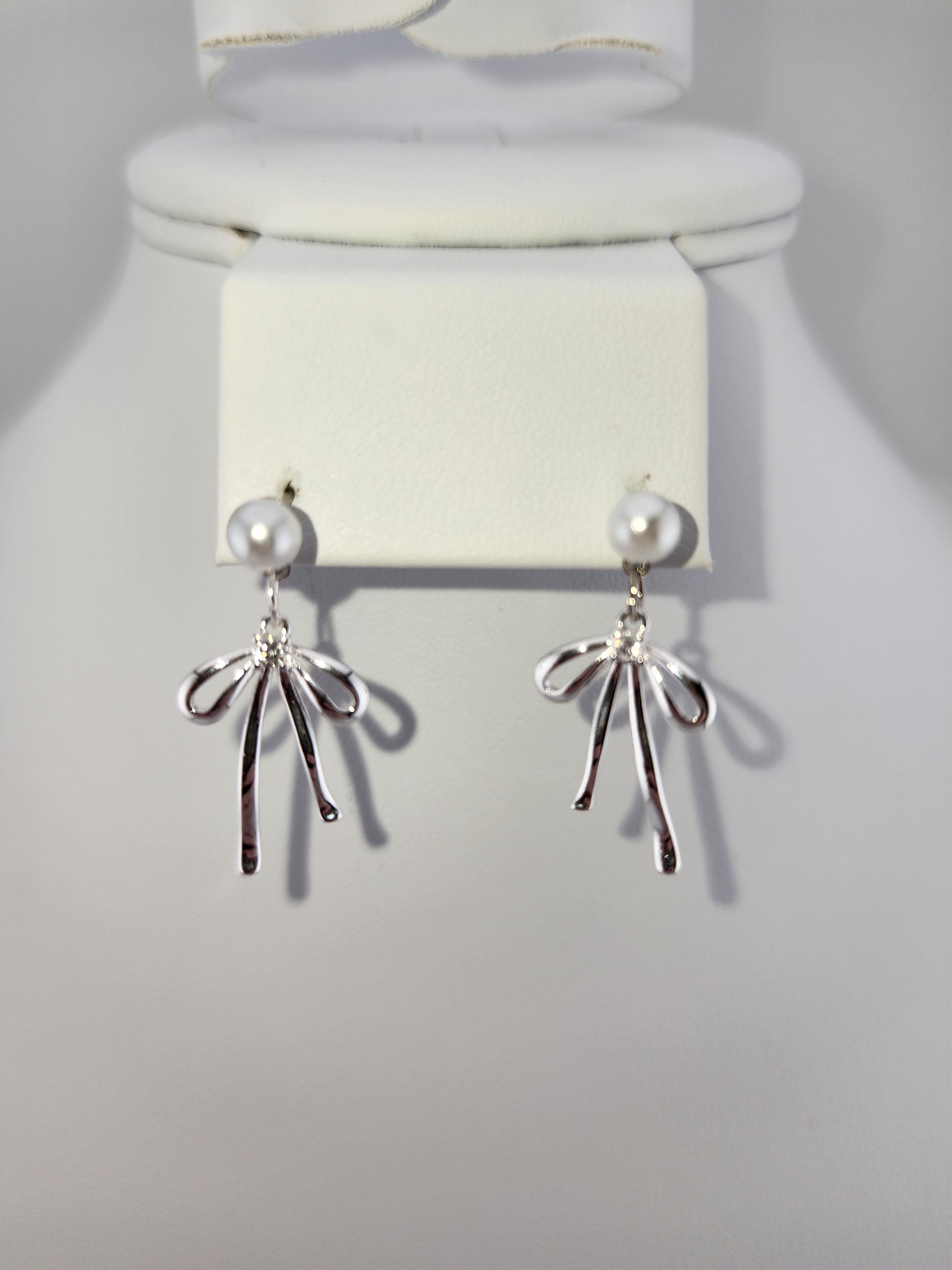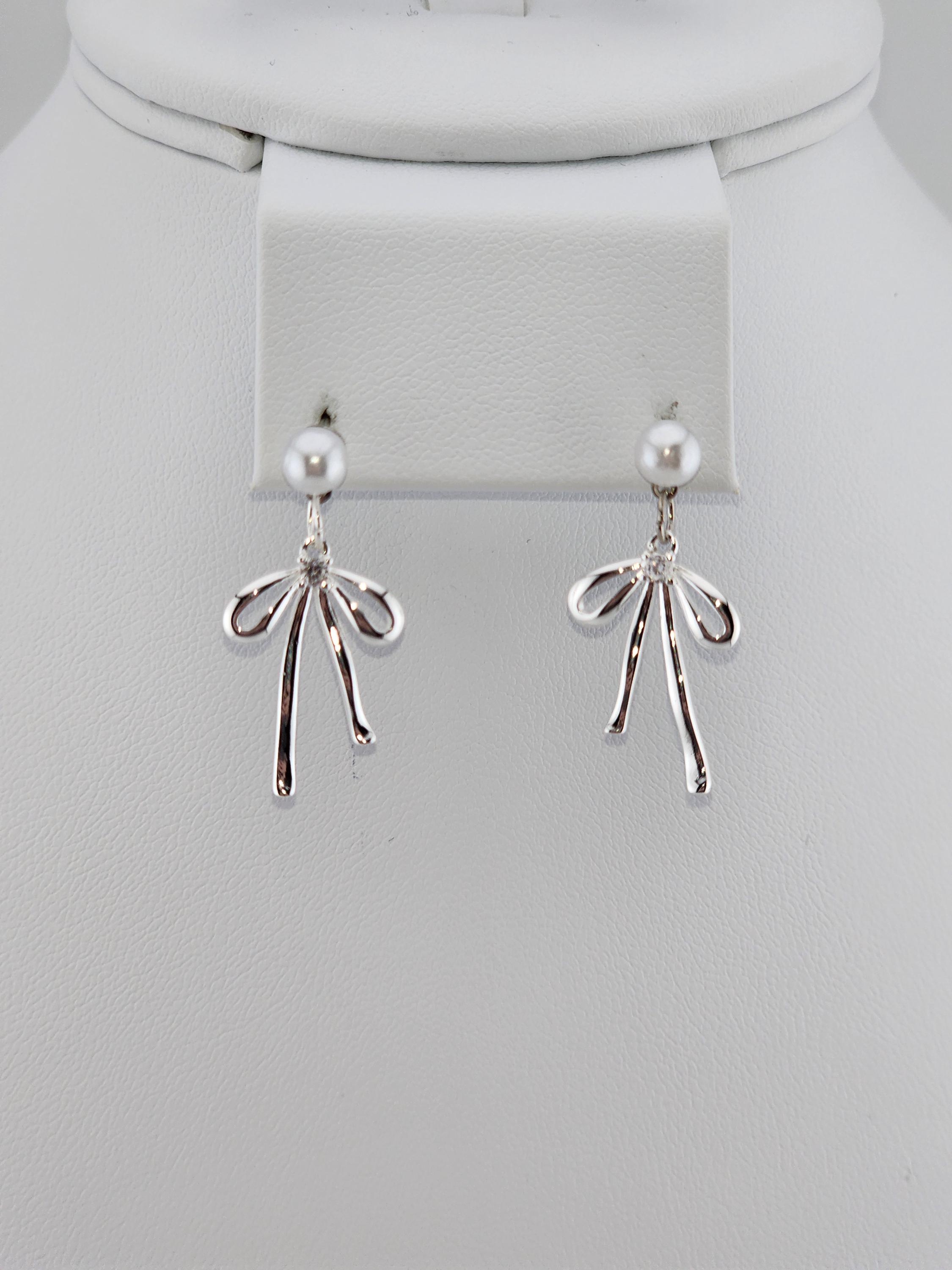 These earrings are made using faux white pearl studs with hypoallergenic pins. From each are platinum plated brass bowknot and cubic zirconia crystal charms that hang from sterling silver connecting rings. * Your purchase will arrive in pretty packaging