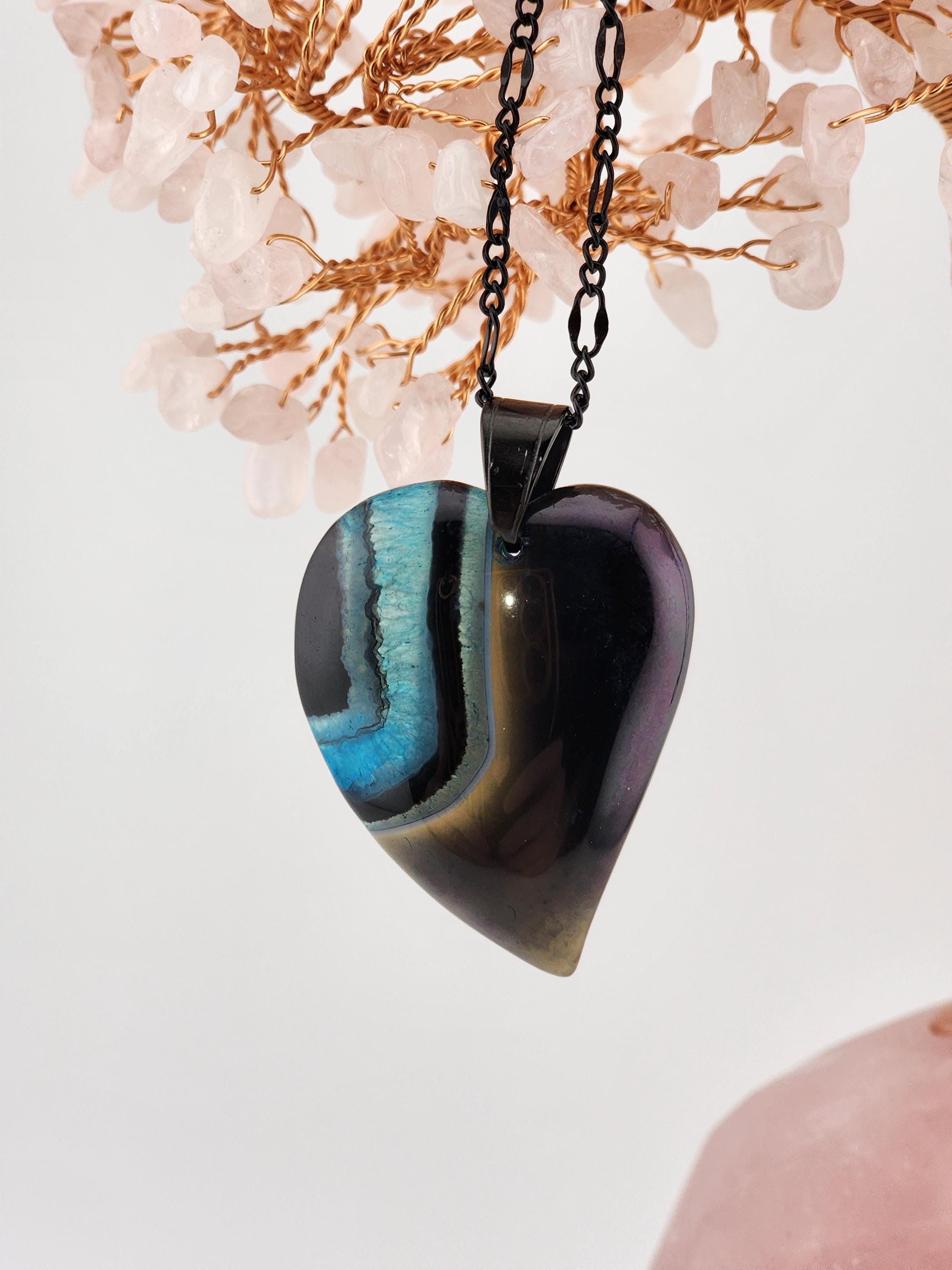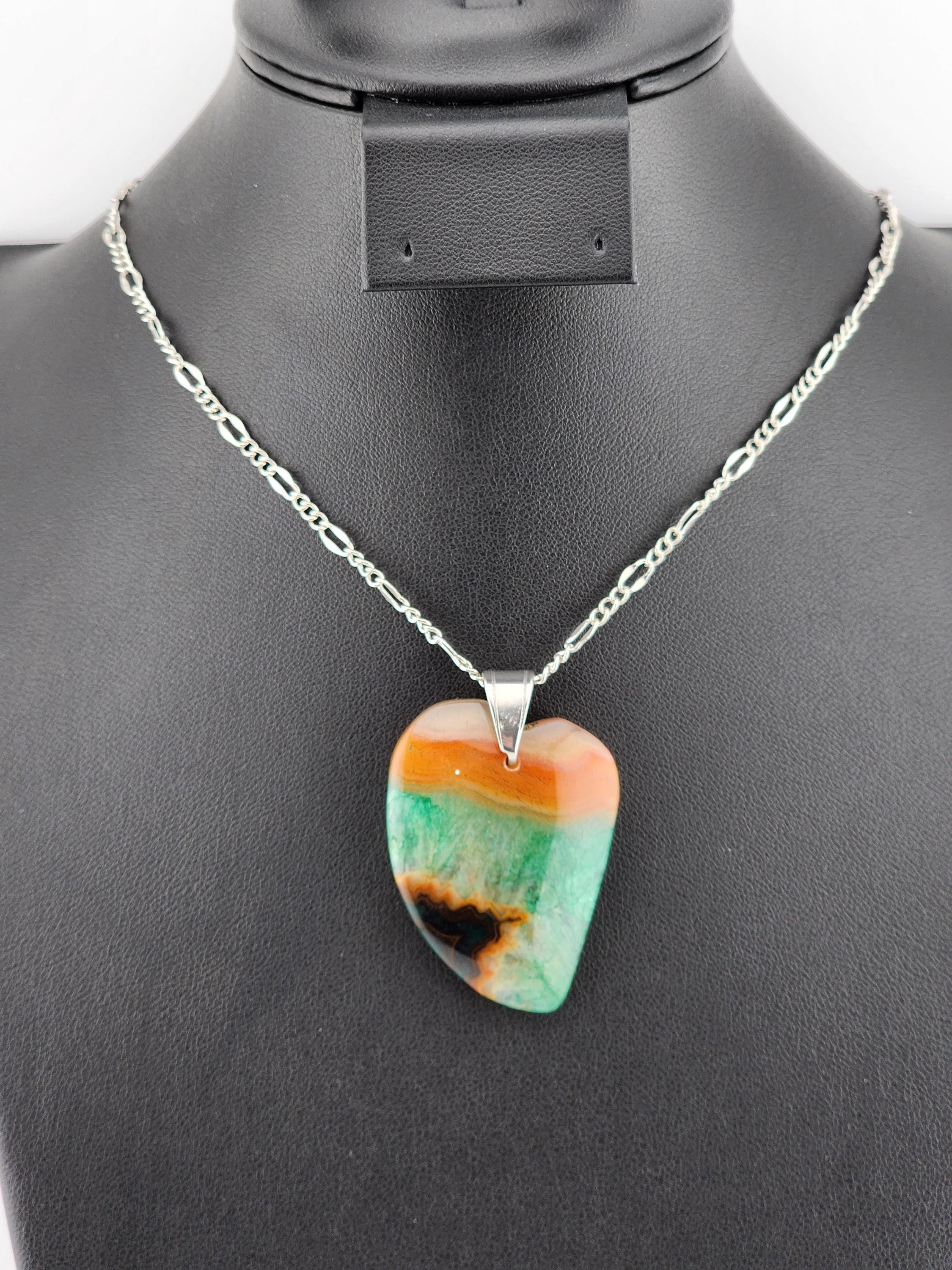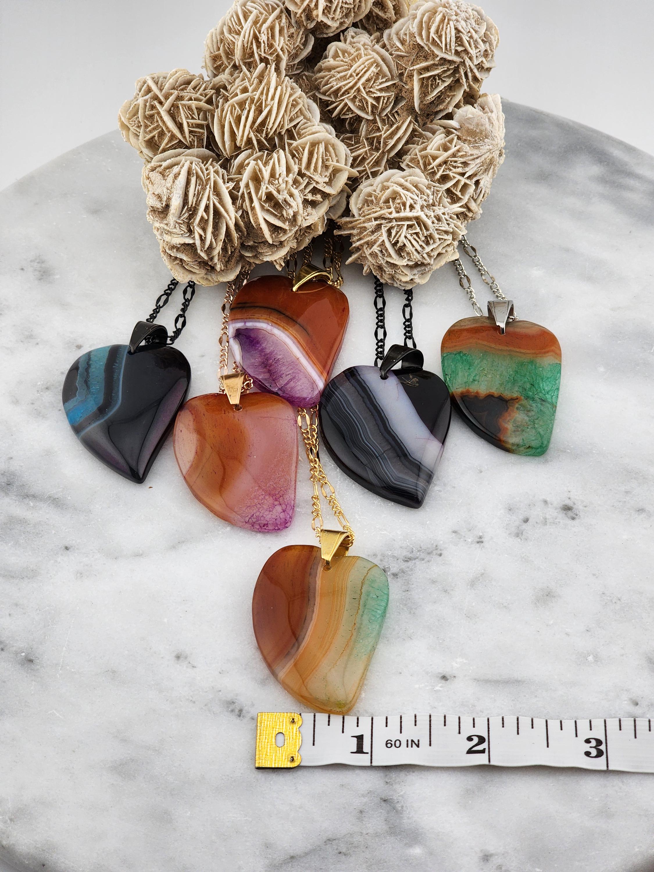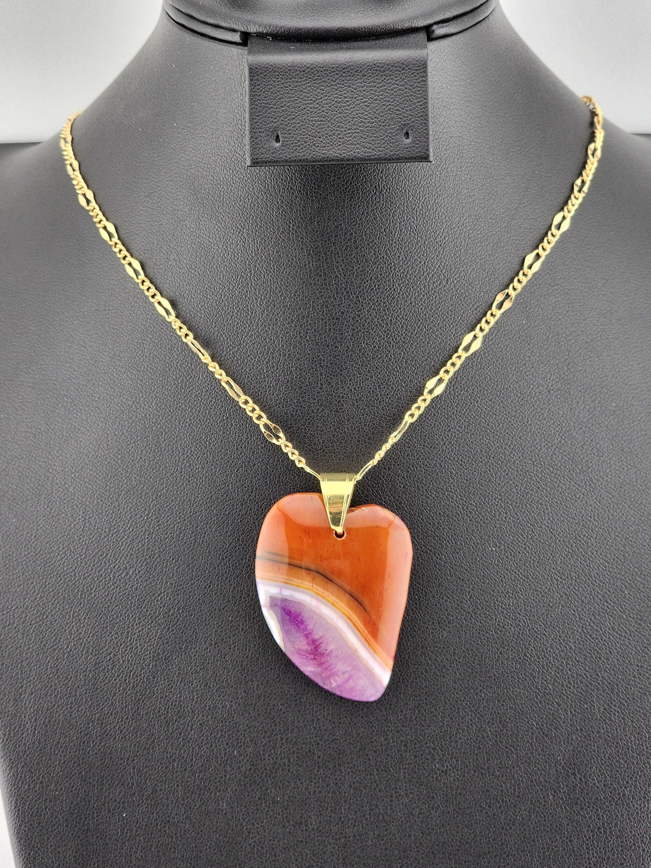 I made each of these necklaces using different color stainless steel chain with extenders that make them adjustable from 22"-24" in length. Each have a different large gradient color crystal stone heart pendant. YOUR CHOICES ARE OF PENDANTS ARE: #1- Blue/Black on a black necklace #2- Orange/Pink/Purple on a rose gold necklace #3- Orange/Yellow/Green on a gold necklace #4- Orange/Green/Black on a silver necklace #5- Orange/Purple on a gold necklace #6- Black/White on a black necklace These boho necklaces are perfect for Valentine's Day or for any occasion. * YOUR PURCHASE WILL ARRIVE IN PRETTY PACKAGING * SIZE: Size:40x30mm. ✨Natural gemstones or semi precious stones come from minerals. Because these hearts are natural, the stones may have tiny flaws. Meanwhile, cutting or polishing also makes every piece of gemstone vary in color and size.