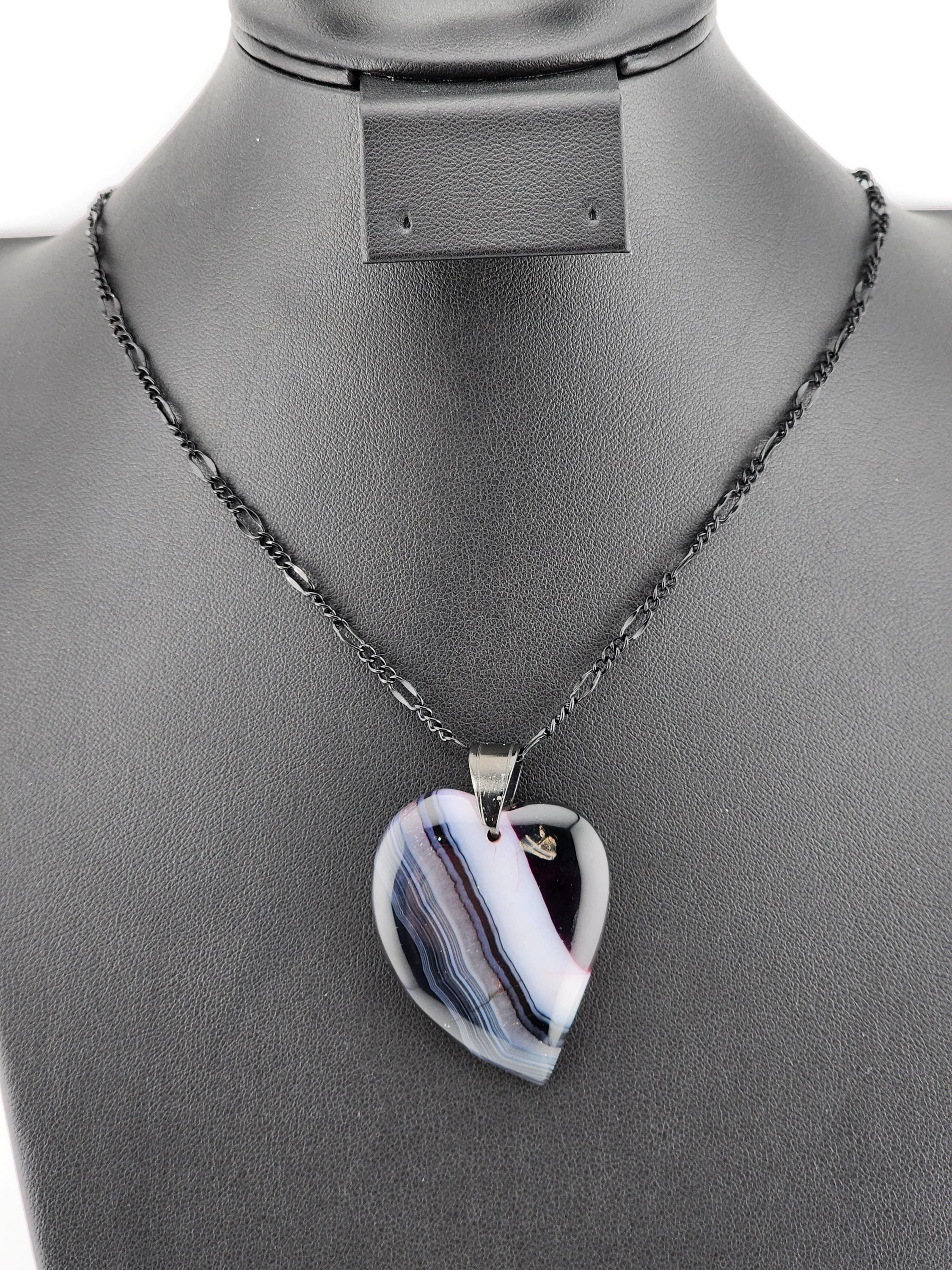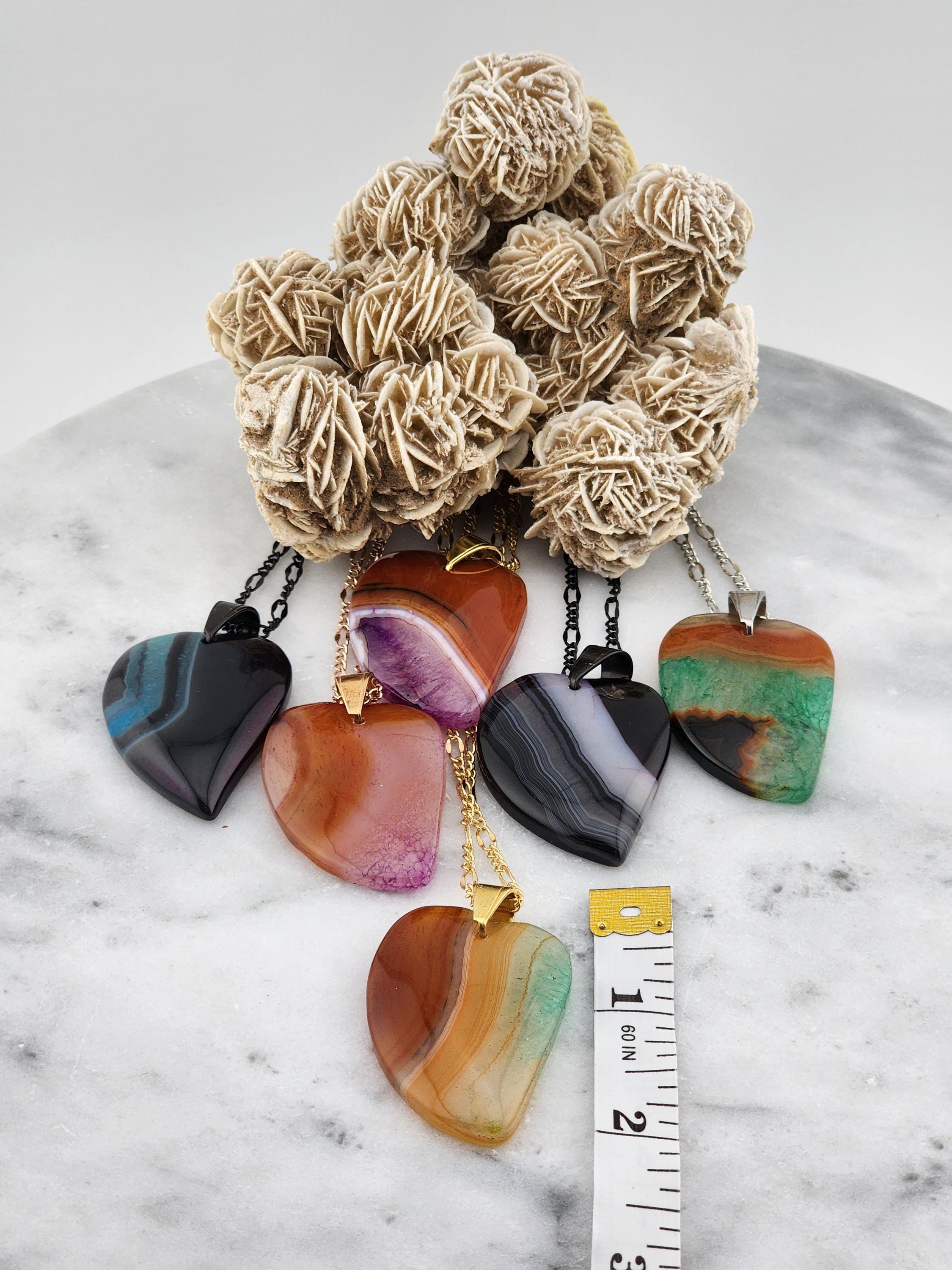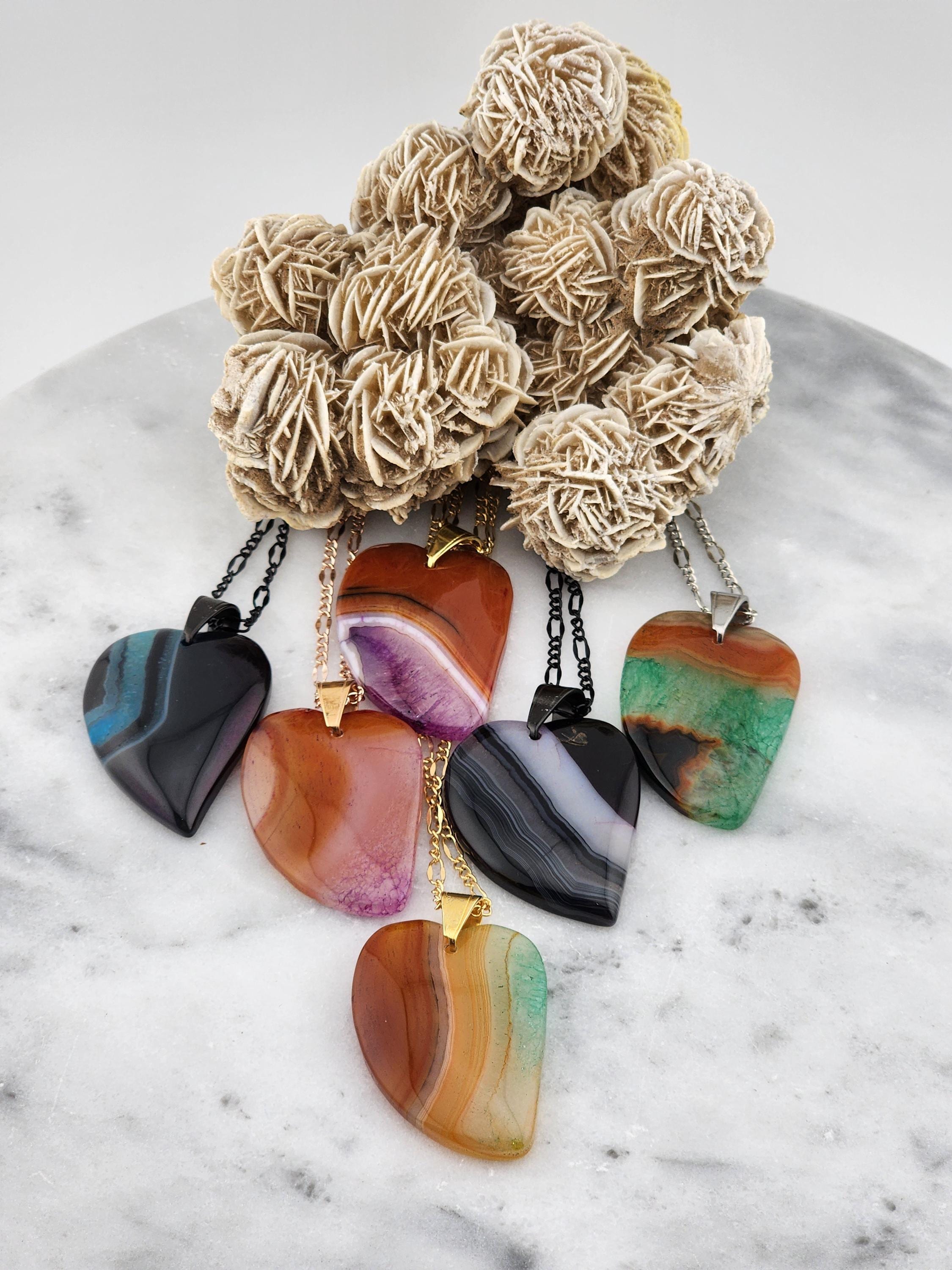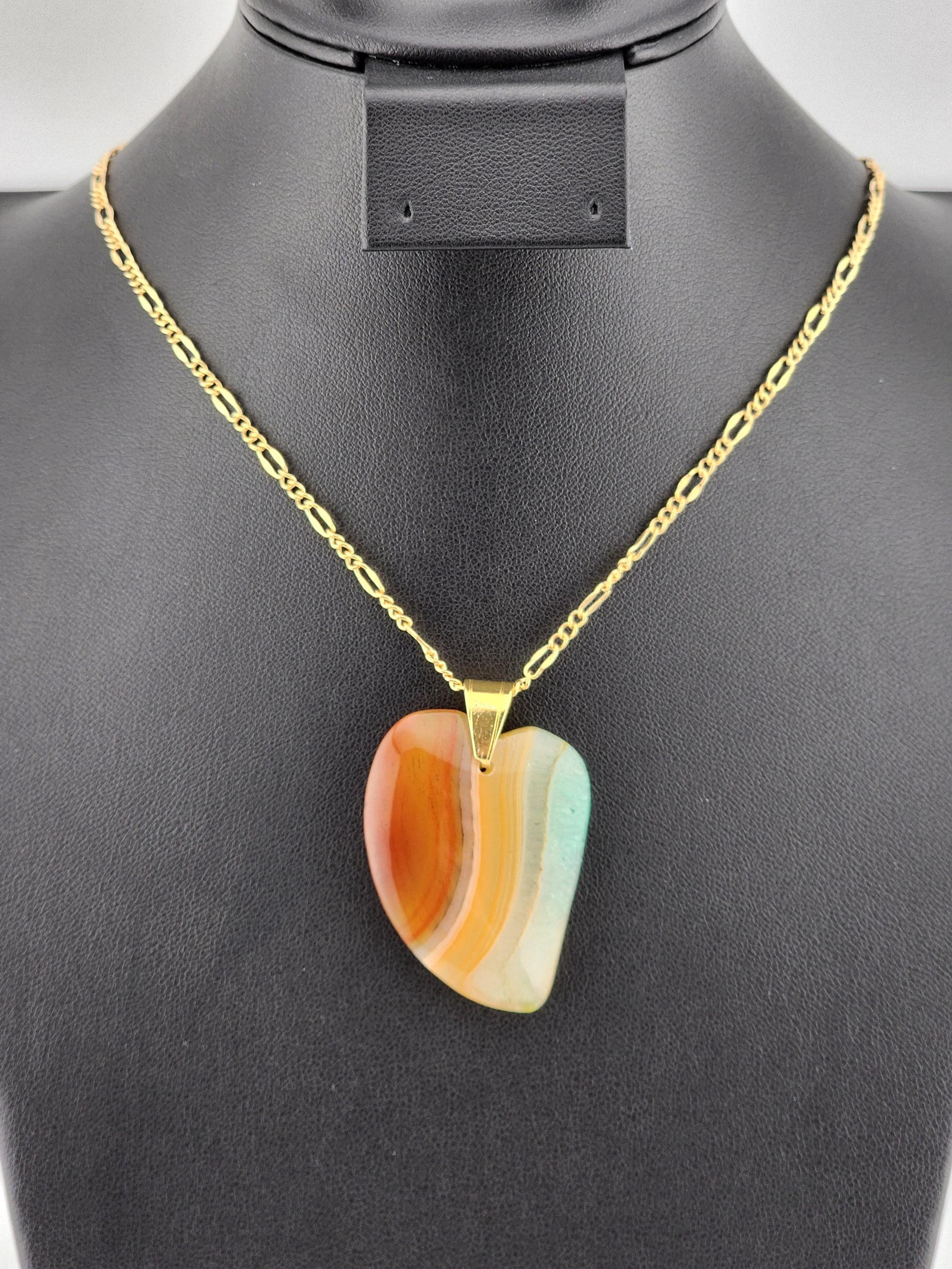 I made each of these necklaces using different color stainless steel chain with extenders that make them adjustable from 22"-24" in length. Each have a different large gradient color crystal stone heart pendant. YOUR CHOICES ARE OF PENDANTS ARE: #1- Blue/Black on a black necklace #2- Orange/Pink/Purple on a rose gold necklace #3- Orange/Yellow/Green on a gold necklace #4- Orange/Green/Black on a silver necklace #5- Orange/Purple on a gold necklace #6- Black/White on a black necklace These boho necklaces are perfect for Valentine's Day or for any occasion. * YOUR PURCHASE WILL ARRIVE IN PRETTY PACKAGING * SIZE: Size:40x30mm. ✨Natural gemstones or semi precious stones come from minerals. Because these hearts are natural, the stones may have tiny flaws. Meanwhile, cutting or polishing also makes every piece of gemstone vary in color and size.