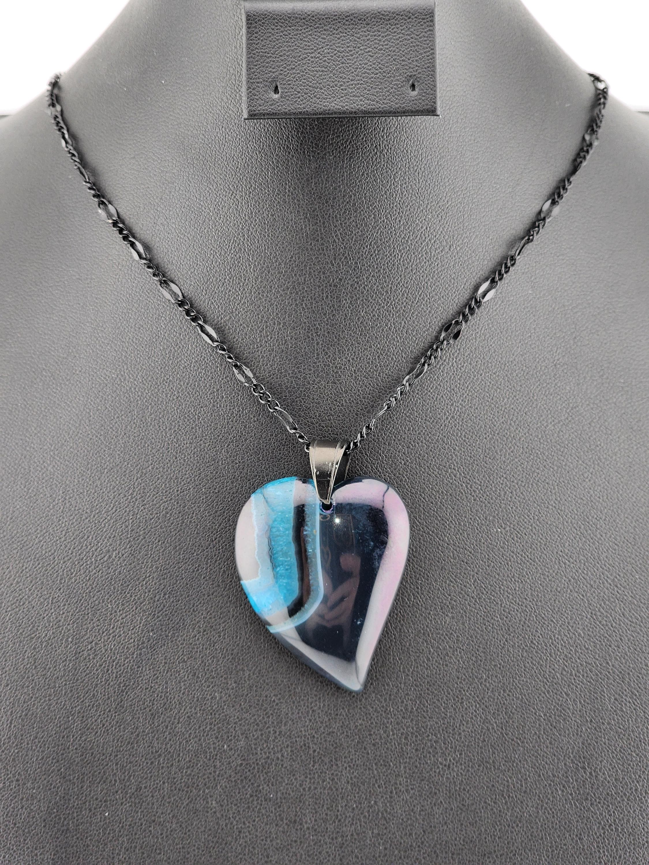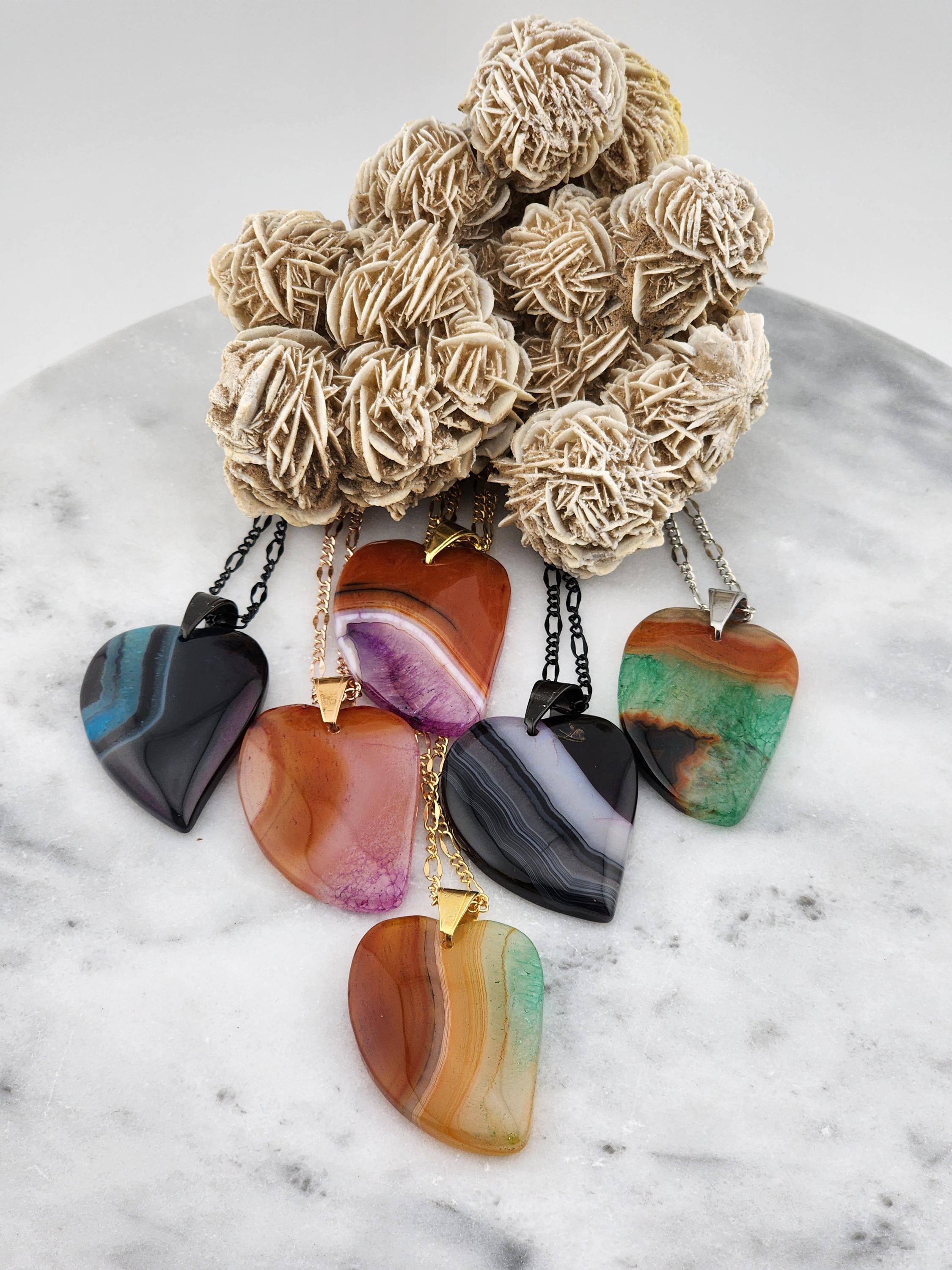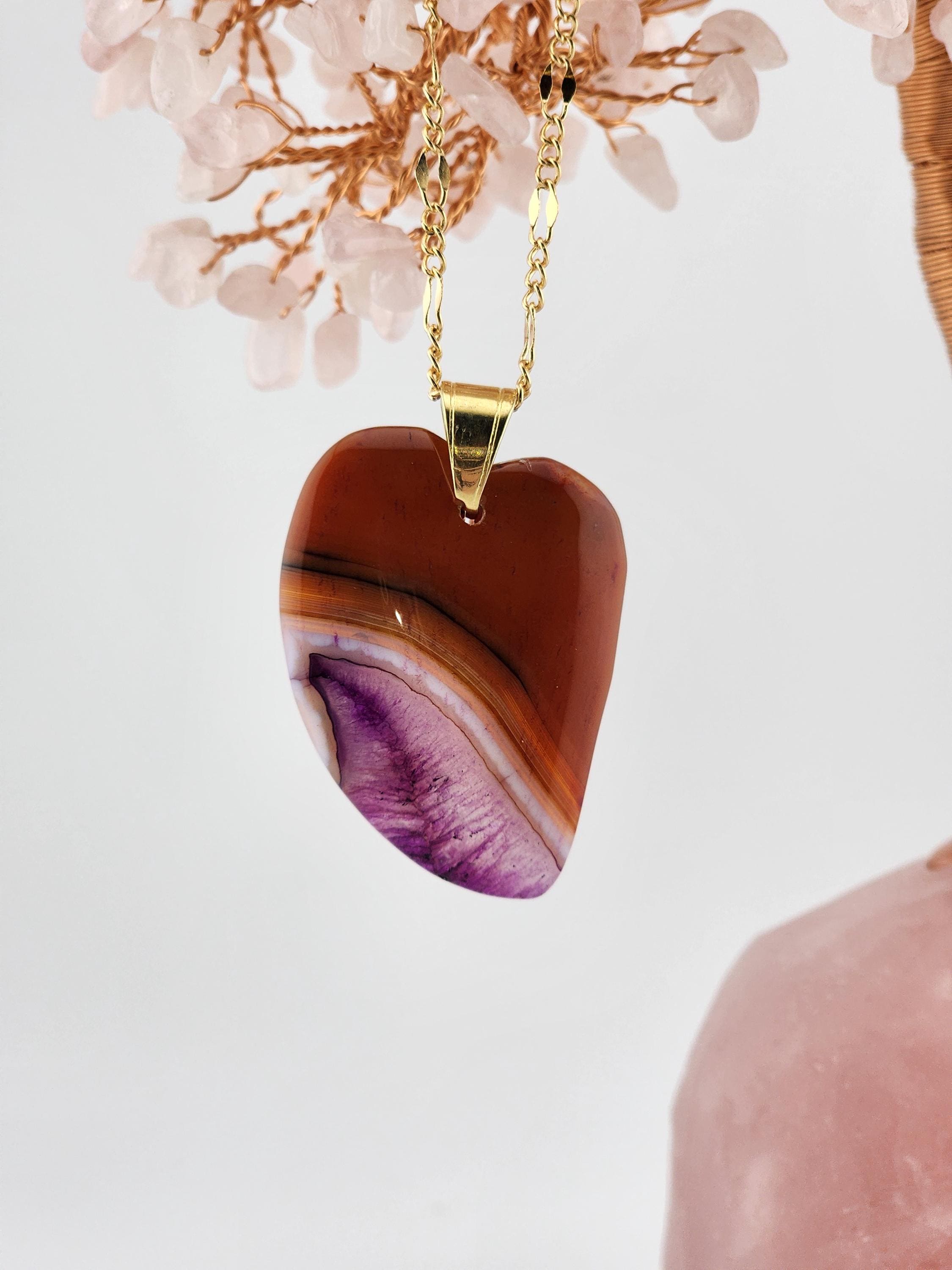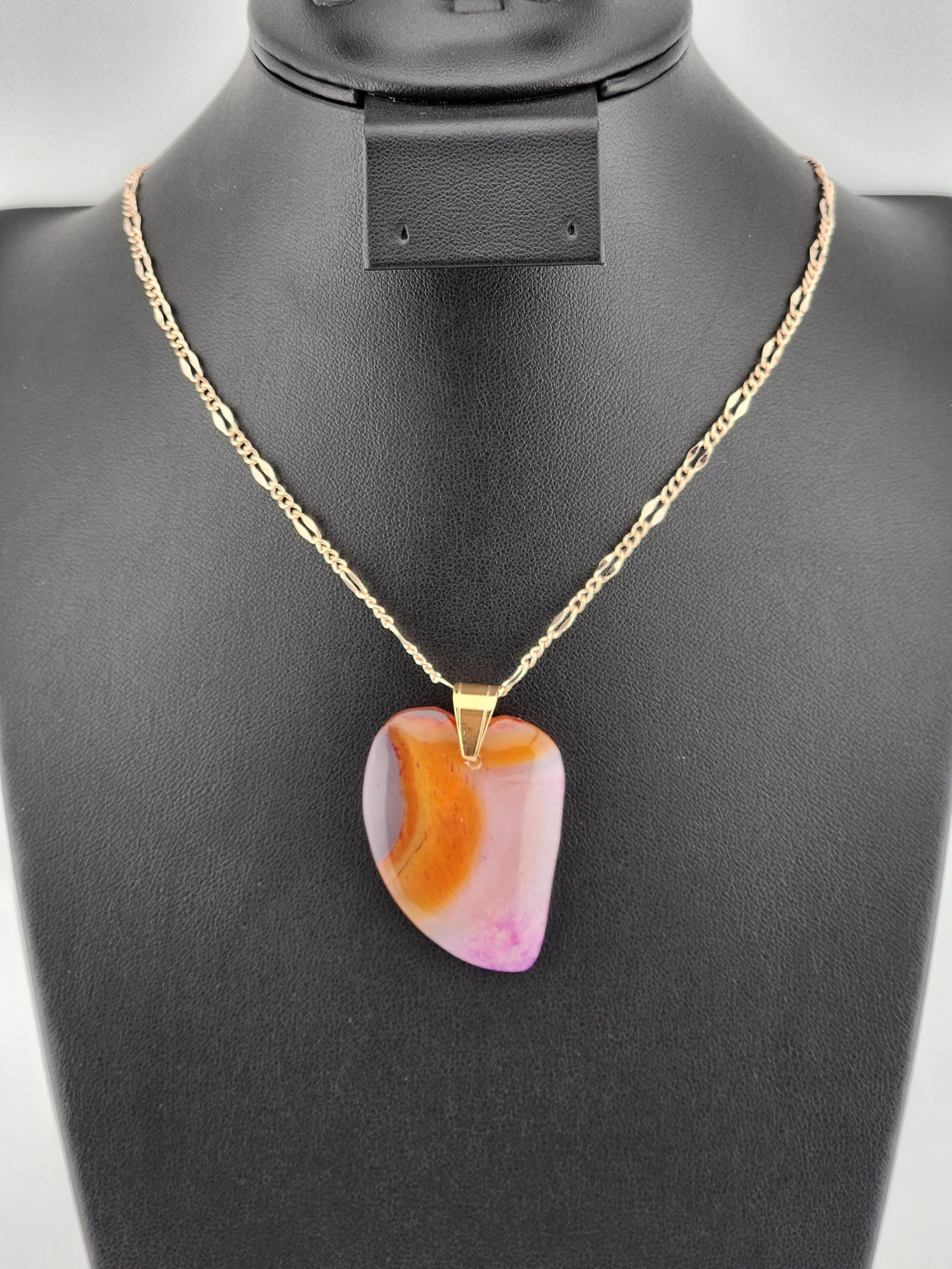 I made each of these necklaces using different color stainless steel chain with extenders that make them adjustable from 22"-24" in length. Each have a different large gradient color crystal stone heart pendant. YOUR CHOICES ARE OF PENDANTS ARE: #1- Blue/Black on a black necklace #2- Orange/Pink/Purple on a rose gold necklace #3- Orange/Yellow/Green on a gold necklace #4- Orange/Green/Black on a silver necklace #5- Orange/Purple on a gold necklace #6- Black/White on a black necklace These boho necklaces are perfect for Valentine's Day or for any occasion. * YOUR PURCHASE WILL ARRIVE IN PRETTY PACKAGING * SIZE: Size:40x30mm. ✨Natural gemstones or semi precious stones come from minerals. Because these hearts are natural, the stones may have tiny flaws. Meanwhile, cutting or polishing also makes every piece of gemstone vary in color and size.