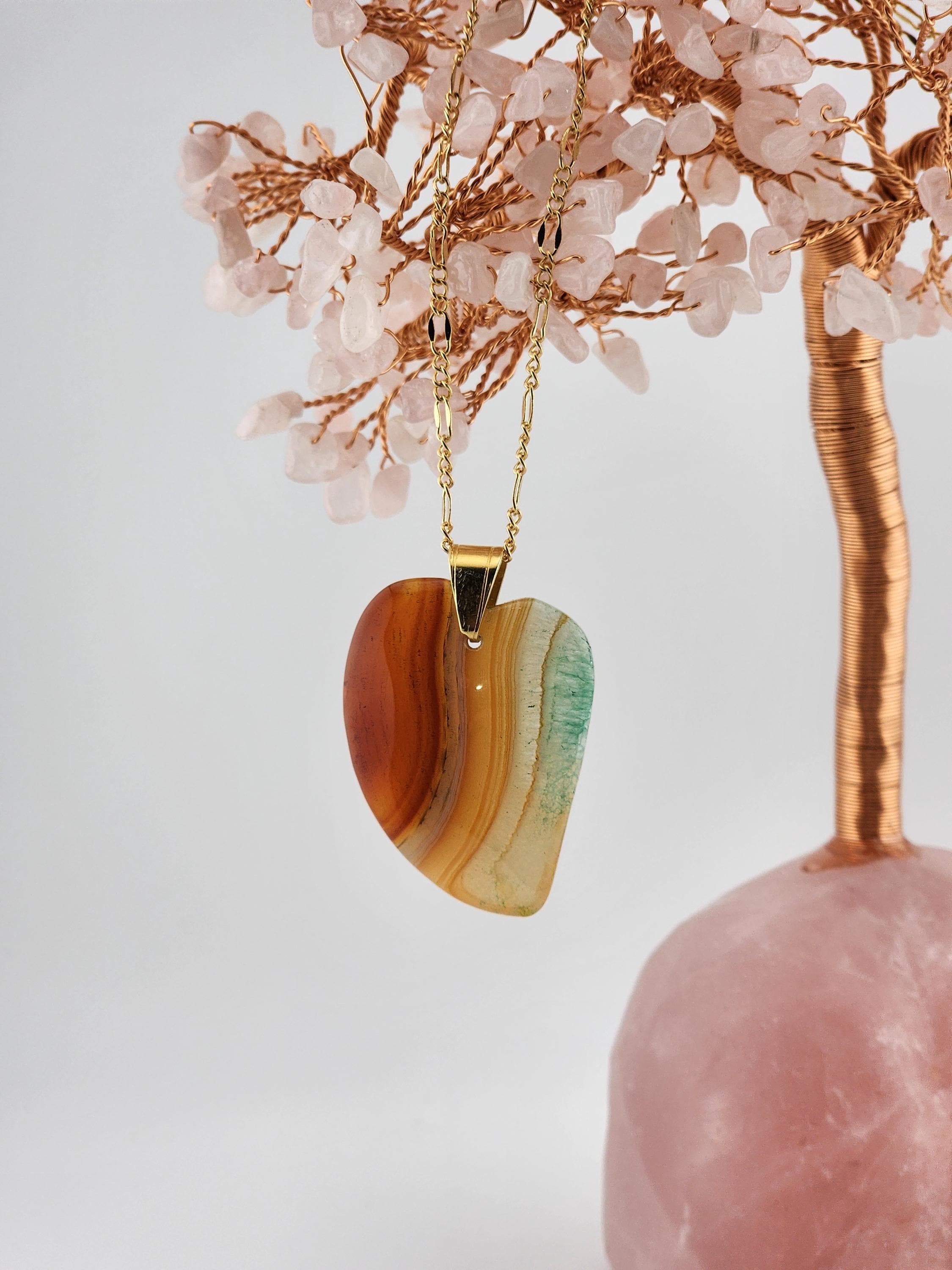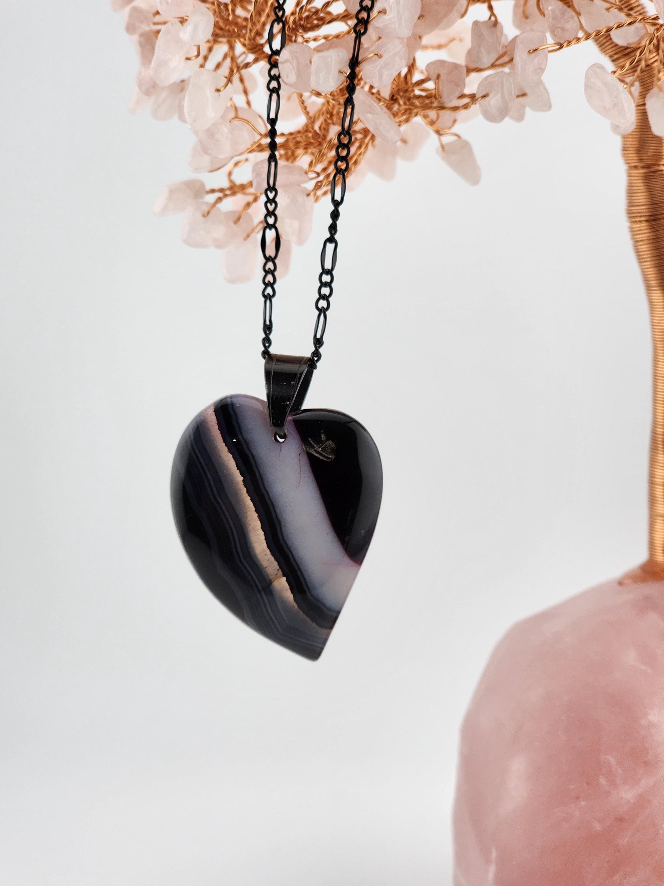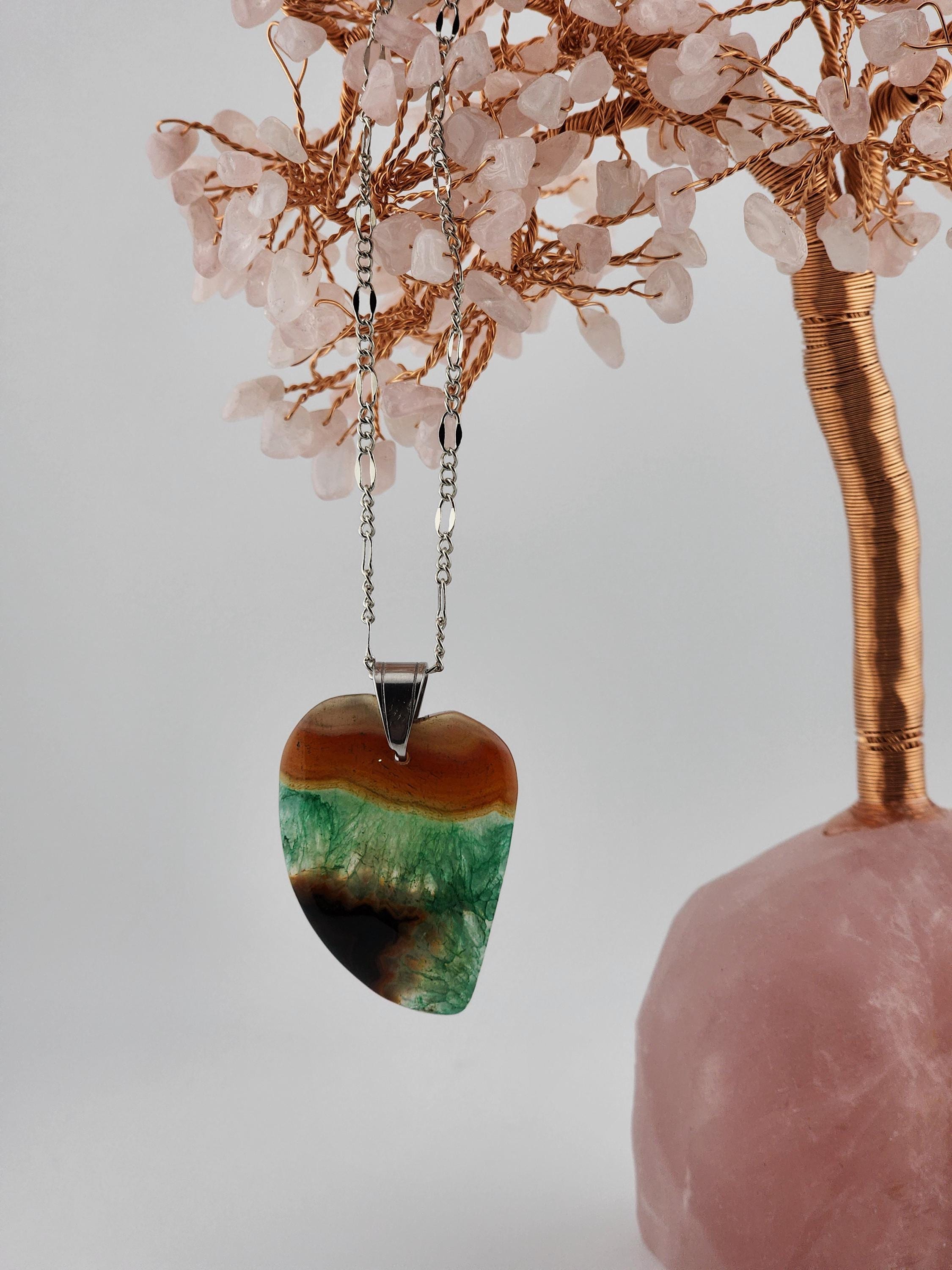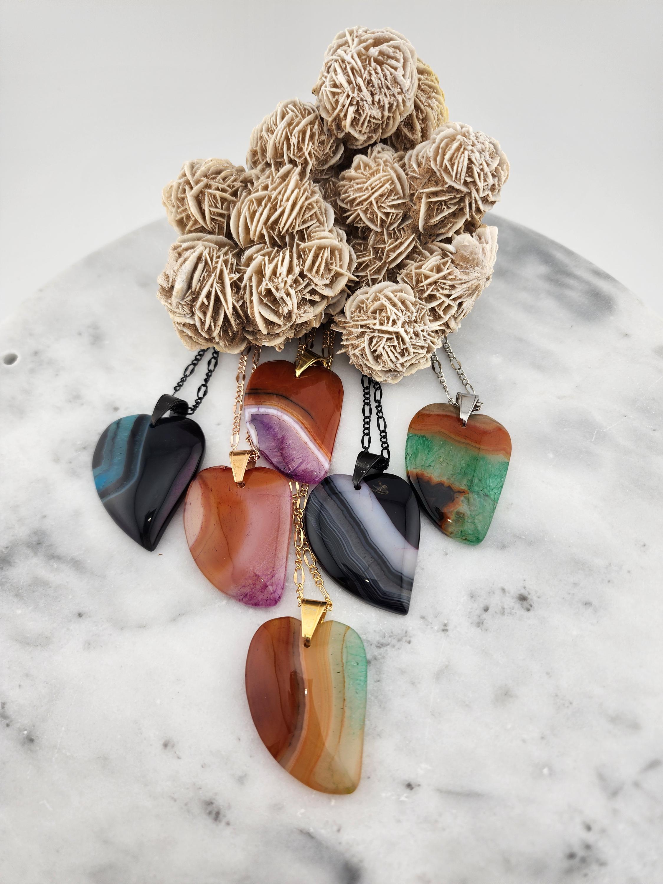 I made each of these necklaces using different color stainless steel chain with extenders that make them adjustable from 22"-24" in length. Each have a different large gradient color crystal stone heart pendant. YOUR CHOICES ARE OF PENDANTS ARE: #1- Blue/Black on a black necklace #2- Orange/Pink/Purple on a rose gold necklace #3- Orange/Yellow/Green on a gold necklace #4- Orange/Green/Black on a silver necklace #5- Orange/Purple on a gold necklace #6- Black/White on a black necklace These boho necklaces are perfect for Valentine's Day or for any occasion. * YOUR PURCHASE WILL ARRIVE IN PRETTY PACKAGING * SIZE: Size:40x30mm. ✨Natural gemstones or semi precious stones come from minerals. Because these hearts are natural, the stones may have tiny flaws. Meanwhile, cutting or polishing also makes every piece of gemstone vary in color and size.