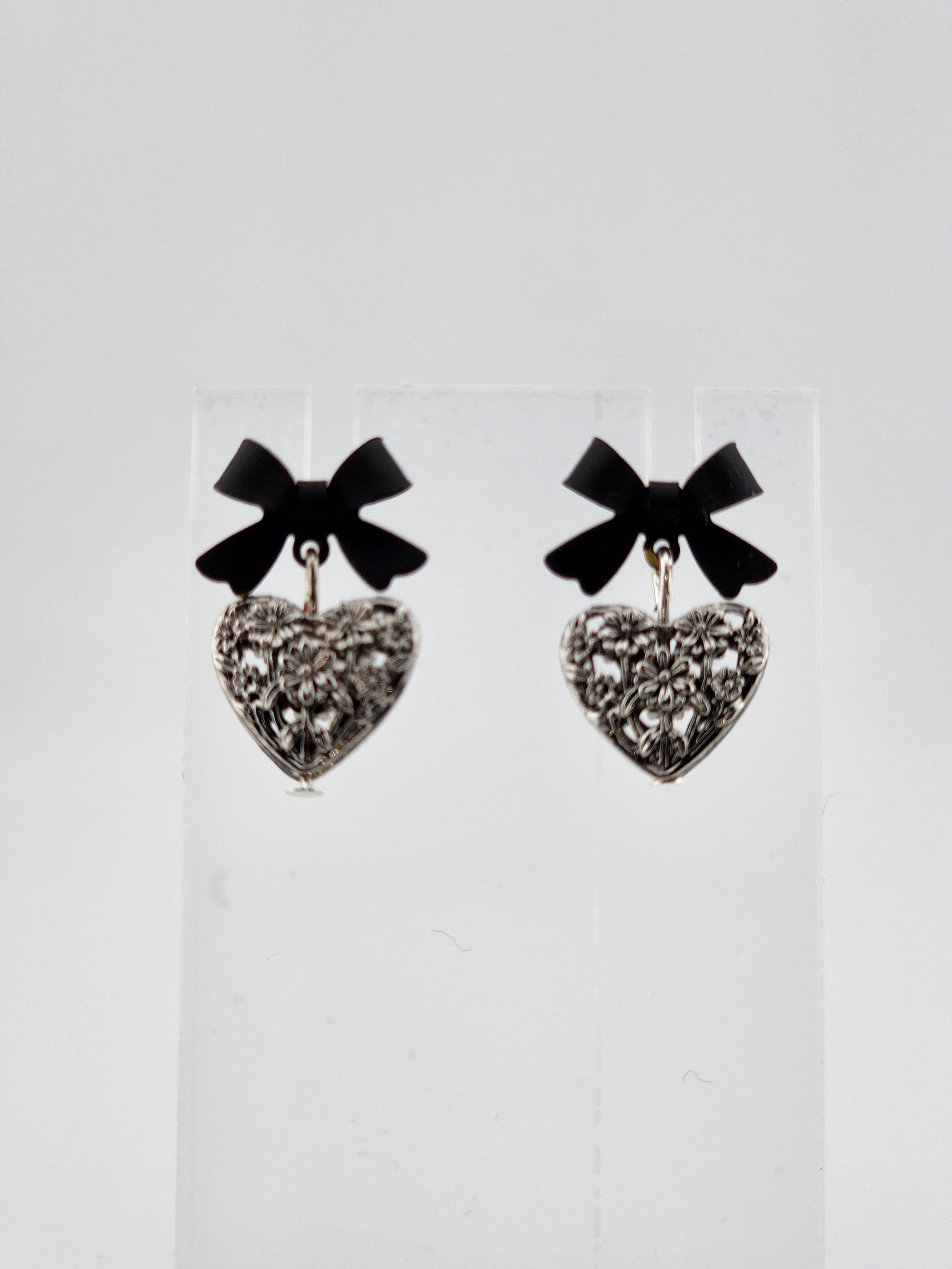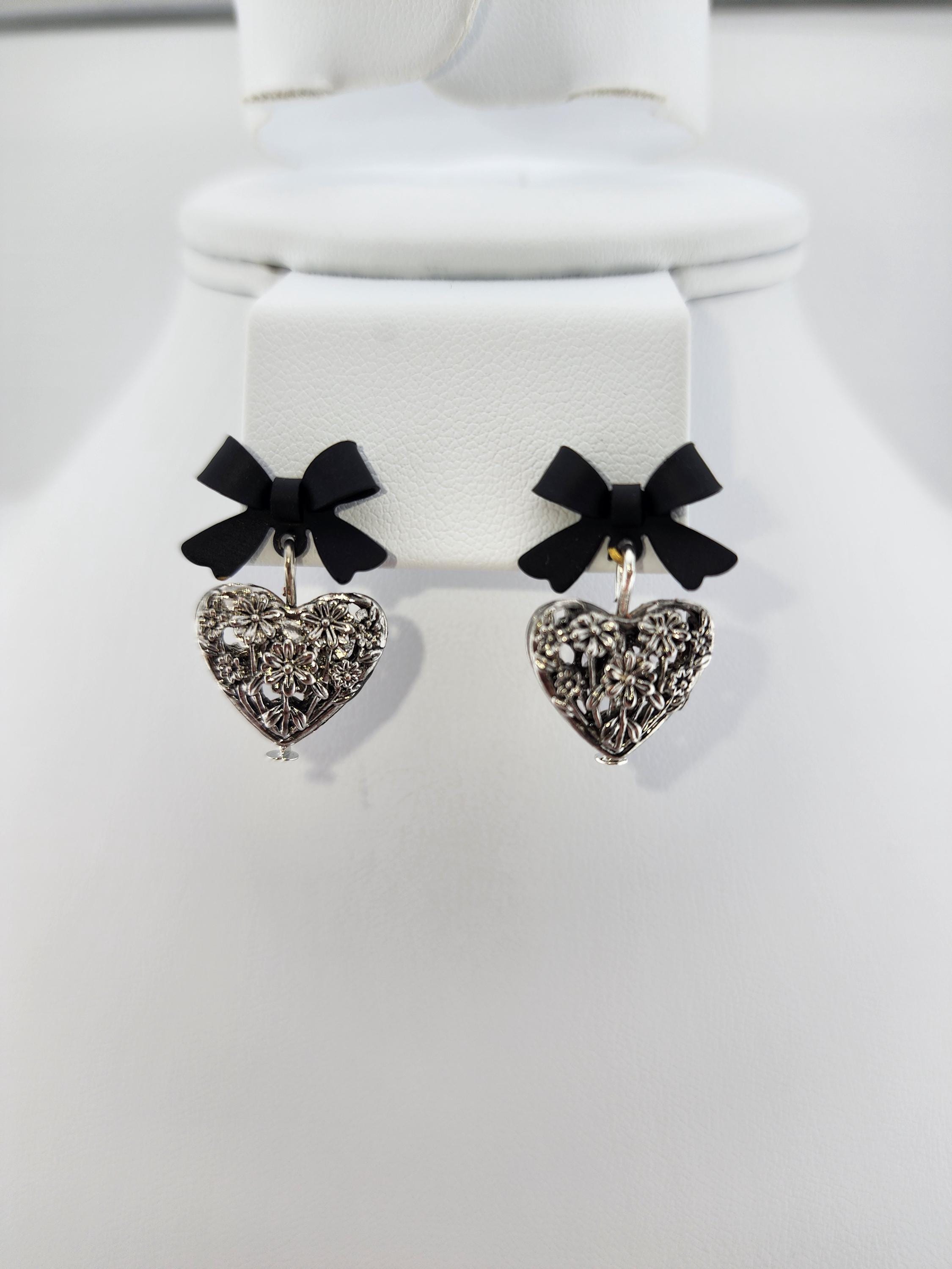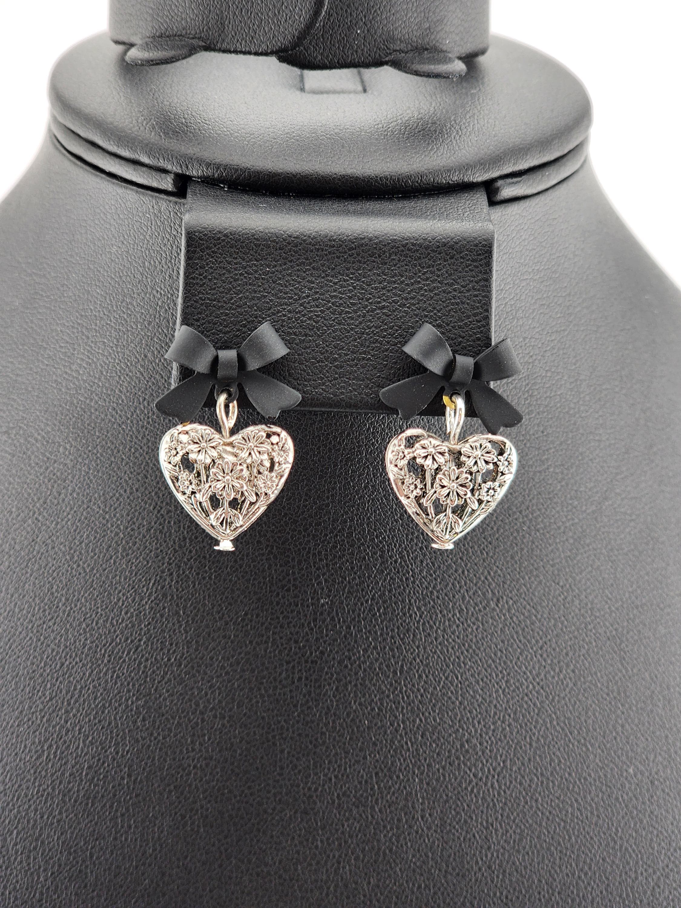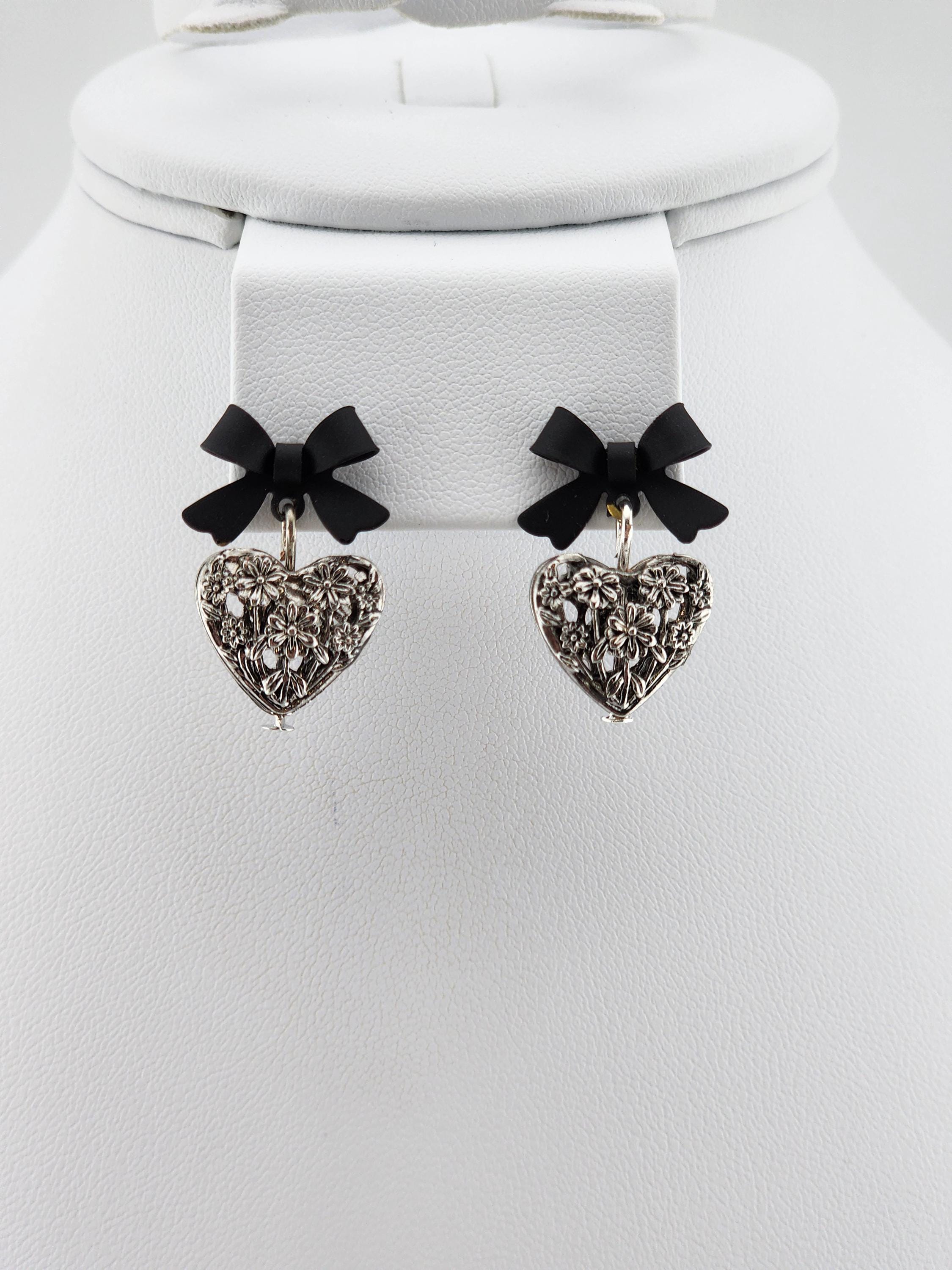 I made these one-of-a-kind earrings using black bowknot studs with 925 sterling silver hypoallergenic pins. I added to each silver filigree heart charms that have sterling silver pins through them. ✨Your purchase will arrive in pretty packaging ❤️These earrings would be a sophisticated gift for Valentine's Day, Anniversary, Birthday, Maid-of-honor, etc... ✨The bowknots are lacquered ✨Being silver you will need to care for the hearts as they will tarnish over time. Silver polishing cloths will suffice for cleaning. ✨SIZE: about 11 x 15 x 4mm(0.43 x 0.59 x 0.16in), hole: 1.2mm