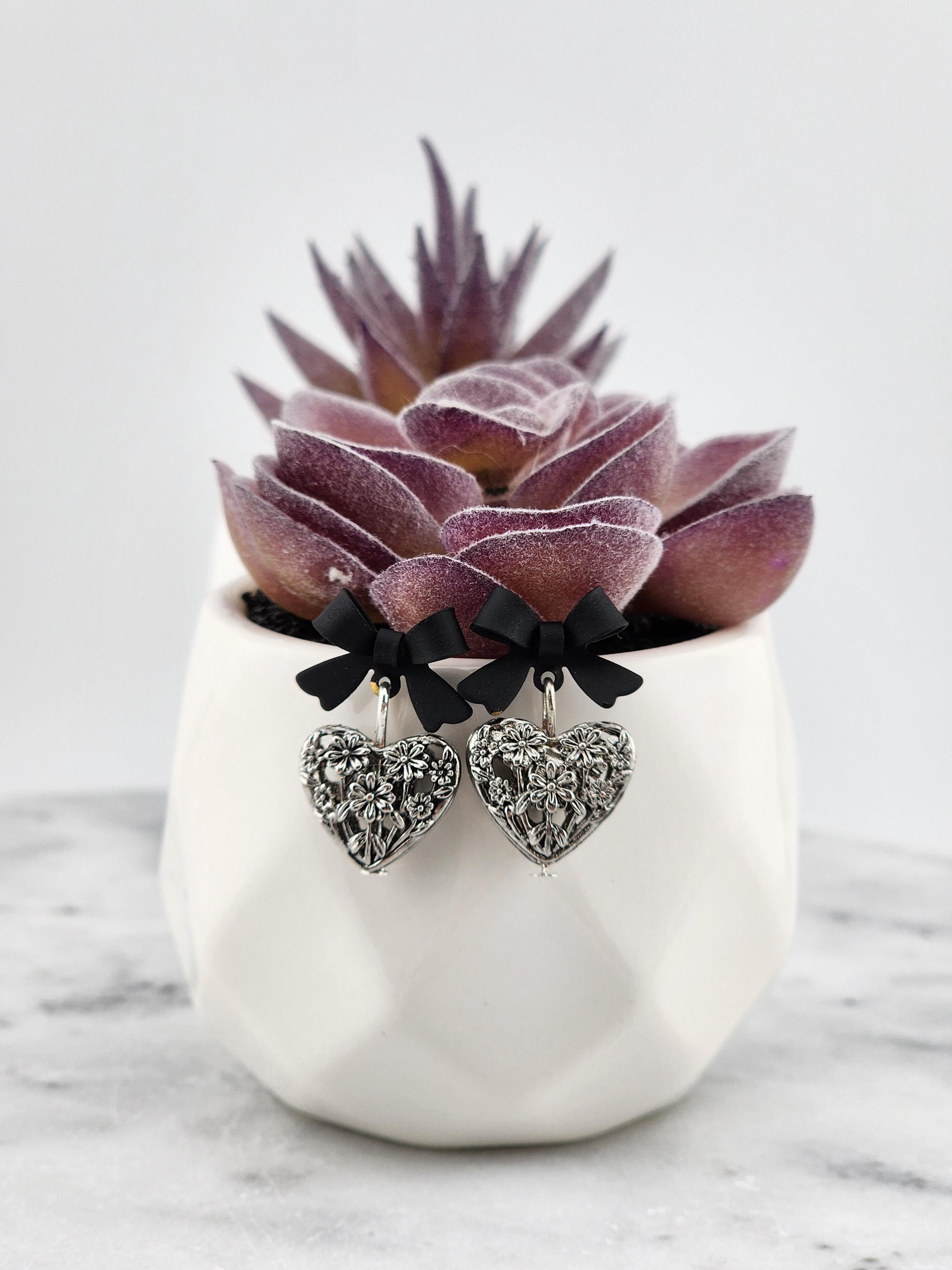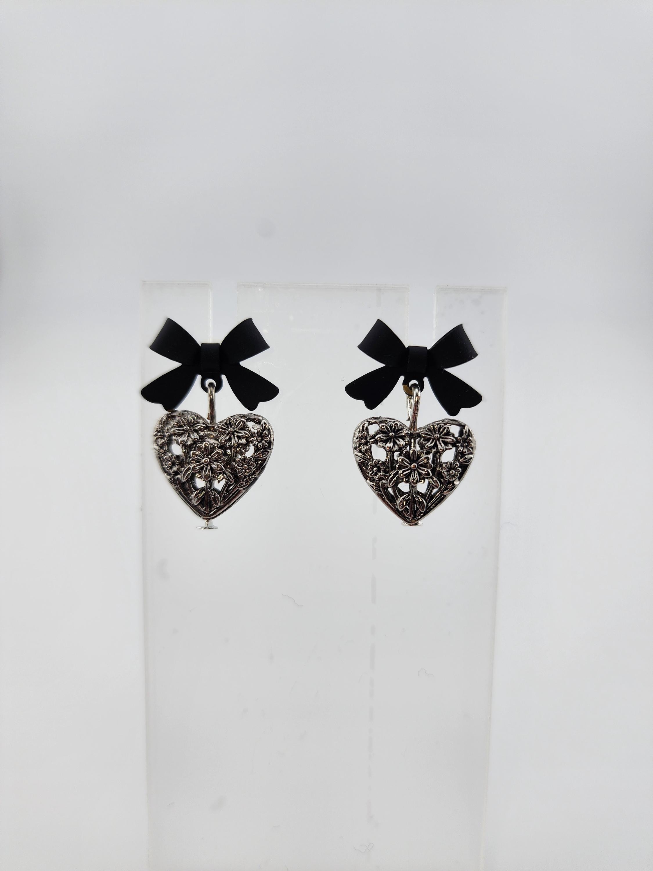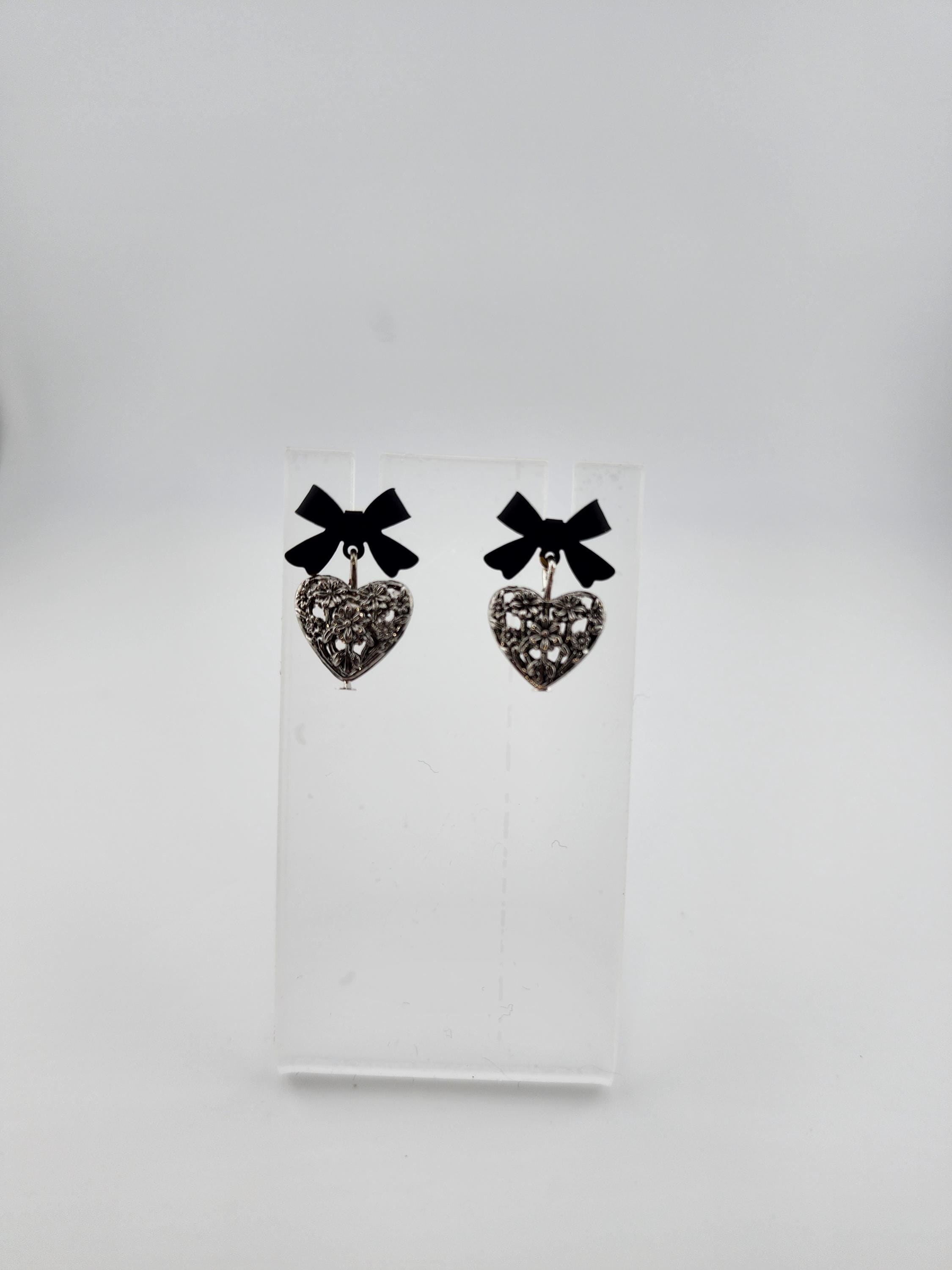 I made these one-of-a-kind earrings using black bowknot studs with 925 sterling silver hypoallergenic pins. I added to each silver filigree heart charms that have sterling silver pins through them. ✨Your purchase will arrive in pretty packaging ❤️These earrings would be a sophisticated gift for Valentine's Day, Anniversary, Birthday, Maid-of-honor, etc... ✨The bowknots are lacquered ✨Being silver you will need to care for the hearts as they will tarnish over time. Silver polishing cloths will suffice for cleaning. ✨SIZE: about 11 x 15 x 4mm(0.43 x 0.59 x 0.16in), hole: 1.2mm