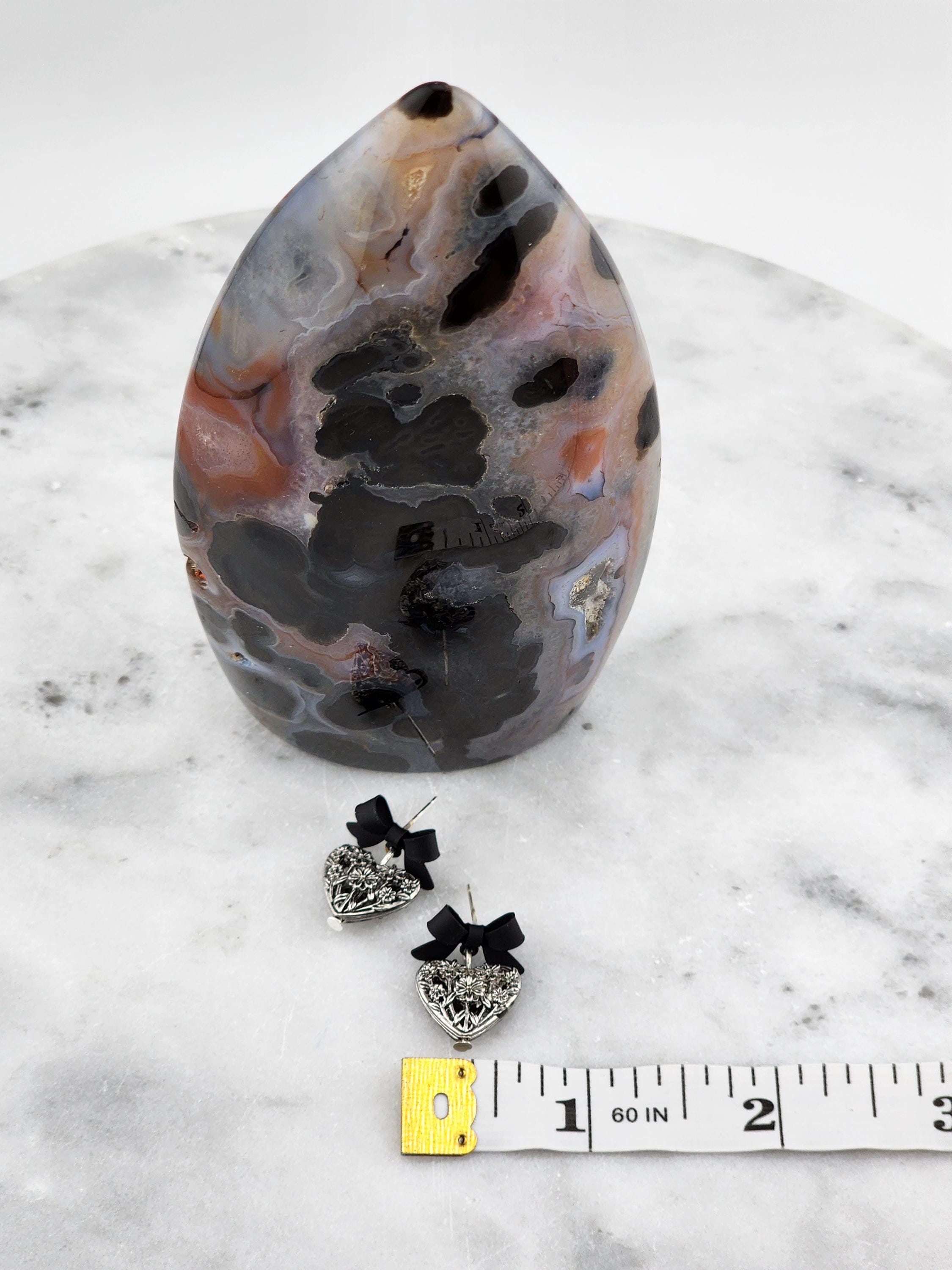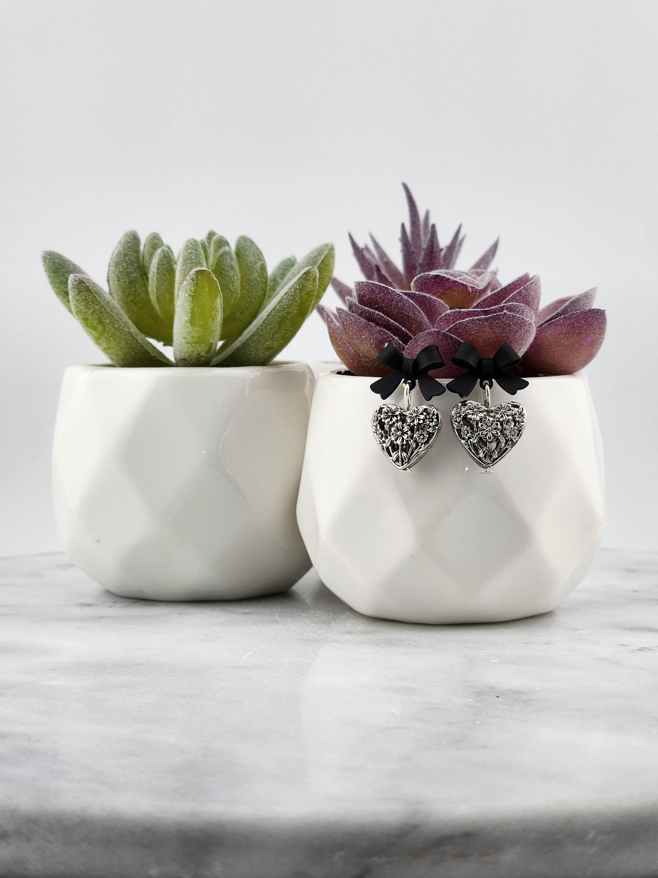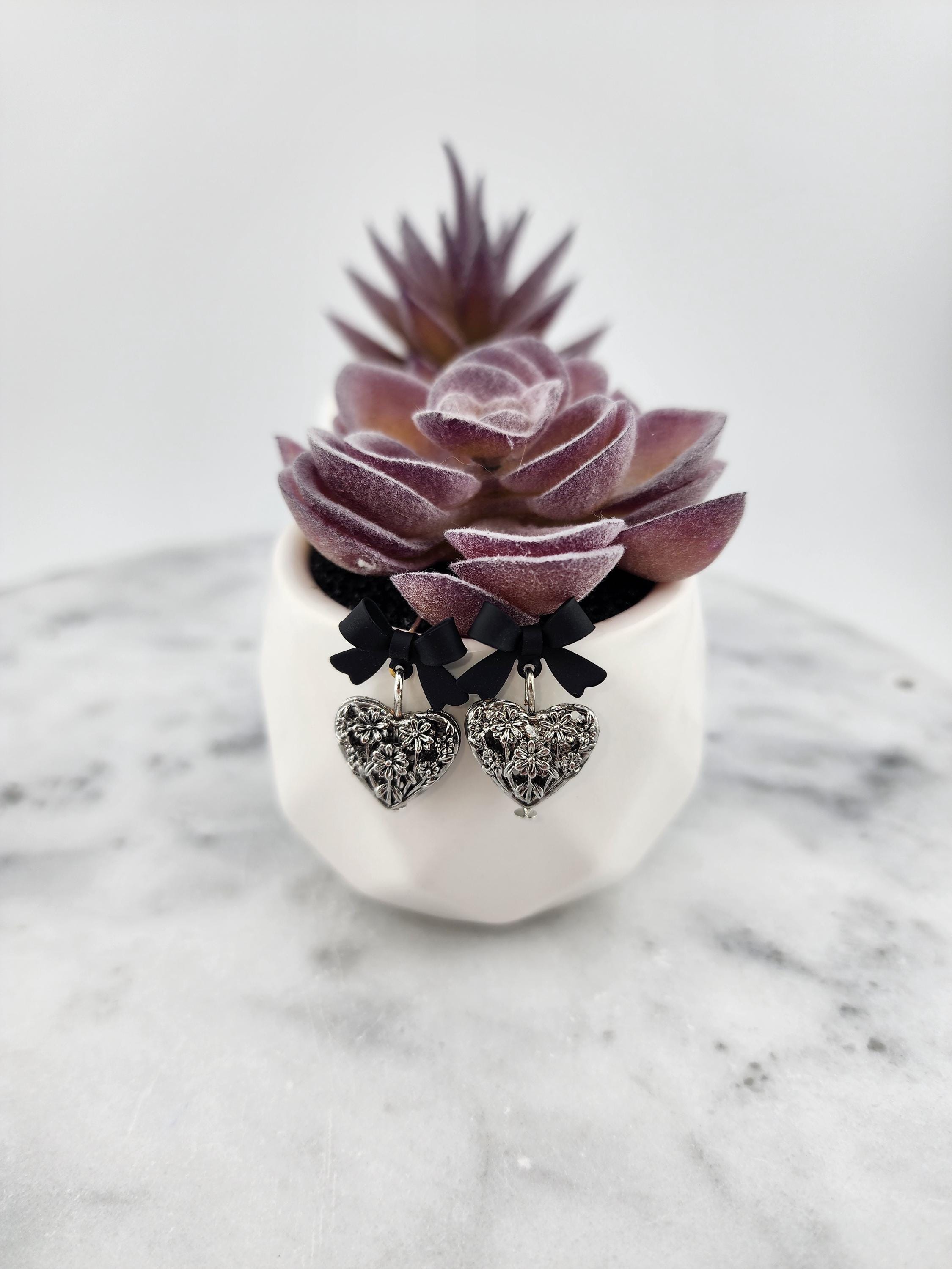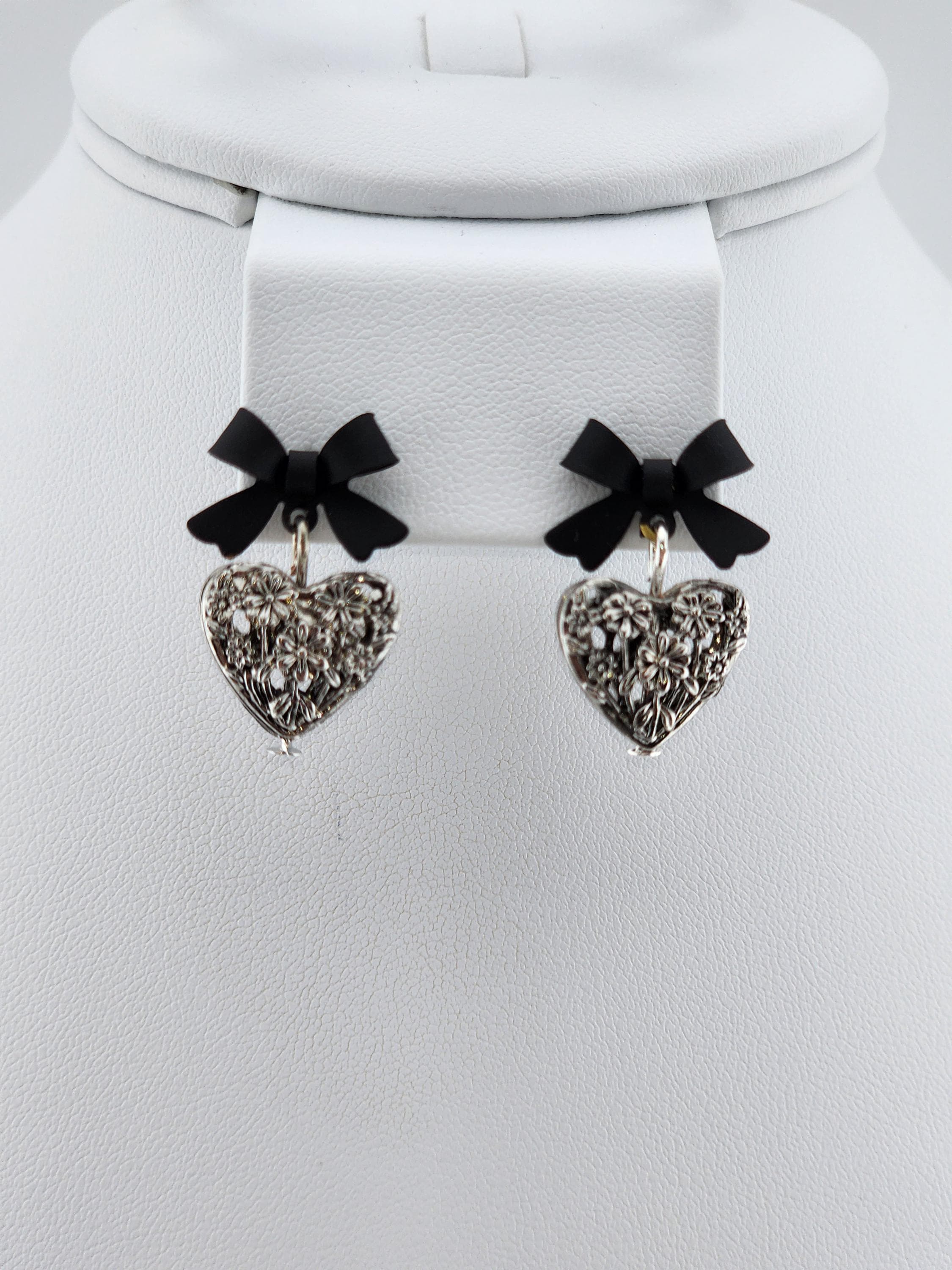 I made these one-of-a-kind earrings using black bowknot studs with 925 sterling silver hypoallergenic pins. I added to each silver filigree heart charms that have sterling silver pins through them. ✨Your purchase will arrive in pretty packaging ❤️These earrings would be a sophisticated gift for Valentine's Day, Anniversary, Birthday, Maid-of-honor, etc... ✨The bowknots are lacquered ✨Being silver you will need to care for the hearts as they will tarnish over time. Silver polishing cloths will suffice for cleaning. ✨SIZE: about 11 x 15 x 4mm(0.43 x 0.59 x 0.16in), hole: 1.2mm