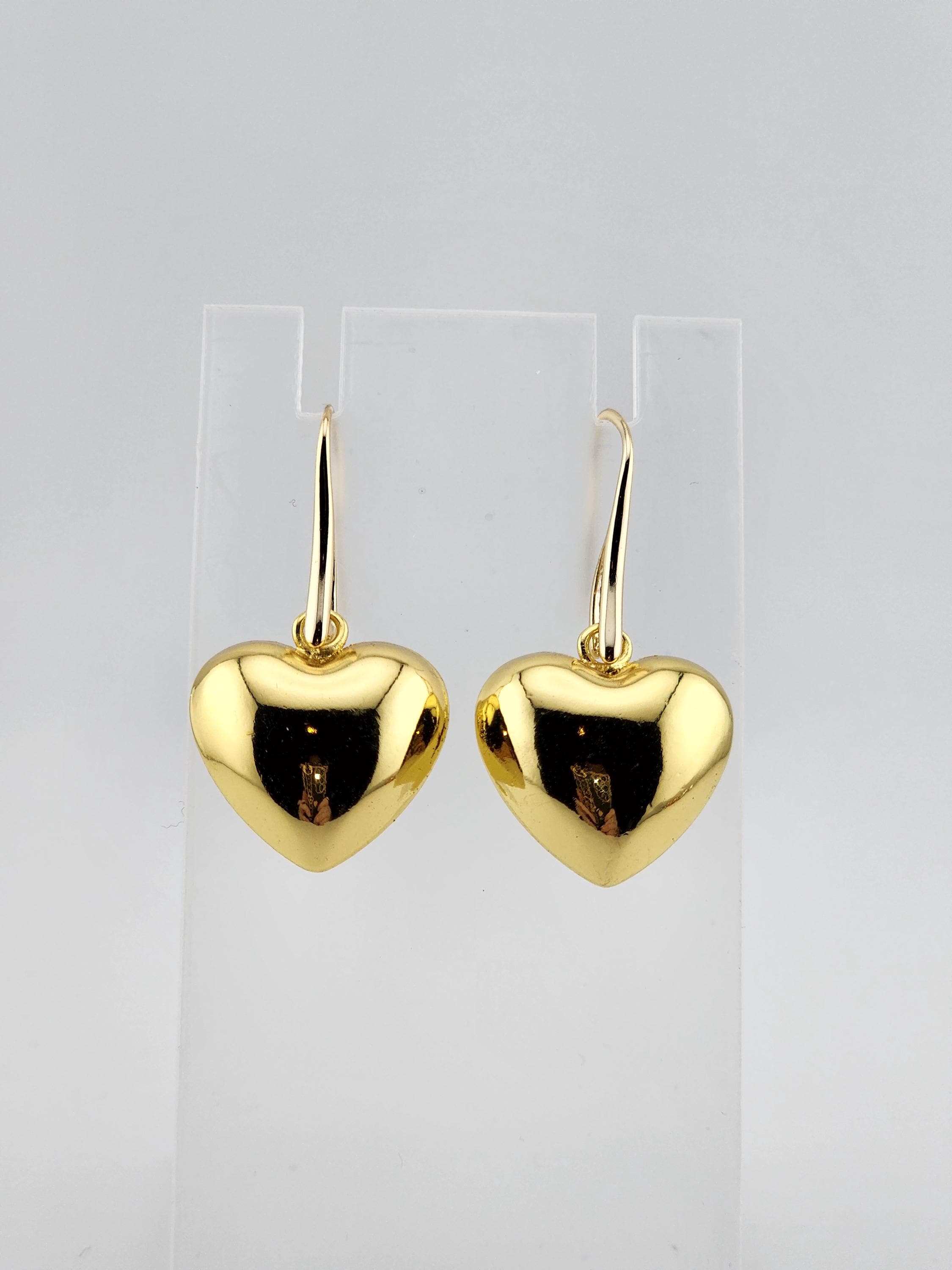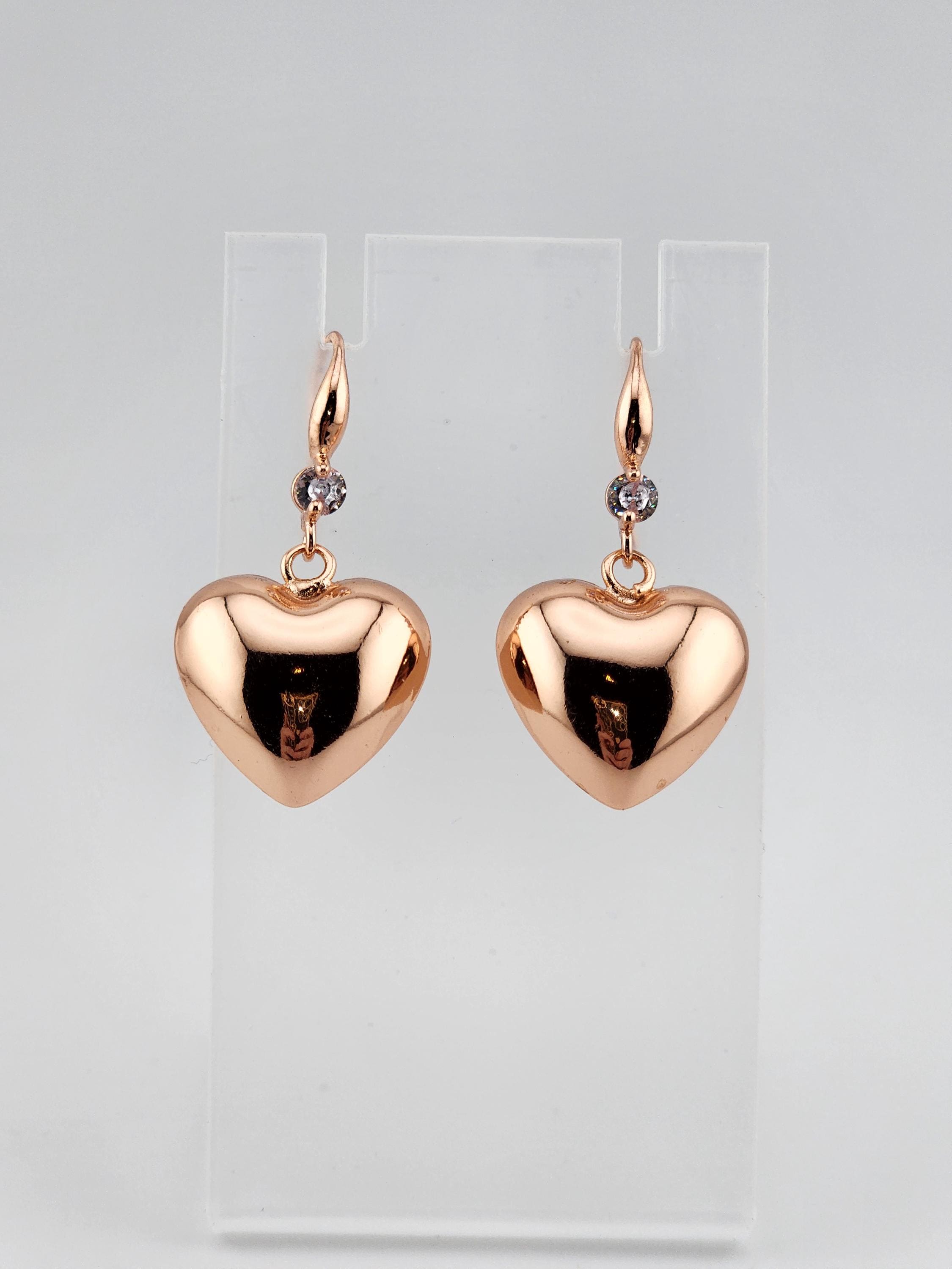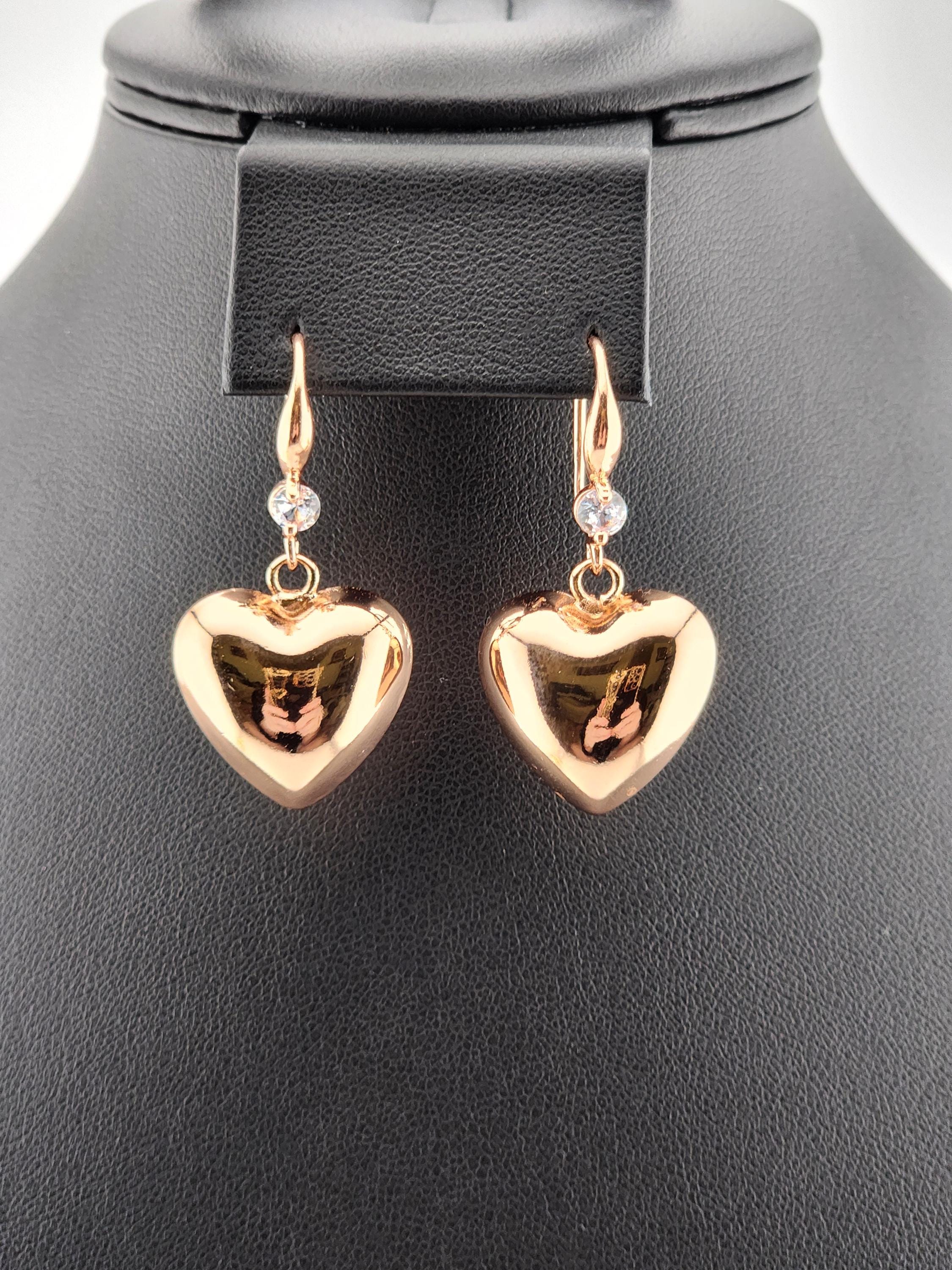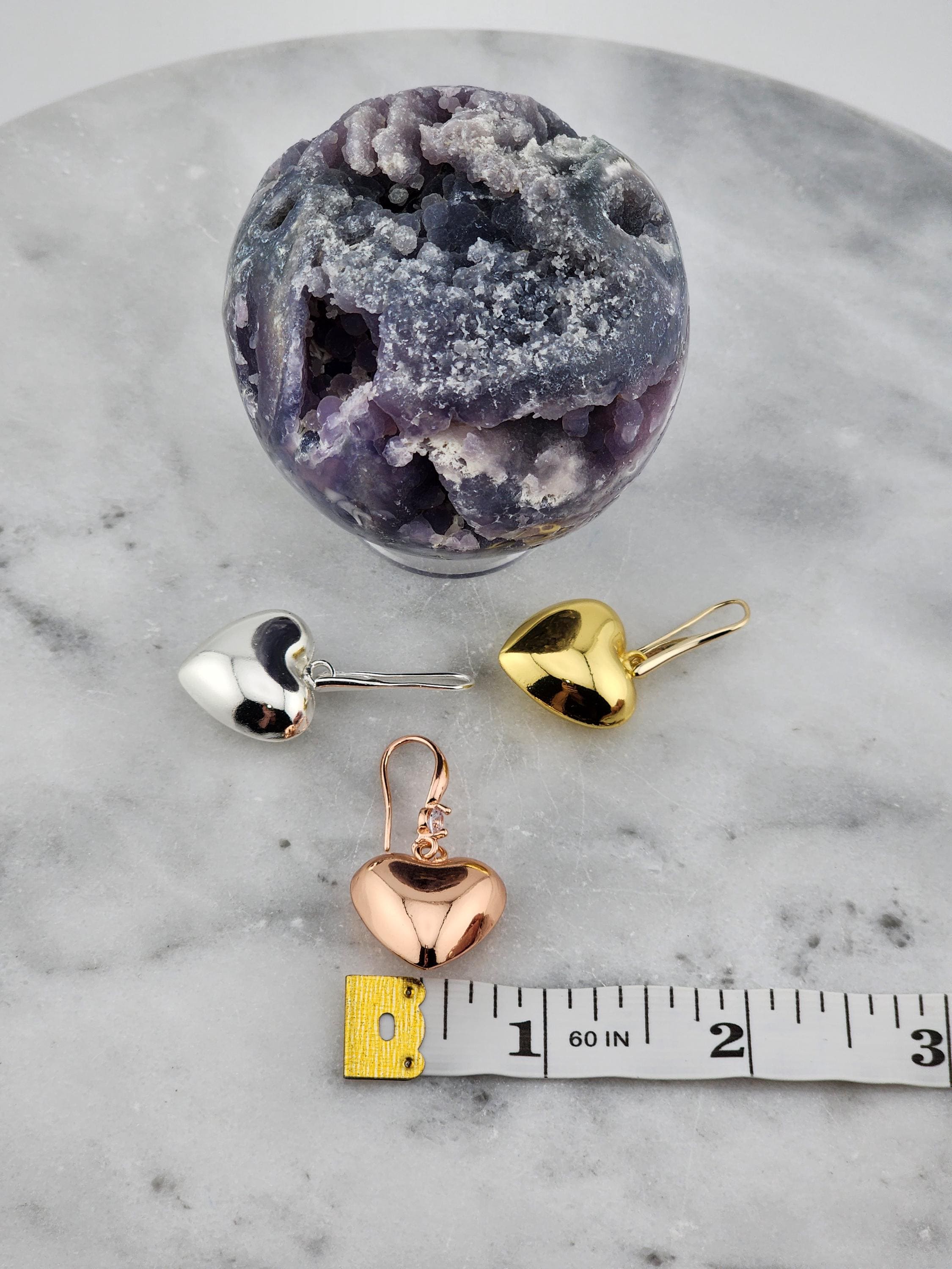 I made these earrings using rose gold plated sterling silver and crystal hooks, sterling silver plated brass hooks, and 24k gold plated brass hooks. I've added medium sized puffy heart charms to choose from. YOUR CHOICES ARE: #1- Rose Gold plated brass #2- Sterling Silver plated brass #3- 18k Gold plated brass ❤️Your purchase will arrive in pretty packaging ❤️These romantic heart charms are a representation of warmth and passion. * SIZE: 20x20.5x10mm