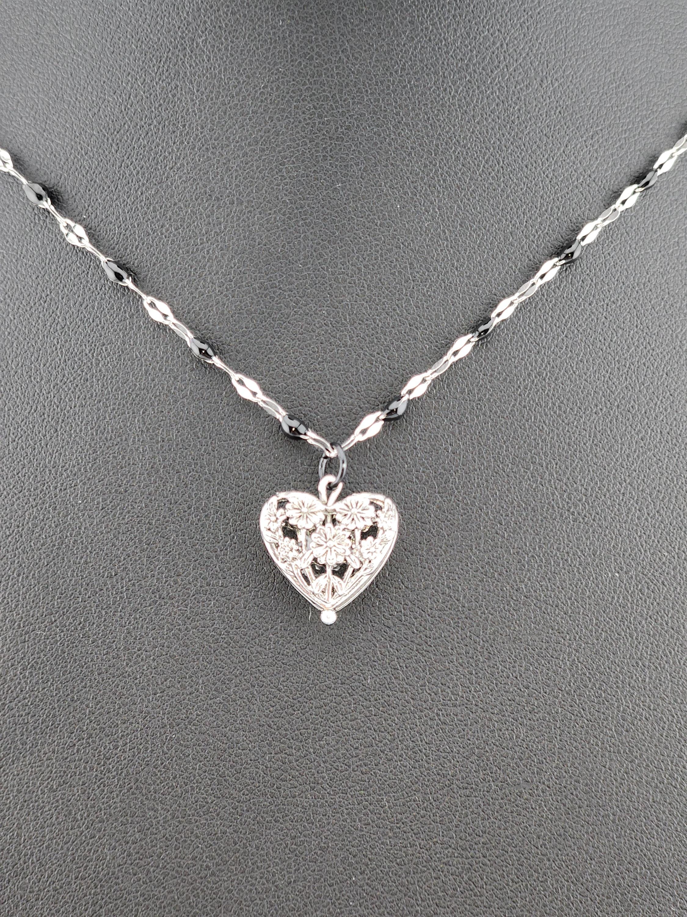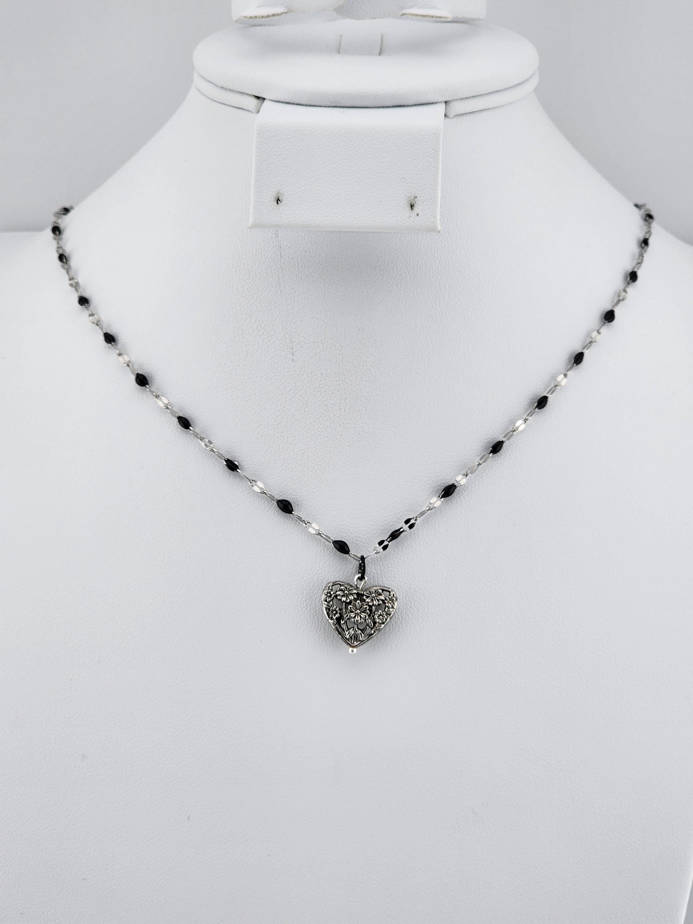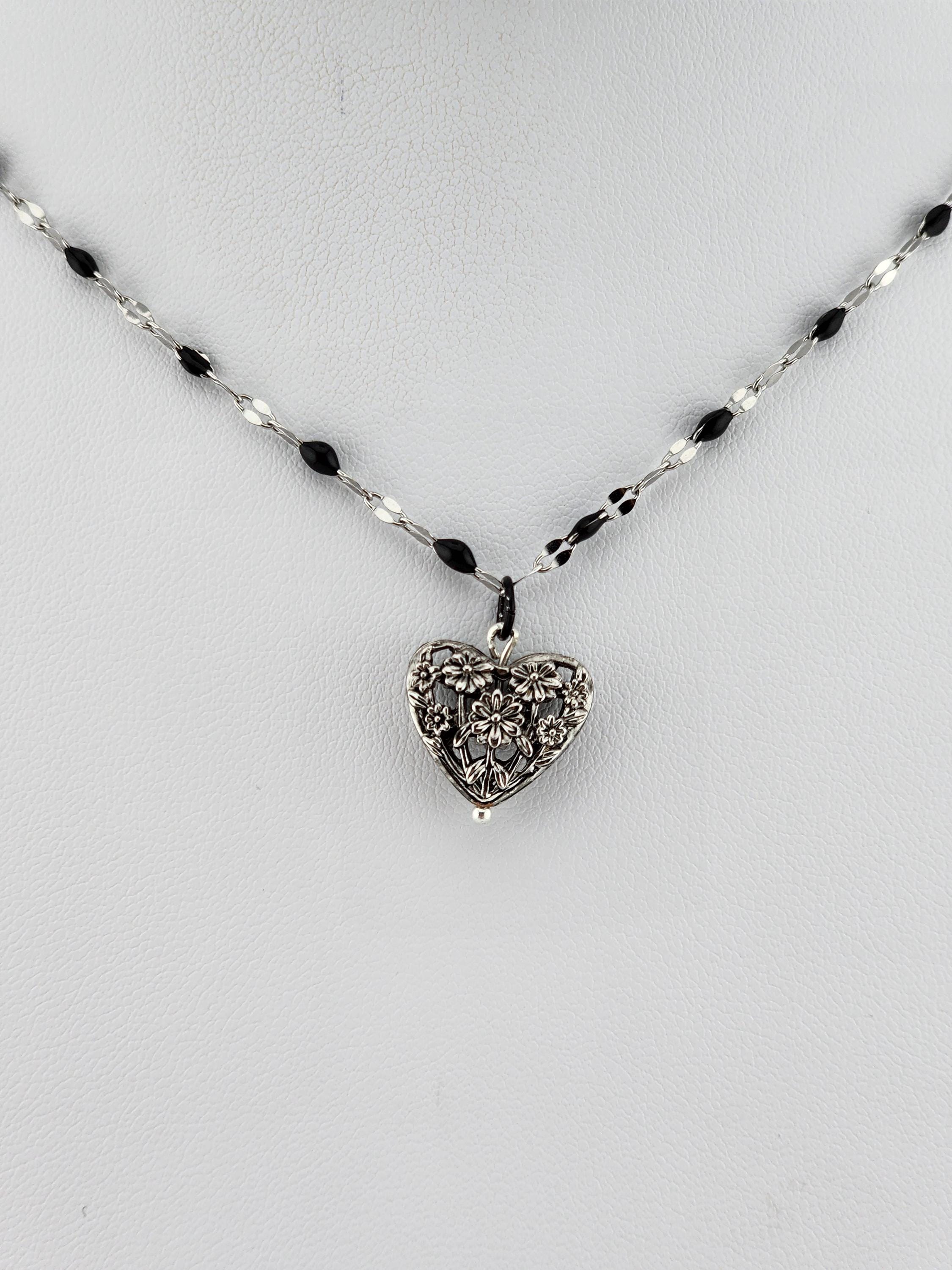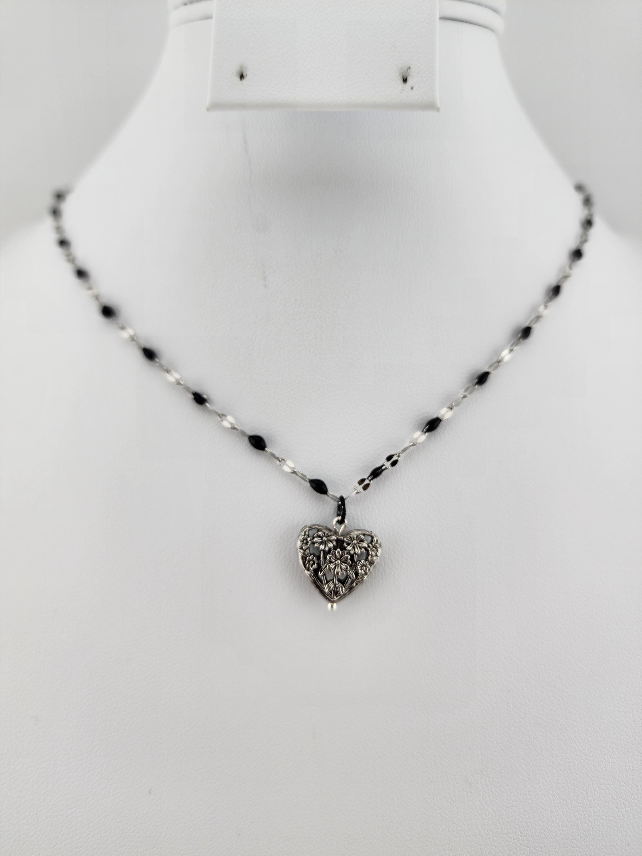 I made this necklace using silver stainless steel and black enamel link chain with an extender making it adjustable from 20"-22" in length. I added a real silver filigree flower heart pendant with a sterling silver center pin. * Your purchase will arrive in pretty packaging NOTE: Because it is real silver, the pendant will tarnish over time (there's no getting around that), but a silver polishing cloth should suffice for cleaning and keeping it bright.