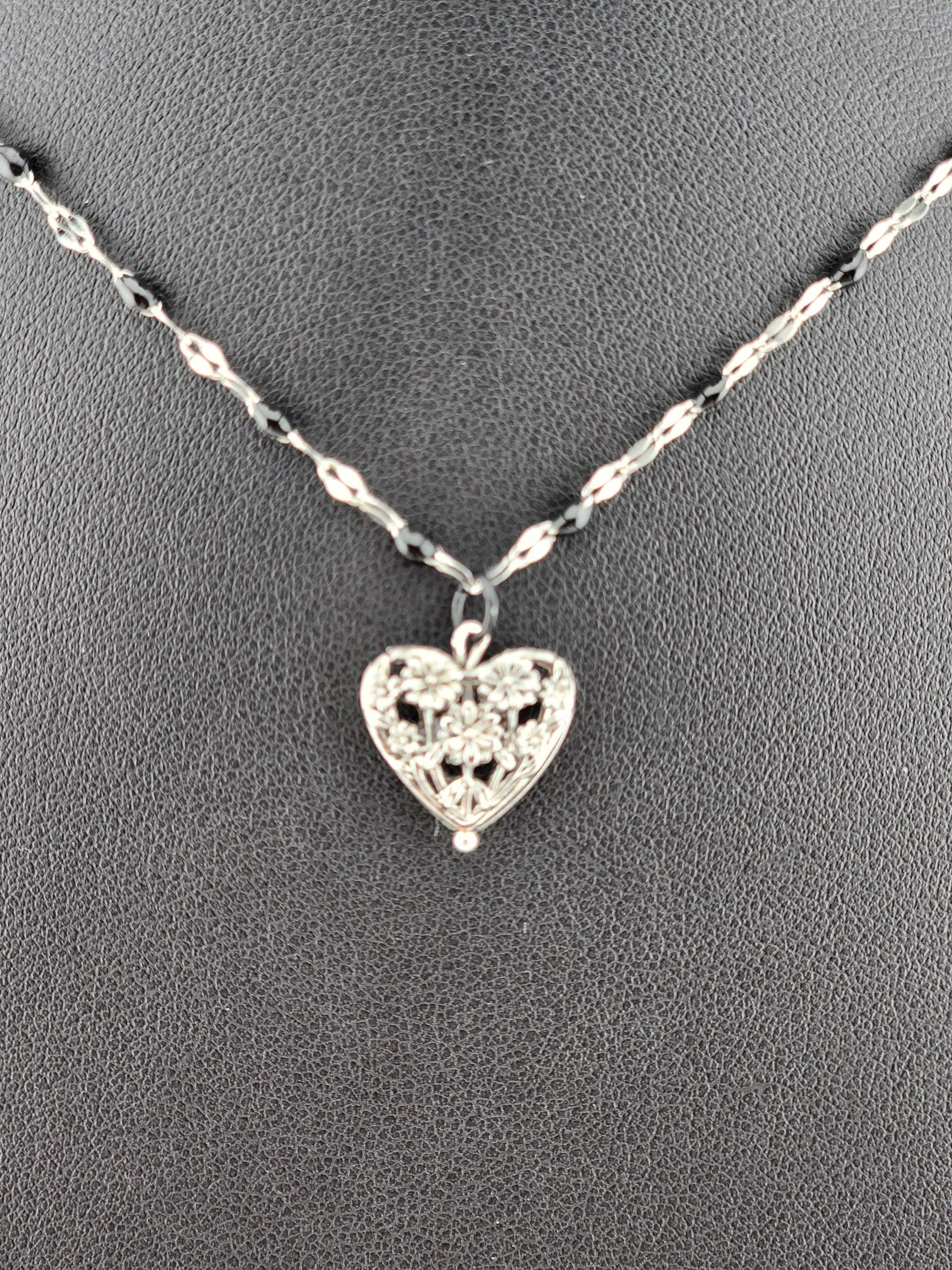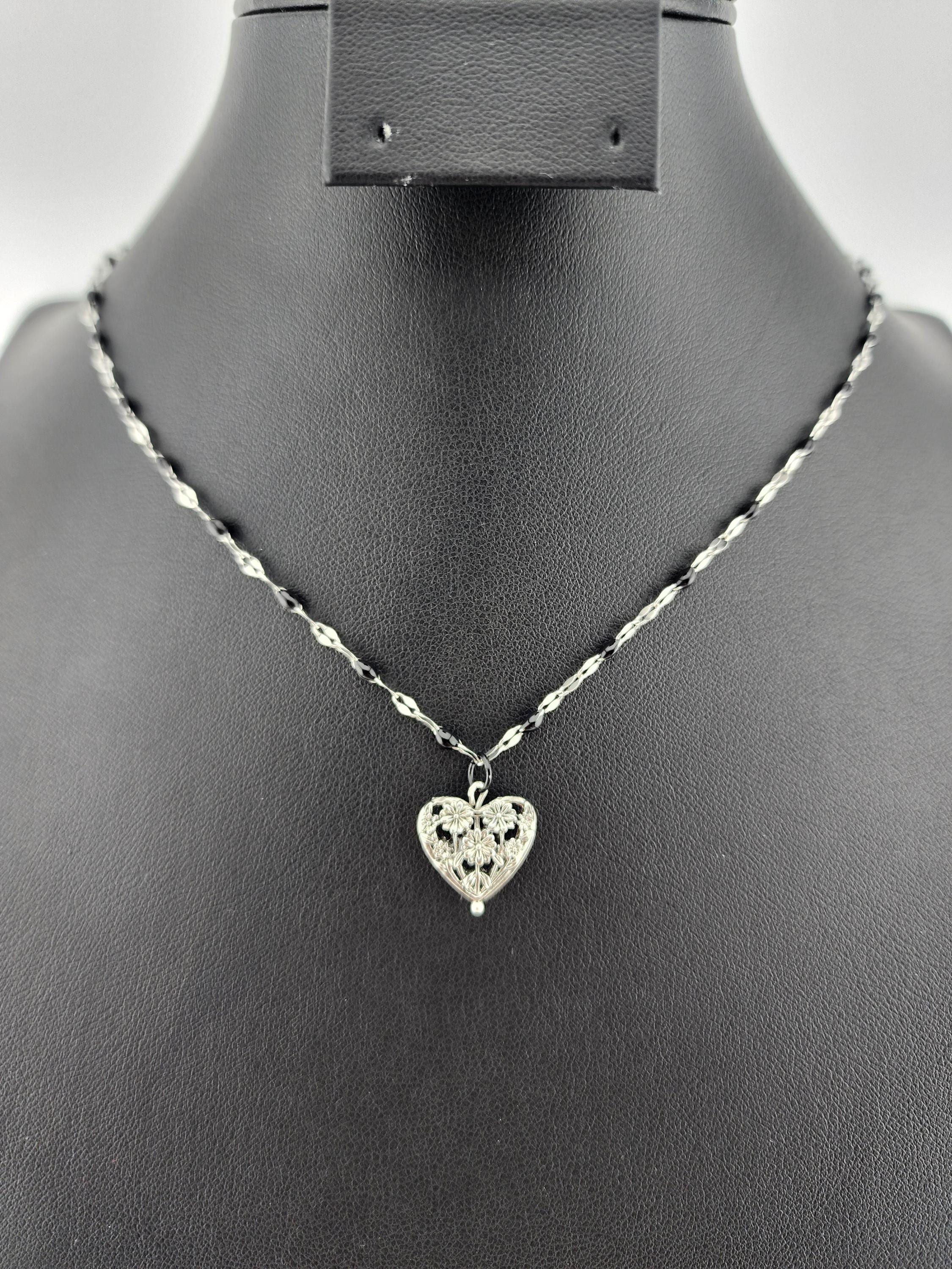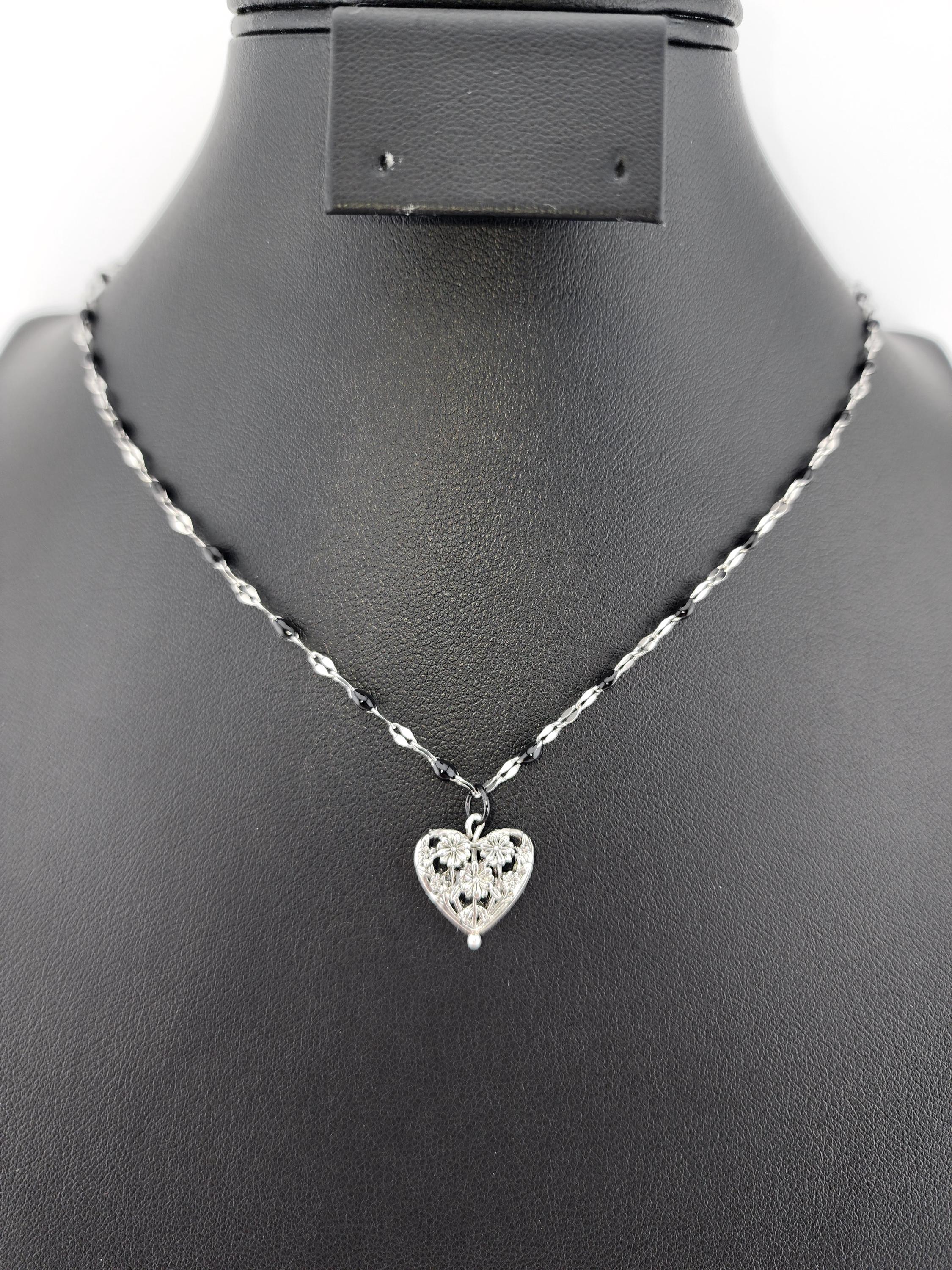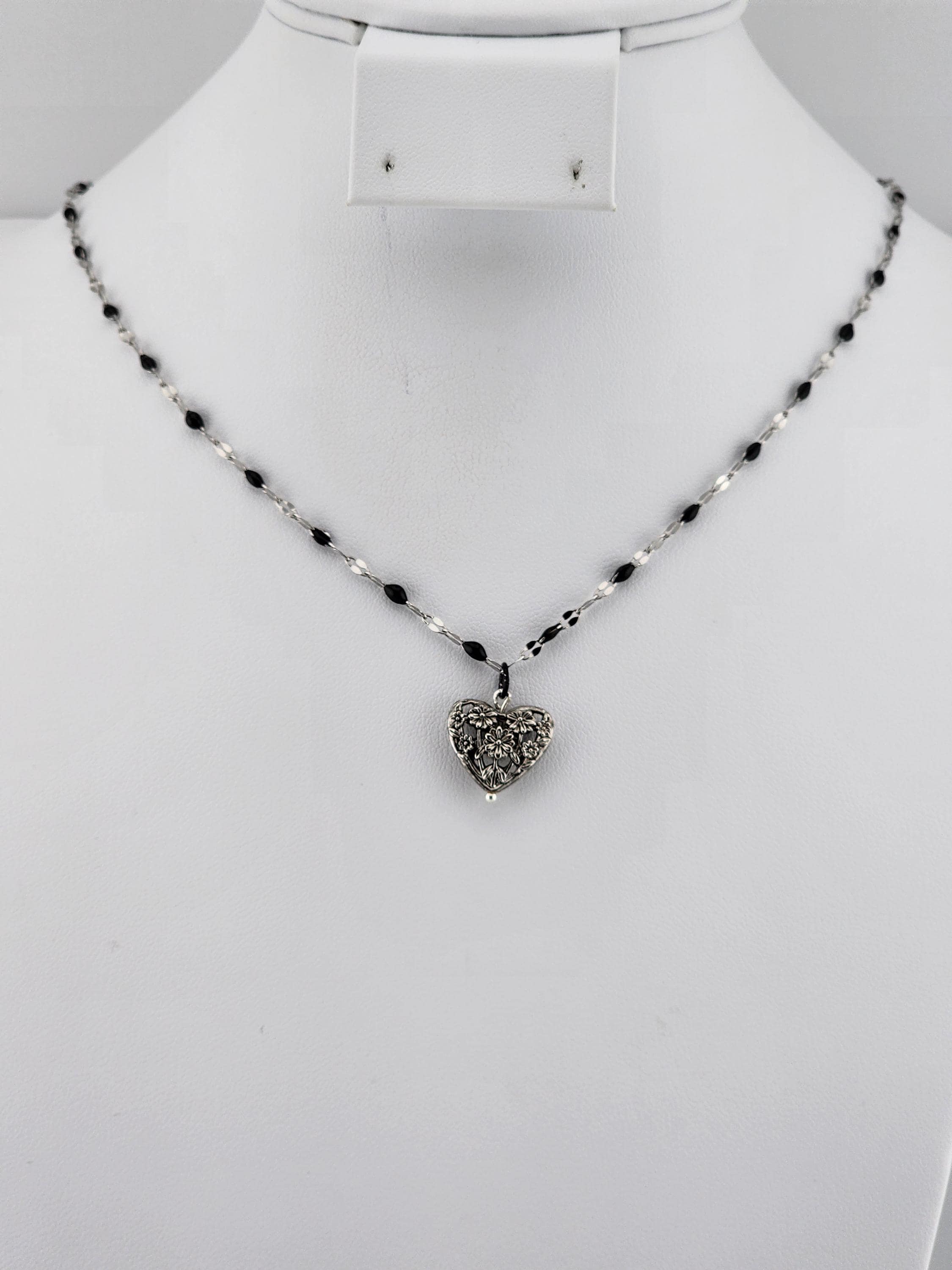 I made this necklace using silver stainless steel and black enamel link chain with an extender making it adjustable from 20"-22" in length. I added a real silver filigree flower heart pendant with a sterling silver center pin. * Your purchase will arrive in pretty packaging NOTE: Because it is real silver, the pendant will tarnish over time (there's no getting around that), but a silver polishing cloth should suffice for cleaning and keeping it bright.