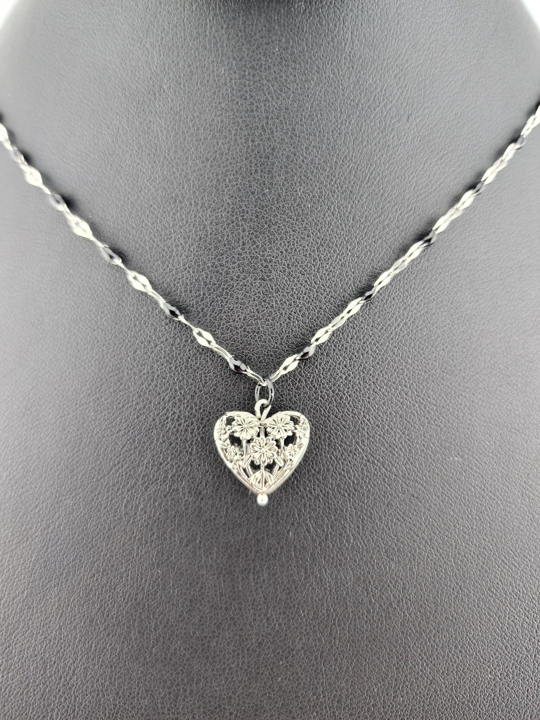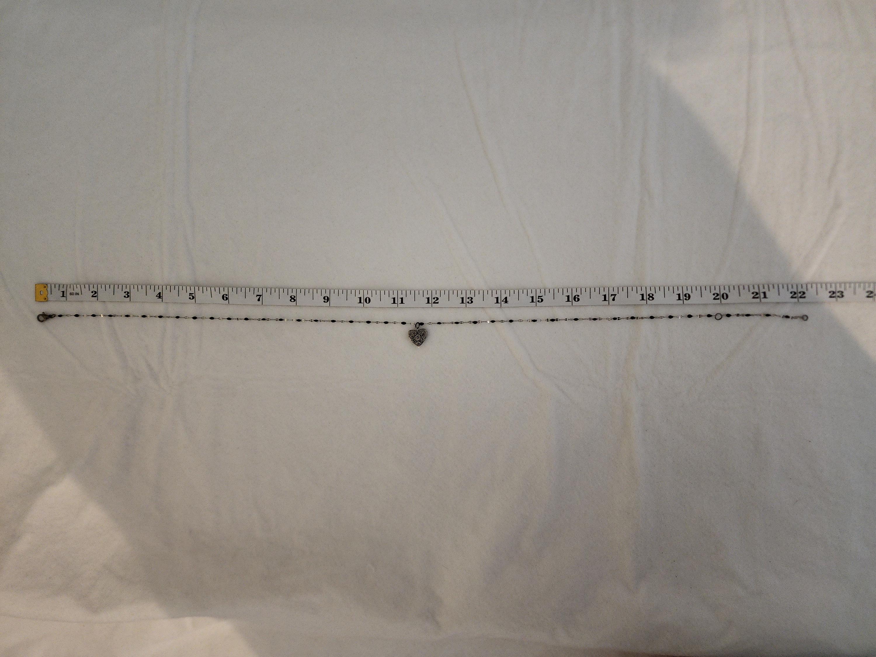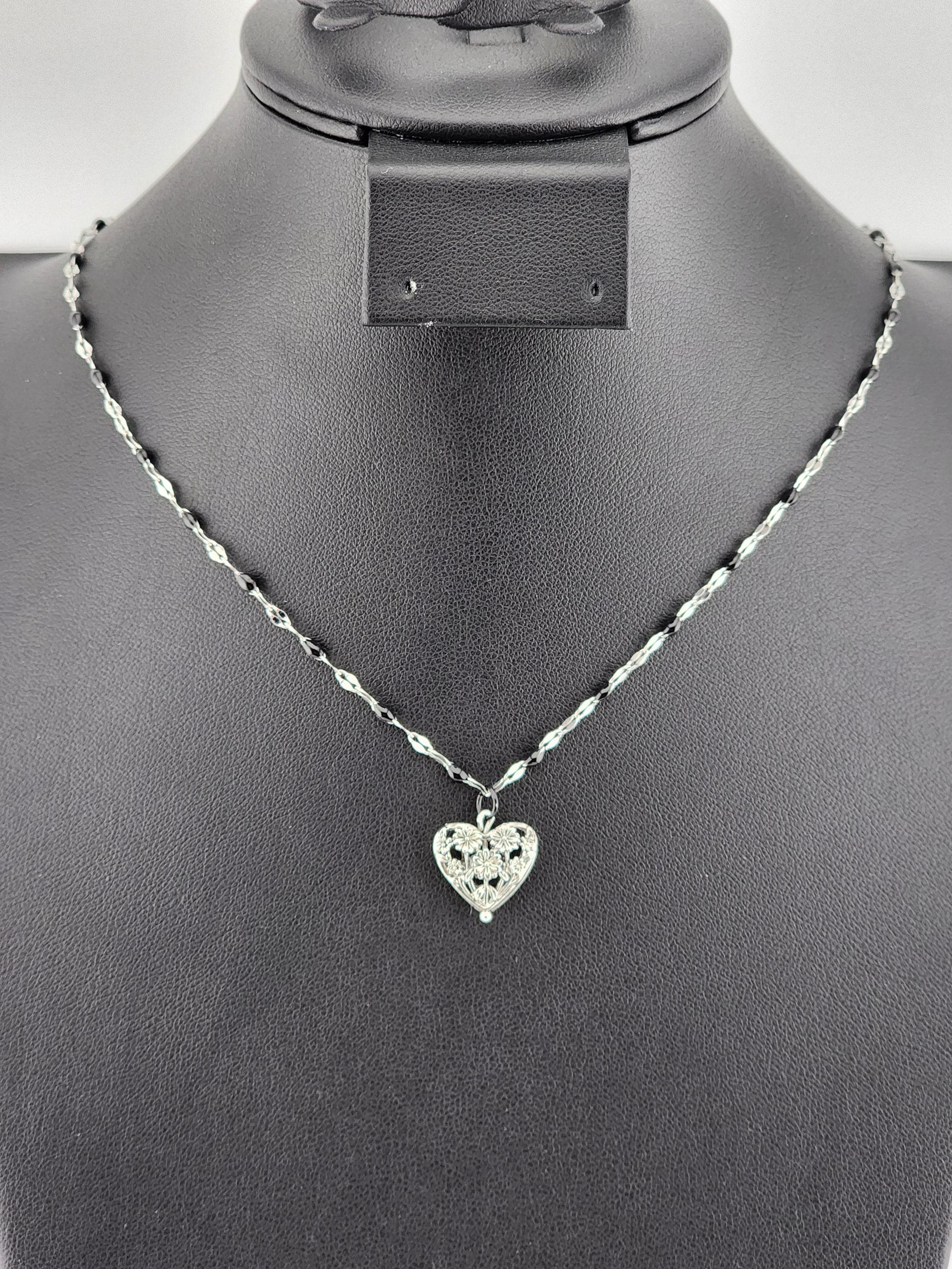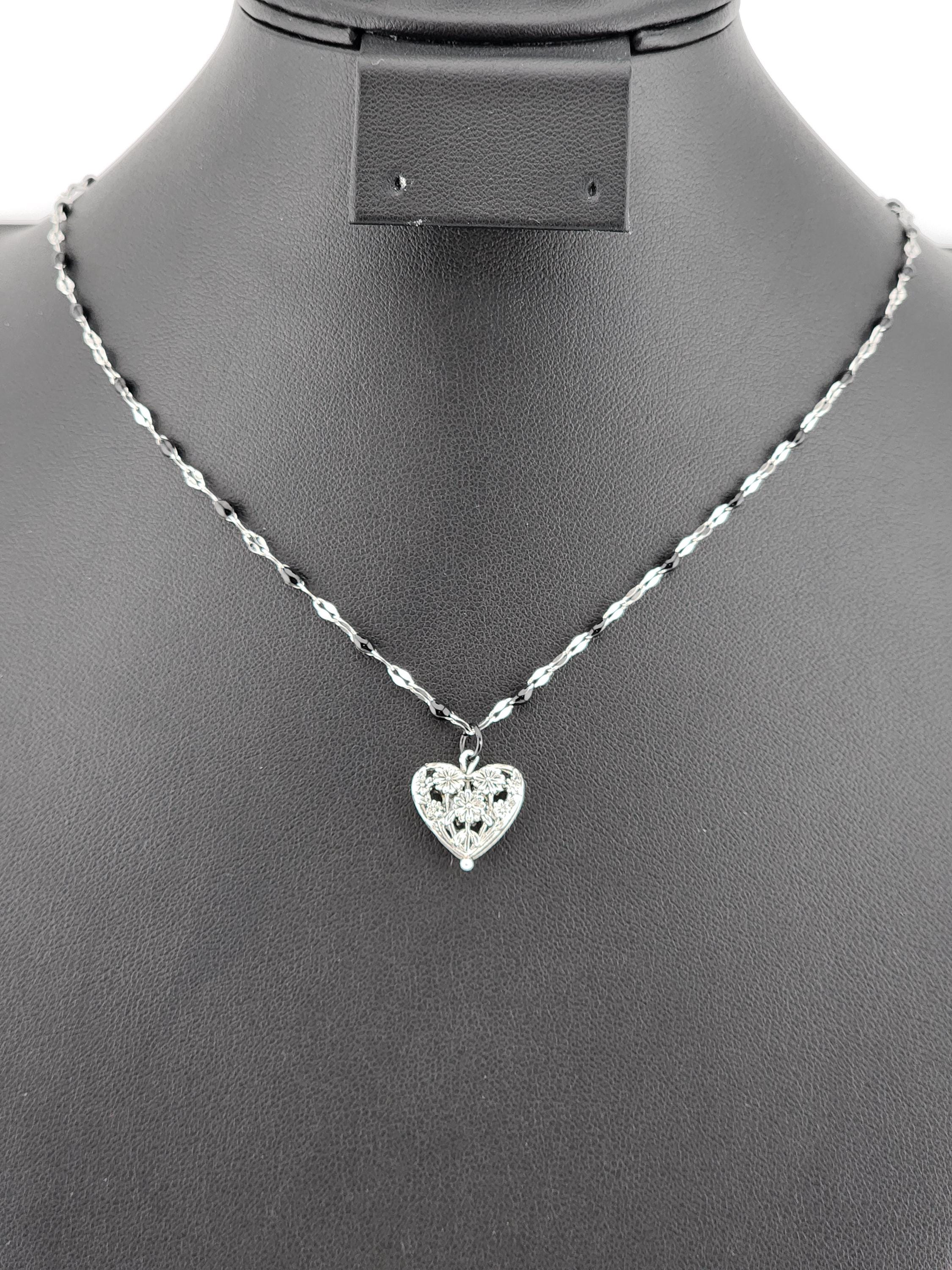 I made this necklace using silver stainless steel and black enamel link chain with an extender making it adjustable from 20"-22" in length. I added a real silver filigree flower heart pendant with a sterling silver center pin. * Your purchase will arrive in pretty packaging NOTE: Because it is real silver, the pendant will tarnish over time (there's no getting around that), but a silver polishing cloth should suffice for cleaning and keeping it bright.